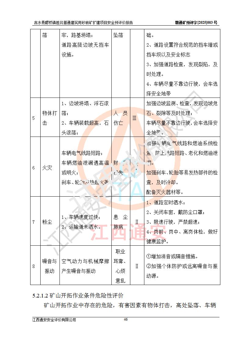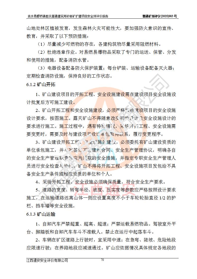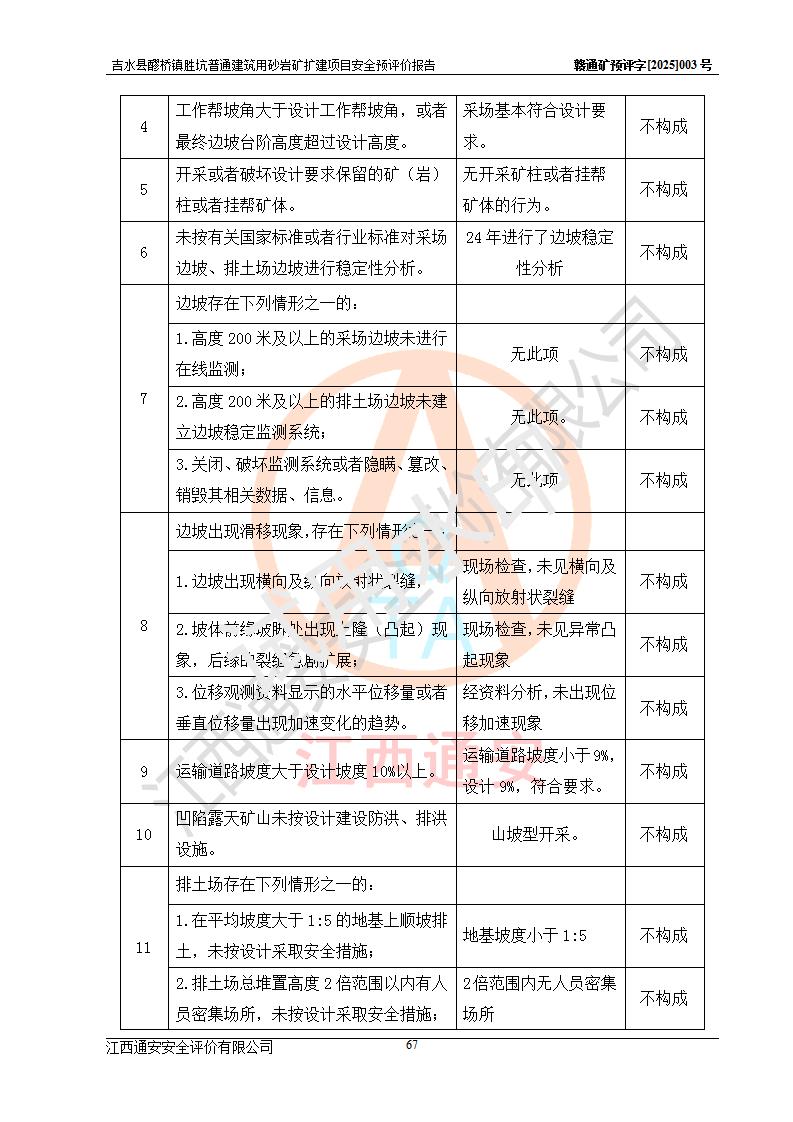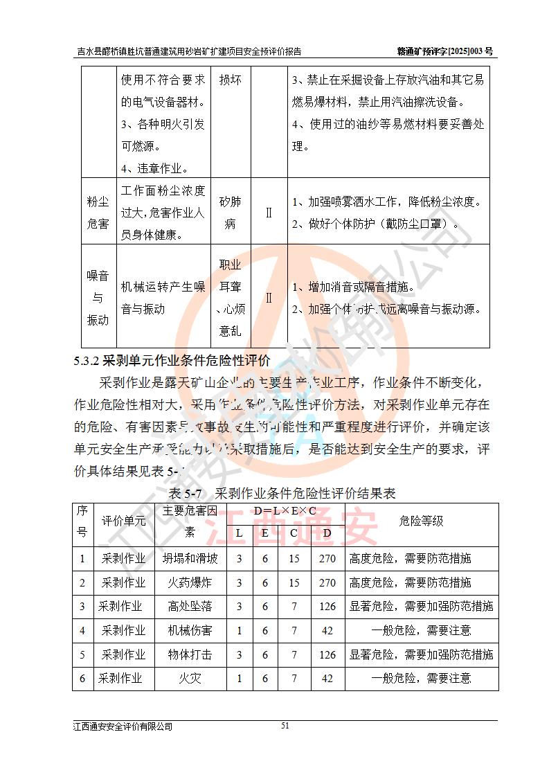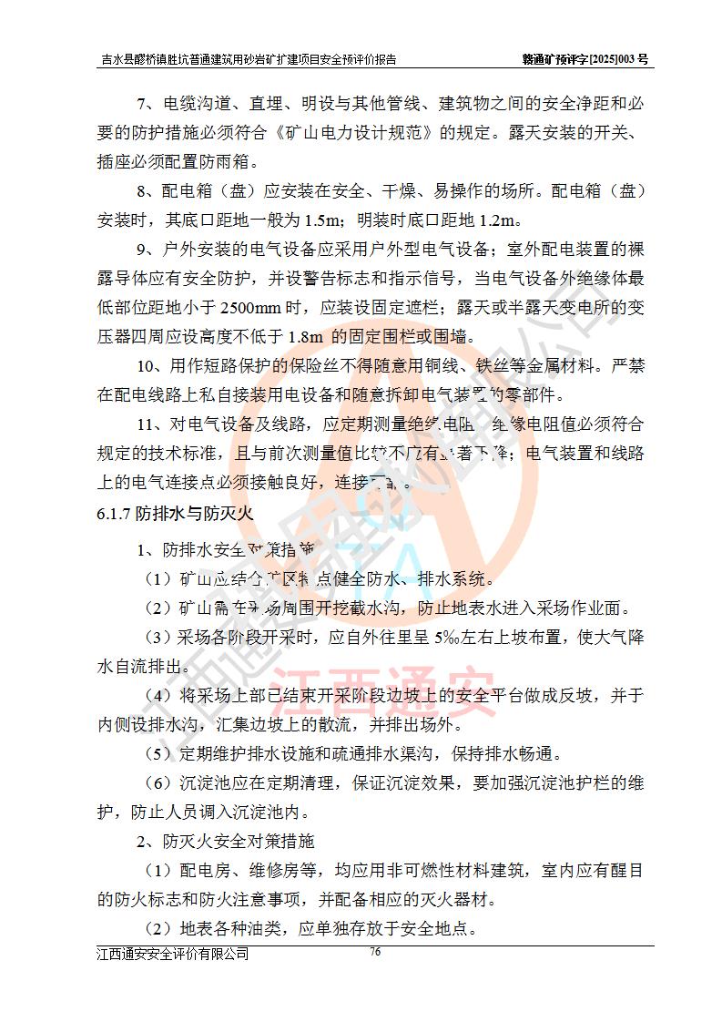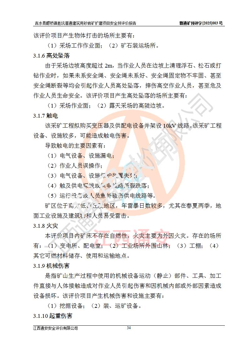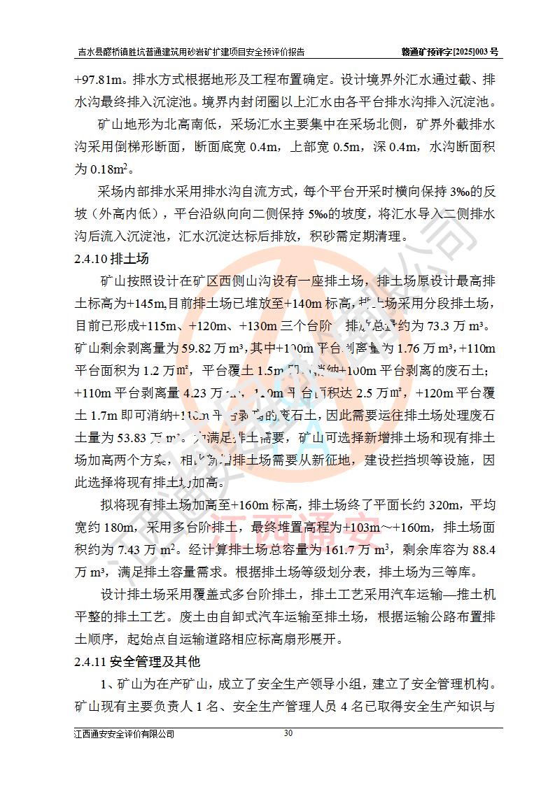 其它 | 吉水縣醪橋鎮(zhèn)勝坑普通建筑用砂巖礦露天開采擴建項目存在的主要危險因素有:滑坡和坍塌、火藥爆炸、放炮、**傷害、高處墜落、物體打擊、觸電、機械傷害、火災(zāi)、水災(zāi)、淹溺。該擴建建設(shè)項目中存在的有害因素有:粉塵、不良作業(yè)環(huán)境,如高溫、雷擊對礦山人員的傷害和其他不利的環(huán)境因素等。上述主要危險、有害因素在采取本報告第六章中提出的安全對策措施后,能得到**控制。該露天開采擴建建設(shè)項目從安全生產(chǎn)角度符合**有關(guān)安全生產(chǎn)法律、法規(guī)、規(guī)章和技術(shù)標(biāo)準(zhǔn)的要求。 | ||||