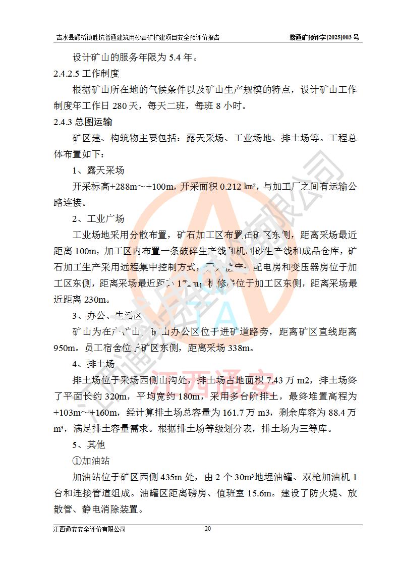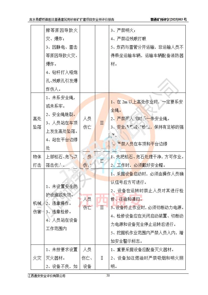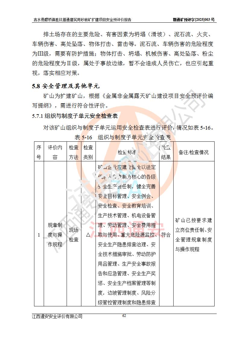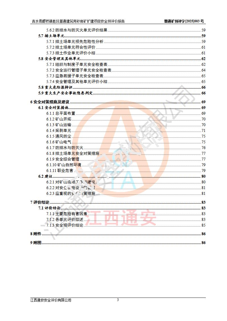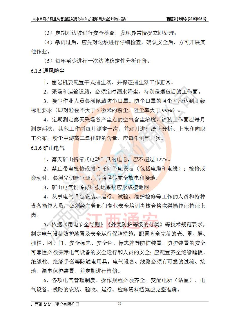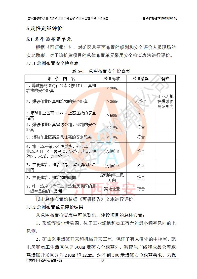 其它 | 吉水縣醪橋鎮(zhèn)勝坑普通建筑用砂巖礦露天開采擴建項目存在的主要危險因素有:滑坡和坍塌、火藥爆炸、放炮、**傷害、高處墜落、物體打擊、觸電、機械傷害、火災(zāi)、水災(zāi)、淹溺。該擴建建設(shè)項目中存在的有害因素有:粉塵、不良作業(yè)環(huán)境,如高溫、雷擊對礦山人員的傷害和其他不利的環(huán)境因素等。上述主要危險、有害因素在采取本報告第六章中提出的安全對策措施后,能得到**控制。該露天開采擴建建設(shè)項目從安全生產(chǎn)角度符合**有關(guān)安全生產(chǎn)法律、法規(guī)、規(guī)章和技術(shù)標(biāo)準(zhǔn)的要求。 | ||||