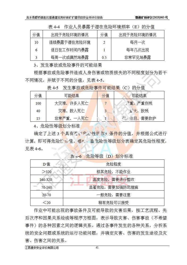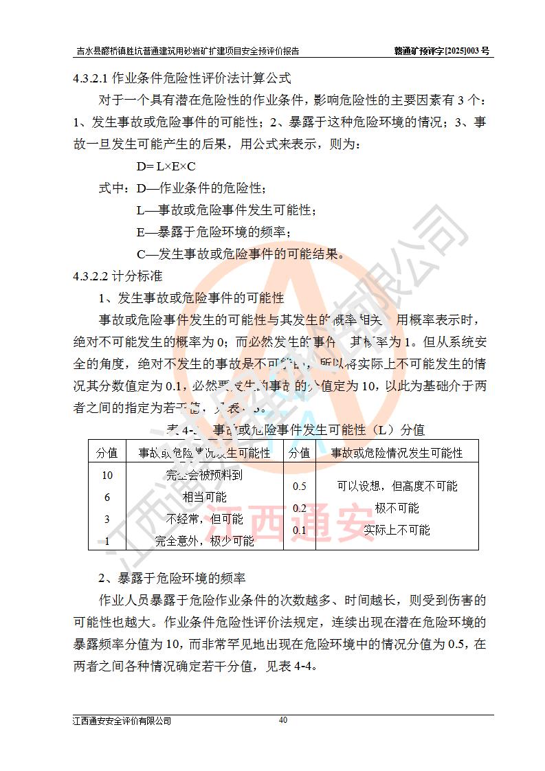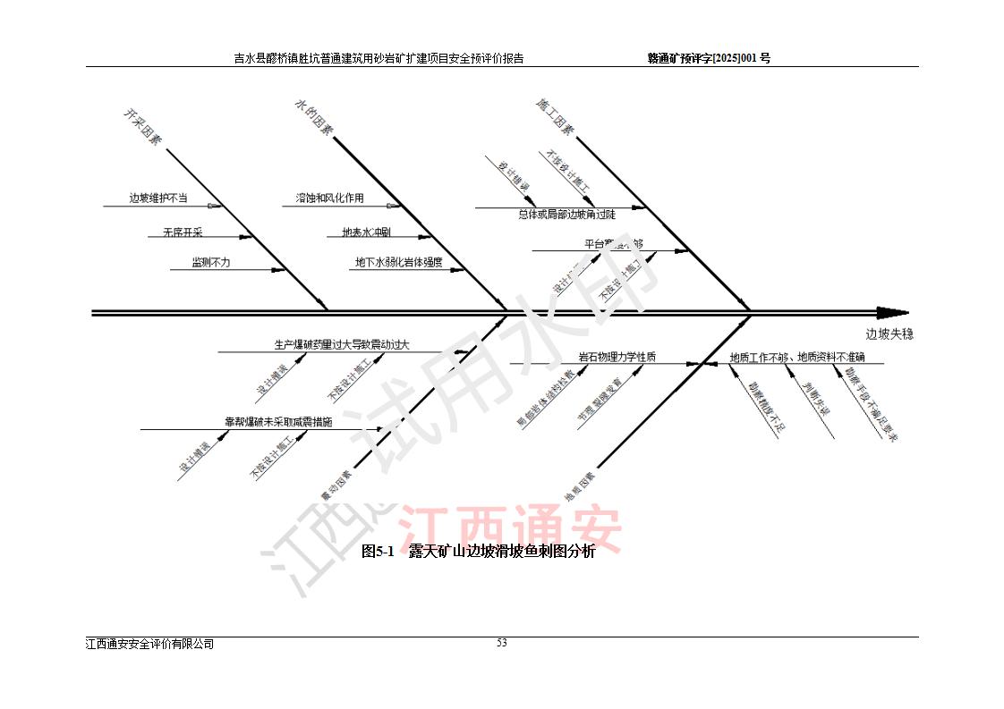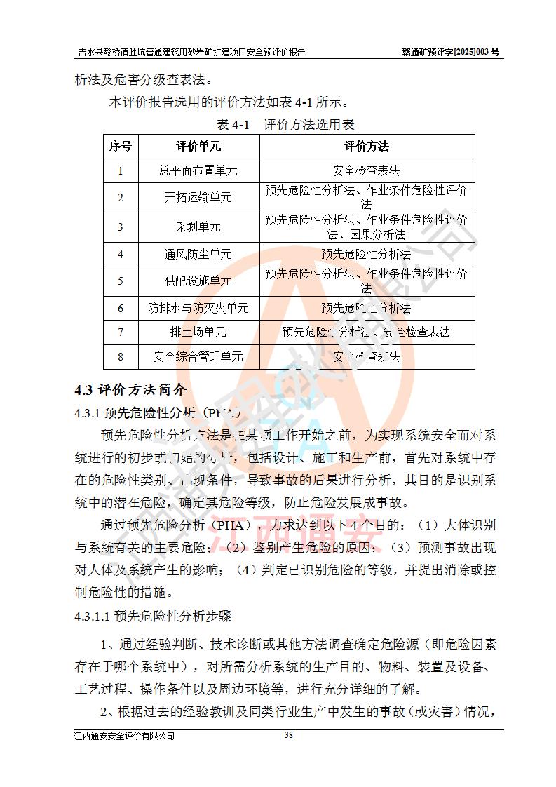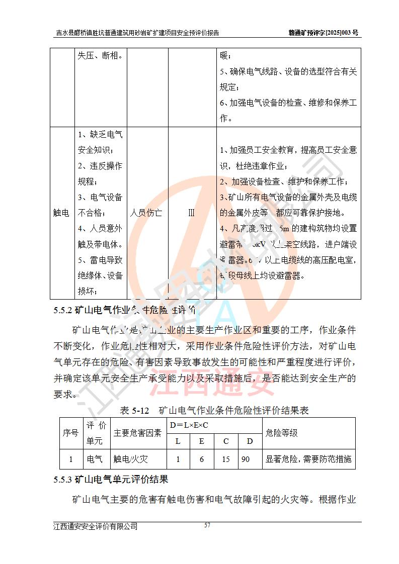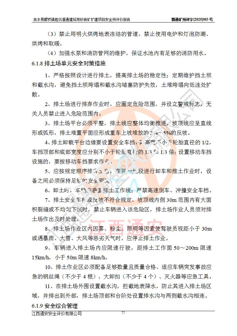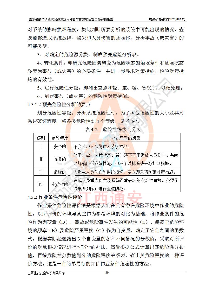 其它 | 吉水縣醪橋鎮(zhèn)勝坑普通建筑用砂巖礦露天開采擴建項目存在的主要危險因素有:滑坡和坍塌、火藥爆炸、放炮、**傷害、高處墜落、物體打擊、觸電、機械傷害、火災(zāi)、水災(zāi)、淹溺。該擴建建設(shè)項目中存在的有害因素有:粉塵、不良作業(yè)環(huán)境,如高溫、雷擊對礦山人員的傷害和其他不利的環(huán)境因素等。上述主要危險、有害因素在采取本報告第六章中提出的安全對策措施后,能得到**控制。該露天開采擴建建設(shè)項目從安全生產(chǎn)角度符合**有關(guān)安全生產(chǎn)法律、法規(guī)、規(guī)章和技術(shù)標(biāo)準(zhǔn)的要求。 | ||||