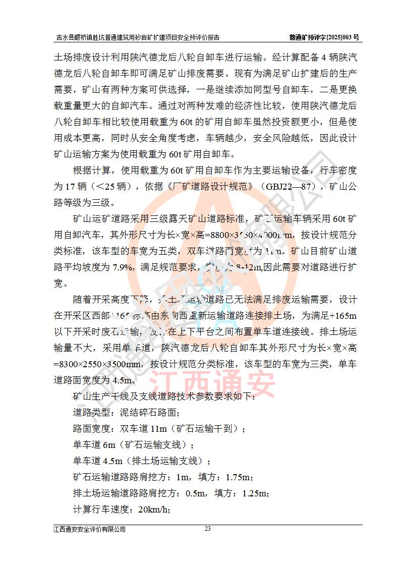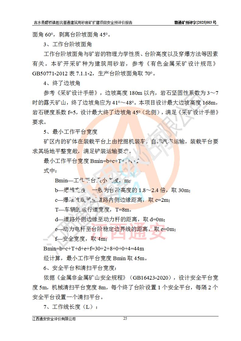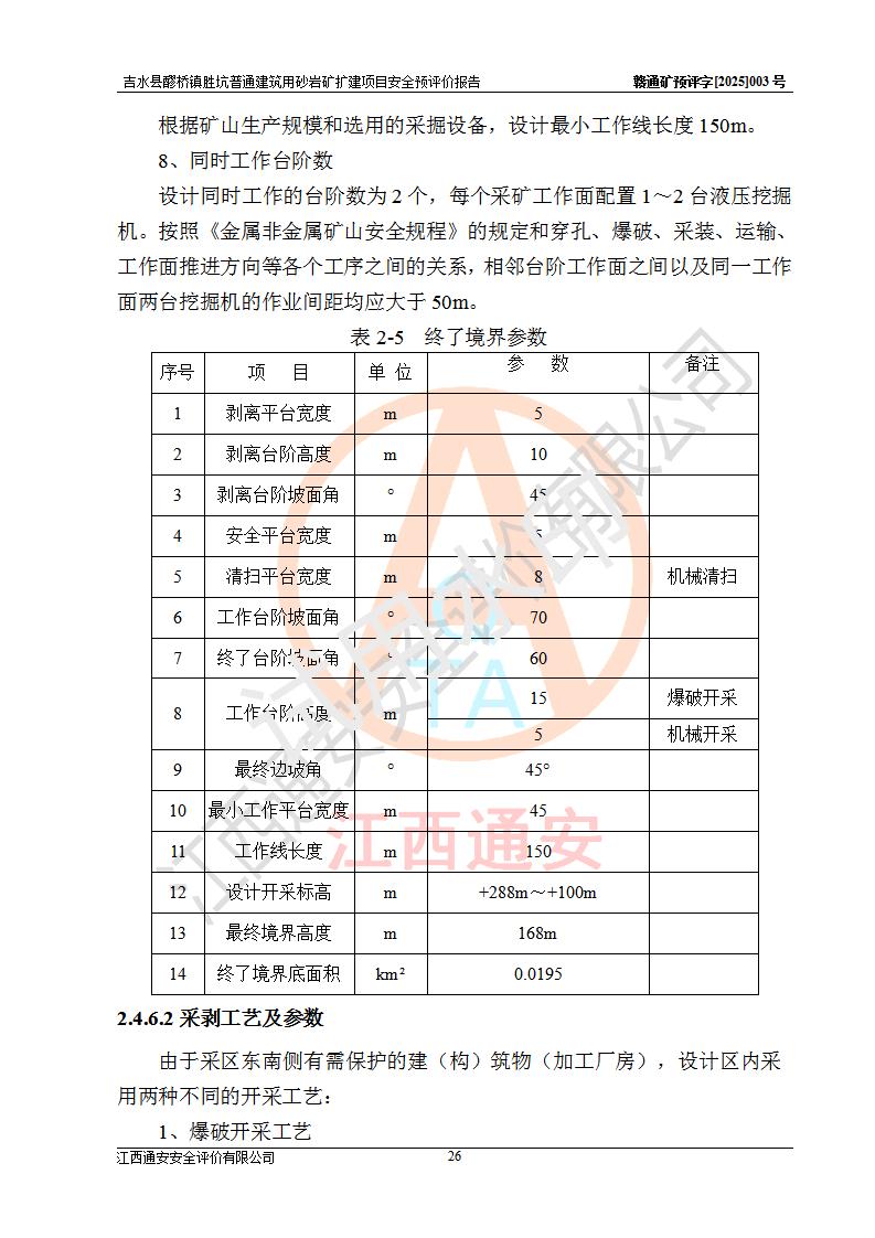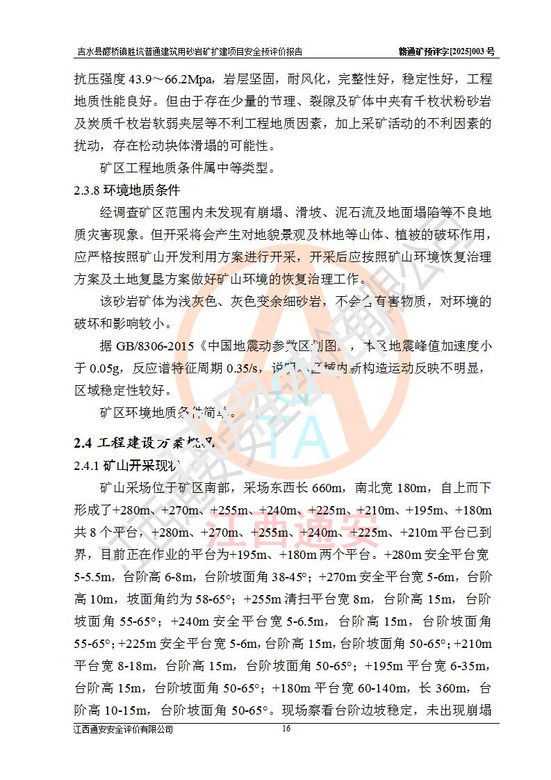 項目簡介 | 吉水縣醪橋鎮(zhèn)勝坑普通建筑用砂巖礦位于吉水縣縣城55°方位直距約10km的醪橋鎮(zhèn)境內(nèi)。礦區(qū)位置地理坐標(biāo):東經(jīng)115°10′26″~115°11′08″,北緯27°17′02″~27°17′25″。行政區(qū)劃屬吉水縣醪橋鎮(zhèn)管轄。 礦區(qū)以西直線距離約2km有改建后的105國道,區(qū)內(nèi)有3.5km瀝青道路(礦山修建)與105國道相連交通條件較為便利。 礦山采礦許可證許可規(guī)模為100萬噸,根據(jù)《**中央辦公廳?***辦公廳關(guān)于進一步加強礦山安全生產(chǎn)工作的意見》和《自然資源部關(guān)于深化礦產(chǎn)資源管理改革若干事項的意見》(自然資規(guī)〔2023〕6號)采礦許可證證載規(guī)模是擬建設(shè)規(guī)模,礦山設(shè)計單位可在項目可行性研究基礎(chǔ)上,充分考慮資源**利用、安全生產(chǎn)、生態(tài)環(huán)境保護等因素,在礦山初步設(shè)計和安全設(shè)施設(shè)計中科學(xué)論證并確定實際生產(chǎn)建設(shè)規(guī)模。經(jīng)礦山市場調(diào)研,考慮礦山的區(qū)位交通優(yōu)勢,擴大規(guī)模效應(yīng),早日收回投資,礦山擬決定擴大生產(chǎn)規(guī)模。在**符合**與安全標(biāo)準(zhǔn)的前提下,計劃將年產(chǎn)量提升至300萬t/a。為此,礦山專門編制了《江西富林礦業(yè)有限公司吉水縣醪橋鎮(zhèn)勝坑普通建筑用砂巖礦擴建項目可行性研究報告》(以下簡稱《可研報告》)并委托江西冶金設(shè)計院編制了《江西富林礦業(yè)有限公司吉水縣醪橋鎮(zhèn)勝坑普通建筑用砂巖礦300萬t/a露天開采工程擴建項目設(shè)計規(guī)模專項論證報告》(以下簡稱《生產(chǎn)規(guī)模論證報告》),論證報告詳細(xì)分析了資源儲量、開采技術(shù)、環(huán)境影響及經(jīng)濟效益,結(jié)論顯示擴產(chǎn)方案可行。本擴建項目已于2024年11月29日在吉水縣發(fā)展和改革委員會備案(項目統(tǒng)一代碼:2101-360822-04-01-684449)。 礦山采場位于礦區(qū)南部,采場東西長660m,南北寬180m,自上而下形成了+280m、+270m、+255m、+240m、+225m、+210m、+195m、+180m共8個平臺,+280m、+270m、+255m、+240m、+225m、+210m平臺已到界,目前正在作業(yè)的平臺為+195m、+180m兩個平臺。 礦山采礦許可證開采深度為+315m~100m,面積0.574km2。礦山估算面積0.228k㎡,估算標(biāo)高+277~+100m。儲量估算范圍位于礦區(qū)的南側(cè)。由于采區(qū)東南側(cè)有需保護的建(構(gòu))筑物(加工廠房),設(shè)計區(qū)內(nèi)采用兩種不同的開采工藝: 該區(qū)域內(nèi)采用爆破方案開采,其工藝為:穿孔-爆破-二次破碎-鏟裝-運輸五個主要環(huán)節(jié)。采用潛孔鉆機穿鑿深孔,多排孔半秒延時爆破,大塊礦石采用液壓破碎錘進行二次破碎,單斗液壓挖掘機裝車,礦用自卸汽車將礦石自工作面運至破碎站。 在禁爆區(qū)內(nèi)采用挖掘機配破碎錘作業(yè),其采礦工藝為:破碎-鏟裝-運輸。設(shè)計采用液壓破碎錘碎石,作業(yè)分臺階**為5m,并在臨近終了時按照設(shè)計開采水平進行并段,并段后終了臺階**15m,采下礦石采用挖掘機裝車,礦用自卸汽車運輸。 根據(jù)《中華人民共和國安全生產(chǎn)法》、《礦山安全法》、《安全生產(chǎn)許可證條例》、《建設(shè)項目安全設(shè)施“三同時”監(jiān)督管理辦法》和《非煤礦山安全生產(chǎn)許可證實施辦法》等有關(guān)法律、法規(guī)關(guān)于建設(shè)項目安全設(shè)施“三同時”的規(guī)定,2024年12月,江西富林礦業(yè)有限公司委托江西通安安全評價有限公司編制《江西富林礦業(yè)有限公司吉水縣醪橋鎮(zhèn)勝坑普通建筑用砂巖礦擴建項目安全預(yù)評價報告》。