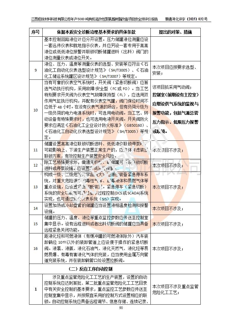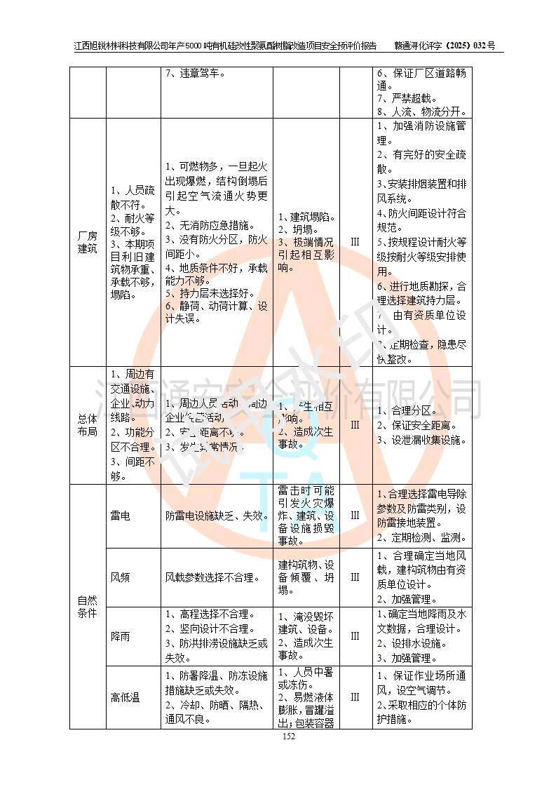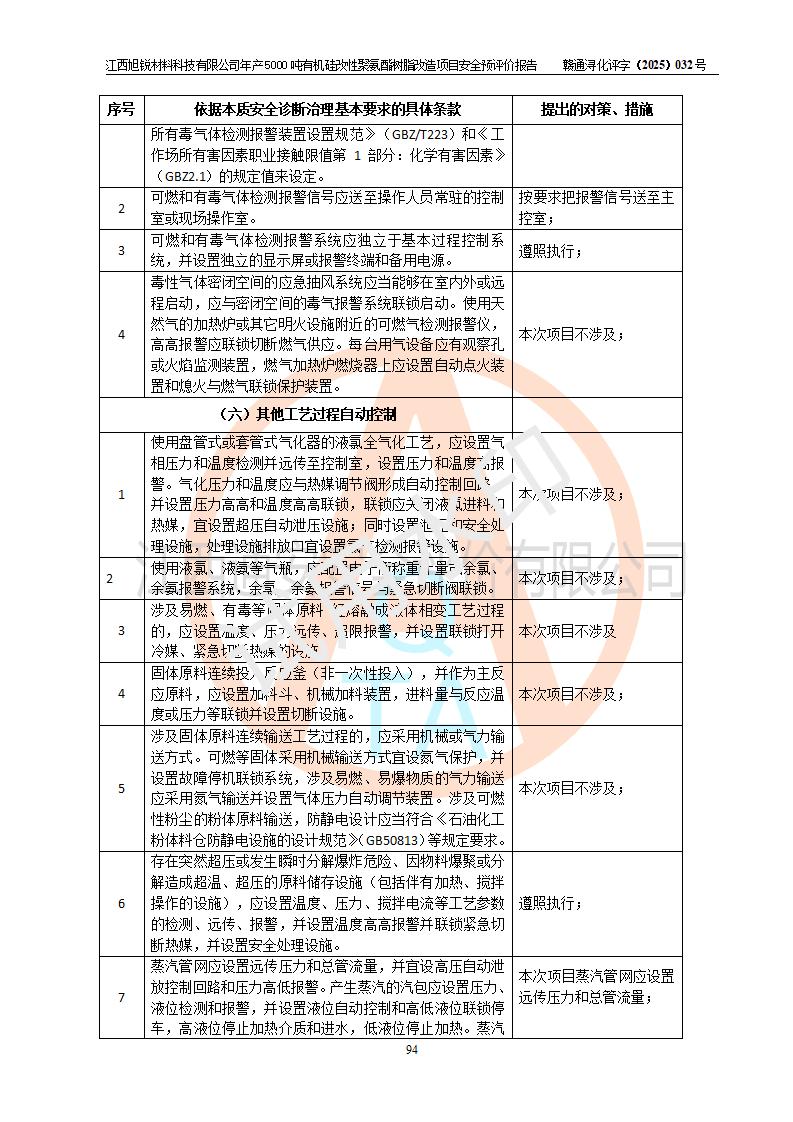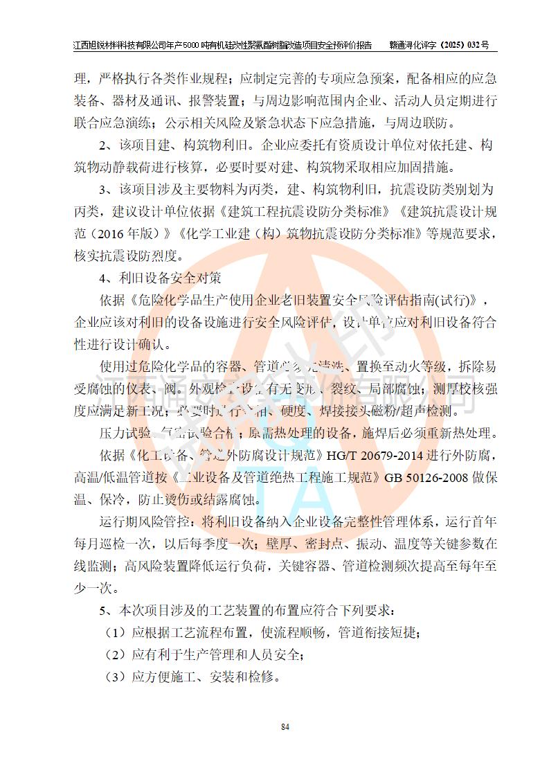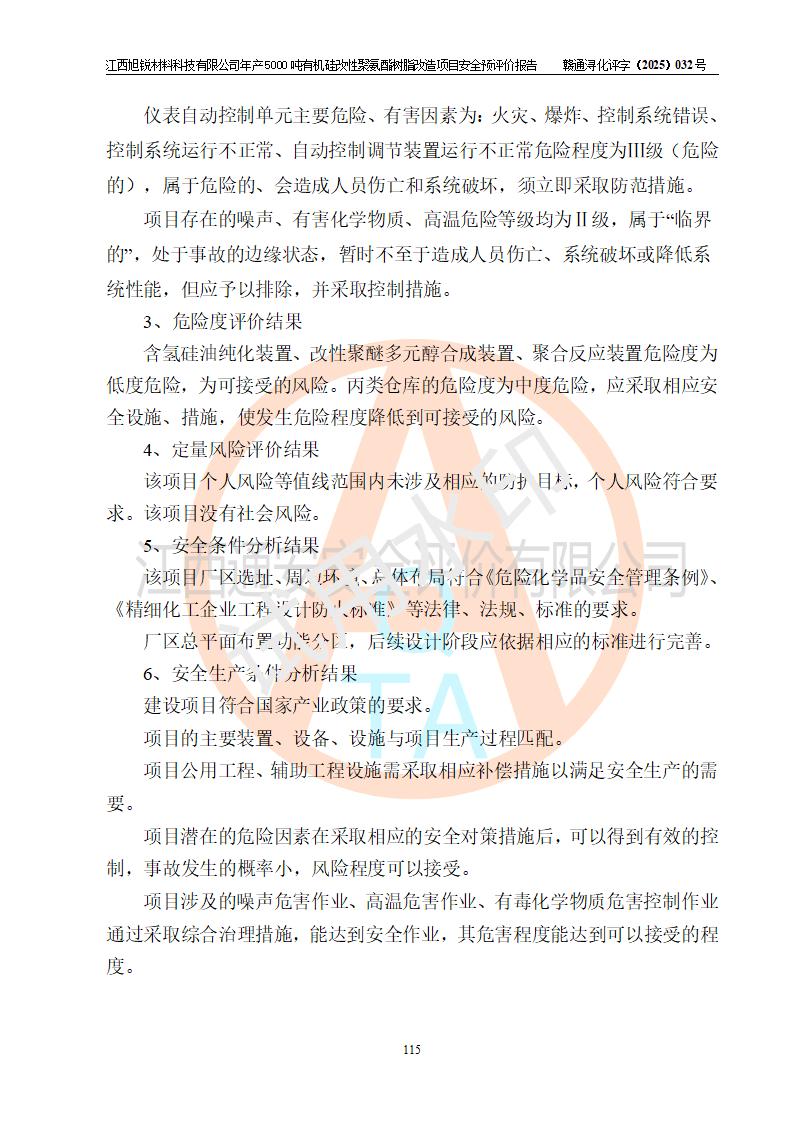 評(píng)價(jià)結(jié)論 | 江西旭銳材料科技有限公司年產(chǎn)5000噸有機(jī)硅改性聚氨酯樹脂改造項(xiàng)目的選址、總體布局、周邊環(huán)境、自然環(huán)境能滿足建設(shè)安全條件:項(xiàng)目選擇的工藝過程及設(shè)備設(shè)施的安全可靠性能達(dá)到**法規(guī)、標(biāo)準(zhǔn)規(guī)定要求。 項(xiàng)目存在的危險(xiǎn)有害因素可控,在落實(shí)本評(píng)價(jià)報(bào)告提出的有關(guān)安全對(duì)策措施后,其危險(xiǎn)有害程度能達(dá)到可以接受的程度,項(xiàng)目建設(shè)能夠?qū)崿F(xiàn)安全運(yùn)行的目標(biāo)。 | |||||