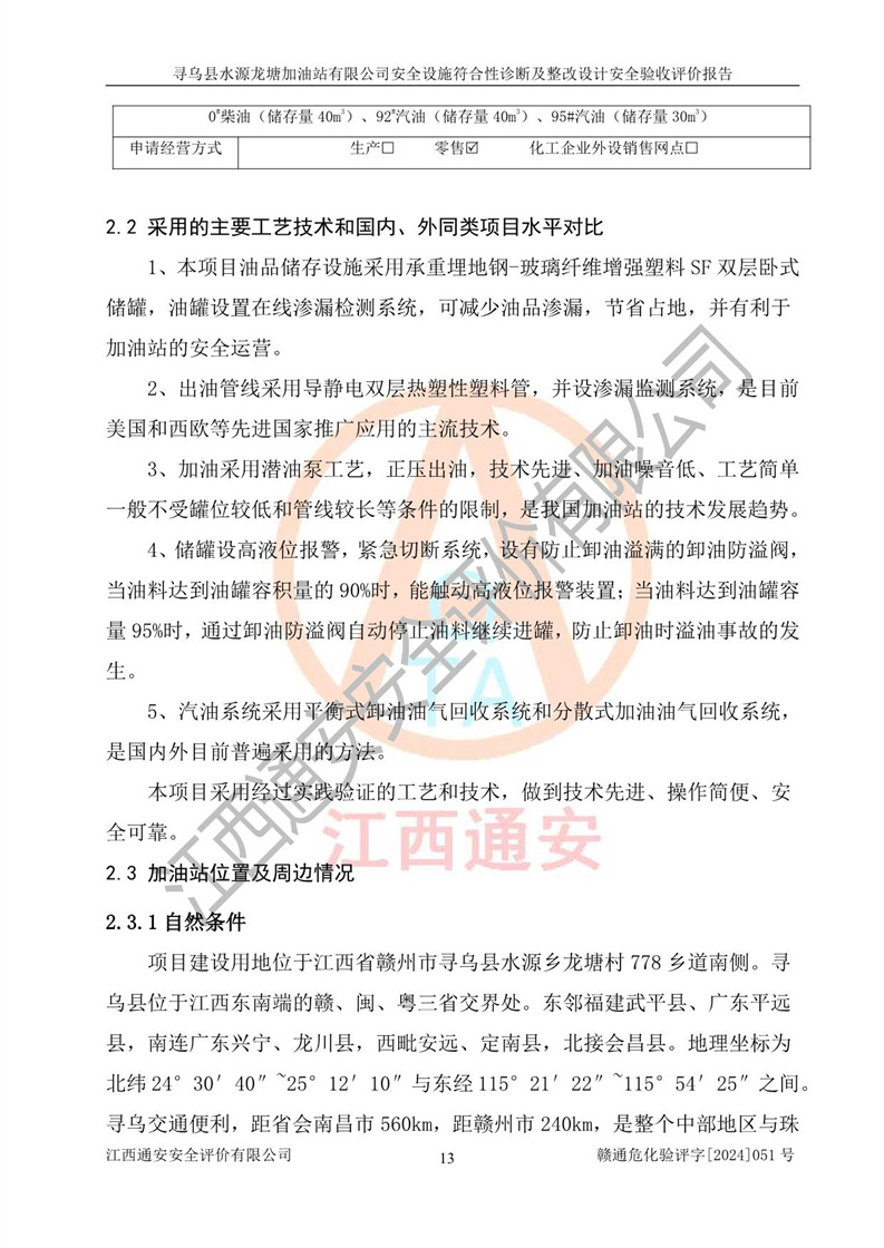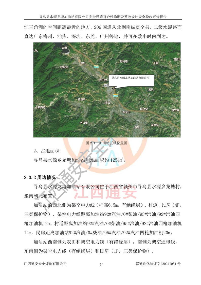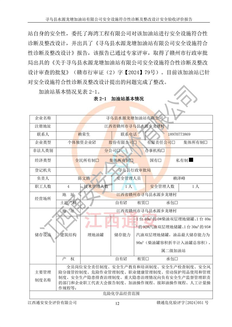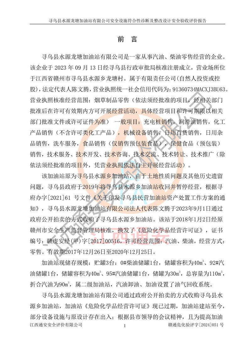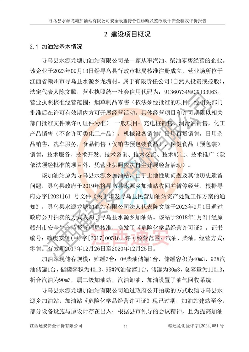 項(xiàng)目簡(jiǎn)介 | 尋烏縣水源龍?zhí)良佑驼居邢薰臼且患覐氖?/span>汽油、柴油零售經(jīng)營(yíng)的企業(yè)。該企業(yè)于2023年09月13日經(jīng)尋烏縣行政審批局核準(zhǔn)注冊(cè)成立,營(yíng)業(yè)場(chǎng)所位于江西省贛州市尋烏縣水源鄉(xiāng)龍?zhí)链濉儆谟邢挢?zé)任公司(自然人投資或控股),法定**人陳文騰,營(yíng)業(yè)執(zhí)照統(tǒng)一社會(huì)信用代碼為:91360734MACXJ3BU63。營(yíng)業(yè)執(zhí)照核準(zhǔn)經(jīng)營(yíng)范圍:煙草制品零售(依法須經(jīng)批準(zhǔn)的項(xiàng)目,經(jīng)相關(guān)部門批準(zhǔn)后在許可**期內(nèi)方可開(kāi)展經(jīng)營(yíng)活動(dòng),具體經(jīng)營(yíng)項(xiàng)目和許可期限以相關(guān)部門批準(zhǔn)文件或許可證件為準(zhǔn)) 一般項(xiàng)目:充電樁銷售,潤(rùn)滑油銷售,化工產(chǎn)品銷售(不含許可類化工產(chǎn)品),機(jī)械設(shè)備銷售,日用百貨銷售,日用雜品銷售,洗車服務(wù),食品銷售(僅銷售預(yù)包裝食品),保健食品(預(yù)包裝)銷售,技術(shù)服務(wù)、技術(shù)開(kāi)發(fā)、技術(shù)咨詢、技術(shù)交流、技術(shù)**、技術(shù)推廣(除依法須經(jīng)批準(zhǔn)的項(xiàng)目外,憑營(yíng)業(yè)執(zhí)照依法自主開(kāi)展經(jīng)營(yíng)活動(dòng))。 加油站現(xiàn)儲(chǔ)存規(guī)模:貯罐3臺(tái):0#柴油儲(chǔ)罐1臺(tái),儲(chǔ)罐容積為40m3、92#汽油儲(chǔ)罐1臺(tái),儲(chǔ)罐容積為40m3、95#汽油儲(chǔ)罐1臺(tái),儲(chǔ)罐為30m3,總?cè)萘繛?/span>110m3,折合汽油為90m3,屬二級(jí)加油站,汽油卸油、加油設(shè)置了油氣回收系統(tǒng)。該加油站原為尋烏縣水源鄉(xiāng)加油站,由于土地性質(zhì)問(wèn)題及其他歷史遺留問(wèn)題,尋烏縣**于2019年將尋烏縣水源鄉(xiāng)加油站收回并暫停經(jīng)營(yíng),根據(jù)尋府辦字[2021]61 號(hào)文件《關(guān)于印發(fā)尋烏縣民營(yíng)加油站資產(chǎn)處置工作方案的通知》,尋烏縣水源龍?zhí)良佑驼居邢薰痉ㄈ?*陳文騰于2023年9月1日通過(guò)**公開(kāi)拍賣的方式收購(gòu)了尋烏縣水源鄉(xiāng)加油站。該站于2018年1月2日經(jīng)原贛州市安全生產(chǎn)監(jiān)督管理局核準(zhǔn),換發(fā)了《危險(xiǎn)化學(xué)品經(jīng)營(yíng)許可證》,證書(shū)編號(hào):贛虔安經(jīng)(甲)字[2017]00516,許可經(jīng)營(yíng)范圍:汽油、柴油,經(jīng)營(yíng)方式:零售。**期2017年12月26日至2020年12月25日。。