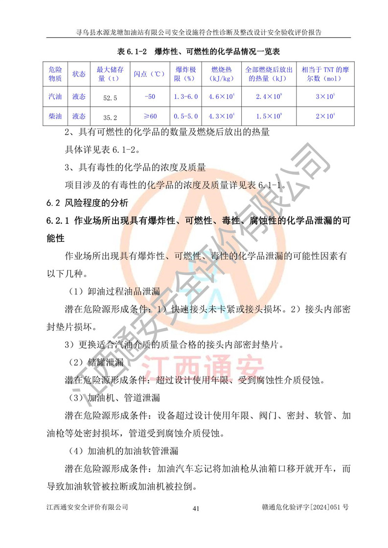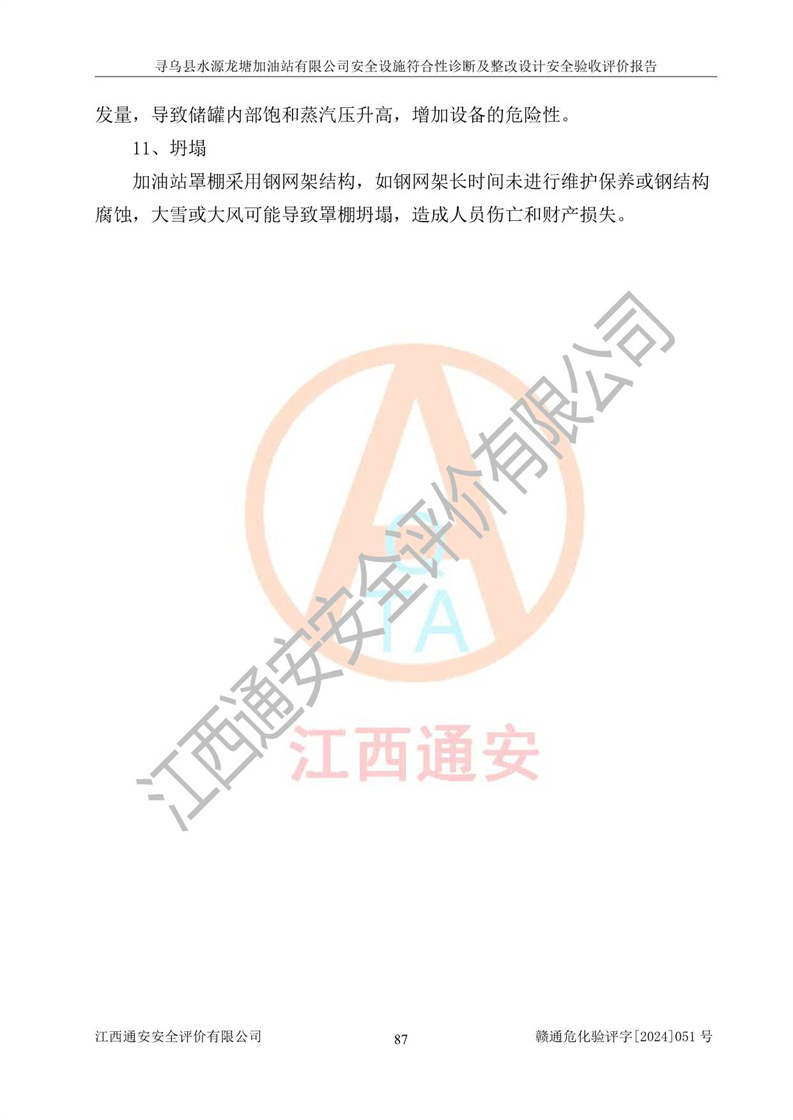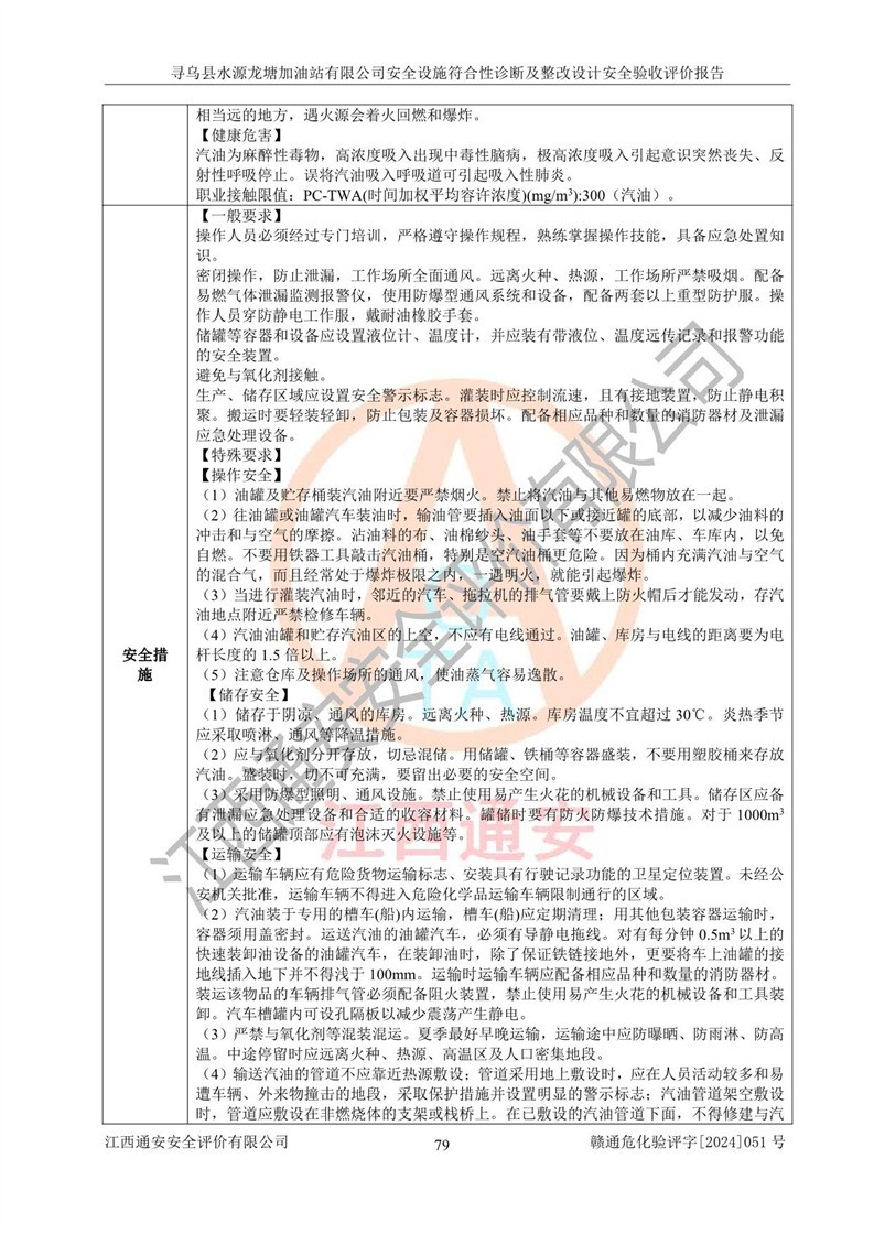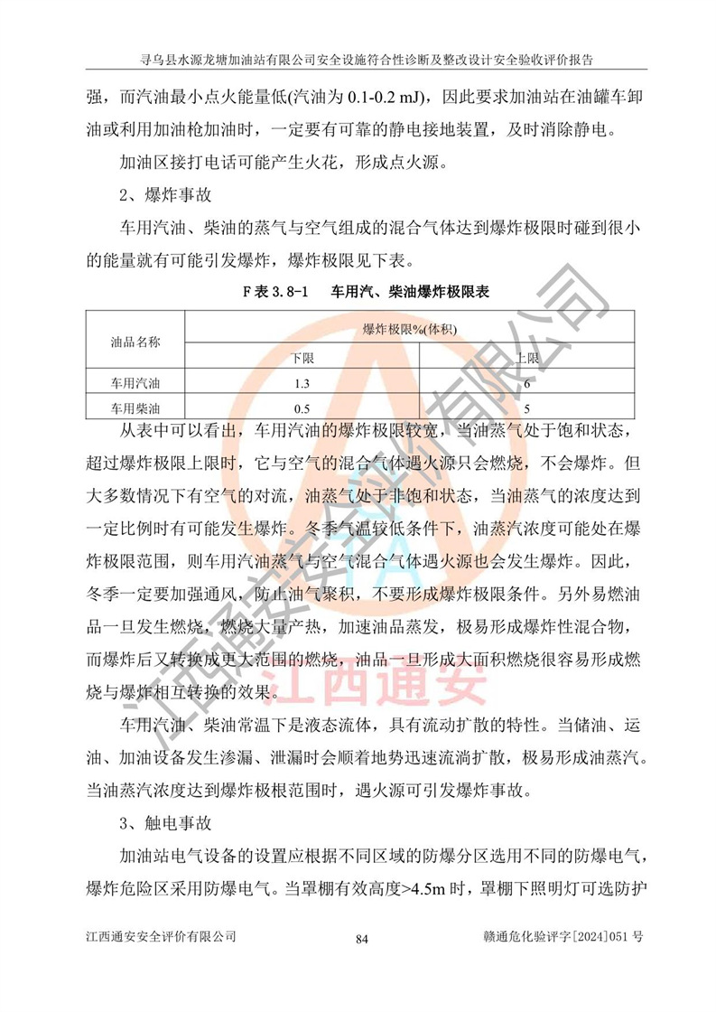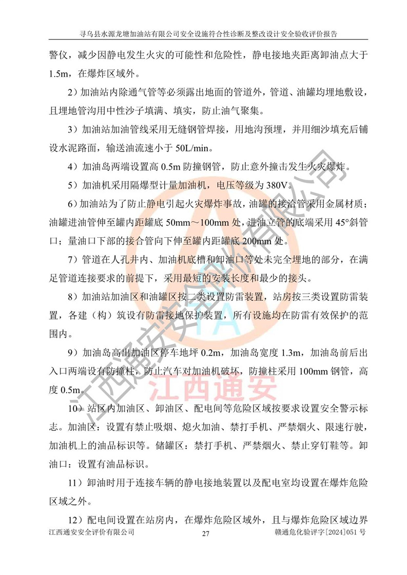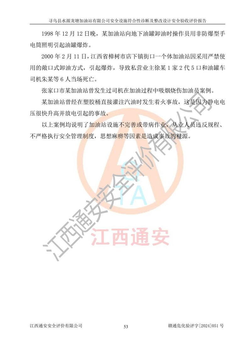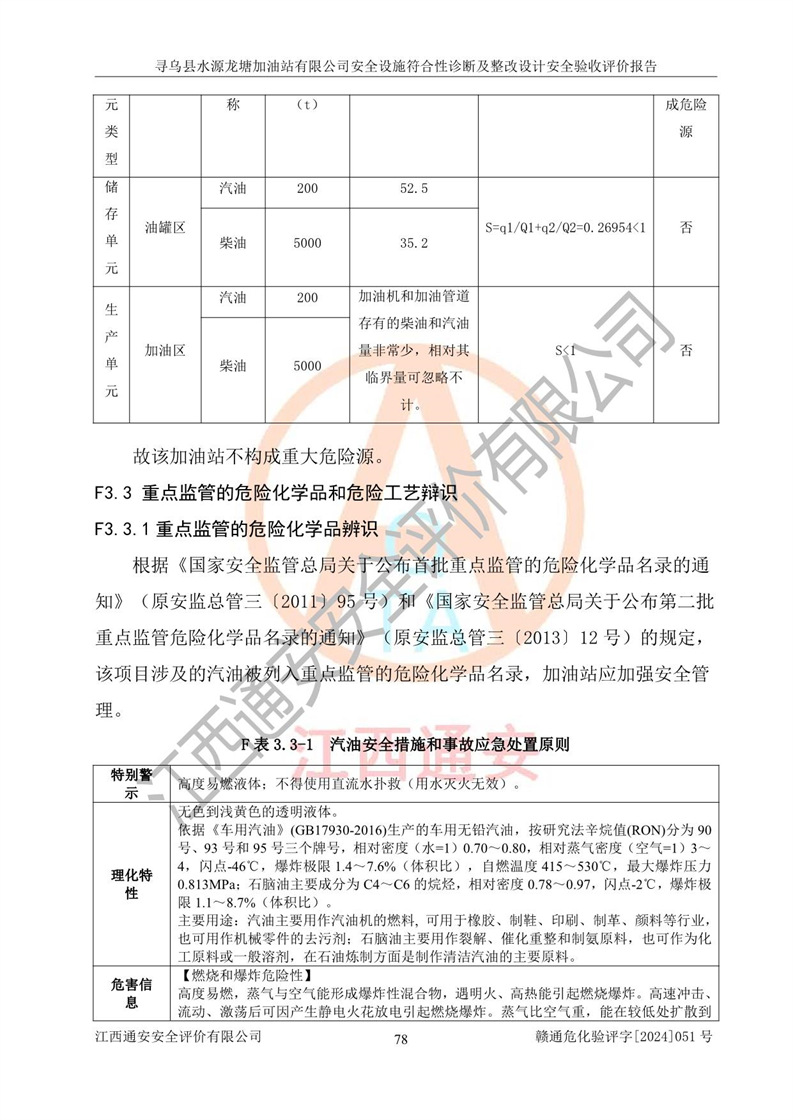 其它 | 1、尋烏縣水源龍?zhí)良佑驼居邢薰?/span>為成品油零售企業(yè),屬于二級(jí)加油站,油罐區(qū)為主要危險(xiǎn)源。該加油站不構(gòu)成危險(xiǎn)化學(xué)品重大危險(xiǎn)源。 2、尋烏縣水源龍?zhí)良佑驼居邢薰?/span>所經(jīng)營(yíng)的汽油屬于重點(diǎn)監(jiān)管危險(xiǎn)化學(xué)品,應(yīng)加強(qiáng)安全管理,根據(jù)“汽油安全措施和應(yīng)急處理原則”要求的措施進(jìn)行檢查,加油站設(shè)置了視頻監(jiān)控系統(tǒng)、具有液位報(bào)警功能的液位監(jiān)測(cè)系統(tǒng)、滲漏檢測(cè),并制定各種管理制度和操作規(guī)程,已落實(shí)到位。 3、通過(guò)本報(bào)告分析,該項(xiàng)目投入經(jīng)營(yíng)后仍將面對(duì)多種危險(xiǎn)因素,如火災(zāi),爆炸、中毒、電氣傷害、**傷害、噪聲等危險(xiǎn)有害因素。而項(xiàng)目*主要的危險(xiǎn)、有害因素是火災(zāi)、爆炸,對(duì)此,加油站全體員工**保持**的安全防護(hù)意識(shí)。 4、項(xiàng)目公用工程能夠滿足安全經(jīng)營(yíng)的基本需要。 5、該加油站內(nèi)部平面布置符合**和行業(yè)相關(guān)標(biāo)準(zhǔn)、規(guī)范的要求。建筑結(jié)構(gòu)、消防、安全設(shè)施等布置明確、合理,符合各相關(guān)規(guī)范的要求。 6、加油站取得了雷電防護(hù)裝置檢測(cè)報(bào)告。 7、項(xiàng)目油罐、通氣管口和加油機(jī)與外部環(huán)境的防火距離、平面布置、消防安全設(shè)施和措施滿足法律法規(guī)、標(biāo)準(zhǔn)規(guī)范的要求。電氣防爆保護(hù)、機(jī)械設(shè)備的安全保護(hù)等方面的安全設(shè)施建立**。 8、作業(yè)條件危險(xiǎn)性評(píng)價(jià)結(jié)果:在選定的3個(gè)單元的危險(xiǎn)程度為“一般危險(xiǎn)、需要注意”或“稍有危險(xiǎn),可以接受”,且一般危險(xiǎn)或稍有危險(xiǎn)作業(yè)環(huán)境的出現(xiàn)均由物料的危險(xiǎn)程度所決定,作業(yè)條件相對(duì)安全。 9、危險(xiǎn)度評(píng)價(jià)結(jié)果:油罐區(qū)得分為12分,為Ⅱ級(jí),屬于中度危險(xiǎn)。加油站油罐安裝高液位報(bào)警功能的液位監(jiān)測(cè)系統(tǒng),當(dāng)油料達(dá)到油罐容量90%時(shí),觸動(dòng)高液位報(bào)警裝置,油料達(dá)到油罐容量95%時(shí),自動(dòng)停止油料繼續(xù)進(jìn)罐。同時(shí),也采取了防止油品滲漏的保護(hù)措施,降低火災(zāi)爆炸危險(xiǎn),滿足安全經(jīng)營(yíng)條件要求。 10、加油站建立了安全責(zé)任制,制定了安全管理制度、操作規(guī)程,編制了事故應(yīng)急預(yù)案,配備了應(yīng)急救援器材,按要求定期進(jìn)行相關(guān)培訓(xùn)及演練。 11、該項(xiàng)目不涉及重大生產(chǎn)安全事故隱患,安全經(jīng)營(yíng)條件符合《危險(xiǎn)化學(xué)品經(jīng)營(yíng)許可證管理辦法》的要求。 12、該安全設(shè)施診斷設(shè)計(jì)整改意見(jiàn)已按要求整改完善,符合要求。 尋烏縣水源龍?zhí)良佑驼居邢薰驹谝垩b置安全設(shè)施診斷設(shè)計(jì)的安全設(shè)施及安全管理符合**及有關(guān)部門關(guān)于安全生產(chǎn)法律、法規(guī)、標(biāo)準(zhǔn)的要求,工藝設(shè)備、安全設(shè)施等運(yùn)行正常,安全設(shè)施、措施達(dá)到設(shè)計(jì)要求和預(yù)期結(jié)果,符合經(jīng)營(yíng)和儲(chǔ)存危險(xiǎn)化學(xué)品(汽油、柴油)的安全條件要求,具備了安全設(shè)施竣工驗(yàn)收條件。