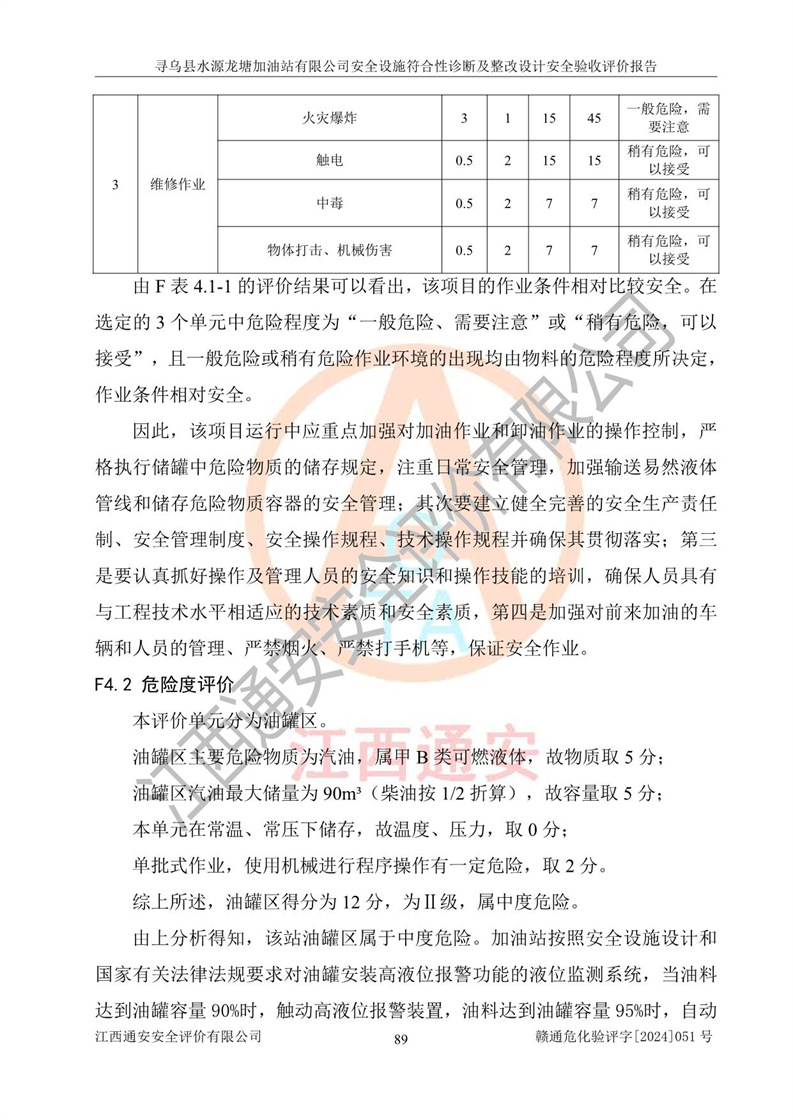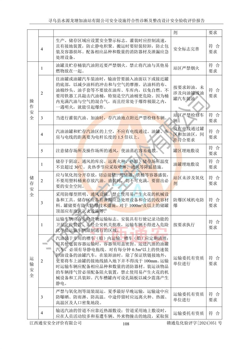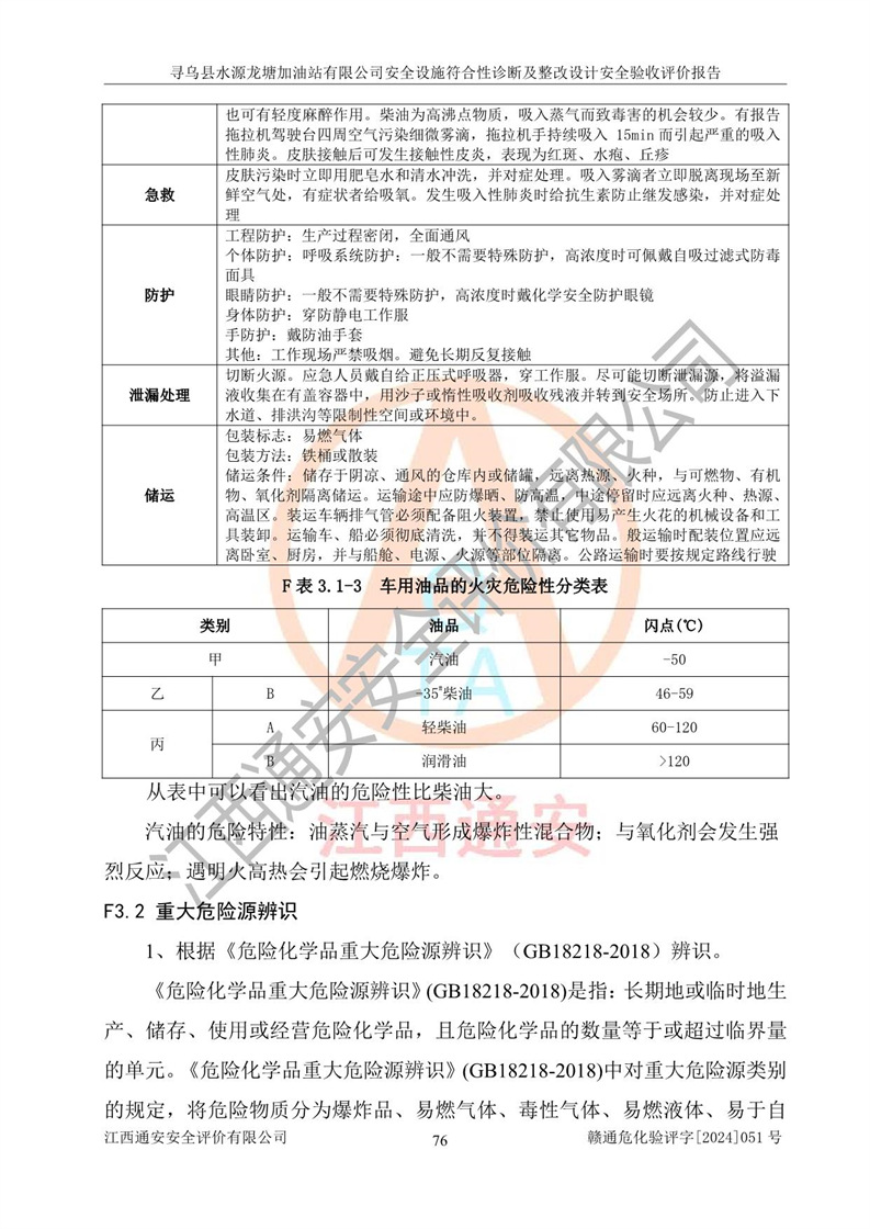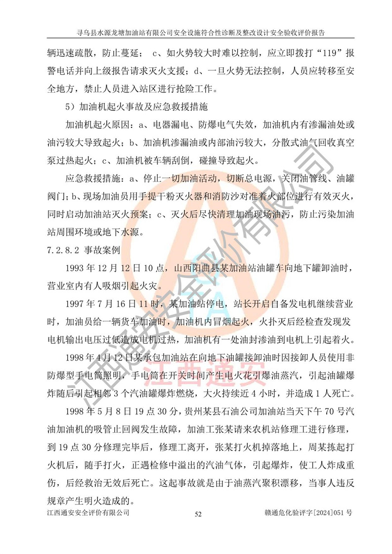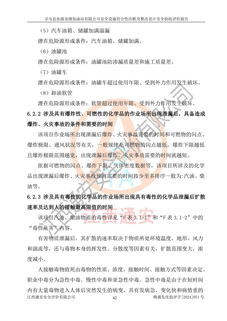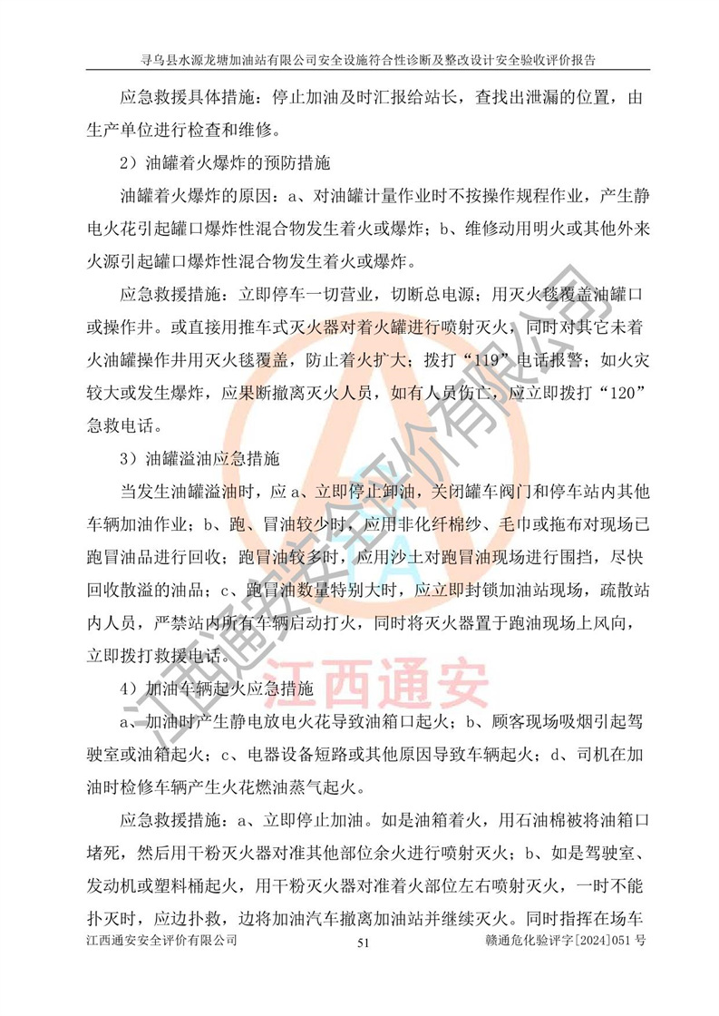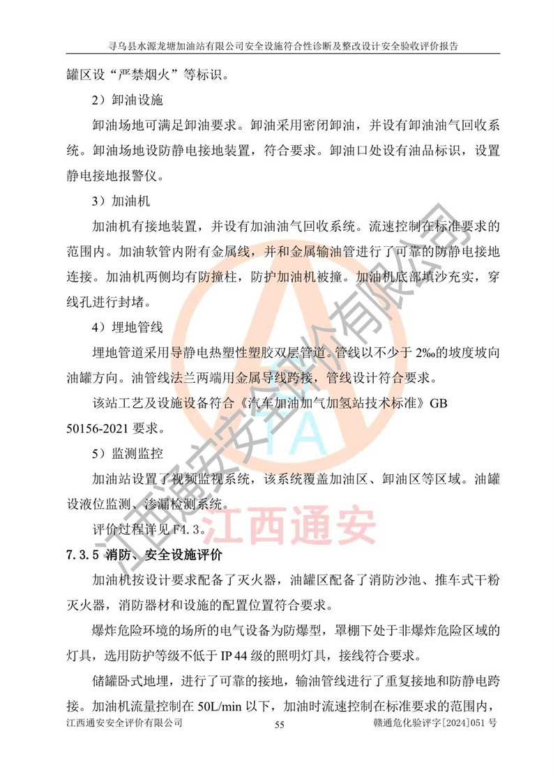 其它 | 1、尋烏縣水源龍?zhí)良佑驼居邢薰?/span>為成品油零售企業(yè),屬于二級(jí)加油站,油罐區(qū)為主要危險(xiǎn)源。該加油站不構(gòu)成危險(xiǎn)化學(xué)品重大危險(xiǎn)源。 2、尋烏縣水源龍?zhí)良佑驼居邢薰?/span>所經(jīng)營(yíng)的汽油屬于重點(diǎn)監(jiān)管危險(xiǎn)化學(xué)品,應(yīng)加強(qiáng)安全管理,根據(jù)“汽油安全措施和應(yīng)急處理原則”要求的措施進(jìn)行檢查,加油站設(shè)置了視頻監(jiān)控系統(tǒng)、具有液位報(bào)警功能的液位監(jiān)測(cè)系統(tǒng)、滲漏檢測(cè),并制定各種管理制度和操作規(guī)程,已落實(shí)到位。 3、通過(guò)本報(bào)告分析,該項(xiàng)目投入經(jīng)營(yíng)后仍將面對(duì)多種危險(xiǎn)因素,如火災(zāi),爆炸、中毒、電氣傷害、**傷害、噪聲等危險(xiǎn)有害因素。而項(xiàng)目*主要的危險(xiǎn)、有害因素是火災(zāi)、爆炸,對(duì)此,加油站全體員工**保持**的安全防護(hù)意識(shí)。 4、項(xiàng)目公用工程能夠滿足安全經(jīng)營(yíng)的基本需要。 5、該加油站內(nèi)部平面布置符合**和行業(yè)相關(guān)標(biāo)準(zhǔn)、規(guī)范的要求。建筑結(jié)構(gòu)、消防、安全設(shè)施等布置明確、合理,符合各相關(guān)規(guī)范的要求。 6、加油站取得了雷電防護(hù)裝置檢測(cè)報(bào)告。 7、項(xiàng)目油罐、通氣管口和加油機(jī)與外部環(huán)境的防火距離、平面布置、消防安全設(shè)施和措施滿足法律法規(guī)、標(biāo)準(zhǔn)規(guī)范的要求。電氣防爆保護(hù)、機(jī)械設(shè)備的安全保護(hù)等方面的安全設(shè)施建立**。 8、作業(yè)條件危險(xiǎn)性評(píng)價(jià)結(jié)果:在選定的3個(gè)單元的危險(xiǎn)程度為“一般危險(xiǎn)、需要注意”或“稍有危險(xiǎn),可以接受”,且一般危險(xiǎn)或稍有危險(xiǎn)作業(yè)環(huán)境的出現(xiàn)均由物料的危險(xiǎn)程度所決定,作業(yè)條件相對(duì)安全。 9、危險(xiǎn)度評(píng)價(jià)結(jié)果:油罐區(qū)得分為12分,為Ⅱ級(jí),屬于中度危險(xiǎn)。加油站油罐安裝高液位報(bào)警功能的液位監(jiān)測(cè)系統(tǒng),當(dāng)油料達(dá)到油罐容量90%時(shí),觸動(dòng)高液位報(bào)警裝置,油料達(dá)到油罐容量95%時(shí),自動(dòng)停止油料繼續(xù)進(jìn)罐。同時(shí),也采取了防止油品滲漏的保護(hù)措施,降低火災(zāi)爆炸危險(xiǎn),滿足安全經(jīng)營(yíng)條件要求。 10、加油站建立了安全責(zé)任制,制定了安全管理制度、操作規(guī)程,編制了事故應(yīng)急預(yù)案,配備了應(yīng)急救援器材,按要求定期進(jìn)行相關(guān)培訓(xùn)及演練。 11、該項(xiàng)目不涉及重大生產(chǎn)安全事故隱患,安全經(jīng)營(yíng)條件符合《危險(xiǎn)化學(xué)品經(jīng)營(yíng)許可證管理辦法》的要求。 12、該安全設(shè)施診斷設(shè)計(jì)整改意見(jiàn)已按要求整改完善,符合要求。 尋烏縣水源龍?zhí)良佑驼居邢薰驹谝垩b置安全設(shè)施診斷設(shè)計(jì)的安全設(shè)施及安全管理符合**及有關(guān)部門關(guān)于安全生產(chǎn)法律、法規(guī)、標(biāo)準(zhǔn)的要求,工藝設(shè)備、安全設(shè)施等運(yùn)行正常,安全設(shè)施、措施達(dá)到設(shè)計(jì)要求和預(yù)期結(jié)果,符合經(jīng)營(yíng)和儲(chǔ)存危險(xiǎn)化學(xué)品(汽油、柴油)的安全條件要求,具備了安全設(shè)施竣工驗(yàn)收條件。
