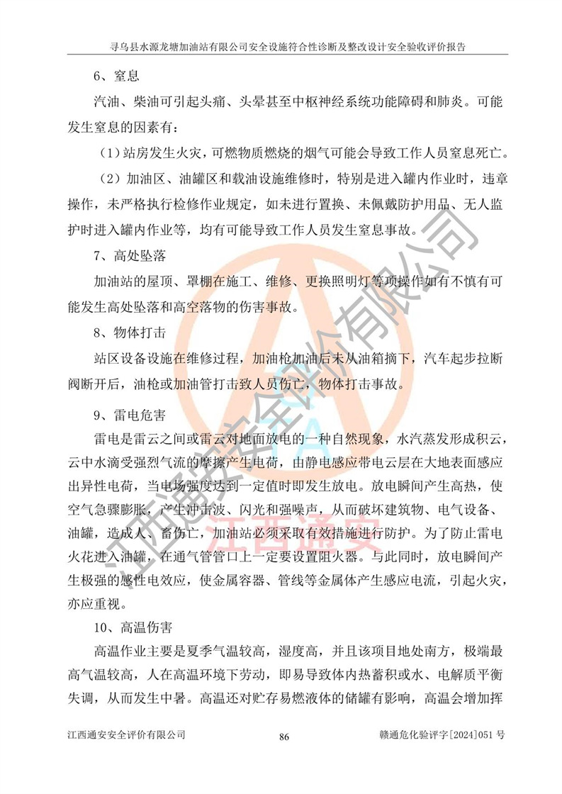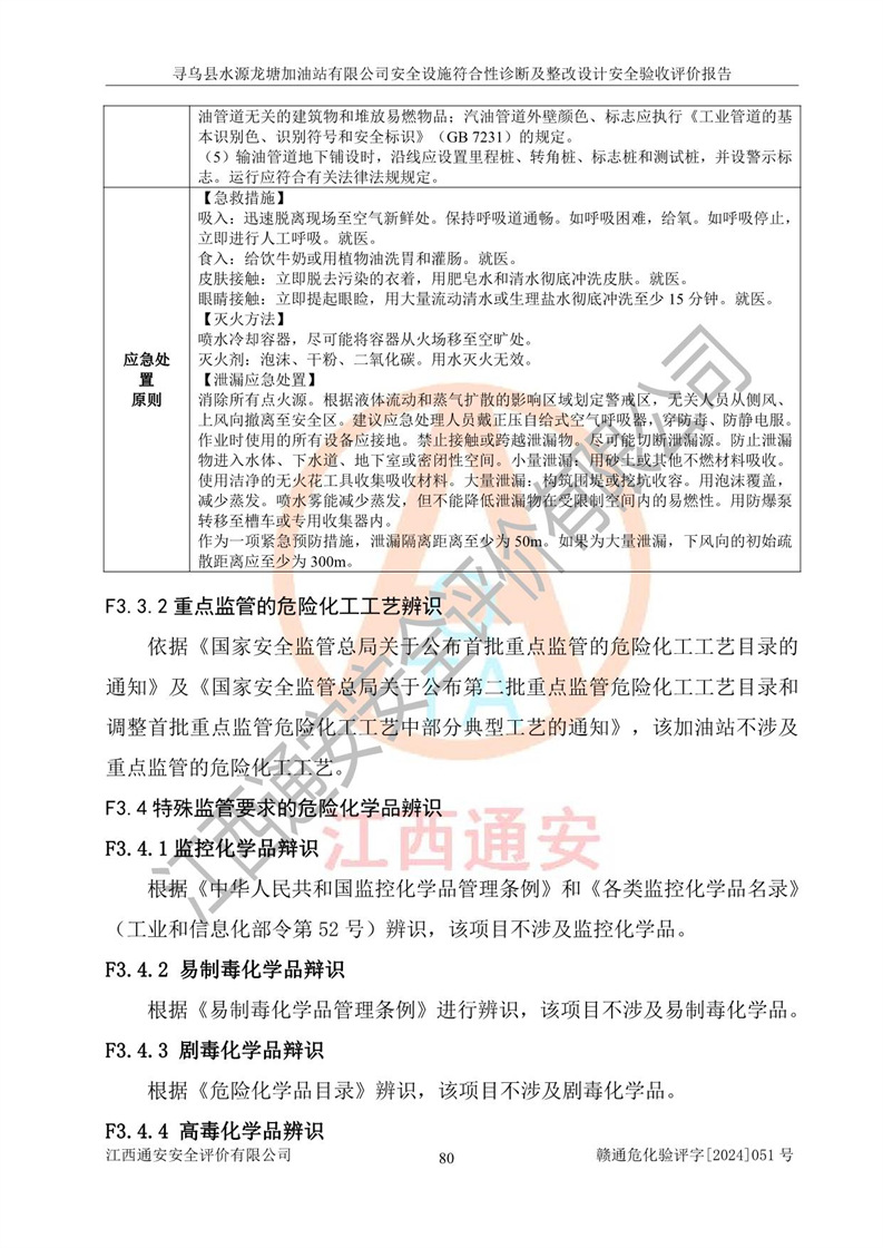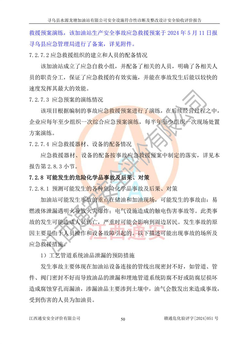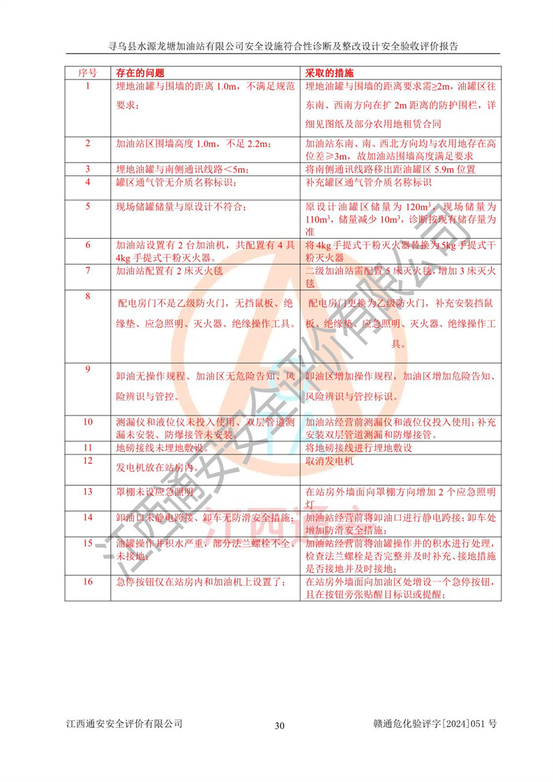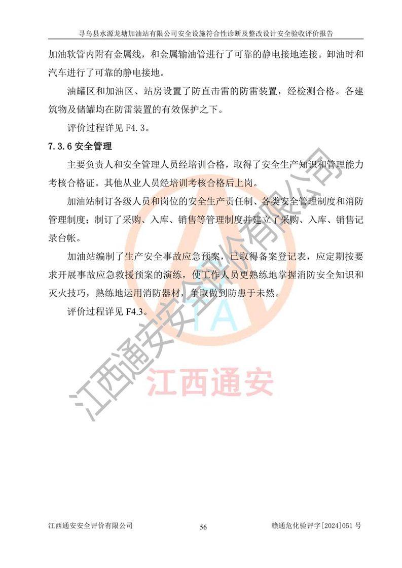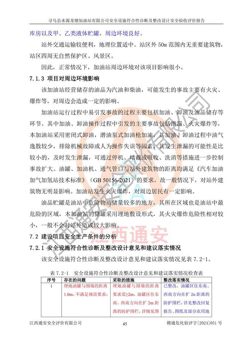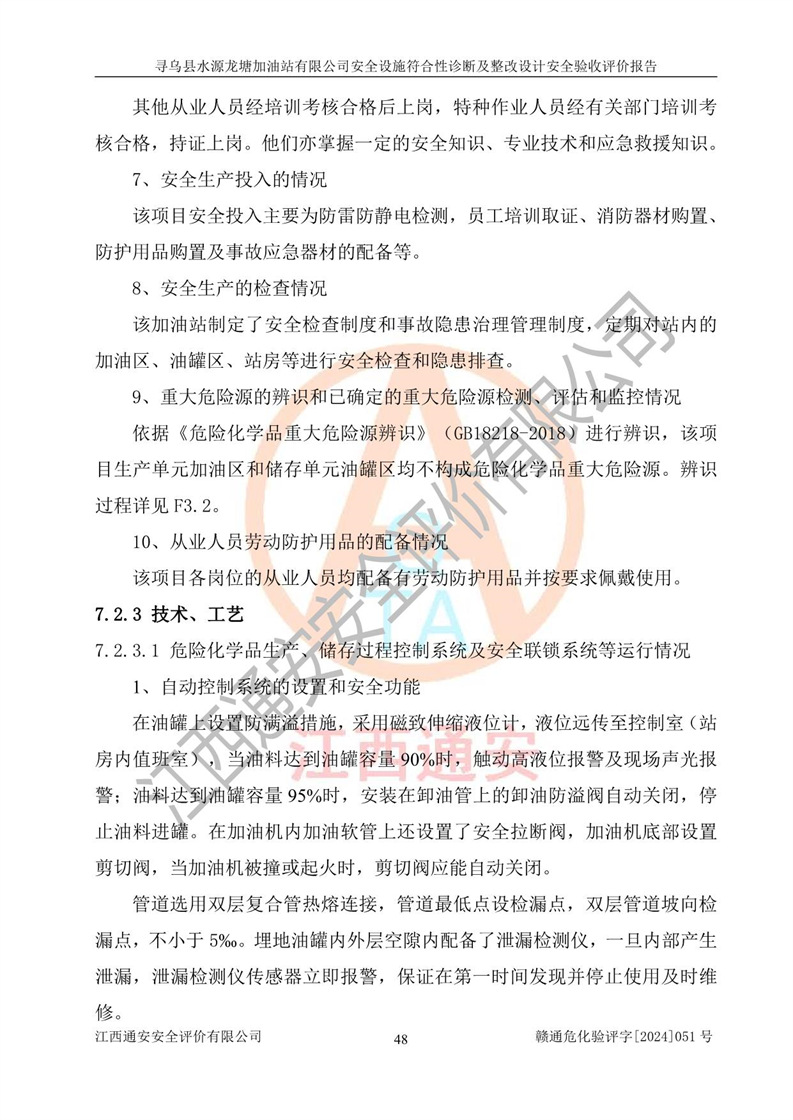 其它 | 1、尋烏縣水源龍?zhí)良佑驼居邢薰?/span>為成品油零售企業(yè),屬于二級(jí)加油站,油罐區(qū)為主要危險(xiǎn)源。該加油站不構(gòu)成危險(xiǎn)化學(xué)品重大危險(xiǎn)源。 2、尋烏縣水源龍?zhí)良佑驼居邢薰?/span>所經(jīng)營(yíng)的汽油屬于重點(diǎn)監(jiān)管危險(xiǎn)化學(xué)品,應(yīng)加強(qiáng)安全管理,根據(jù)“汽油安全措施和應(yīng)急處理原則”要求的措施進(jìn)行檢查,加油站設(shè)置了視頻監(jiān)控系統(tǒng)、具有液位報(bào)警功能的液位監(jiān)測(cè)系統(tǒng)、滲漏檢測(cè),并制定各種管理制度和操作規(guī)程,已落實(shí)到位。 3、通過(guò)本報(bào)告分析,該項(xiàng)目投入經(jīng)營(yíng)后仍將面對(duì)多種危險(xiǎn)因素,如火災(zāi),爆炸、中毒、電氣傷害、**傷害、噪聲等危險(xiǎn)有害因素。而項(xiàng)目*主要的危險(xiǎn)、有害因素是火災(zāi)、爆炸,對(duì)此,加油站全體員工**保持**的安全防護(hù)意識(shí)。 4、項(xiàng)目公用工程能夠滿足安全經(jīng)營(yíng)的基本需要。 5、該加油站內(nèi)部平面布置符合**和行業(yè)相關(guān)標(biāo)準(zhǔn)、規(guī)范的要求。建筑結(jié)構(gòu)、消防、安全設(shè)施等布置明確、合理,符合各相關(guān)規(guī)范的要求。 6、加油站取得了雷電防護(hù)裝置檢測(cè)報(bào)告。 7、項(xiàng)目油罐、通氣管口和加油機(jī)與外部環(huán)境的防火距離、平面布置、消防安全設(shè)施和措施滿足法律法規(guī)、標(biāo)準(zhǔn)規(guī)范的要求。電氣防爆保護(hù)、機(jī)械設(shè)備的安全保護(hù)等方面的安全設(shè)施建立**。 8、作業(yè)條件危險(xiǎn)性評(píng)價(jià)結(jié)果:在選定的3個(gè)單元的危險(xiǎn)程度為“一般危險(xiǎn)、需要注意”或“稍有危險(xiǎn),可以接受”,且一般危險(xiǎn)或稍有危險(xiǎn)作業(yè)環(huán)境的出現(xiàn)均由物料的危險(xiǎn)程度所決定,作業(yè)條件相對(duì)安全。 9、危險(xiǎn)度評(píng)價(jià)結(jié)果:油罐區(qū)得分為12分,為Ⅱ級(jí),屬于中度危險(xiǎn)。加油站油罐安裝高液位報(bào)警功能的液位監(jiān)測(cè)系統(tǒng),當(dāng)油料達(dá)到油罐容量90%時(shí),觸動(dòng)高液位報(bào)警裝置,油料達(dá)到油罐容量95%時(shí),自動(dòng)停止油料繼續(xù)進(jìn)罐。同時(shí),也采取了防止油品滲漏的保護(hù)措施,降低火災(zāi)爆炸危險(xiǎn),滿足安全經(jīng)營(yíng)條件要求。 10、加油站建立了安全責(zé)任制,制定了安全管理制度、操作規(guī)程,編制了事故應(yīng)急預(yù)案,配備了應(yīng)急救援器材,按要求定期進(jìn)行相關(guān)培訓(xùn)及演練。 11、該項(xiàng)目不涉及重大生產(chǎn)安全事故隱患,安全經(jīng)營(yíng)條件符合《危險(xiǎn)化學(xué)品經(jīng)營(yíng)許可證管理辦法》的要求。 12、該安全設(shè)施診斷設(shè)計(jì)整改意見(jiàn)已按要求整改完善,符合要求。 尋烏縣水源龍?zhí)良佑驼居邢薰驹谝垩b置安全設(shè)施診斷設(shè)計(jì)的安全設(shè)施及安全管理符合**及有關(guān)部門關(guān)于安全生產(chǎn)法律、法規(guī)、標(biāo)準(zhǔn)的要求,工藝設(shè)備、安全設(shè)施等運(yùn)行正常,安全設(shè)施、措施達(dá)到設(shè)計(jì)要求和預(yù)期結(jié)果,符合經(jīng)營(yíng)和儲(chǔ)存危險(xiǎn)化學(xué)品(汽油、柴油)的安全條件要求,具備了安全設(shè)施竣工驗(yàn)收條件。