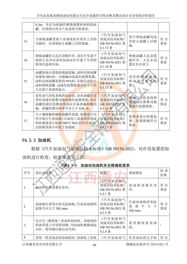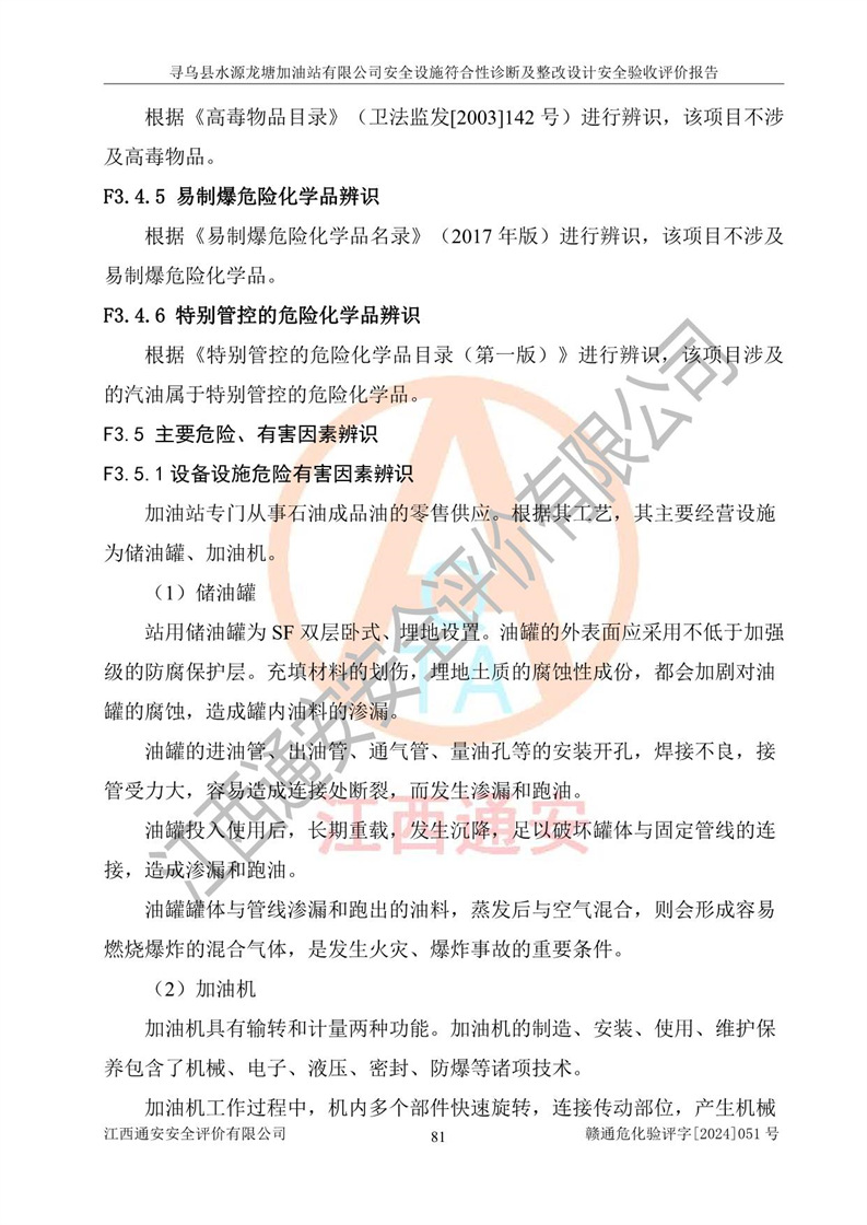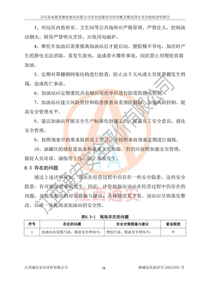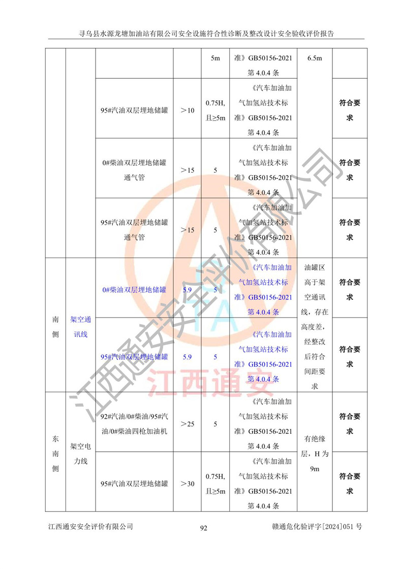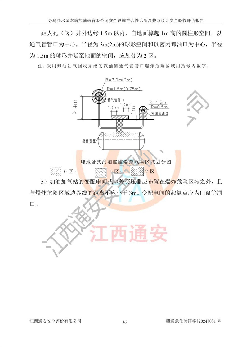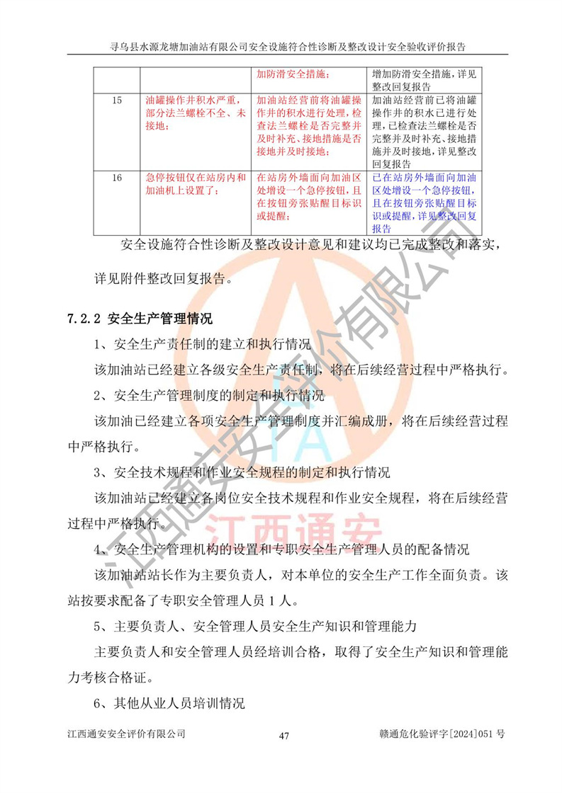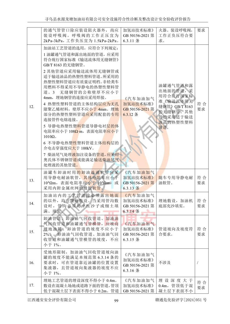 其它 | 1、尋烏縣水源龍?zhí)良佑驼居邢薰?/span>為成品油零售企業(yè),屬于二級(jí)加油站,油罐區(qū)為主要危險(xiǎn)源。該加油站不構(gòu)成危險(xiǎn)化學(xué)品重大危險(xiǎn)源。 2、尋烏縣水源龍?zhí)良佑驼居邢薰?/span>所經(jīng)營(yíng)的汽油屬于重點(diǎn)監(jiān)管危險(xiǎn)化學(xué)品,應(yīng)加強(qiáng)安全管理,根據(jù)“汽油安全措施和應(yīng)急處理原則”要求的措施進(jìn)行檢查,加油站設(shè)置了視頻監(jiān)控系統(tǒng)、具有液位報(bào)警功能的液位監(jiān)測(cè)系統(tǒng)、滲漏檢測(cè),并制定各種管理制度和操作規(guī)程,已落實(shí)到位。 3、通過(guò)本報(bào)告分析,該項(xiàng)目投入經(jīng)營(yíng)后仍將面對(duì)多種危險(xiǎn)因素,如火災(zāi),爆炸、中毒、電氣傷害、**傷害、噪聲等危險(xiǎn)有害因素。而項(xiàng)目*主要的危險(xiǎn)、有害因素是火災(zāi)、爆炸,對(duì)此,加油站全體員工**保持**的安全防護(hù)意識(shí)。 4、項(xiàng)目公用工程能夠滿足安全經(jīng)營(yíng)的基本需要。 5、該加油站內(nèi)部平面布置符合**和行業(yè)相關(guān)標(biāo)準(zhǔn)、規(guī)范的要求。建筑結(jié)構(gòu)、消防、安全設(shè)施等布置明確、合理,符合各相關(guān)規(guī)范的要求。 6、加油站取得了雷電防護(hù)裝置檢測(cè)報(bào)告。 7、項(xiàng)目油罐、通氣管口和加油機(jī)與外部環(huán)境的防火距離、平面布置、消防安全設(shè)施和措施滿足法律法規(guī)、標(biāo)準(zhǔn)規(guī)范的要求。電氣防爆保護(hù)、機(jī)械設(shè)備的安全保護(hù)等方面的安全設(shè)施建立**。 8、作業(yè)條件危險(xiǎn)性評(píng)價(jià)結(jié)果:在選定的3個(gè)單元的危險(xiǎn)程度為“一般危險(xiǎn)、需要注意”或“稍有危險(xiǎn),可以接受”,且一般危險(xiǎn)或稍有危險(xiǎn)作業(yè)環(huán)境的出現(xiàn)均由物料的危險(xiǎn)程度所決定,作業(yè)條件相對(duì)安全。 9、危險(xiǎn)度評(píng)價(jià)結(jié)果:油罐區(qū)得分為12分,為Ⅱ級(jí),屬于中度危險(xiǎn)。加油站油罐安裝高液位報(bào)警功能的液位監(jiān)測(cè)系統(tǒng),當(dāng)油料達(dá)到油罐容量90%時(shí),觸動(dòng)高液位報(bào)警裝置,油料達(dá)到油罐容量95%時(shí),自動(dòng)停止油料繼續(xù)進(jìn)罐。同時(shí),也采取了防止油品滲漏的保護(hù)措施,降低火災(zāi)爆炸危險(xiǎn),滿足安全經(jīng)營(yíng)條件要求。 10、加油站建立了安全責(zé)任制,制定了安全管理制度、操作規(guī)程,編制了事故應(yīng)急預(yù)案,配備了應(yīng)急救援器材,按要求定期進(jìn)行相關(guān)培訓(xùn)及演練。 11、該項(xiàng)目不涉及重大生產(chǎn)安全事故隱患,安全經(jīng)營(yíng)條件符合《危險(xiǎn)化學(xué)品經(jīng)營(yíng)許可證管理辦法》的要求。 12、該安全設(shè)施診斷設(shè)計(jì)整改意見(jiàn)已按要求整改完善,符合要求。 尋烏縣水源龍?zhí)良佑驼居邢薰驹谝垩b置安全設(shè)施診斷設(shè)計(jì)的安全設(shè)施及安全管理符合**及有關(guān)部門關(guān)于安全生產(chǎn)法律、法規(guī)、標(biāo)準(zhǔn)的要求,工藝設(shè)備、安全設(shè)施等運(yùn)行正常,安全設(shè)施、措施達(dá)到設(shè)計(jì)要求和預(yù)期結(jié)果,符合經(jīng)營(yíng)和儲(chǔ)存危險(xiǎn)化學(xué)品(汽油、柴油)的安全條件要求,具備了安全設(shè)施竣工驗(yàn)收條件。