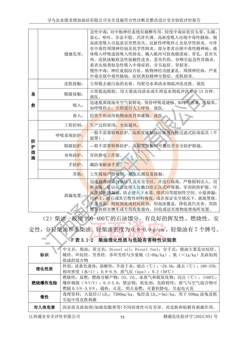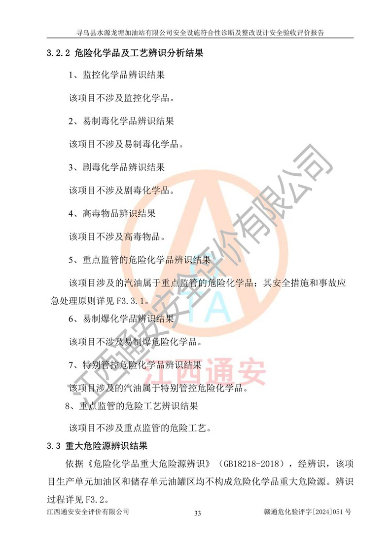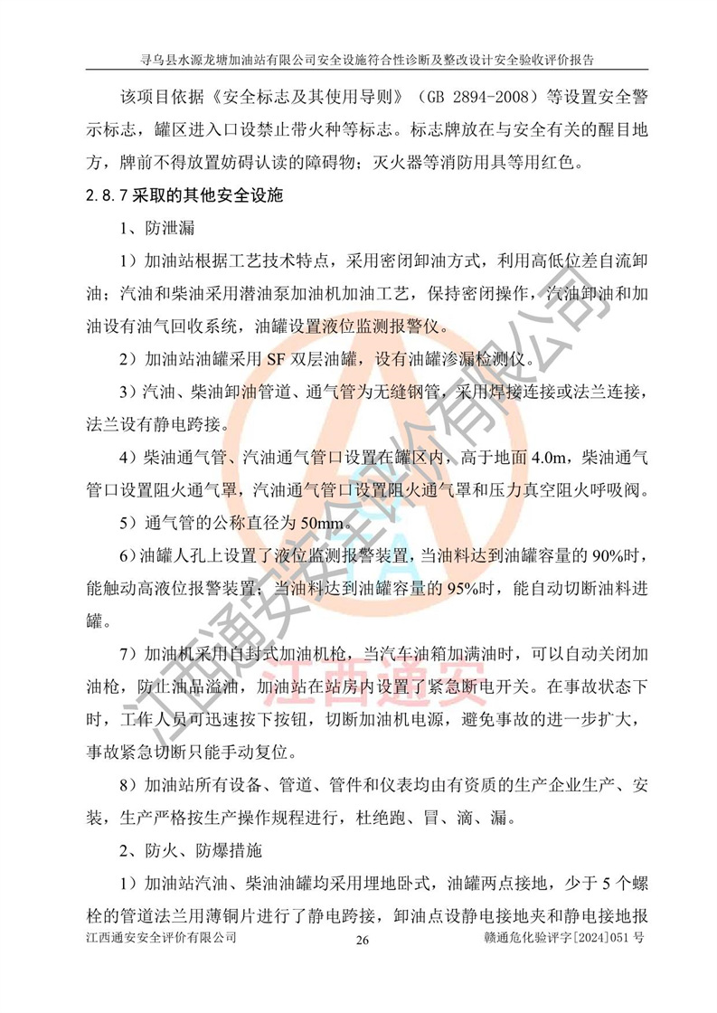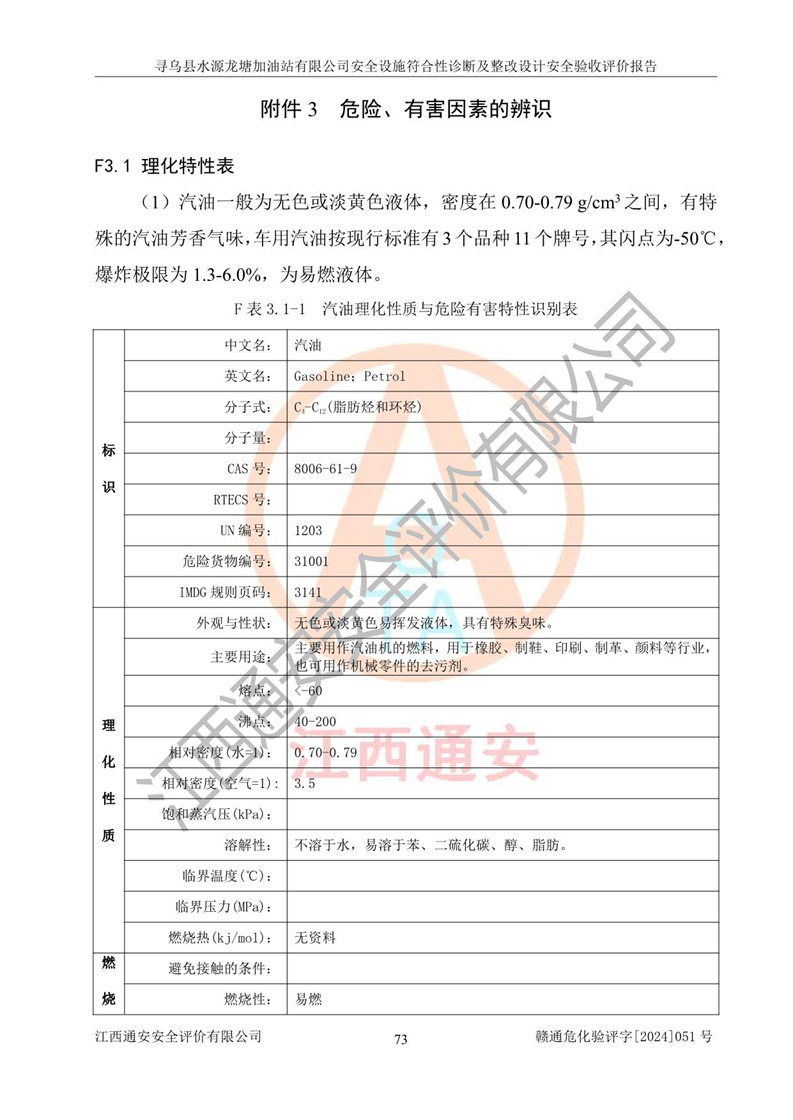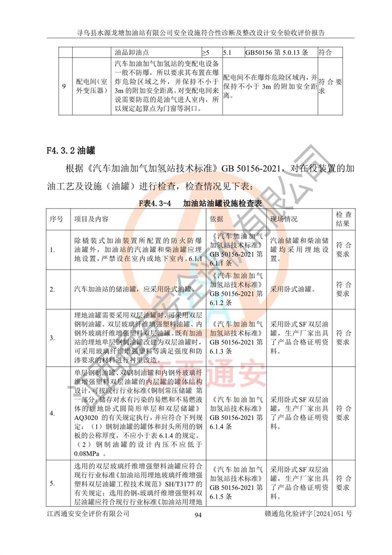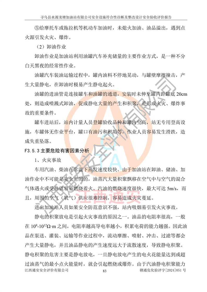 其它 | 1、尋烏縣水源龍?zhí)良佑驼居邢薰?/span>為成品油零售企業(yè),屬于二級(jí)加油站,油罐區(qū)為主要危險(xiǎn)源。該加油站不構(gòu)成危險(xiǎn)化學(xué)品重大危險(xiǎn)源。 2、尋烏縣水源龍?zhí)良佑驼居邢薰?/span>所經(jīng)營(yíng)的汽油屬于重點(diǎn)監(jiān)管危險(xiǎn)化學(xué)品,應(yīng)加強(qiáng)安全管理,根據(jù)“汽油安全措施和應(yīng)急處理原則”要求的措施進(jìn)行檢查,加油站設(shè)置了視頻監(jiān)控系統(tǒng)、具有液位報(bào)警功能的液位監(jiān)測(cè)系統(tǒng)、滲漏檢測(cè),并制定各種管理制度和操作規(guī)程,已落實(shí)到位。 3、通過(guò)本報(bào)告分析,該項(xiàng)目投入經(jīng)營(yíng)后仍將面對(duì)多種危險(xiǎn)因素,如火災(zāi),爆炸、中毒、電氣傷害、**傷害、噪聲等危險(xiǎn)有害因素。而項(xiàng)目*主要的危險(xiǎn)、有害因素是火災(zāi)、爆炸,對(duì)此,加油站全體員工**保持**的安全防護(hù)意識(shí)。 4、項(xiàng)目公用工程能夠滿足安全經(jīng)營(yíng)的基本需要。 5、該加油站內(nèi)部平面布置符合**和行業(yè)相關(guān)標(biāo)準(zhǔn)、規(guī)范的要求。建筑結(jié)構(gòu)、消防、安全設(shè)施等布置明確、合理,符合各相關(guān)規(guī)范的要求。 6、加油站取得了雷電防護(hù)裝置檢測(cè)報(bào)告。 7、項(xiàng)目油罐、通氣管口和加油機(jī)與外部環(huán)境的防火距離、平面布置、消防安全設(shè)施和措施滿足法律法規(guī)、標(biāo)準(zhǔn)規(guī)范的要求。電氣防爆保護(hù)、機(jī)械設(shè)備的安全保護(hù)等方面的安全設(shè)施建立**。 8、作業(yè)條件危險(xiǎn)性評(píng)價(jià)結(jié)果:在選定的3個(gè)單元的危險(xiǎn)程度為“一般危險(xiǎn)、需要注意”或“稍有危險(xiǎn),可以接受”,且一般危險(xiǎn)或稍有危險(xiǎn)作業(yè)環(huán)境的出現(xiàn)均由物料的危險(xiǎn)程度所決定,作業(yè)條件相對(duì)安全。 9、危險(xiǎn)度評(píng)價(jià)結(jié)果:油罐區(qū)得分為12分,為Ⅱ級(jí),屬于中度危險(xiǎn)。加油站油罐安裝高液位報(bào)警功能的液位監(jiān)測(cè)系統(tǒng),當(dāng)油料達(dá)到油罐容量90%時(shí),觸動(dòng)高液位報(bào)警裝置,油料達(dá)到油罐容量95%時(shí),自動(dòng)停止油料繼續(xù)進(jìn)罐。同時(shí),也采取了防止油品滲漏的保護(hù)措施,降低火災(zāi)爆炸危險(xiǎn),滿足安全經(jīng)營(yíng)條件要求。 10、加油站建立了安全責(zé)任制,制定了安全管理制度、操作規(guī)程,編制了事故應(yīng)急預(yù)案,配備了應(yīng)急救援器材,按要求定期進(jìn)行相關(guān)培訓(xùn)及演練。 11、該項(xiàng)目不涉及重大生產(chǎn)安全事故隱患,安全經(jīng)營(yíng)條件符合《危險(xiǎn)化學(xué)品經(jīng)營(yíng)許可證管理辦法》的要求。 12、該安全設(shè)施診斷設(shè)計(jì)整改意見(jiàn)已按要求整改完善,符合要求。 尋烏縣水源龍?zhí)良佑驼居邢薰驹谝垩b置安全設(shè)施診斷設(shè)計(jì)的安全設(shè)施及安全管理符合**及有關(guān)部門關(guān)于安全生產(chǎn)法律、法規(guī)、標(biāo)準(zhǔn)的要求,工藝設(shè)備、安全設(shè)施等運(yùn)行正常,安全設(shè)施、措施達(dá)到設(shè)計(jì)要求和預(yù)期結(jié)果,符合經(jīng)營(yíng)和儲(chǔ)存危險(xiǎn)化學(xué)品(汽油、柴油)的安全條件要求,具備了安全設(shè)施竣工驗(yàn)收條件。