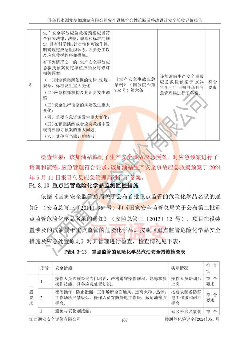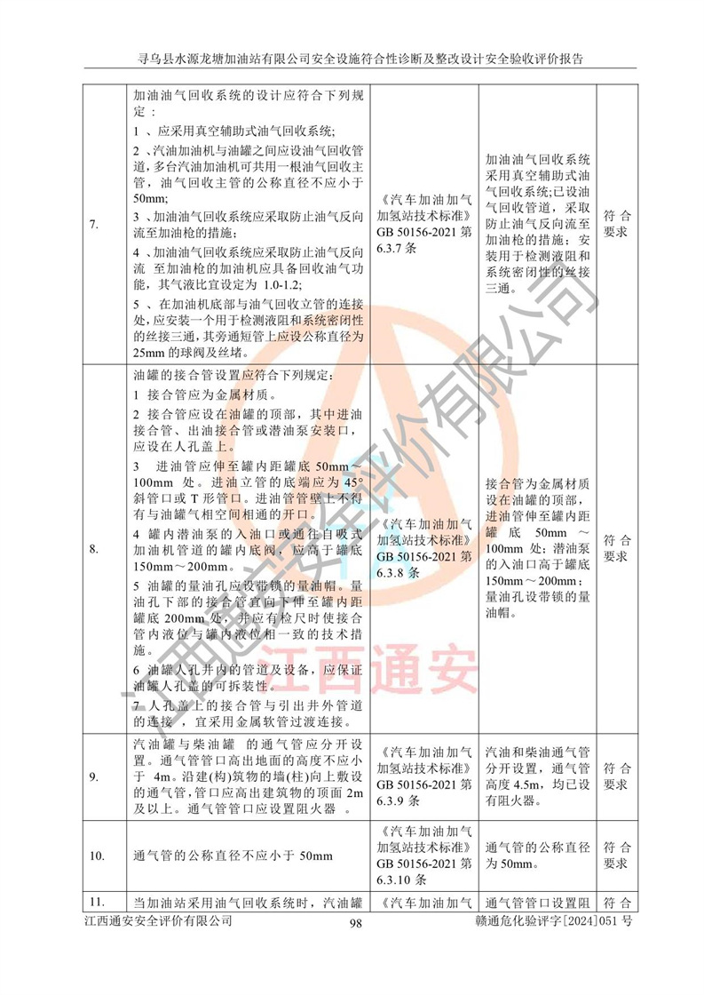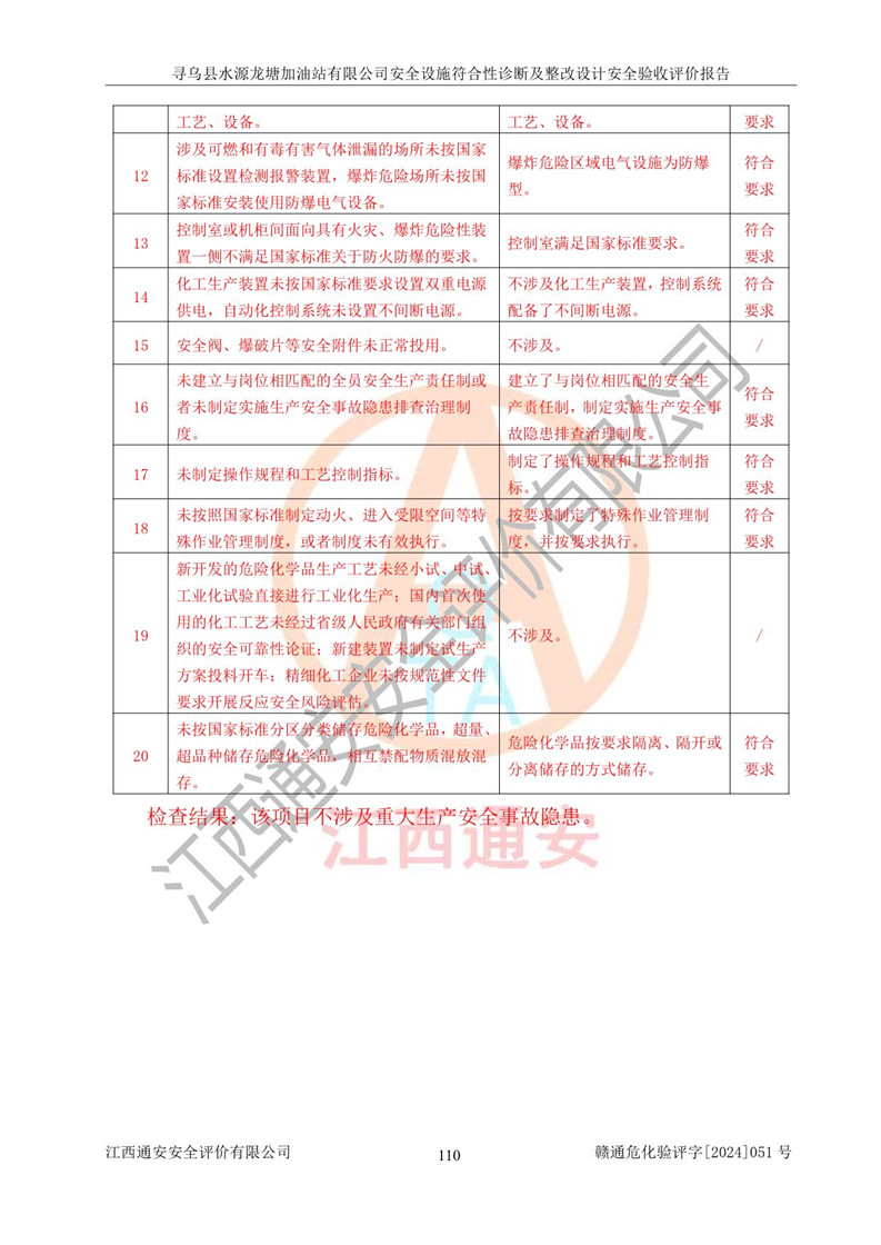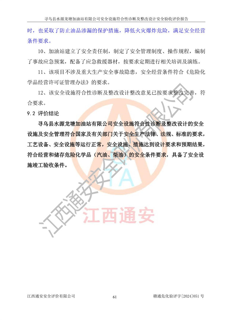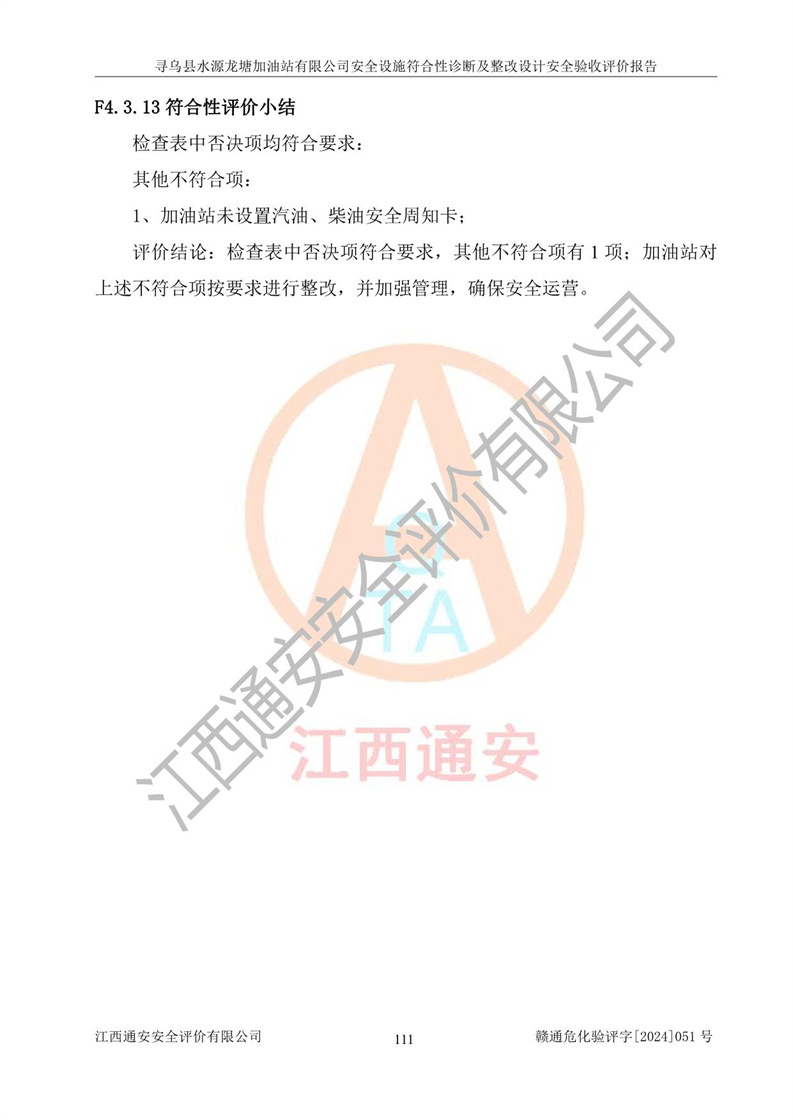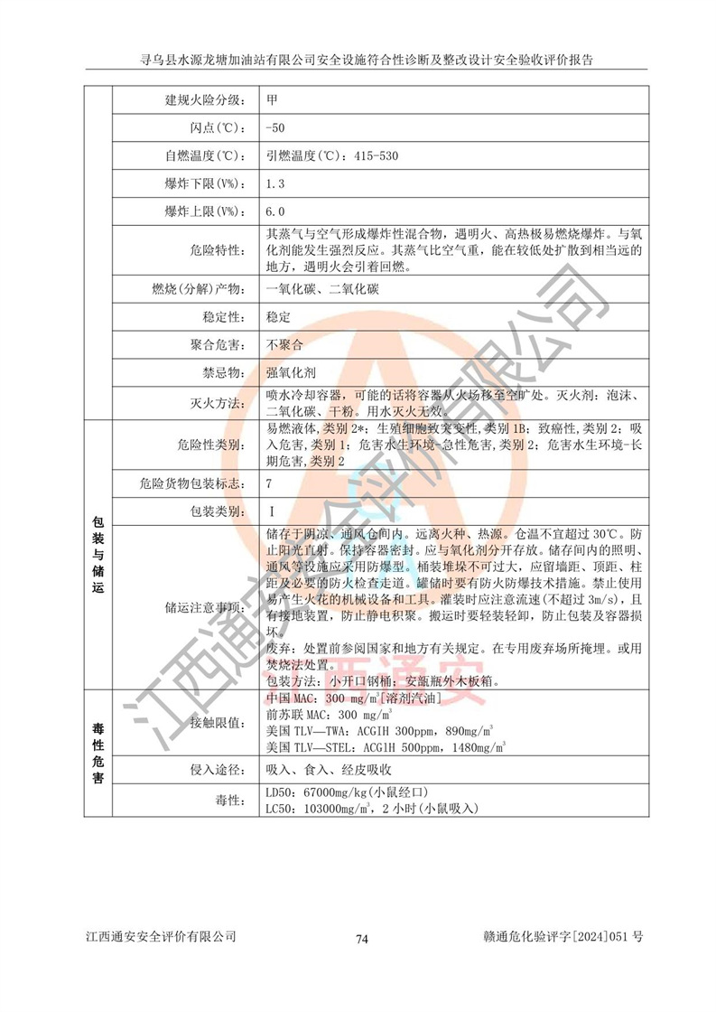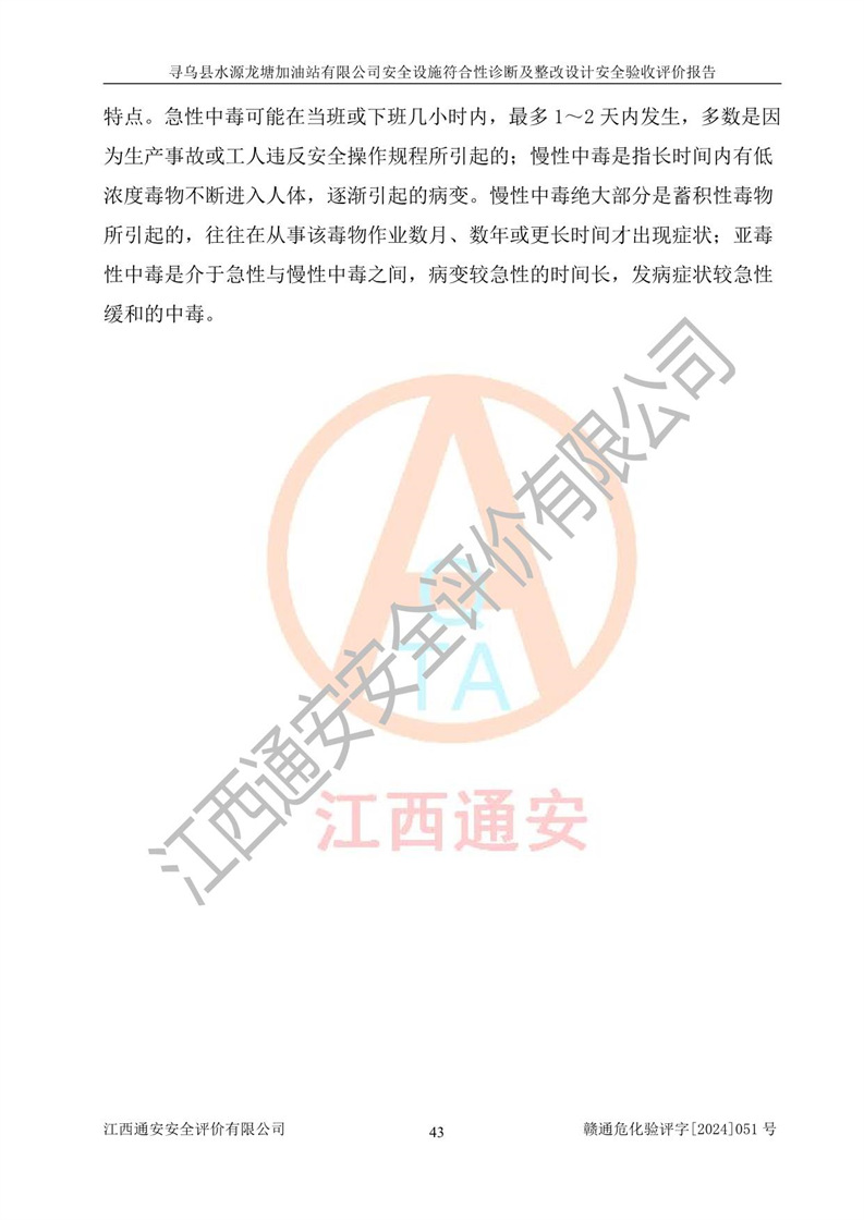 其它 | 1、尋烏縣水源龍?zhí)良佑驼居邢薰?/span>為成品油零售企業(yè),屬于二級(jí)加油站,油罐區(qū)為主要危險(xiǎn)源。該加油站不構(gòu)成危險(xiǎn)化學(xué)品重大危險(xiǎn)源。 2、尋烏縣水源龍?zhí)良佑驼居邢薰?/span>所經(jīng)營(yíng)的汽油屬于重點(diǎn)監(jiān)管危險(xiǎn)化學(xué)品,應(yīng)加強(qiáng)安全管理,根據(jù)“汽油安全措施和應(yīng)急處理原則”要求的措施進(jìn)行檢查,加油站設(shè)置了視頻監(jiān)控系統(tǒng)、具有液位報(bào)警功能的液位監(jiān)測(cè)系統(tǒng)、滲漏檢測(cè),并制定各種管理制度和操作規(guī)程,已落實(shí)到位。 3、通過(guò)本報(bào)告分析,該項(xiàng)目投入經(jīng)營(yíng)后仍將面對(duì)多種危險(xiǎn)因素,如火災(zāi),爆炸、中毒、電氣傷害、**傷害、噪聲等危險(xiǎn)有害因素。而項(xiàng)目*主要的危險(xiǎn)、有害因素是火災(zāi)、爆炸,對(duì)此,加油站全體員工**保持**的安全防護(hù)意識(shí)。 4、項(xiàng)目公用工程能夠滿足安全經(jīng)營(yíng)的基本需要。 5、該加油站內(nèi)部平面布置符合**和行業(yè)相關(guān)標(biāo)準(zhǔn)、規(guī)范的要求。建筑結(jié)構(gòu)、消防、安全設(shè)施等布置明確、合理,符合各相關(guān)規(guī)范的要求。 6、加油站取得了雷電防護(hù)裝置檢測(cè)報(bào)告。 7、項(xiàng)目油罐、通氣管口和加油機(jī)與外部環(huán)境的防火距離、平面布置、消防安全設(shè)施和措施滿足法律法規(guī)、標(biāo)準(zhǔn)規(guī)范的要求。電氣防爆保護(hù)、機(jī)械設(shè)備的安全保護(hù)等方面的安全設(shè)施建立**。 8、作業(yè)條件危險(xiǎn)性評(píng)價(jià)結(jié)果:在選定的3個(gè)單元的危險(xiǎn)程度為“一般危險(xiǎn)、需要注意”或“稍有危險(xiǎn),可以接受”,且一般危險(xiǎn)或稍有危險(xiǎn)作業(yè)環(huán)境的出現(xiàn)均由物料的危險(xiǎn)程度所決定,作業(yè)條件相對(duì)安全。 9、危險(xiǎn)度評(píng)價(jià)結(jié)果:油罐區(qū)得分為12分,為Ⅱ級(jí),屬于中度危險(xiǎn)。加油站油罐安裝高液位報(bào)警功能的液位監(jiān)測(cè)系統(tǒng),當(dāng)油料達(dá)到油罐容量90%時(shí),觸動(dòng)高液位報(bào)警裝置,油料達(dá)到油罐容量95%時(shí),自動(dòng)停止油料繼續(xù)進(jìn)罐。同時(shí),也采取了防止油品滲漏的保護(hù)措施,降低火災(zāi)爆炸危險(xiǎn),滿足安全經(jīng)營(yíng)條件要求。 10、加油站建立了安全責(zé)任制,制定了安全管理制度、操作規(guī)程,編制了事故應(yīng)急預(yù)案,配備了應(yīng)急救援器材,按要求定期進(jìn)行相關(guān)培訓(xùn)及演練。 11、該項(xiàng)目不涉及重大生產(chǎn)安全事故隱患,安全經(jīng)營(yíng)條件符合《危險(xiǎn)化學(xué)品經(jīng)營(yíng)許可證管理辦法》的要求。 12、該安全設(shè)施診斷設(shè)計(jì)整改意見(jiàn)已按要求整改完善,符合要求。 尋烏縣水源龍?zhí)良佑驼居邢薰驹谝垩b置安全設(shè)施診斷設(shè)計(jì)的安全設(shè)施及安全管理符合**及有關(guān)部門關(guān)于安全生產(chǎn)法律、法規(guī)、標(biāo)準(zhǔn)的要求,工藝設(shè)備、安全設(shè)施等運(yùn)行正常,安全設(shè)施、措施達(dá)到設(shè)計(jì)要求和預(yù)期結(jié)果,符合經(jīng)營(yíng)和儲(chǔ)存危險(xiǎn)化學(xué)品(汽油、柴油)的安全條件要求,具備了安全設(shè)施竣工驗(yàn)收條件。