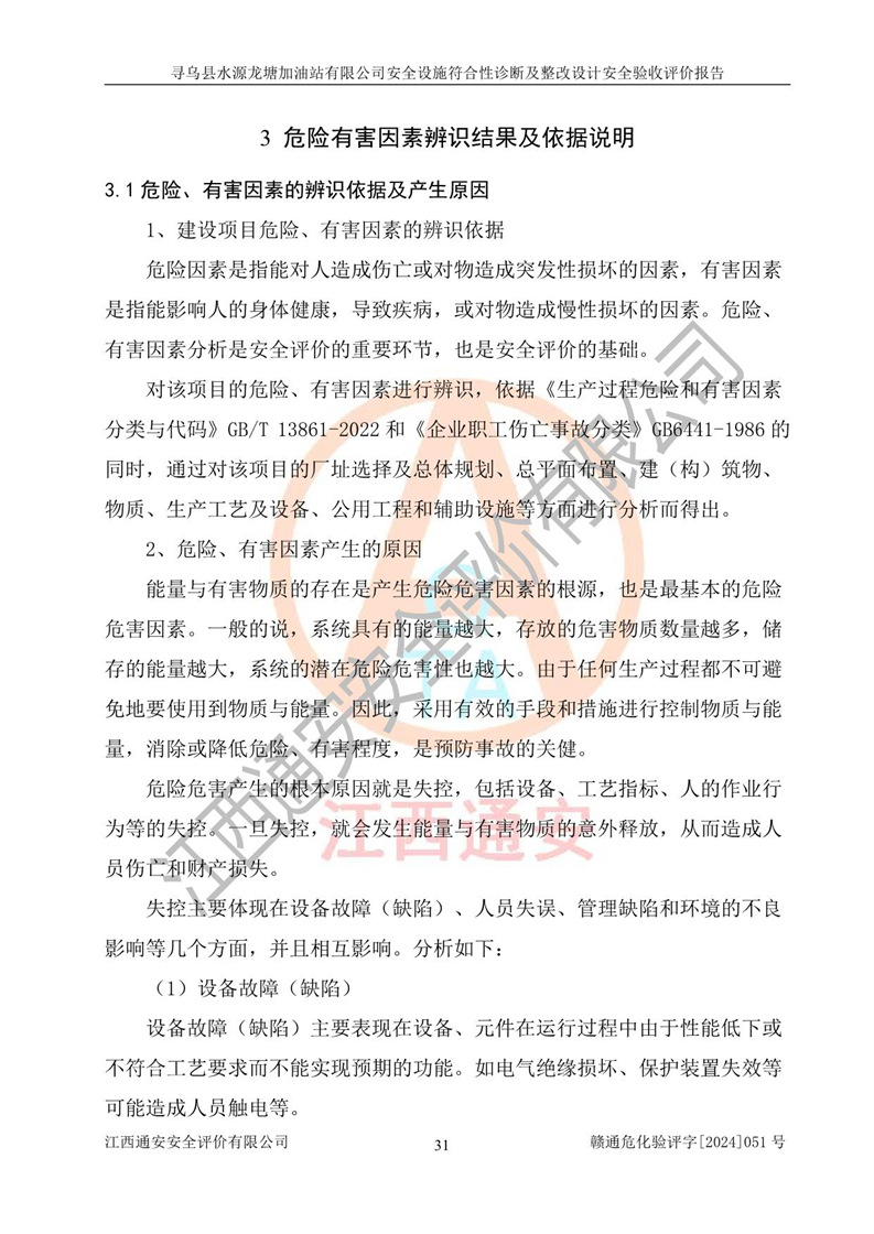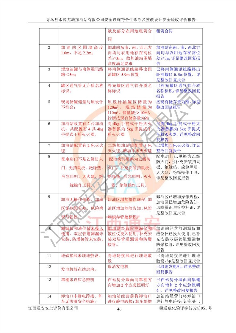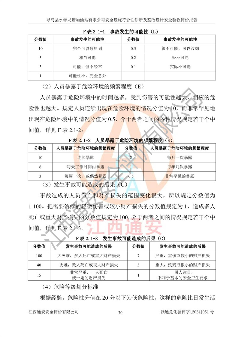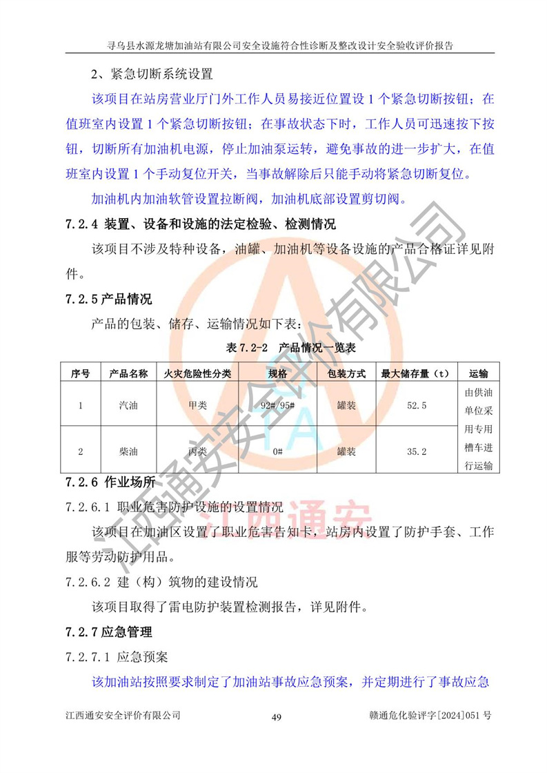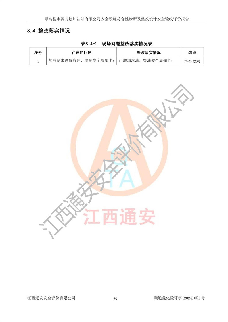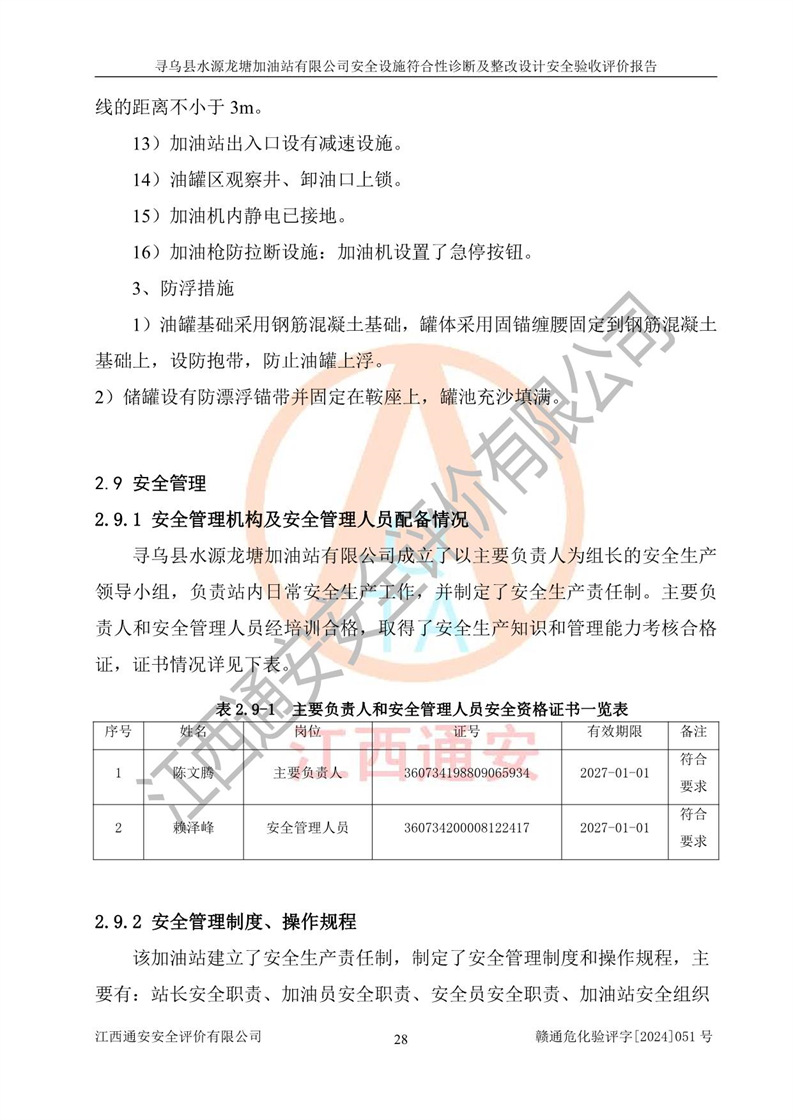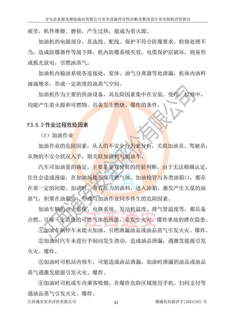 其它 | 1、尋烏縣水源龍?zhí)良佑驼居邢薰?/span>為成品油零售企業(yè),屬于二級(jí)加油站,油罐區(qū)為主要危險(xiǎn)源。該加油站不構(gòu)成危險(xiǎn)化學(xué)品重大危險(xiǎn)源。 2、尋烏縣水源龍?zhí)良佑驼居邢薰?/span>所經(jīng)營(yíng)的汽油屬于重點(diǎn)監(jiān)管危險(xiǎn)化學(xué)品,應(yīng)加強(qiáng)安全管理,根據(jù)“汽油安全措施和應(yīng)急處理原則”要求的措施進(jìn)行檢查,加油站設(shè)置了視頻監(jiān)控系統(tǒng)、具有液位報(bào)警功能的液位監(jiān)測(cè)系統(tǒng)、滲漏檢測(cè),并制定各種管理制度和操作規(guī)程,已落實(shí)到位。 3、通過(guò)本報(bào)告分析,該項(xiàng)目投入經(jīng)營(yíng)后仍將面對(duì)多種危險(xiǎn)因素,如火災(zāi),爆炸、中毒、電氣傷害、**傷害、噪聲等危險(xiǎn)有害因素。而項(xiàng)目*主要的危險(xiǎn)、有害因素是火災(zāi)、爆炸,對(duì)此,加油站全體員工**保持**的安全防護(hù)意識(shí)。 4、項(xiàng)目公用工程能夠滿足安全經(jīng)營(yíng)的基本需要。 5、該加油站內(nèi)部平面布置符合**和行業(yè)相關(guān)標(biāo)準(zhǔn)、規(guī)范的要求。建筑結(jié)構(gòu)、消防、安全設(shè)施等布置明確、合理,符合各相關(guān)規(guī)范的要求。 6、加油站取得了雷電防護(hù)裝置檢測(cè)報(bào)告。 7、項(xiàng)目油罐、通氣管口和加油機(jī)與外部環(huán)境的防火距離、平面布置、消防安全設(shè)施和措施滿足法律法規(guī)、標(biāo)準(zhǔn)規(guī)范的要求。電氣防爆保護(hù)、機(jī)械設(shè)備的安全保護(hù)等方面的安全設(shè)施建立**。 8、作業(yè)條件危險(xiǎn)性評(píng)價(jià)結(jié)果:在選定的3個(gè)單元的危險(xiǎn)程度為“一般危險(xiǎn)、需要注意”或“稍有危險(xiǎn),可以接受”,且一般危險(xiǎn)或稍有危險(xiǎn)作業(yè)環(huán)境的出現(xiàn)均由物料的危險(xiǎn)程度所決定,作業(yè)條件相對(duì)安全。 9、危險(xiǎn)度評(píng)價(jià)結(jié)果:油罐區(qū)得分為12分,為Ⅱ級(jí),屬于中度危險(xiǎn)。加油站油罐安裝高液位報(bào)警功能的液位監(jiān)測(cè)系統(tǒng),當(dāng)油料達(dá)到油罐容量90%時(shí),觸動(dòng)高液位報(bào)警裝置,油料達(dá)到油罐容量95%時(shí),自動(dòng)停止油料繼續(xù)進(jìn)罐。同時(shí),也采取了防止油品滲漏的保護(hù)措施,降低火災(zāi)爆炸危險(xiǎn),滿足安全經(jīng)營(yíng)條件要求。 10、加油站建立了安全責(zé)任制,制定了安全管理制度、操作規(guī)程,編制了事故應(yīng)急預(yù)案,配備了應(yīng)急救援器材,按要求定期進(jìn)行相關(guān)培訓(xùn)及演練。 11、該項(xiàng)目不涉及重大生產(chǎn)安全事故隱患,安全經(jīng)營(yíng)條件符合《危險(xiǎn)化學(xué)品經(jīng)營(yíng)許可證管理辦法》的要求。 12、該安全設(shè)施診斷設(shè)計(jì)整改意見(jiàn)已按要求整改完善,符合要求。 尋烏縣水源龍?zhí)良佑驼居邢薰驹谝垩b置安全設(shè)施診斷設(shè)計(jì)的安全設(shè)施及安全管理符合**及有關(guān)部門關(guān)于安全生產(chǎn)法律、法規(guī)、標(biāo)準(zhǔn)的要求,工藝設(shè)備、安全設(shè)施等運(yùn)行正常,安全設(shè)施、措施達(dá)到設(shè)計(jì)要求和預(yù)期結(jié)果,符合經(jīng)營(yíng)和儲(chǔ)存危險(xiǎn)化學(xué)品(汽油、柴油)的安全條件要求,具備了安全設(shè)施竣工驗(yàn)收條件。