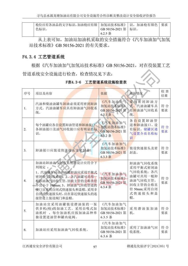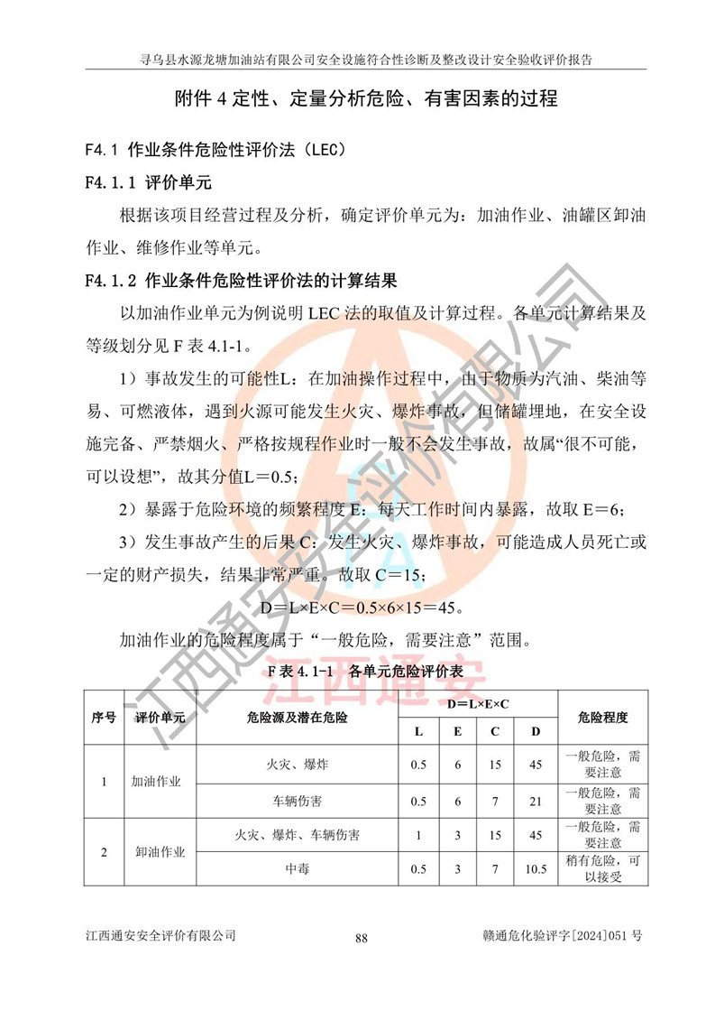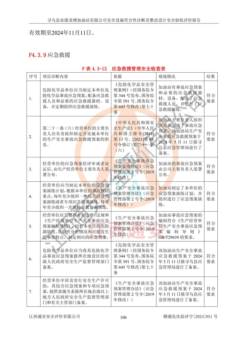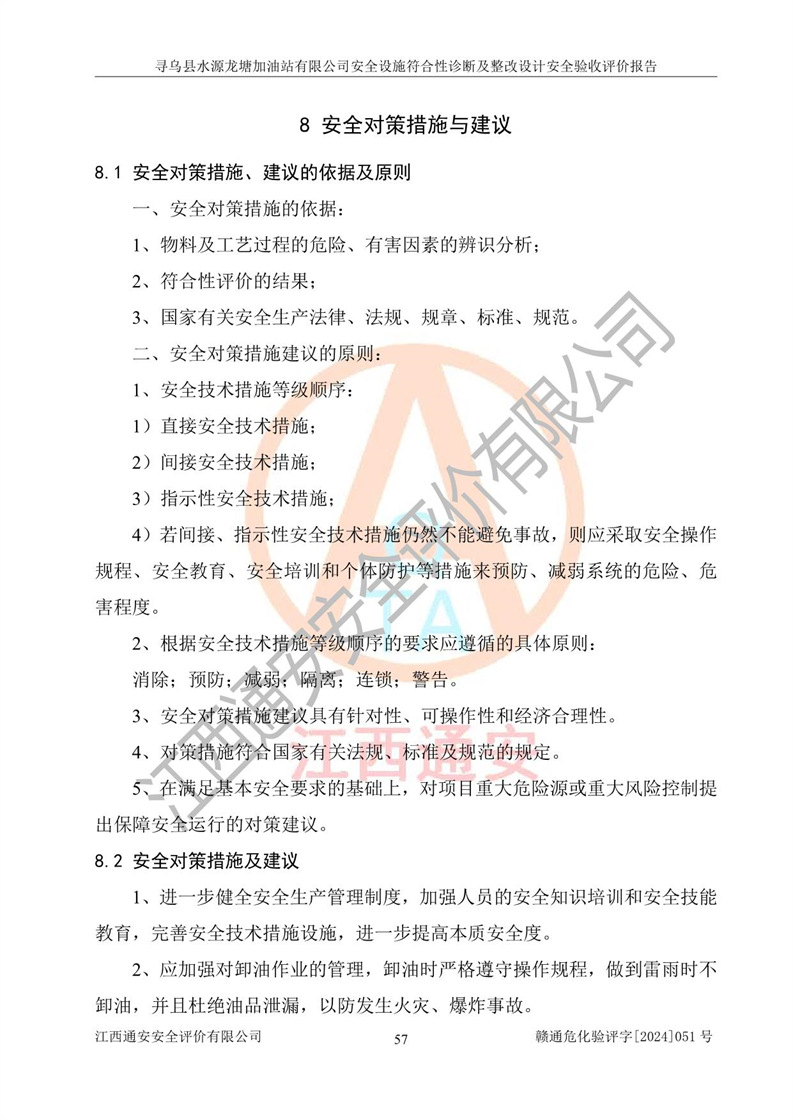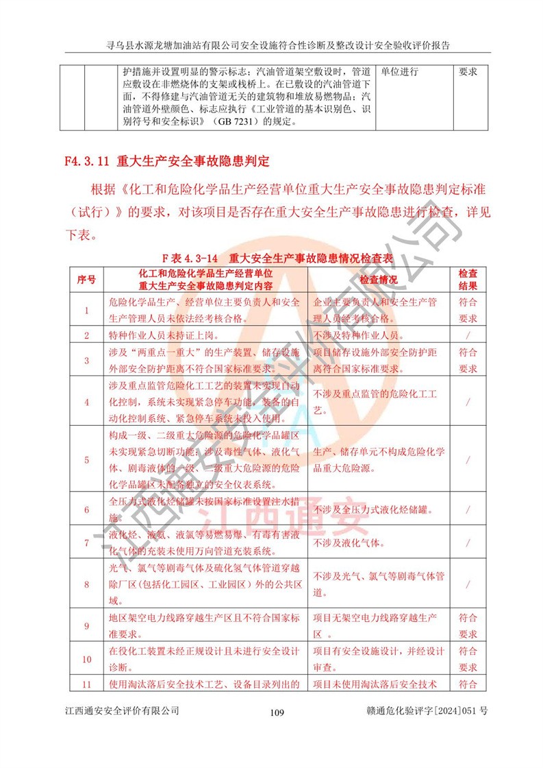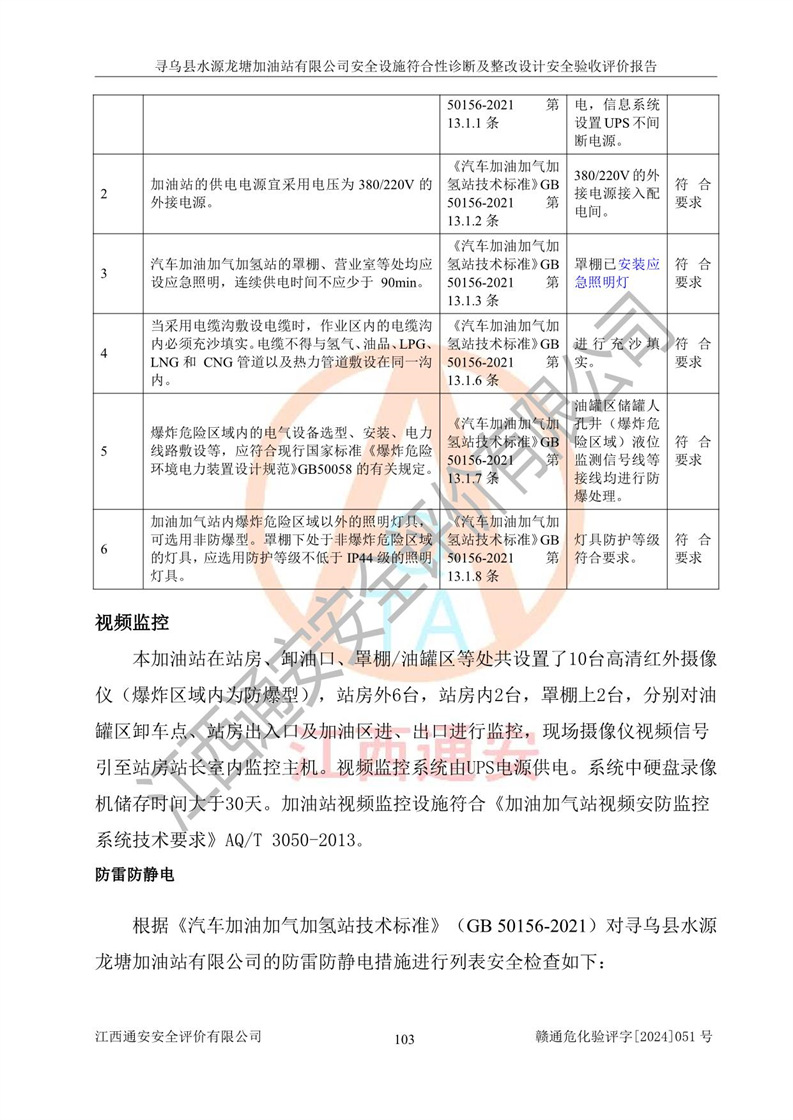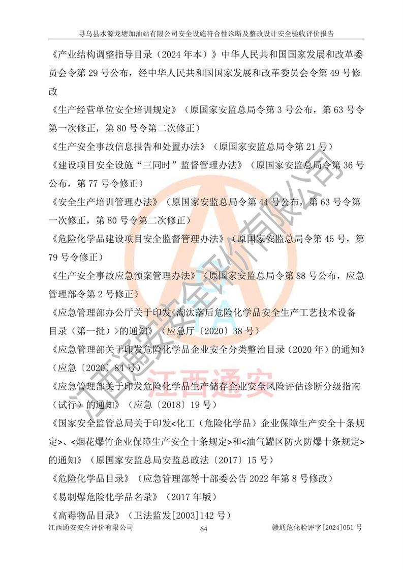其它 | 1、尋烏縣水源龍?zhí)良佑驼居邢薰?/span>為成品油零售企業(yè),屬于二級(jí)加油站,油罐區(qū)為主要危險(xiǎn)源。該加油站不構(gòu)成危險(xiǎn)化學(xué)品重大危險(xiǎn)源。 2、尋烏縣水源龍?zhí)良佑驼居邢薰?/span>所經(jīng)營(yíng)的汽油屬于重點(diǎn)監(jiān)管危險(xiǎn)化學(xué)品,應(yīng)加強(qiáng)安全管理,根據(jù)“汽油安全措施和應(yīng)急處理原則”要求的措施進(jìn)行檢查,加油站設(shè)置了視頻監(jiān)控系統(tǒng)、具有液位報(bào)警功能的液位監(jiān)測(cè)系統(tǒng)、滲漏檢測(cè),并制定各種管理制度和操作規(guī)程,已落實(shí)到位。 3、通過(guò)本報(bào)告分析,該項(xiàng)目投入經(jīng)營(yíng)后仍將面對(duì)多種危險(xiǎn)因素,如火災(zāi),爆炸、中毒、電氣傷害、**傷害、噪聲等危險(xiǎn)有害因素。而項(xiàng)目*主要的危險(xiǎn)、有害因素是火災(zāi)、爆炸,對(duì)此,加油站全體員工**保持**的安全防護(hù)意識(shí)。 4、項(xiàng)目公用工程能夠滿足安全經(jīng)營(yíng)的基本需要。 5、該加油站內(nèi)部平面布置符合**和行業(yè)相關(guān)標(biāo)準(zhǔn)、規(guī)范的要求。建筑結(jié)構(gòu)、消防、安全設(shè)施等布置明確、合理,符合各相關(guān)規(guī)范的要求。 6、加油站取得了雷電防護(hù)裝置檢測(cè)報(bào)告。 7、項(xiàng)目油罐、通氣管口和加油機(jī)與外部環(huán)境的防火距離、平面布置、消防安全設(shè)施和措施滿足法律法規(guī)、標(biāo)準(zhǔn)規(guī)范的要求。電氣防爆保護(hù)、機(jī)械設(shè)備的安全保護(hù)等方面的安全設(shè)施建立**。 8、作業(yè)條件危險(xiǎn)性評(píng)價(jià)結(jié)果:在選定的3個(gè)單元的危險(xiǎn)程度為“一般危險(xiǎn)、需要注意”或“稍有危險(xiǎn),可以接受”,且一般危險(xiǎn)或稍有危險(xiǎn)作業(yè)環(huán)境的出現(xiàn)均由物料的危險(xiǎn)程度所決定,作業(yè)條件相對(duì)安全。 9、危險(xiǎn)度評(píng)價(jià)結(jié)果:油罐區(qū)得分為12分,為Ⅱ級(jí),屬于中度危險(xiǎn)。加油站油罐安裝高液位報(bào)警功能的液位監(jiān)測(cè)系統(tǒng),當(dāng)油料達(dá)到油罐容量90%時(shí),觸動(dòng)高液位報(bào)警裝置,油料達(dá)到油罐容量95%時(shí),自動(dòng)停止油料繼續(xù)進(jìn)罐。同時(shí),也采取了防止油品滲漏的保護(hù)措施,降低火災(zāi)爆炸危險(xiǎn),滿足安全經(jīng)營(yíng)條件要求。 10、加油站建立了安全責(zé)任制,制定了安全管理制度、操作規(guī)程,編制了事故應(yīng)急預(yù)案,配備了應(yīng)急救援器材,按要求定期進(jìn)行相關(guān)培訓(xùn)及演練。 11、該項(xiàng)目不涉及重大生產(chǎn)安全事故隱患,安全經(jīng)營(yíng)條件符合《危險(xiǎn)化學(xué)品經(jīng)營(yíng)許可證管理辦法》的要求。 12、該安全設(shè)施診斷設(shè)計(jì)整改意見(jiàn)已按要求整改完善,符合要求。 尋烏縣水源龍?zhí)良佑驼居邢薰驹谝垩b置安全設(shè)施診斷設(shè)計(jì)的安全設(shè)施及安全管理符合**及有關(guān)部門關(guān)于安全生產(chǎn)法律、法規(guī)、標(biāo)準(zhǔn)的要求,工藝設(shè)備、安全設(shè)施等運(yùn)行正常,安全設(shè)施、措施達(dá)到設(shè)計(jì)要求和預(yù)期結(jié)果,符合經(jīng)營(yíng)和儲(chǔ)存危險(xiǎn)化學(xué)品(汽油、柴油)的安全條件要求,具備了安全設(shè)施竣工驗(yàn)收條件。