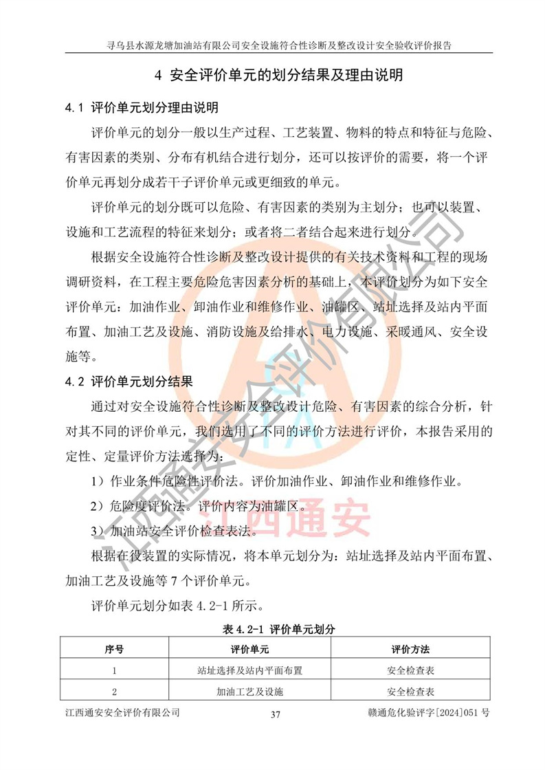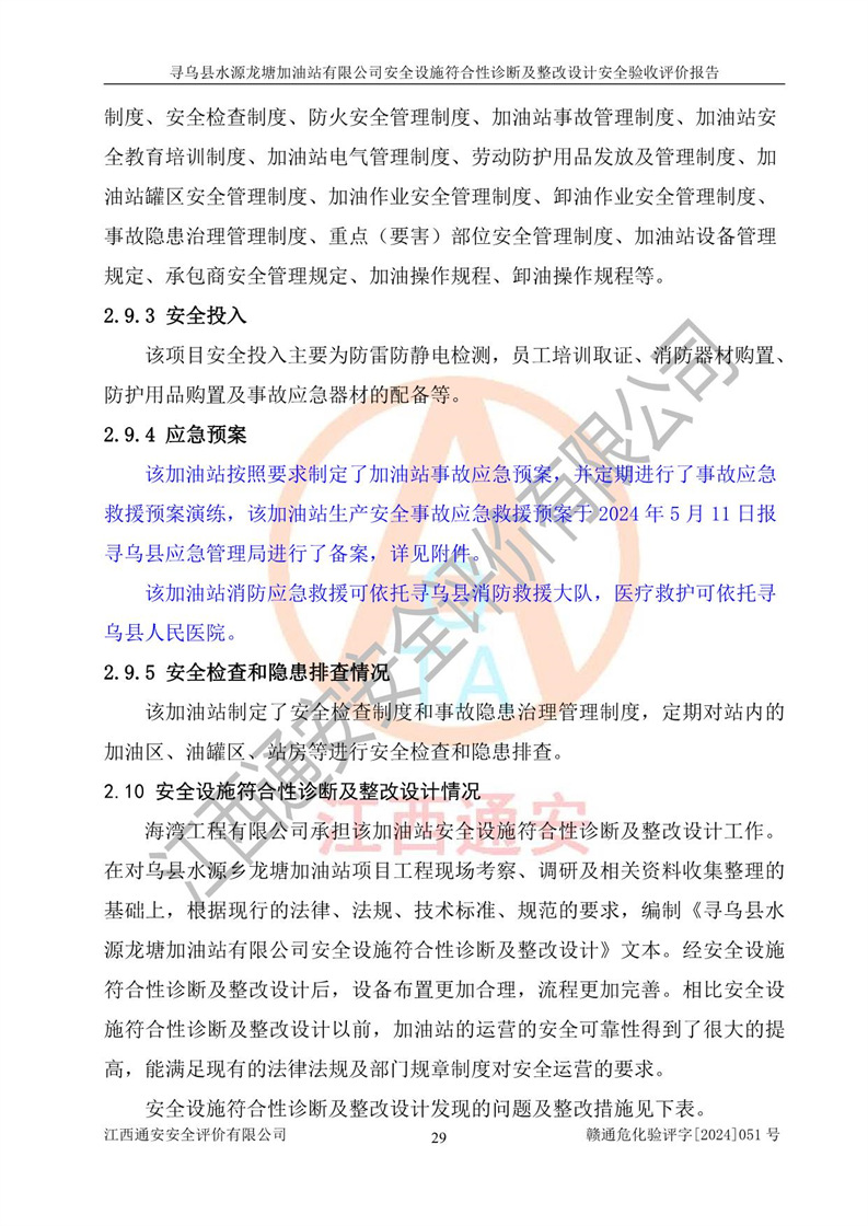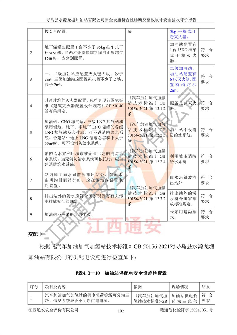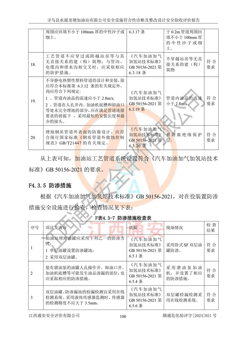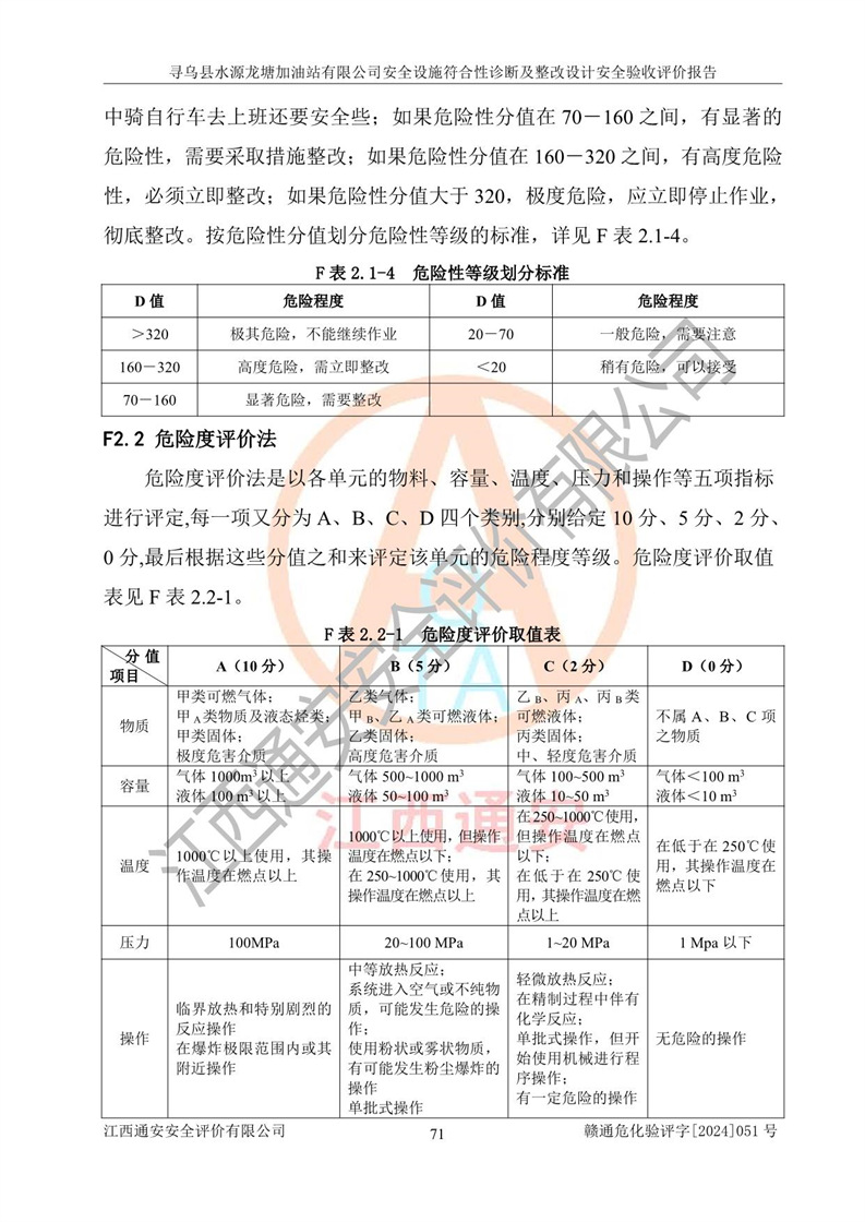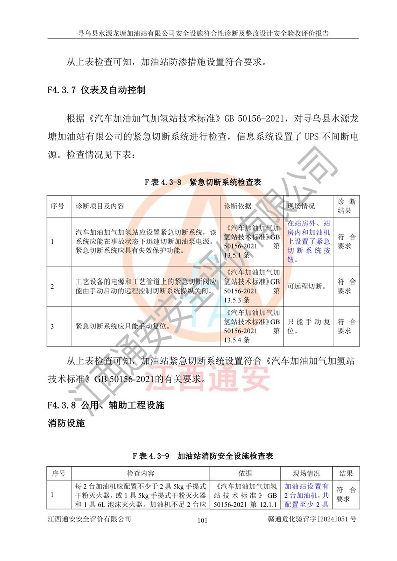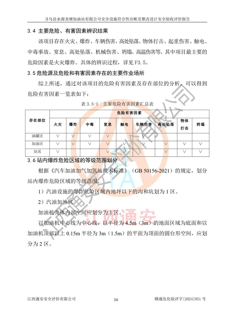 其它 | 1、尋烏縣水源龍?zhí)良佑驼居邢薰?/span>為成品油零售企業(yè),屬于二級(jí)加油站,油罐區(qū)為主要危險(xiǎn)源。該加油站不構(gòu)成危險(xiǎn)化學(xué)品重大危險(xiǎn)源。 2、尋烏縣水源龍?zhí)良佑驼居邢薰?/span>所經(jīng)營(yíng)的汽油屬于重點(diǎn)監(jiān)管危險(xiǎn)化學(xué)品,應(yīng)加強(qiáng)安全管理,根據(jù)“汽油安全措施和應(yīng)急處理原則”要求的措施進(jìn)行檢查,加油站設(shè)置了視頻監(jiān)控系統(tǒng)、具有液位報(bào)警功能的液位監(jiān)測(cè)系統(tǒng)、滲漏檢測(cè),并制定各種管理制度和操作規(guī)程,已落實(shí)到位。 3、通過(guò)本報(bào)告分析,該項(xiàng)目投入經(jīng)營(yíng)后仍將面對(duì)多種危險(xiǎn)因素,如火災(zāi),爆炸、中毒、電氣傷害、**傷害、噪聲等危險(xiǎn)有害因素。而項(xiàng)目*主要的危險(xiǎn)、有害因素是火災(zāi)、爆炸,對(duì)此,加油站全體員工**保持**的安全防護(hù)意識(shí)。 4、項(xiàng)目公用工程能夠滿足安全經(jīng)營(yíng)的基本需要。 5、該加油站內(nèi)部平面布置符合**和行業(yè)相關(guān)標(biāo)準(zhǔn)、規(guī)范的要求。建筑結(jié)構(gòu)、消防、安全設(shè)施等布置明確、合理,符合各相關(guān)規(guī)范的要求。 6、加油站取得了雷電防護(hù)裝置檢測(cè)報(bào)告。 7、項(xiàng)目油罐、通氣管口和加油機(jī)與外部環(huán)境的防火距離、平面布置、消防安全設(shè)施和措施滿足法律法規(guī)、標(biāo)準(zhǔn)規(guī)范的要求。電氣防爆保護(hù)、機(jī)械設(shè)備的安全保護(hù)等方面的安全設(shè)施建立**。 8、作業(yè)條件危險(xiǎn)性評(píng)價(jià)結(jié)果:在選定的3個(gè)單元的危險(xiǎn)程度為“一般危險(xiǎn)、需要注意”或“稍有危險(xiǎn),可以接受”,且一般危險(xiǎn)或稍有危險(xiǎn)作業(yè)環(huán)境的出現(xiàn)均由物料的危險(xiǎn)程度所決定,作業(yè)條件相對(duì)安全。 9、危險(xiǎn)度評(píng)價(jià)結(jié)果:油罐區(qū)得分為12分,為Ⅱ級(jí),屬于中度危險(xiǎn)。加油站油罐安裝高液位報(bào)警功能的液位監(jiān)測(cè)系統(tǒng),當(dāng)油料達(dá)到油罐容量90%時(shí),觸動(dòng)高液位報(bào)警裝置,油料達(dá)到油罐容量95%時(shí),自動(dòng)停止油料繼續(xù)進(jìn)罐。同時(shí),也采取了防止油品滲漏的保護(hù)措施,降低火災(zāi)爆炸危險(xiǎn),滿足安全經(jīng)營(yíng)條件要求。 10、加油站建立了安全責(zé)任制,制定了安全管理制度、操作規(guī)程,編制了事故應(yīng)急預(yù)案,配備了應(yīng)急救援器材,按要求定期進(jìn)行相關(guān)培訓(xùn)及演練。 11、該項(xiàng)目不涉及重大生產(chǎn)安全事故隱患,安全經(jīng)營(yíng)條件符合《危險(xiǎn)化學(xué)品經(jīng)營(yíng)許可證管理辦法》的要求。 12、該安全設(shè)施診斷設(shè)計(jì)整改意見(jiàn)已按要求整改完善,符合要求。 尋烏縣水源龍?zhí)良佑驼居邢薰驹谝垩b置安全設(shè)施診斷設(shè)計(jì)的安全設(shè)施及安全管理符合**及有關(guān)部門關(guān)于安全生產(chǎn)法律、法規(guī)、標(biāo)準(zhǔn)的要求,工藝設(shè)備、安全設(shè)施等運(yùn)行正常,安全設(shè)施、措施達(dá)到設(shè)計(jì)要求和預(yù)期結(jié)果,符合經(jīng)營(yíng)和儲(chǔ)存危險(xiǎn)化學(xué)品(汽油、柴油)的安全條件要求,具備了安全設(shè)施竣工驗(yàn)收條件。