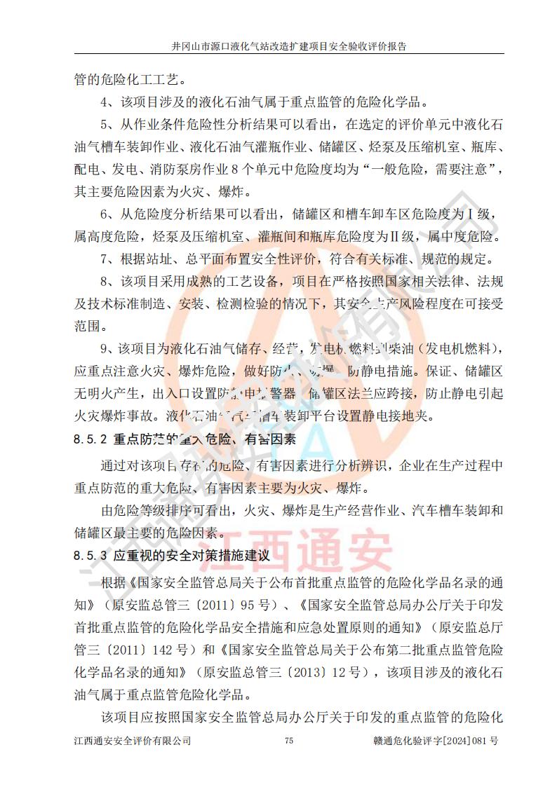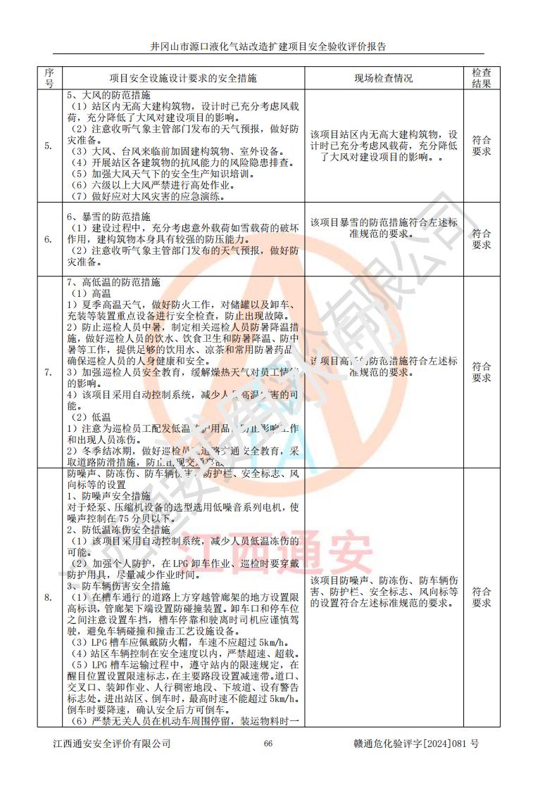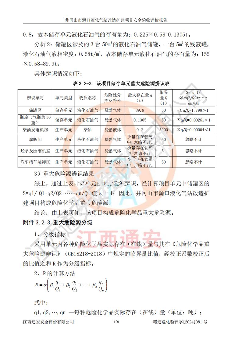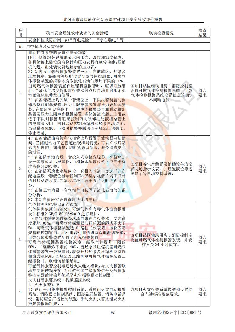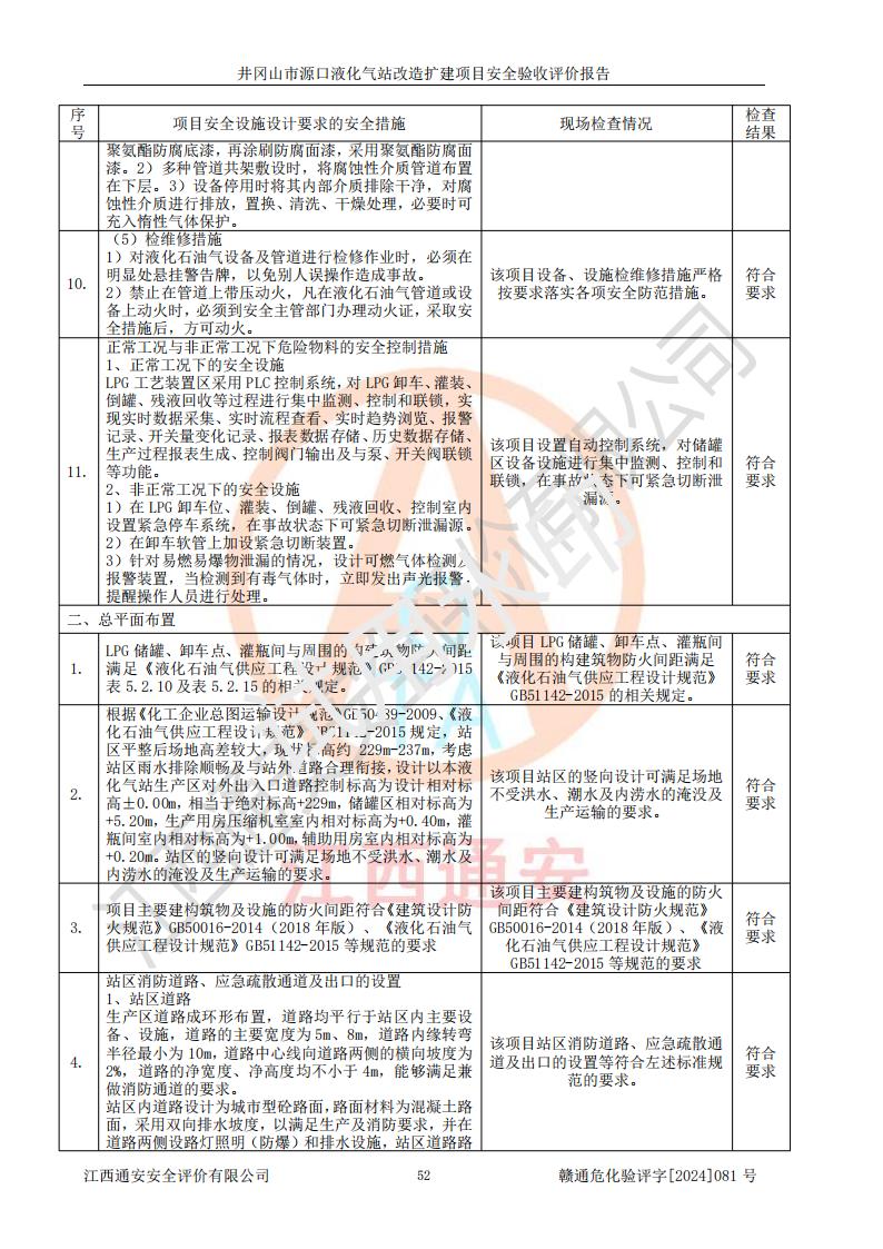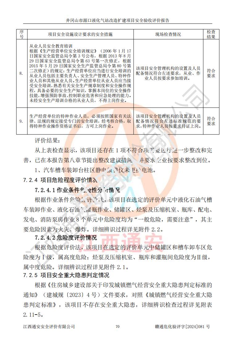 評(píng)價(jià)結(jié)論 | 評(píng)價(jià)總體結(jié)論 綜上所述,井岡山市源口液化氣站改造擴(kuò)建項(xiàng)目符合吉安井岡山市發(fā)展規(guī)劃的布局;總平面布置符合《液化石油氣供應(yīng)工程設(shè)計(jì)規(guī)范》(GB51142-2015)等標(biāo)準(zhǔn)、規(guī)范的要求;勘查現(xiàn)場(chǎng)時(shí),企業(yè)總平面布置、設(shè)備設(shè)施的布置與設(shè)計(jì)圖紙一致;自動(dòng)化控制系統(tǒng)設(shè)計(jì)符合要求且運(yùn)行正常,企業(yè)主要負(fù)責(zé)人、安全管理人員按要求定期報(bào)名參加安全教育培訓(xùn)考核,特種作業(yè)人員等取得考核合格證書持證上崗;該氣站采用成熟的設(shè)備、設(shè)施,本質(zhì)安全程度較高;該氣站對(duì)液化石油氣儲(chǔ)存、經(jīng)營(yíng)過程中存在事故危險(xiǎn)和職業(yè)危害的設(shè)施和場(chǎng)所采取了一系列的合理可行的防護(hù)措施和科學(xué)的管理,近期通過對(duì)存在的安全問題進(jìn)行了整改,主要安全問題隱患和缺陷消除,使生產(chǎn)經(jīng)營(yíng)過程中的危險(xiǎn)有害因素能得到了**控制。生產(chǎn)裝置安全設(shè)施符合**現(xiàn)行有關(guān)法律、法規(guī)、標(biāo)準(zhǔn)的要求。 評(píng)價(jià)結(jié)論:本報(bào)告認(rèn)為,井岡山市源口液化氣站改造擴(kuò)建項(xiàng)目的安全設(shè)施及安全管理符合**及有關(guān)部門關(guān)于安全生產(chǎn)法律、法規(guī)、標(biāo)準(zhǔn)的要求,安全風(fēng)險(xiǎn)是受控制的,其風(fēng)險(xiǎn)程度是可以接受的,符合安全生產(chǎn)條件,能夠滿足安全生產(chǎn)的要求,具備安全設(shè)施“三同時(shí)”驗(yàn)收條件。 | |||