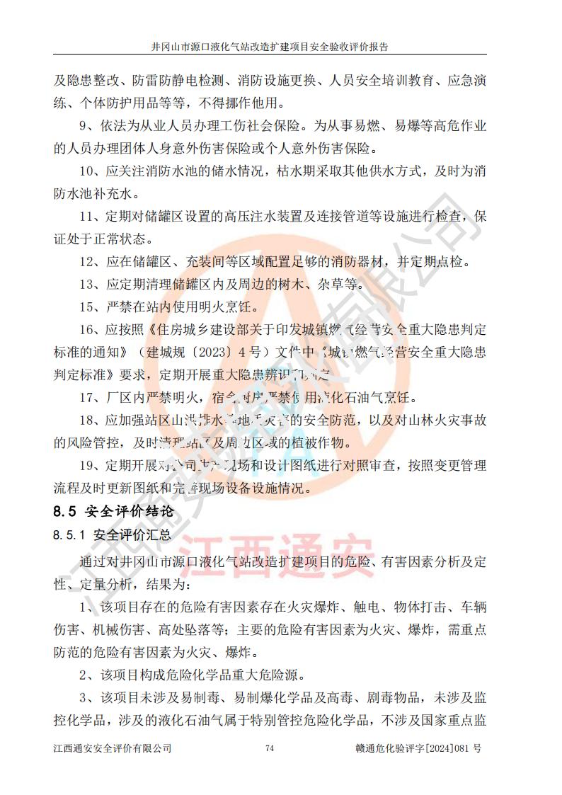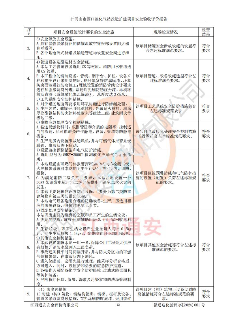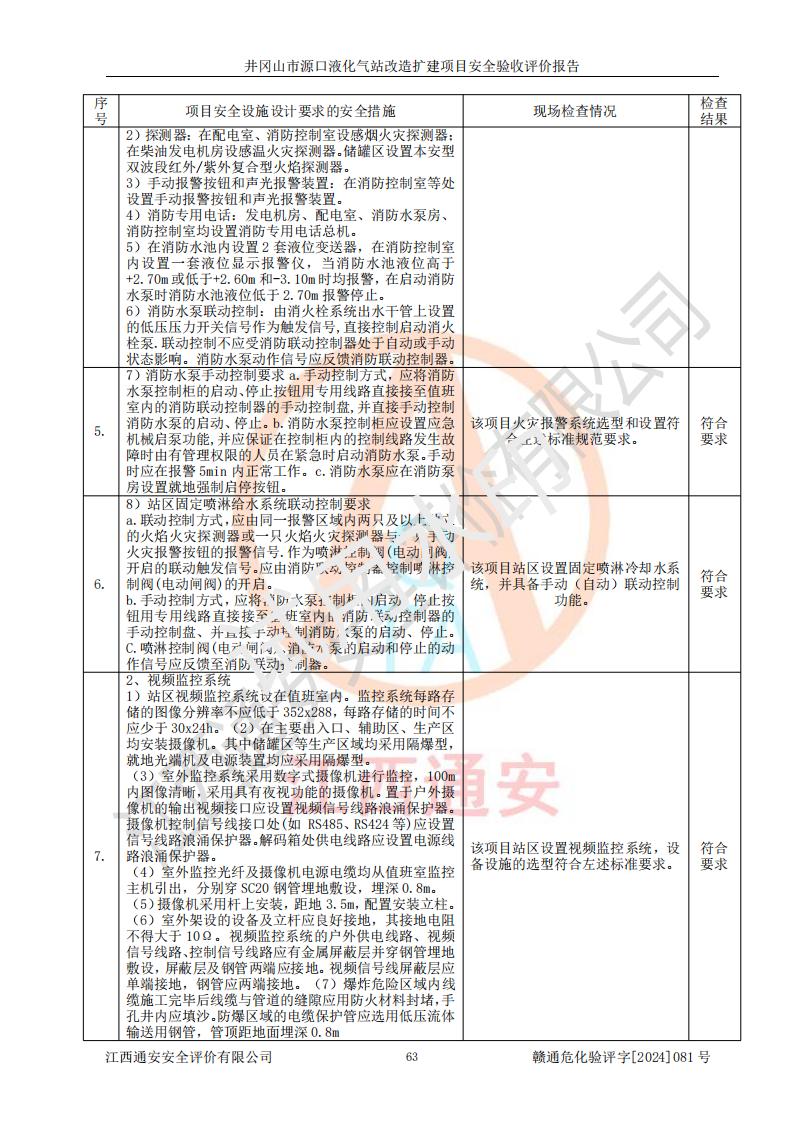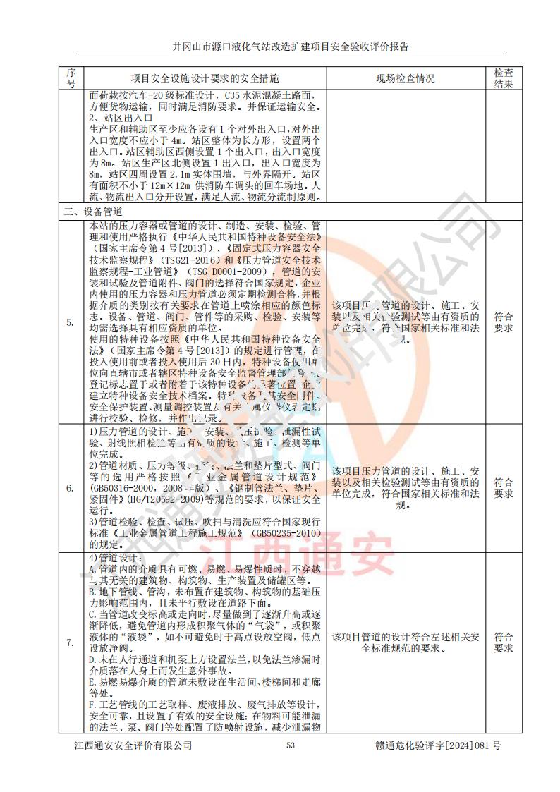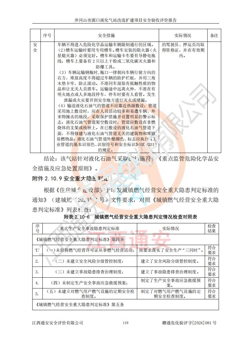 評(píng)價(jià)結(jié)論 | 評(píng)價(jià)總體結(jié)論 綜上所述,井岡山市源口液化氣站改造擴(kuò)建項(xiàng)目符合吉安井岡山市發(fā)展規(guī)劃的布局;總平面布置符合《液化石油氣供應(yīng)工程設(shè)計(jì)規(guī)范》(GB51142-2015)等標(biāo)準(zhǔn)、規(guī)范的要求;勘查現(xiàn)場(chǎng)時(shí),企業(yè)總平面布置、設(shè)備設(shè)施的布置與設(shè)計(jì)圖紙一致;自動(dòng)化控制系統(tǒng)設(shè)計(jì)符合要求且運(yùn)行正常,企業(yè)主要負(fù)責(zé)人、安全管理人員按要求定期報(bào)名參加安全教育培訓(xùn)考核,特種作業(yè)人員等取得考核合格證書持證上崗;該氣站采用成熟的設(shè)備、設(shè)施,本質(zhì)安全程度較高;該氣站對(duì)液化石油氣儲(chǔ)存、經(jīng)營(yíng)過程中存在事故危險(xiǎn)和職業(yè)危害的設(shè)施和場(chǎng)所采取了一系列的合理可行的防護(hù)措施和科學(xué)的管理,近期通過對(duì)存在的安全問題進(jìn)行了整改,主要安全問題隱患和缺陷消除,使生產(chǎn)經(jīng)營(yíng)過程中的危險(xiǎn)有害因素能得到了**控制。生產(chǎn)裝置安全設(shè)施符合**現(xiàn)行有關(guān)法律、法規(guī)、標(biāo)準(zhǔn)的要求。 評(píng)價(jià)結(jié)論:本報(bào)告認(rèn)為,井岡山市源口液化氣站改造擴(kuò)建項(xiàng)目的安全設(shè)施及安全管理符合**及有關(guān)部門關(guān)于安全生產(chǎn)法律、法規(guī)、標(biāo)準(zhǔn)的要求,安全風(fēng)險(xiǎn)是受控制的,其風(fēng)險(xiǎn)程度是可以接受的,符合安全生產(chǎn)條件,能夠滿足安全生產(chǎn)的要求,具備安全設(shè)施“三同時(shí)”驗(yàn)收條件。 | |||