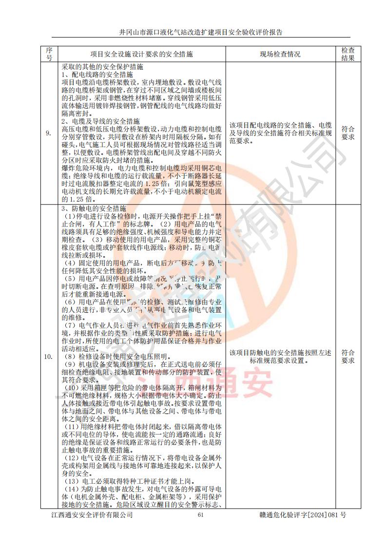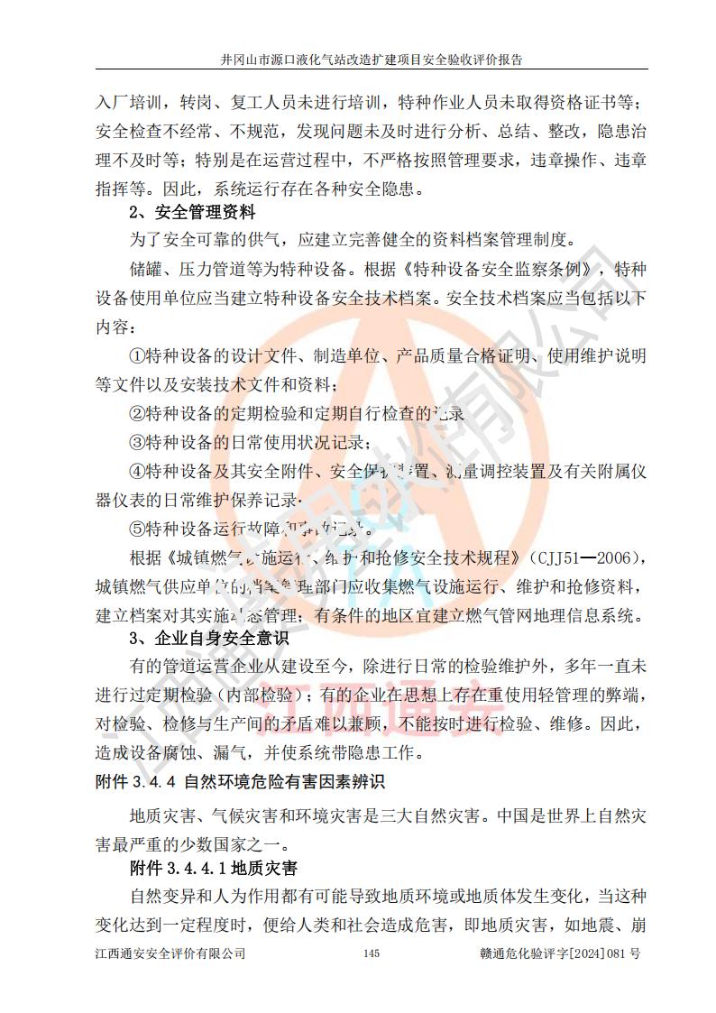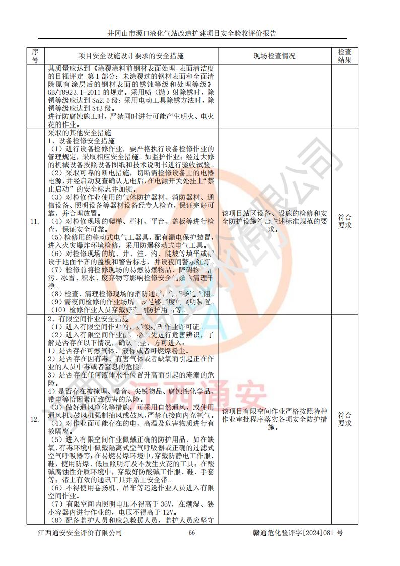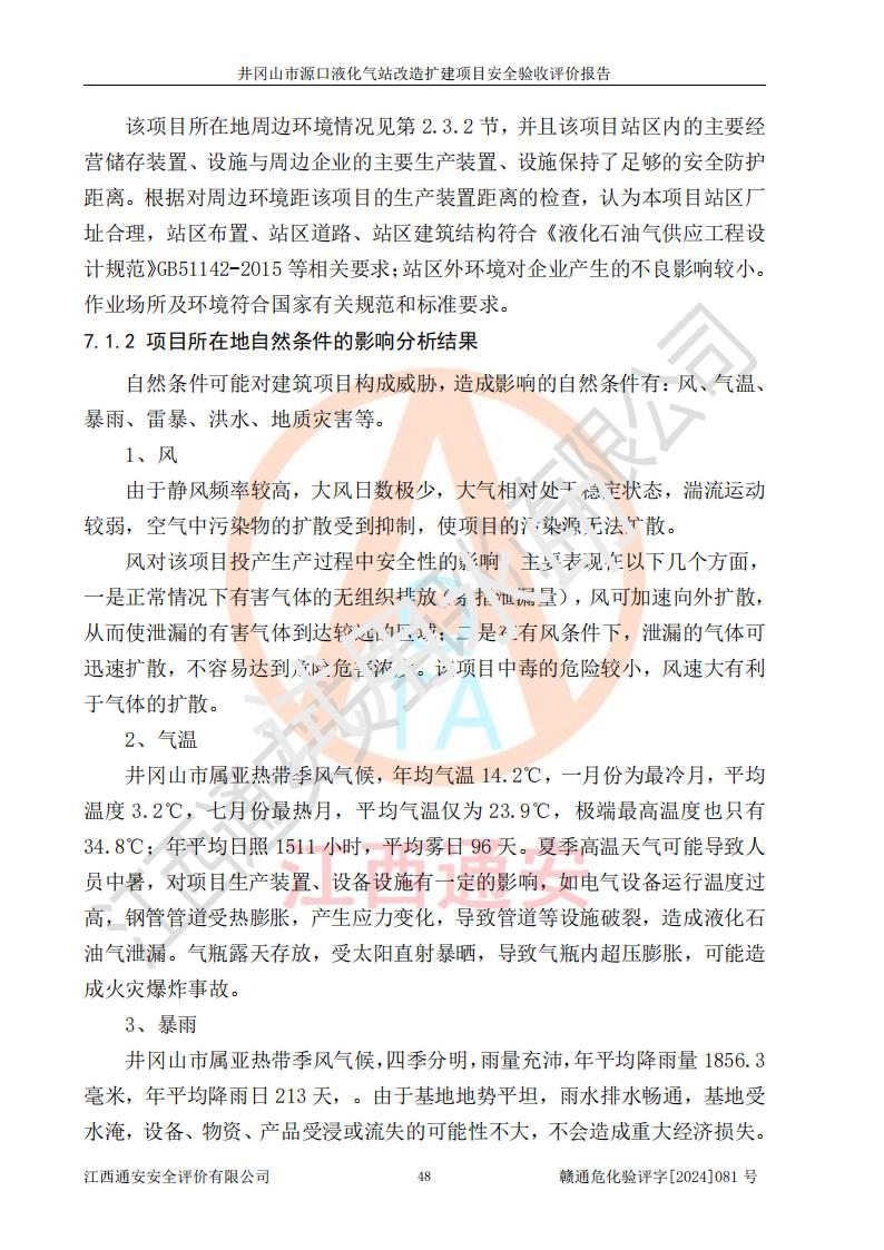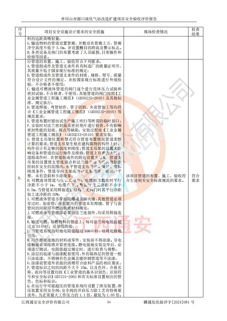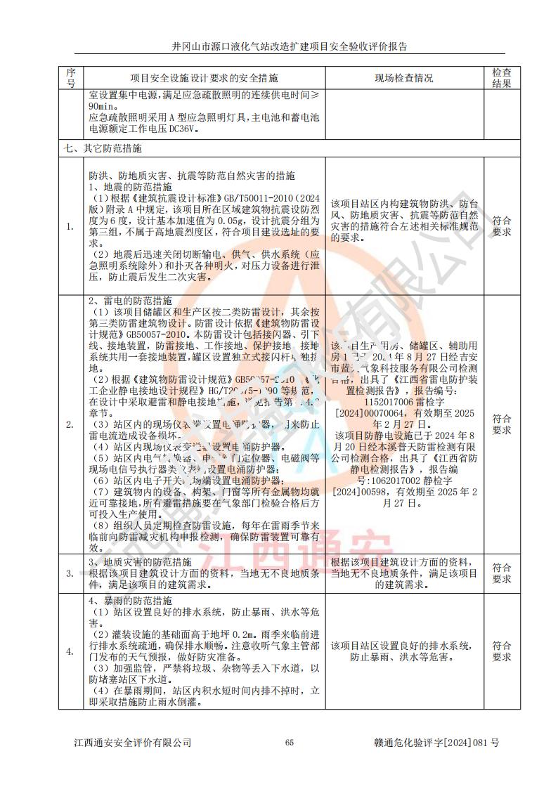 評(píng)價(jià)結(jié)論 | 評(píng)價(jià)總體結(jié)論 綜上所述,井岡山市源口液化氣站改造擴(kuò)建項(xiàng)目符合吉安井岡山市發(fā)展規(guī)劃的布局;總平面布置符合《液化石油氣供應(yīng)工程設(shè)計(jì)規(guī)范》(GB51142-2015)等標(biāo)準(zhǔn)、規(guī)范的要求;勘查現(xiàn)場(chǎng)時(shí),企業(yè)總平面布置、設(shè)備設(shè)施的布置與設(shè)計(jì)圖紙一致;自動(dòng)化控制系統(tǒng)設(shè)計(jì)符合要求且運(yùn)行正常,企業(yè)主要負(fù)責(zé)人、安全管理人員按要求定期報(bào)名參加安全教育培訓(xùn)考核,特種作業(yè)人員等取得考核合格證書持證上崗;該氣站采用成熟的設(shè)備、設(shè)施,本質(zhì)安全程度較高;該氣站對(duì)液化石油氣儲(chǔ)存、經(jīng)營(yíng)過程中存在事故危險(xiǎn)和職業(yè)危害的設(shè)施和場(chǎng)所采取了一系列的合理可行的防護(hù)措施和科學(xué)的管理,近期通過對(duì)存在的安全問題進(jìn)行了整改,主要安全問題隱患和缺陷消除,使生產(chǎn)經(jīng)營(yíng)過程中的危險(xiǎn)有害因素能得到了**控制。生產(chǎn)裝置安全設(shè)施符合**現(xiàn)行有關(guān)法律、法規(guī)、標(biāo)準(zhǔn)的要求。 評(píng)價(jià)結(jié)論:本報(bào)告認(rèn)為,井岡山市源口液化氣站改造擴(kuò)建項(xiàng)目的安全設(shè)施及安全管理符合**及有關(guān)部門關(guān)于安全生產(chǎn)法律、法規(guī)、標(biāo)準(zhǔn)的要求,安全風(fēng)險(xiǎn)是受控制的,其風(fēng)險(xiǎn)程度是可以接受的,符合安全生產(chǎn)條件,能夠滿足安全生產(chǎn)的要求,具備安全設(shè)施“三同時(shí)”驗(yàn)收條件。 | |||