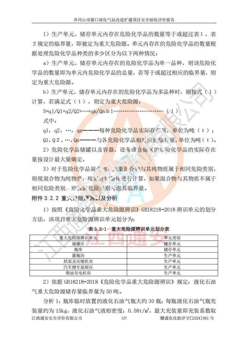 項(xiàng)目簡(jiǎn)介 | 井岡山市源口液化氣站(以下簡(jiǎn)稱“氣站”)位于江西省井岡山市龍市鎮(zhèn)石陂村源口組,是一家從事液化石油氣儲(chǔ)存、經(jīng)營(yíng)的企業(yè),成立于2009年07月15日,并取得井岡山市市場(chǎng)和監(jiān)督管理局頒發(fā)的《營(yíng)業(yè)執(zhí)照》,營(yíng)業(yè)執(zhí)照統(tǒng)一社會(huì)信用代碼:91360881576103467B。公司注冊(cè)住所:江西省井岡山市龍市鎮(zhèn)石陂村源口組。法定**人:陳龍華。企業(yè)類型:個(gè)人獨(dú)資企業(yè)。營(yíng)業(yè)執(zhí)照經(jīng)營(yíng)范圍:液化石油氣銷售。 因該氣站存在液化石油氣儲(chǔ)存、經(jīng)營(yíng)供應(yīng)量不滿足當(dāng)前居民用氣量需求,以及氣站部分設(shè)施設(shè)備等存在老化情況,井岡山市源口液化氣站決定在該氣站原址基礎(chǔ)上進(jìn)行改造擴(kuò)建。 該氣站于2023年07月18日取得井岡山市發(fā)展和改革委員會(huì)出具的《江西省企業(yè)投資項(xiàng)目備案通知書》(項(xiàng)目名稱:井岡山市源口液化氣站改造擴(kuò)建項(xiàng)目,項(xiàng)目統(tǒng)一代碼:2307-360881-04-05-322501),項(xiàng)目投資400萬元,建設(shè)地址為井岡山市龍市鎮(zhèn)石陂村源口組,主要建設(shè)內(nèi)容及規(guī)模為:3臺(tái)50m3液化石油氣埋地臥式儲(chǔ)罐、1臺(tái)5m3液化石油氣埋地臥式殘液罐。根據(jù)《**安全監(jiān)管總局關(guān)于公布首批重點(diǎn)監(jiān)管的危險(xiǎn)化工工藝目錄的通知》(安監(jiān)總管三〔2009〕116號(hào))和《**安全監(jiān)管總局關(guān)于公布第二批重點(diǎn)監(jiān)管危險(xiǎn)化工工藝目錄和調(diào)整首批重點(diǎn)監(jiān)管危險(xiǎn)化工工藝中部分典型工藝的通知》(安監(jiān)總管三〔2013〕3號(hào))進(jìn)行危險(xiǎn)工藝辨識(shí):該項(xiàng)目不涉及重點(diǎn)監(jiān)管的危險(xiǎn)化工工藝。 根據(jù)《液化石油氣供應(yīng)工程設(shè)計(jì)規(guī)范》(GB51142-2015)第3.0.12條,該氣站儲(chǔ)罐總?cè)莘e為50m3<V(155m3)≤220m3,單罐容積20m3<V/≤50m3,液化石油氣站等級(jí)為六級(jí)站。 根據(jù)《**安全監(jiān)管總局關(guān)于公布首批重點(diǎn)監(jiān)管的危險(xiǎn)化學(xué)品名錄的通知》原安監(jiān)總管三[2011]95號(hào)、《**安全監(jiān)管總局關(guān)于公布第二批重點(diǎn)監(jiān)管危險(xiǎn)化學(xué)品名錄的通知》原安監(jiān)總管三[2013]12號(hào)進(jìn)行辨識(shí):該項(xiàng)目涉及的液化石油氣屬于重點(diǎn)監(jiān)管的危險(xiǎn)化學(xué)品。 根據(jù)《特別管控危險(xiǎn)化學(xué)品目錄(**版)》(應(yīng)急管理部、工業(yè)和信息化部、公安部、交通運(yùn)輸部公告(2020年第3號(hào)))進(jìn)行辨識(shí):該項(xiàng)目涉及的液化石油氣屬于特別管控危險(xiǎn)化學(xué)品。 | |||