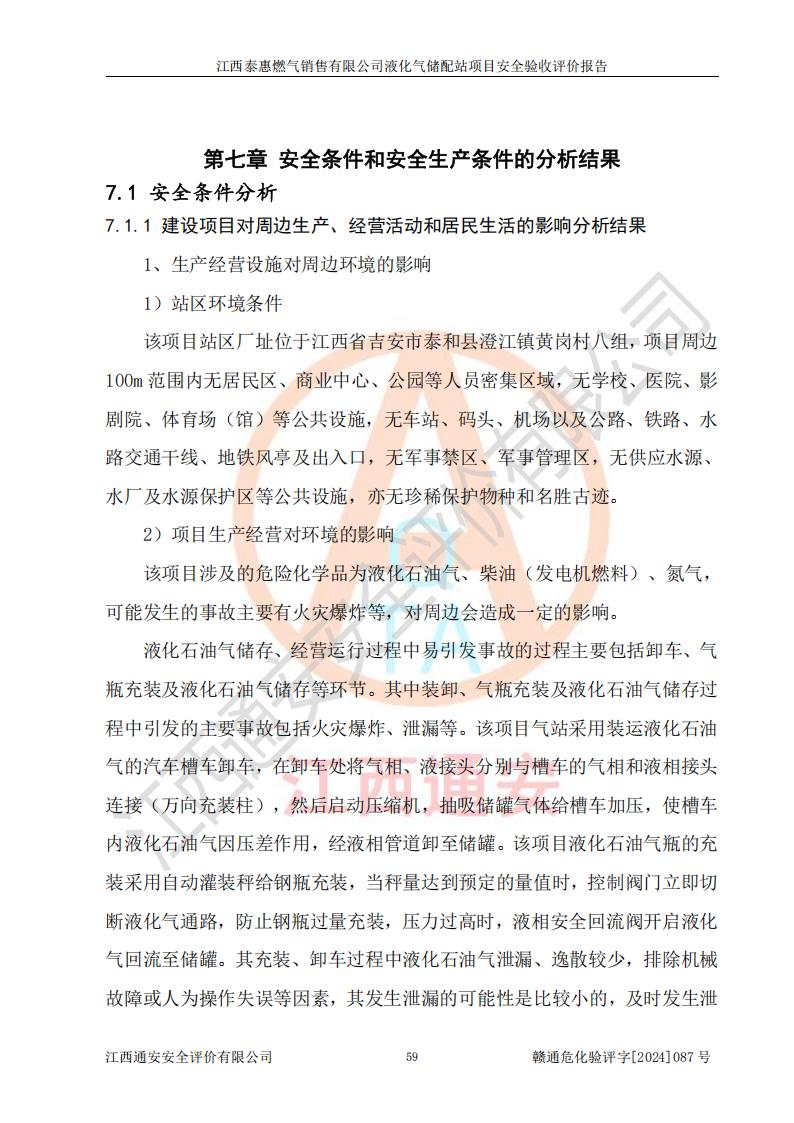 其它 | 在對(duì)該項(xiàng)目危險(xiǎn)、有害因素辨識(shí)分析的基礎(chǔ)上,運(yùn)用安全檢查表、預(yù)作業(yè)條件危險(xiǎn)性分析法、危險(xiǎn)度評(píng)價(jià)、重大事故后果分析結(jié)果等評(píng)價(jià)方法對(duì)該項(xiàng)目進(jìn)行了分析評(píng)價(jià),評(píng)價(jià)結(jié)果如下: 1、該項(xiàng)目位于江西省吉安市泰和縣澄江鎮(zhèn)黃崗村八組,符合當(dāng)?shù)匾?guī)劃,與周邊環(huán)境的距離符合有關(guān)標(biāo)準(zhǔn)、規(guī)范的要求。 2、總圖布置分區(qū)明確,布局合理,各建構(gòu)筑物的防火間距滿足規(guī)范要求。 3、該項(xiàng)目無(wú)**明令淘汰的工藝,設(shè)備、設(shè)施與工藝條件、內(nèi)部介質(zhì)相適應(yīng),特種設(shè)備及設(shè)施較齊全,按規(guī)定設(shè)置防雷、防靜電接地,爆炸危險(xiǎn)環(huán)境加油機(jī)按要求采用防爆型,符合相關(guān)標(biāo)準(zhǔn)規(guī)范要求。 5、企業(yè)設(shè)置了安全生產(chǎn)管理機(jī)構(gòu),配備了專職安全生產(chǎn)管理人員,建立了安全生產(chǎn)責(zé)任制和安全生產(chǎn)管理制度,編制了崗位操作規(guī)程,編制了生產(chǎn)安全事故應(yīng)急預(yù)案,人員經(jīng)過(guò)相應(yīng)的培訓(xùn),企業(yè)的安全生產(chǎn)管理正常。 6、作業(yè)條件危險(xiǎn)性評(píng)價(jià)結(jié)果:在選定的評(píng)價(jià)單元中,作業(yè)危險(xiǎn)程度均為“一般危險(xiǎn),需要注意”,作業(yè)條件相對(duì)安全。 7、危險(xiǎn)度評(píng)價(jià)結(jié)果:儲(chǔ)罐區(qū)和槽車卸車區(qū)危險(xiǎn)度為Ⅰ級(jí),屬**危險(xiǎn),烴泵及壓縮機(jī)室、灌瓶間和瓶庫(kù)危險(xiǎn)度為Ⅱ級(jí),屬中度危險(xiǎn)。 評(píng)價(jià)結(jié)論: 江西泰惠燃?xì)怃N售有限公司液化氣儲(chǔ)配站項(xiàng)目的安全設(shè)施及安全管理符合**及有關(guān)部門關(guān)于安全生產(chǎn)法律、法規(guī)、標(biāo)準(zhǔn)的要求,安全風(fēng)險(xiǎn)是受控制的,其風(fēng)險(xiǎn)程度是可以接受的,符合安全生產(chǎn)條件,能夠滿足安全生產(chǎn)的要求,具備安全設(shè)施“三同時(shí)”驗(yàn)收條件。 | ||||