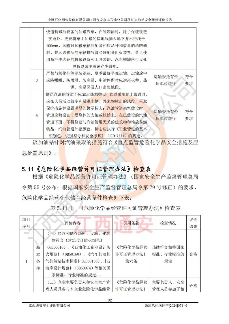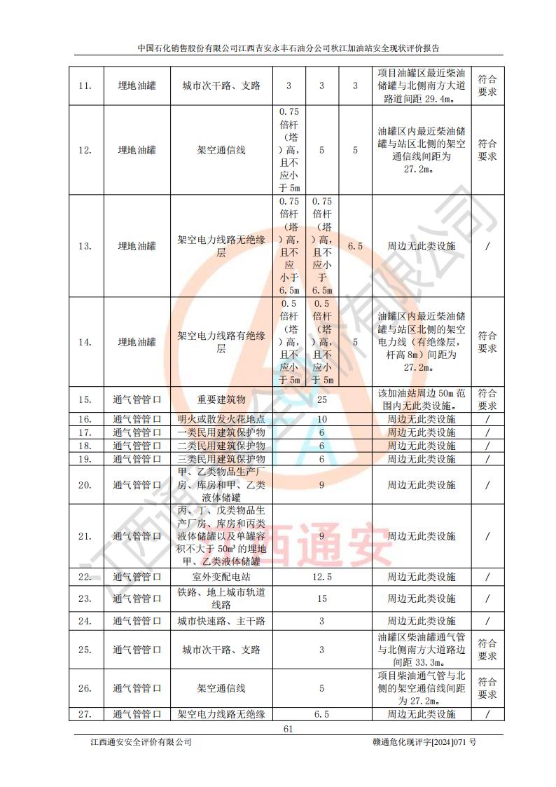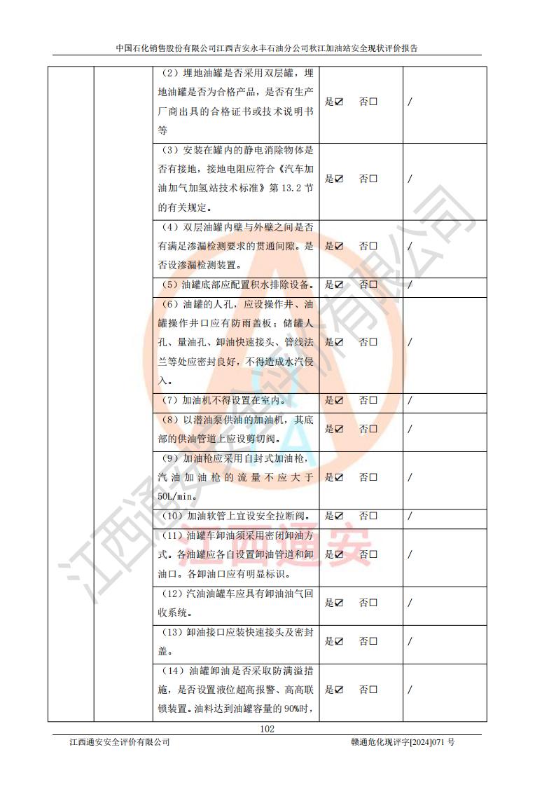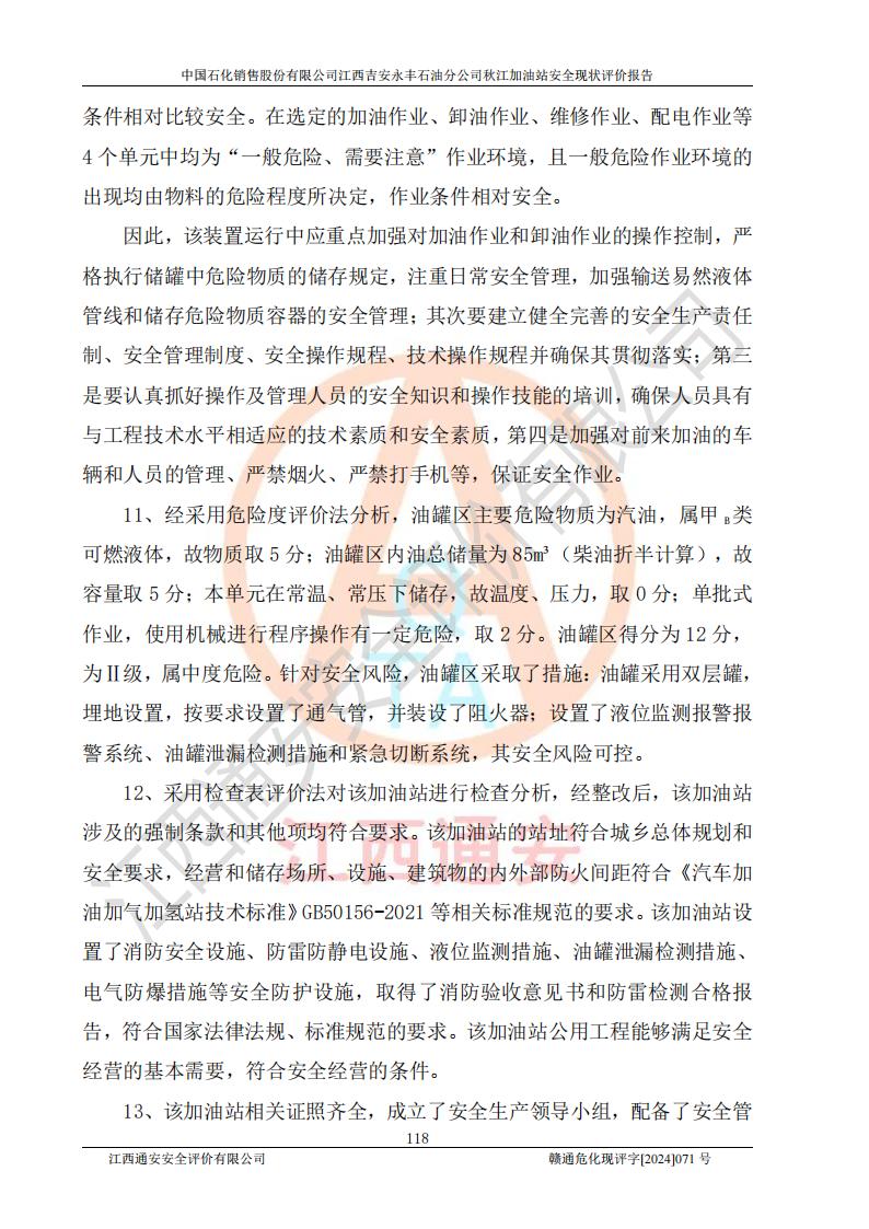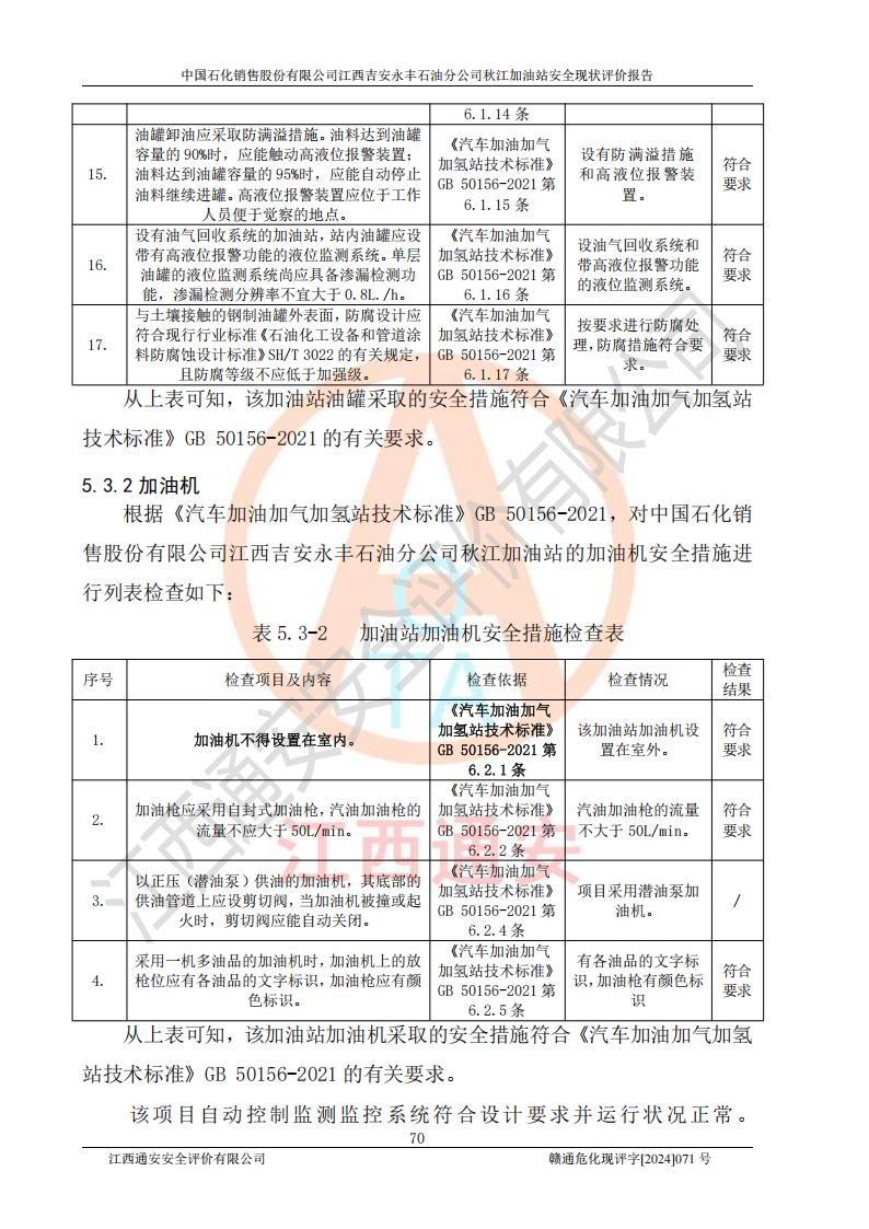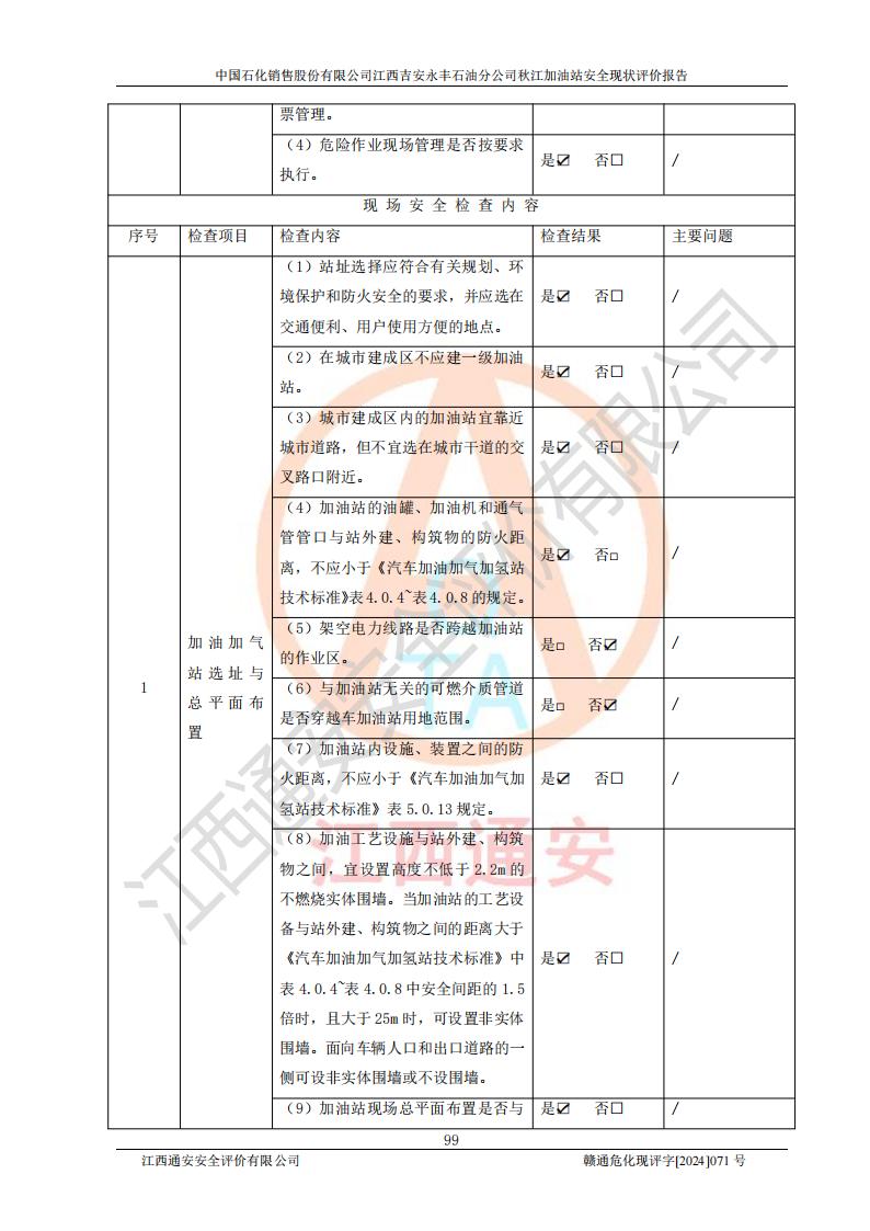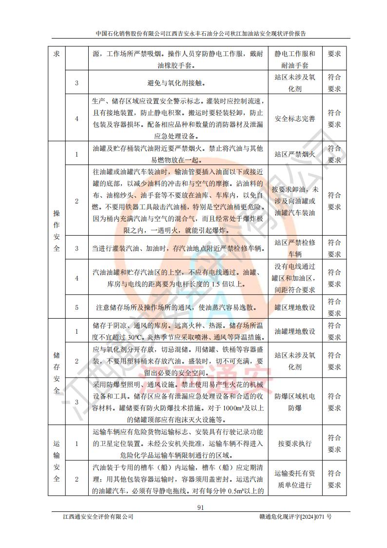 評價結(jié)論 | 江西高速實(shí)業(yè)開發(fā)有限公司吉安服務(wù)區(qū)西加油站改造項(xiàng)目現(xiàn)場布置與設(shè)計(jì)圖紙一致,有關(guān)從業(yè)人員資質(zhì)符合《江西省危險化學(xué)品安全專項(xiàng)整治三年行動實(shí)施方案》要求,具備**有關(guān)安全生產(chǎn)法律、法規(guī)、部門規(guī)章及標(biāo)準(zhǔn)規(guī)范要求的安全條件,符合經(jīng)營和儲存危險化學(xué)品的安全條件要求,具備安全驗(yàn)收的要求。 | |||