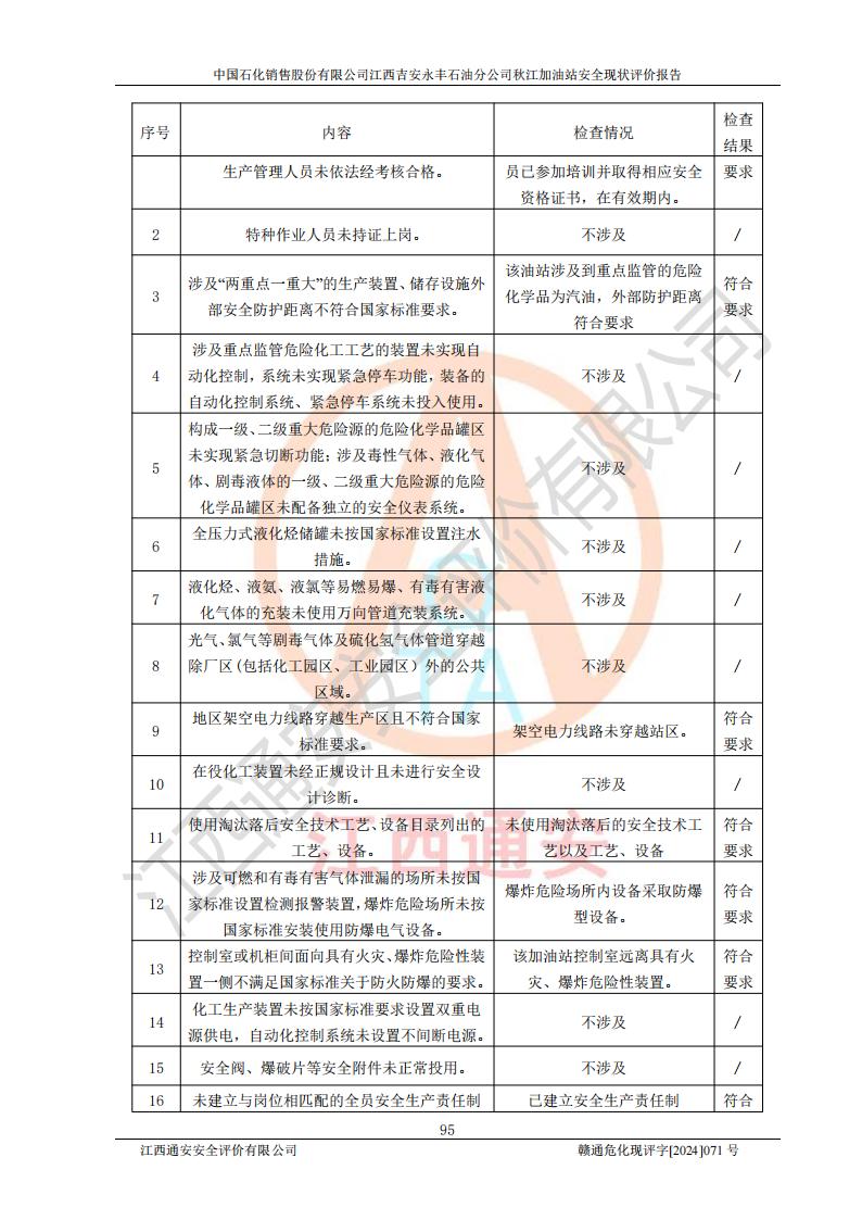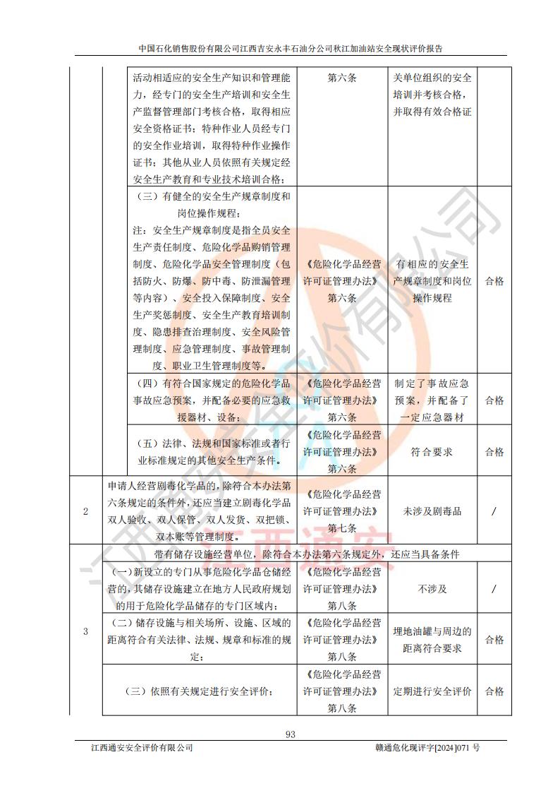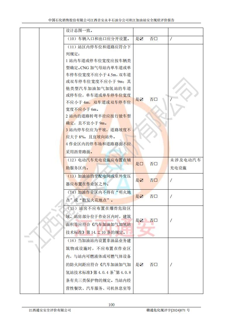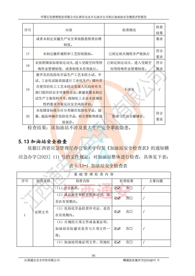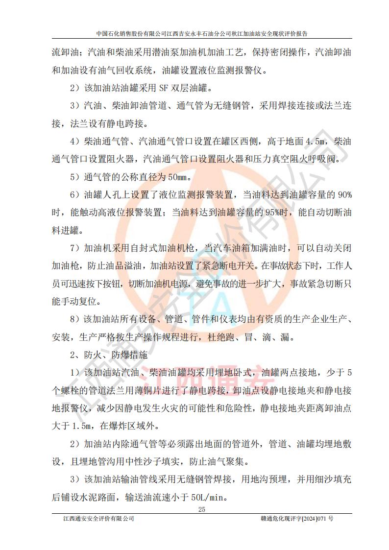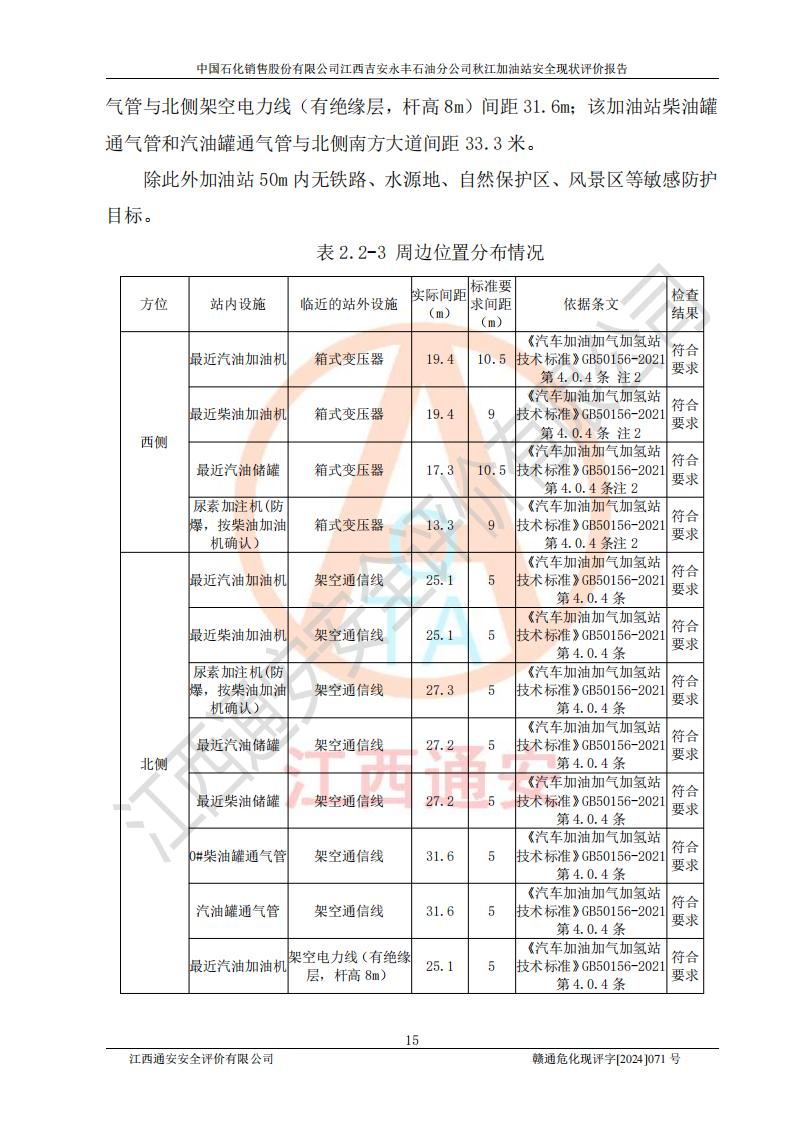 評價結(jié)論 | 江西高速實(shí)業(yè)開發(fā)有限公司吉安服務(wù)區(qū)西加油站改造項(xiàng)目現(xiàn)場布置與設(shè)計(jì)圖紙一致,有關(guān)從業(yè)人員資質(zhì)符合《江西省危險化學(xué)品安全專項(xiàng)整治三年行動實(shí)施方案》要求,具備**有關(guān)安全生產(chǎn)法律、法規(guī)、部門規(guī)章及標(biāo)準(zhǔn)規(guī)范要求的安全條件,符合經(jīng)營和儲存危險化學(xué)品的安全條件要求,具備安全驗(yàn)收的要求。 | |||