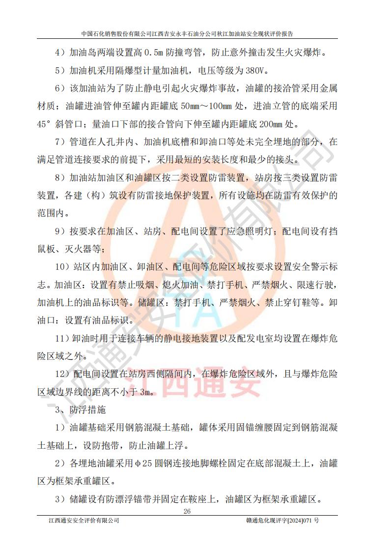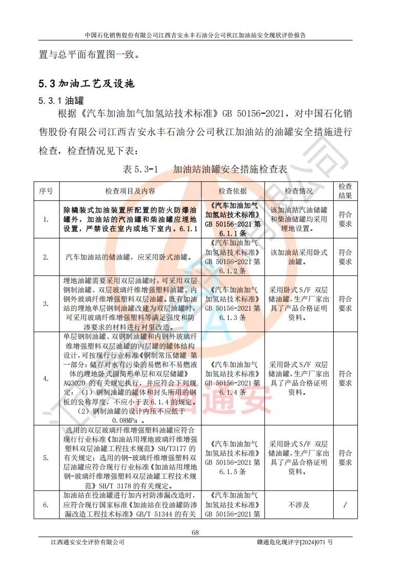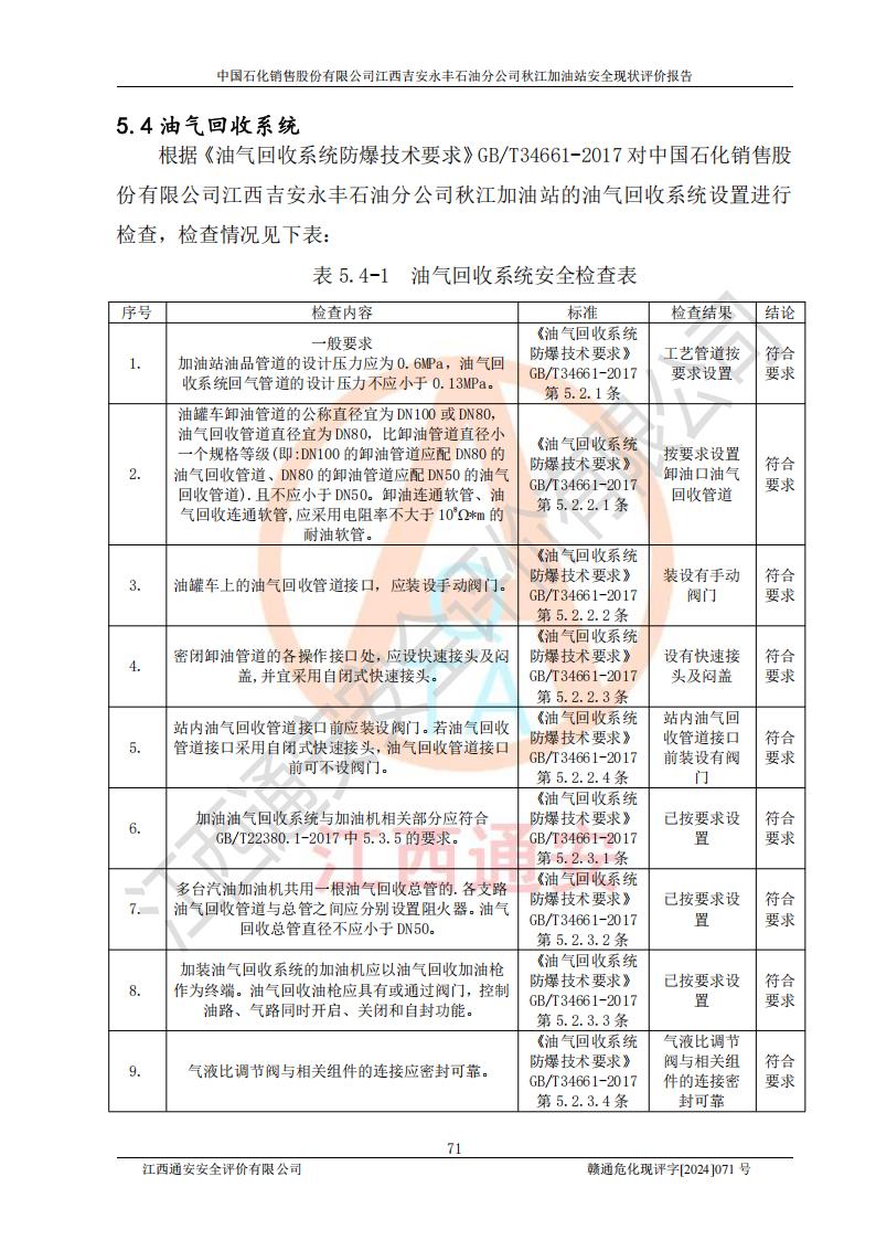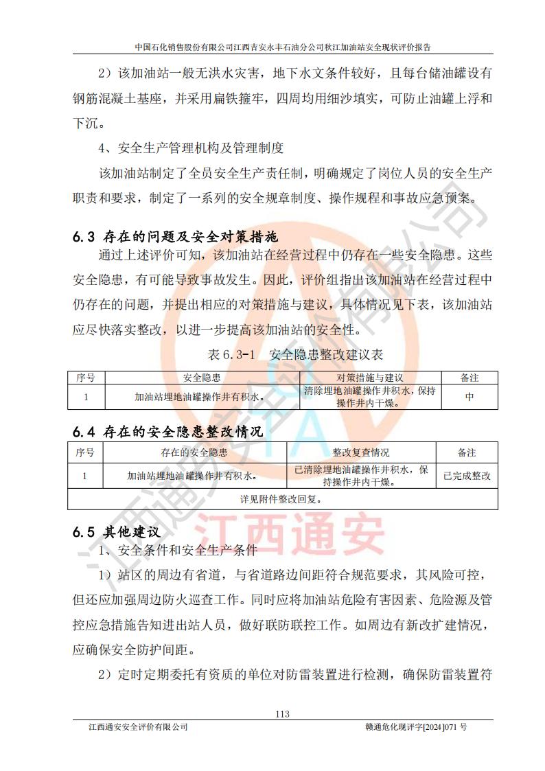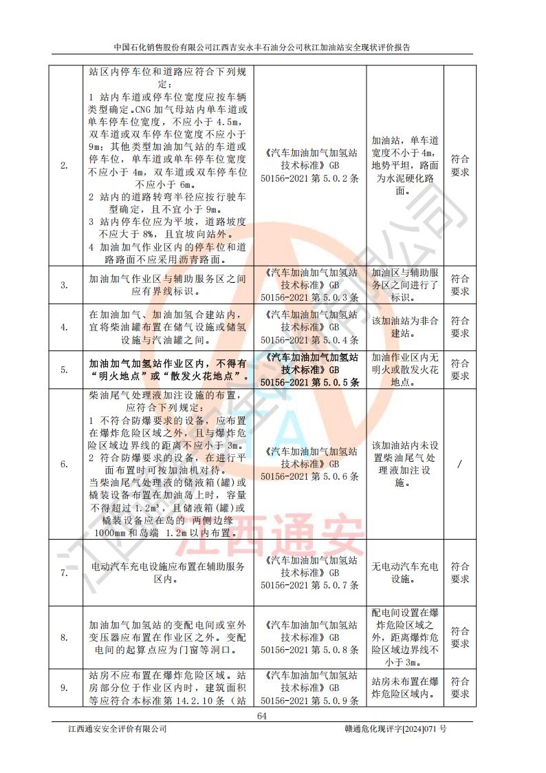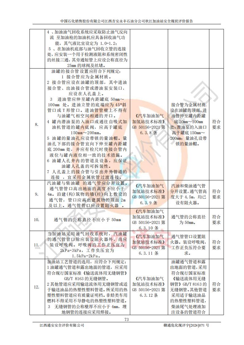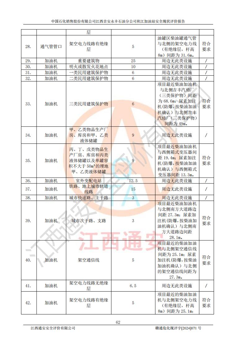 評價結(jié)論 | 江西高速實(shí)業(yè)開發(fā)有限公司吉安服務(wù)區(qū)西加油站改造項(xiàng)目現(xiàn)場布置與設(shè)計(jì)圖紙一致,有關(guān)從業(yè)人員資質(zhì)符合《江西省危險化學(xué)品安全專項(xiàng)整治三年行動實(shí)施方案》要求,具備**有關(guān)安全生產(chǎn)法律、法規(guī)、部門規(guī)章及標(biāo)準(zhǔn)規(guī)范要求的安全條件,符合經(jīng)營和儲存危險化學(xué)品的安全條件要求,具備安全驗(yàn)收的要求。 | |||