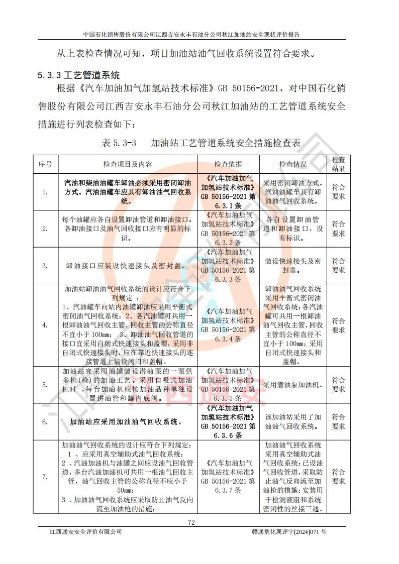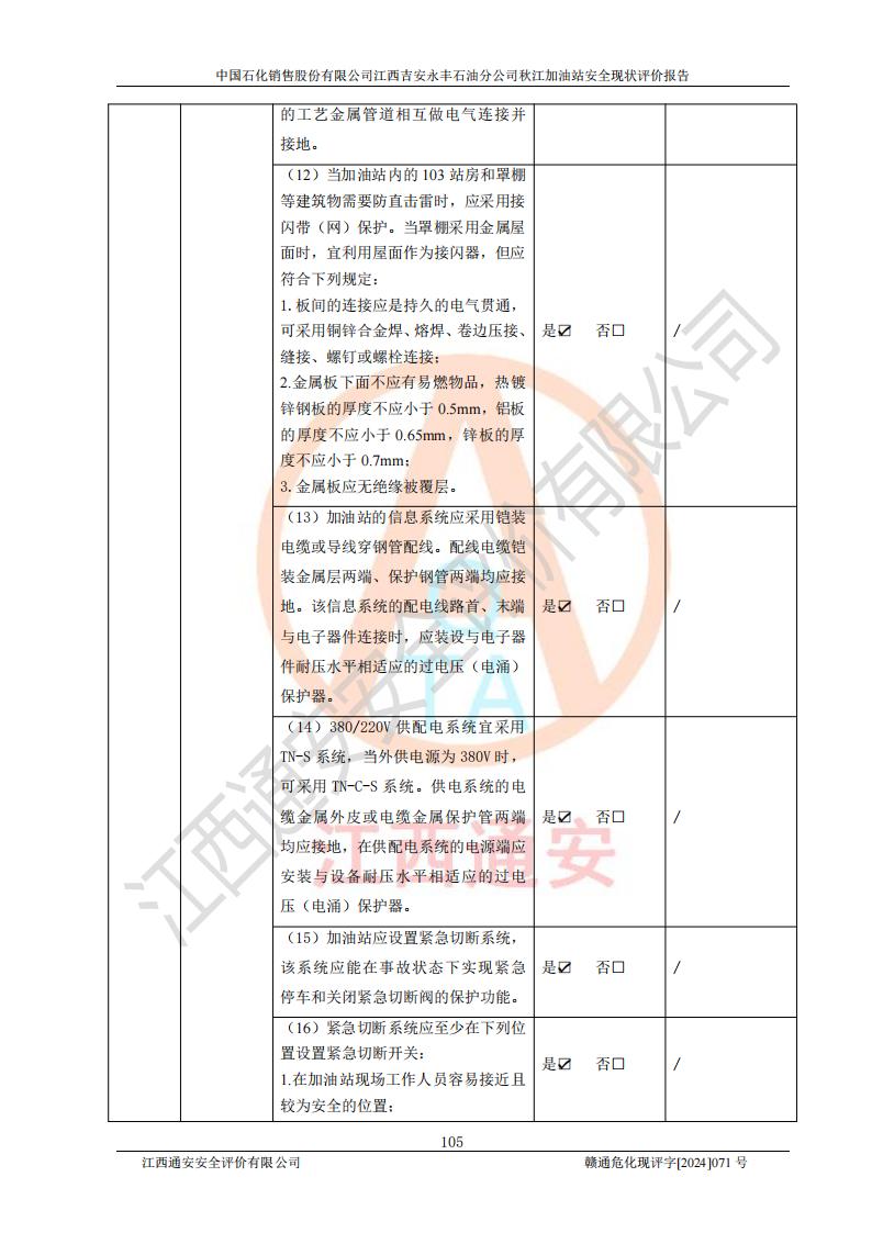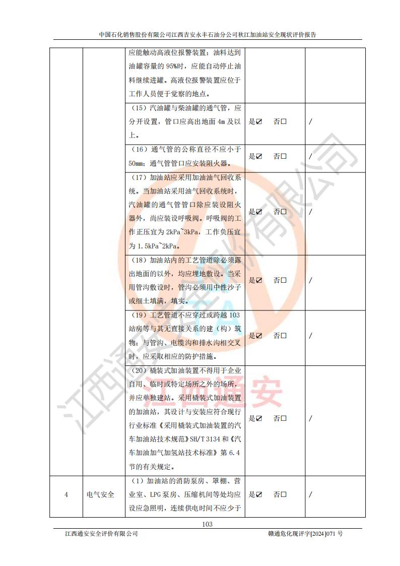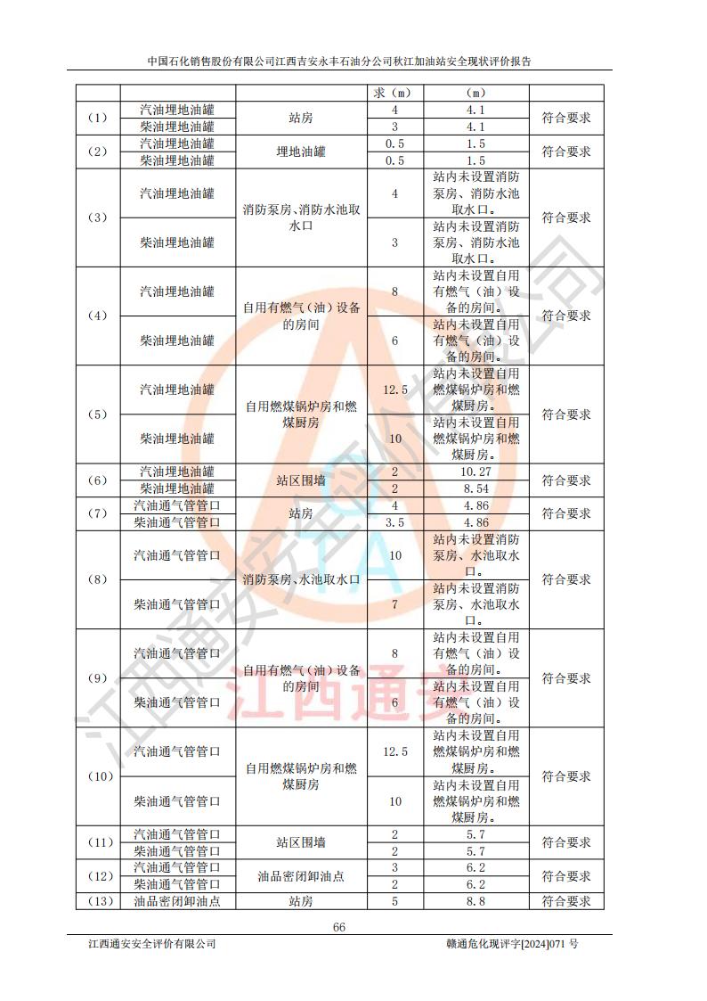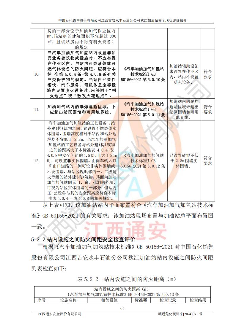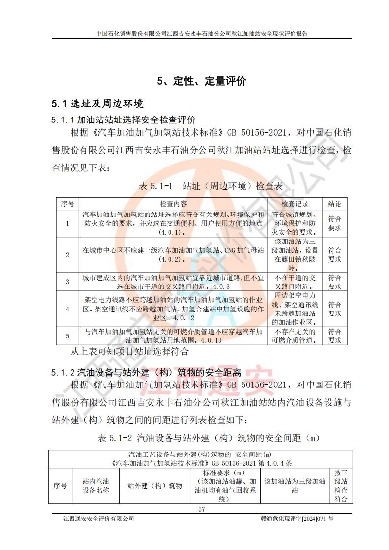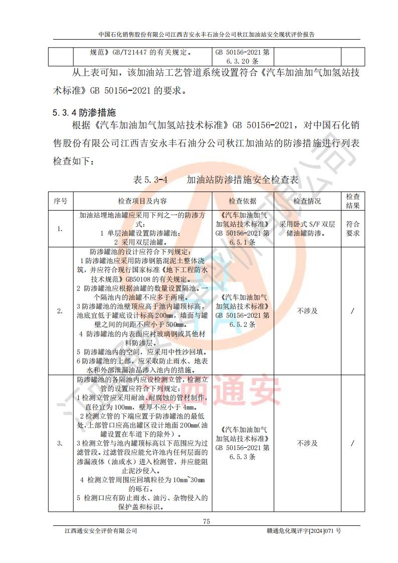 評價結(jié)論 | 江西高速實(shí)業(yè)開發(fā)有限公司吉安服務(wù)區(qū)西加油站改造項(xiàng)目現(xiàn)場布置與設(shè)計(jì)圖紙一致,有關(guān)從業(yè)人員資質(zhì)符合《江西省危險化學(xué)品安全專項(xiàng)整治三年行動實(shí)施方案》要求,具備**有關(guān)安全生產(chǎn)法律、法規(guī)、部門規(guī)章及標(biāo)準(zhǔn)規(guī)范要求的安全條件,符合經(jīng)營和儲存危險化學(xué)品的安全條件要求,具備安全驗(yàn)收的要求。 | |||