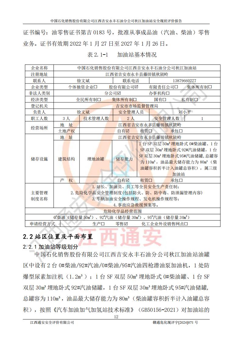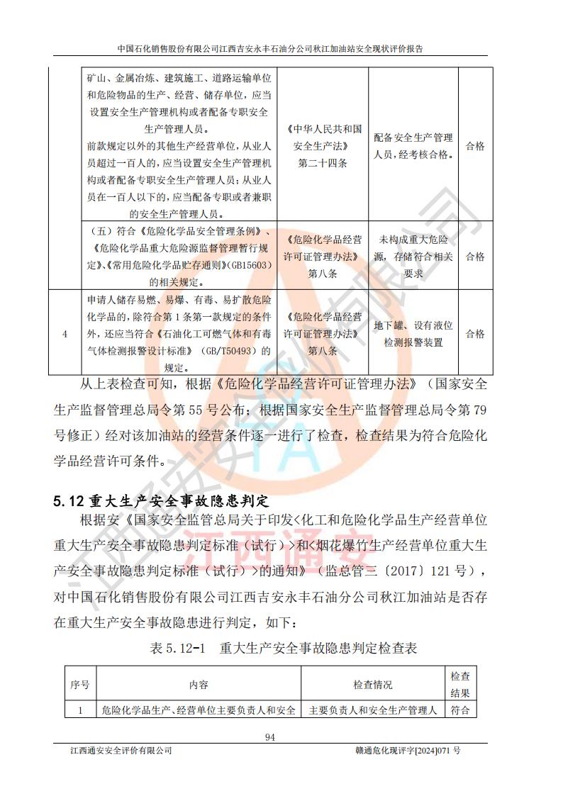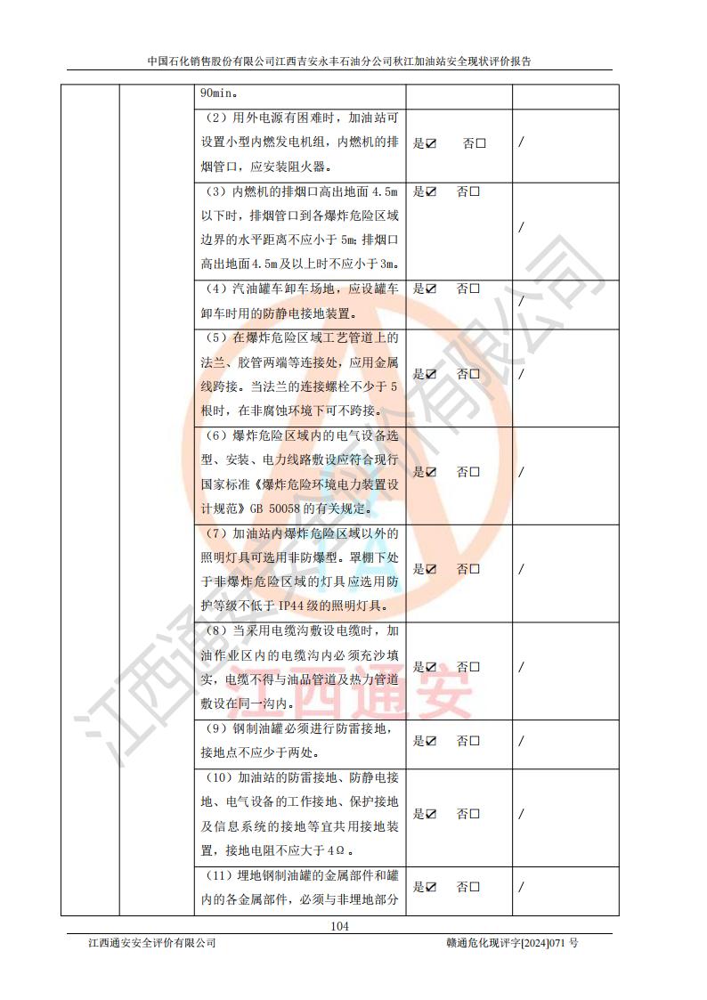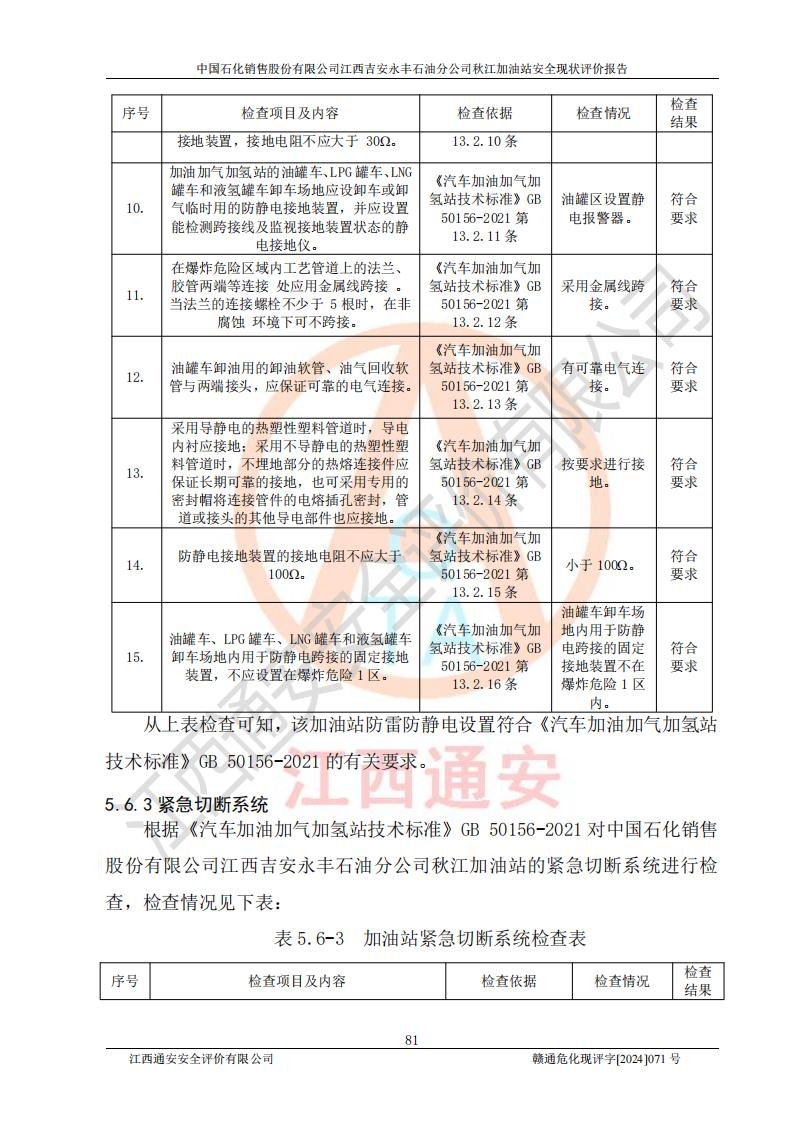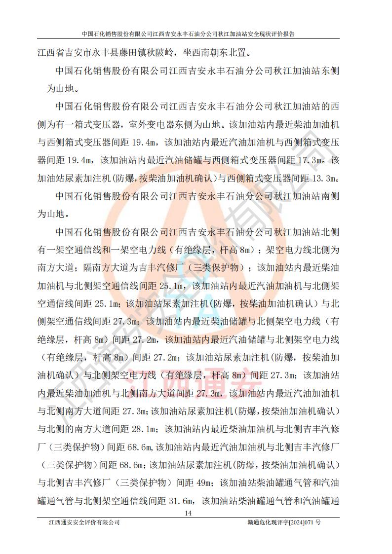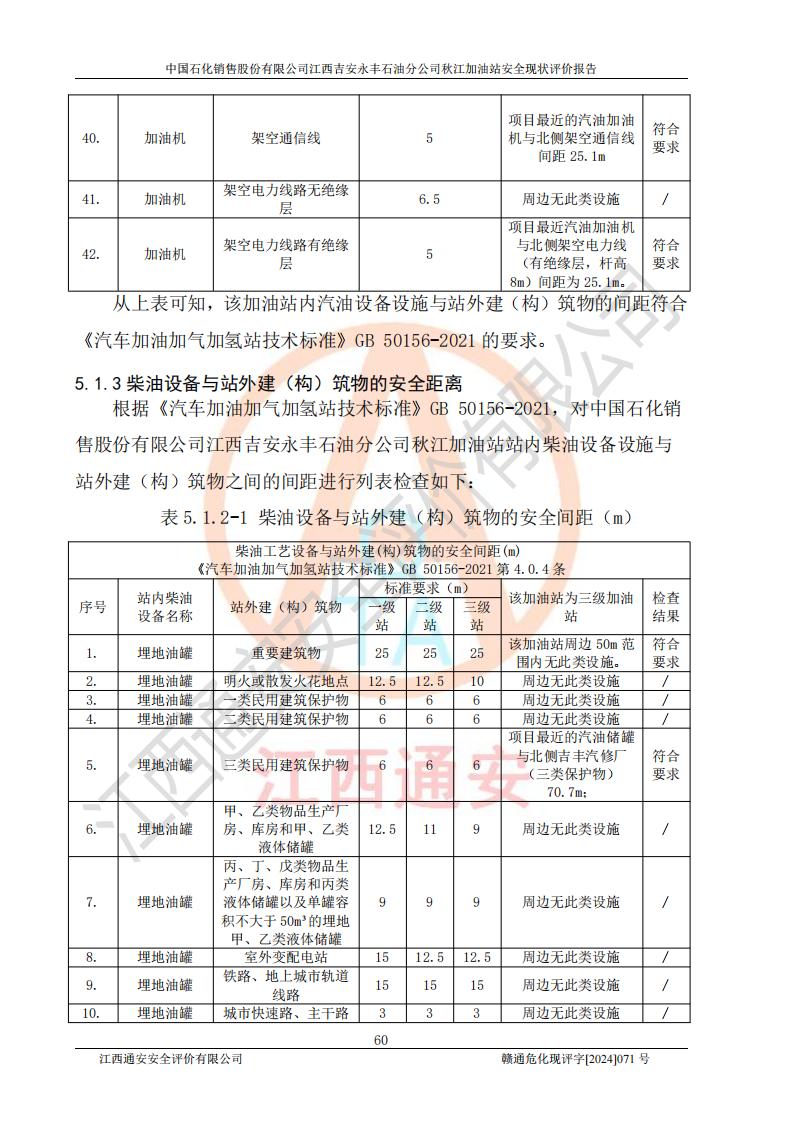 評價結(jié)論 | 江西高速實(shí)業(yè)開發(fā)有限公司吉安服務(wù)區(qū)西加油站改造項(xiàng)目現(xiàn)場布置與設(shè)計(jì)圖紙一致,有關(guān)從業(yè)人員資質(zhì)符合《江西省危險化學(xué)品安全專項(xiàng)整治三年行動實(shí)施方案》要求,具備**有關(guān)安全生產(chǎn)法律、法規(guī)、部門規(guī)章及標(biāo)準(zhǔn)規(guī)范要求的安全條件,符合經(jīng)營和儲存危險化學(xué)品的安全條件要求,具備安全驗(yàn)收的要求。 | |||