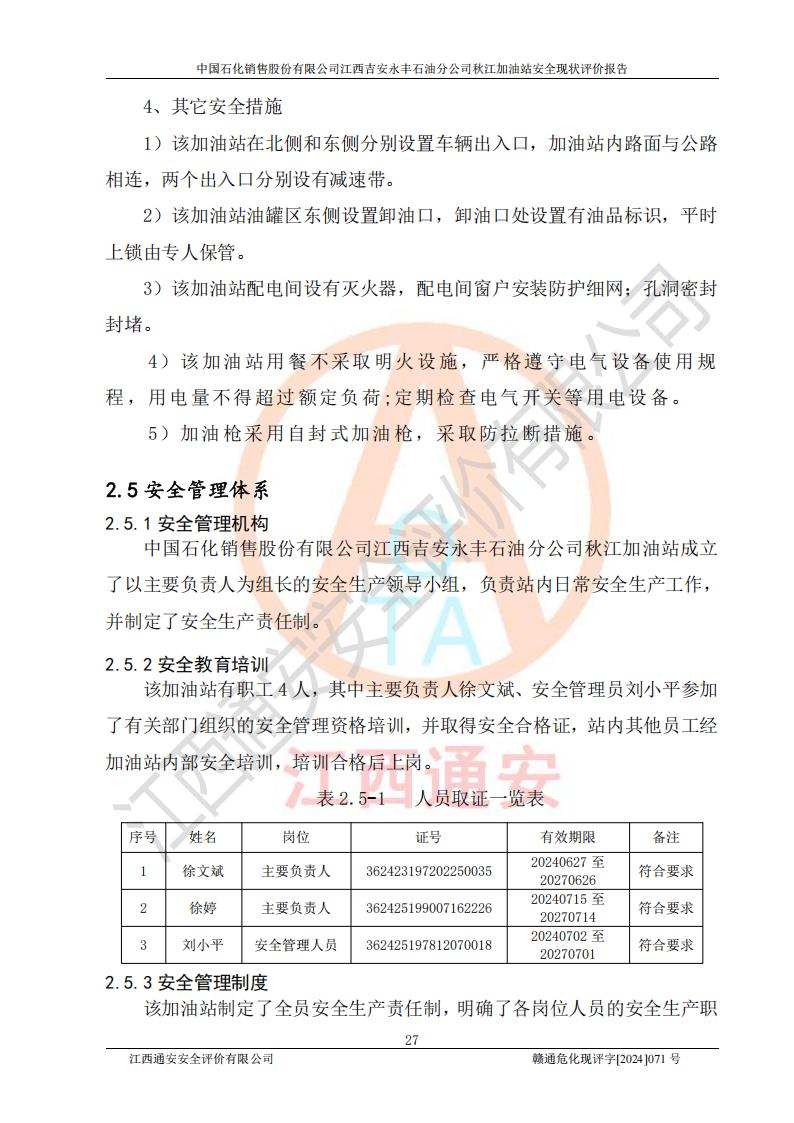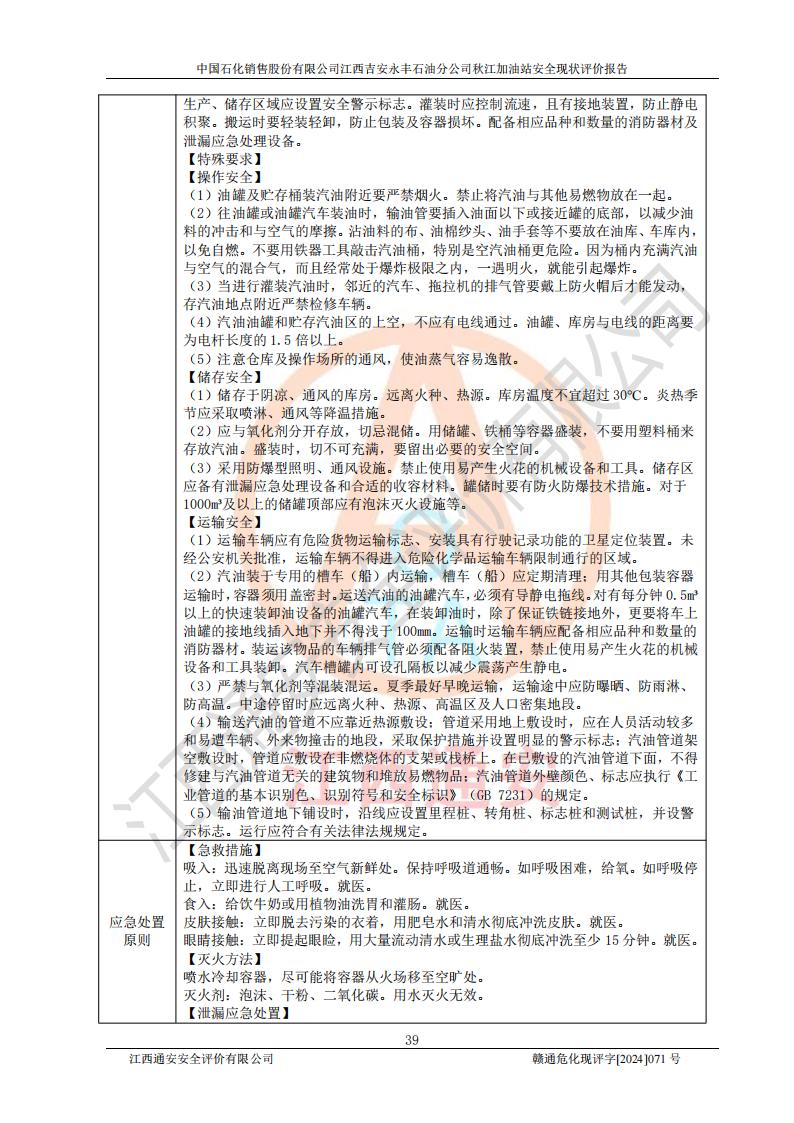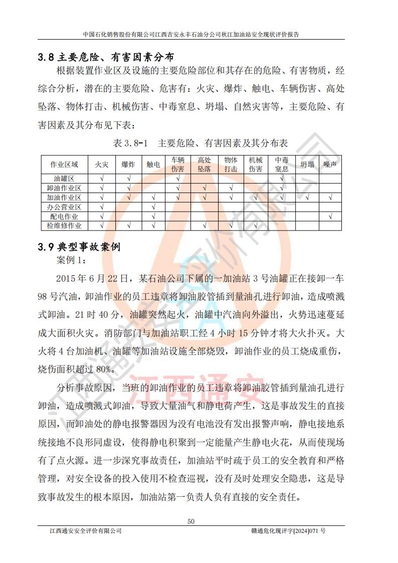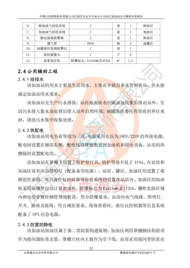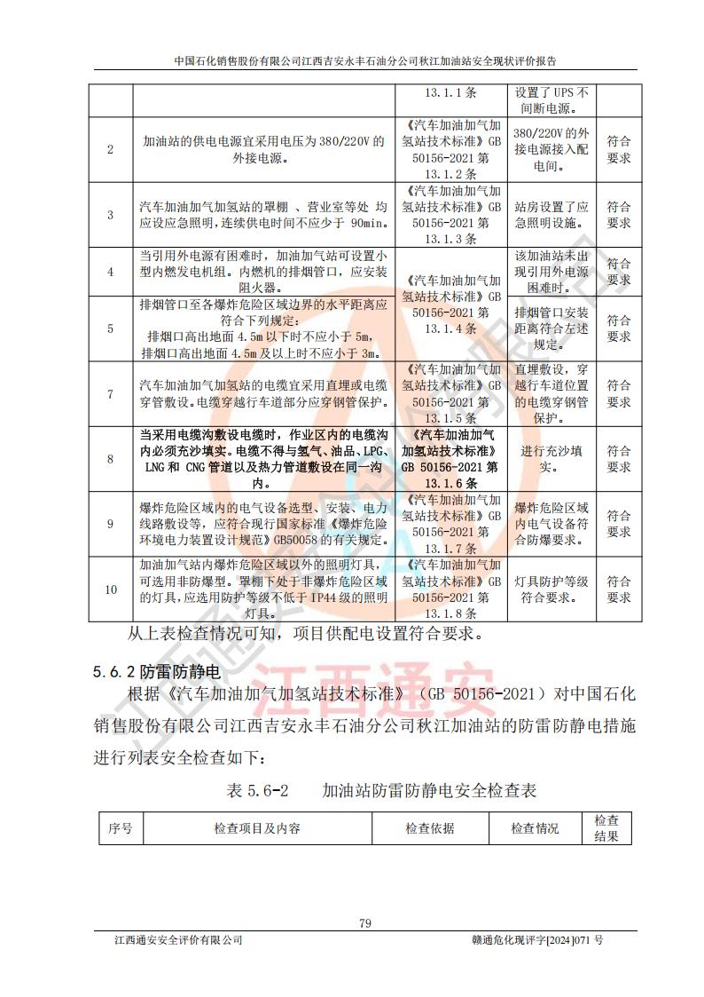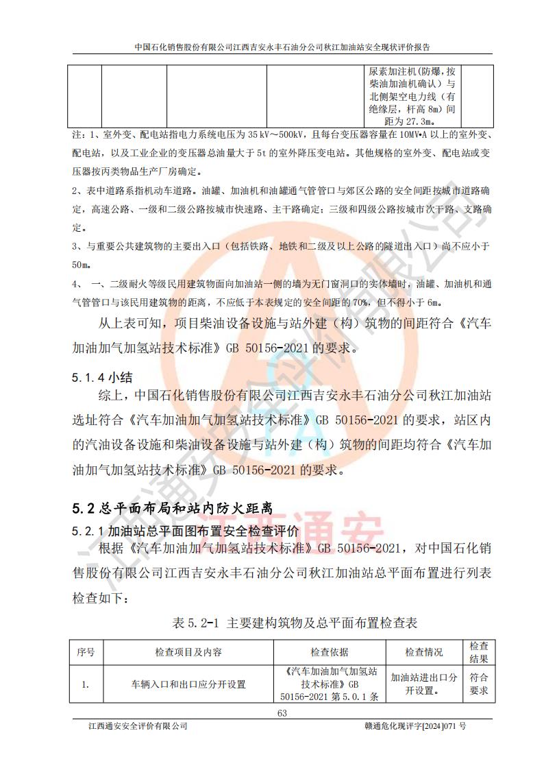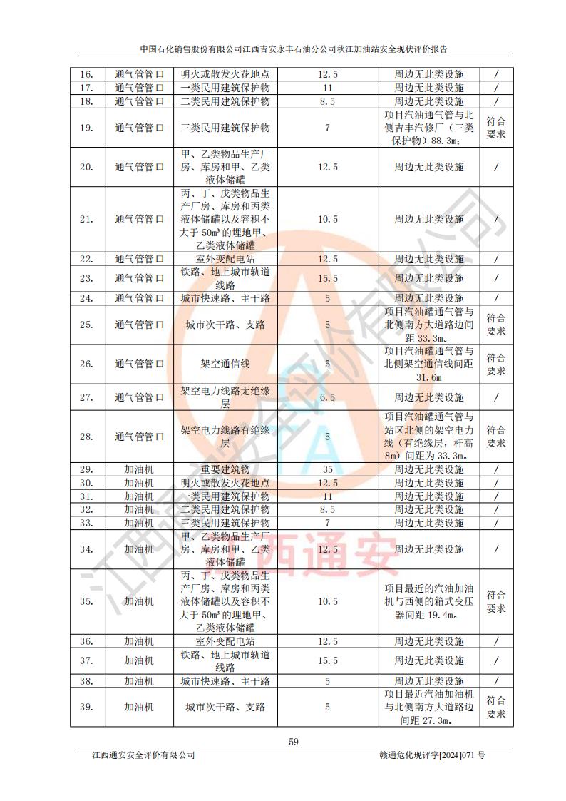 評價結(jié)論 | 江西高速實(shí)業(yè)開發(fā)有限公司吉安服務(wù)區(qū)西加油站改造項(xiàng)目現(xiàn)場布置與設(shè)計(jì)圖紙一致,有關(guān)從業(yè)人員資質(zhì)符合《江西省危險化學(xué)品安全專項(xiàng)整治三年行動實(shí)施方案》要求,具備**有關(guān)安全生產(chǎn)法律、法規(guī)、部門規(guī)章及標(biāo)準(zhǔn)規(guī)范要求的安全條件,符合經(jīng)營和儲存危險化學(xué)品的安全條件要求,具備安全驗(yàn)收的要求。 | |||