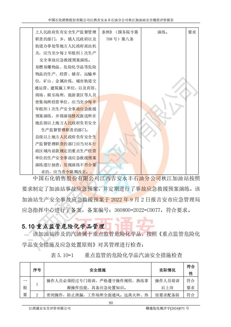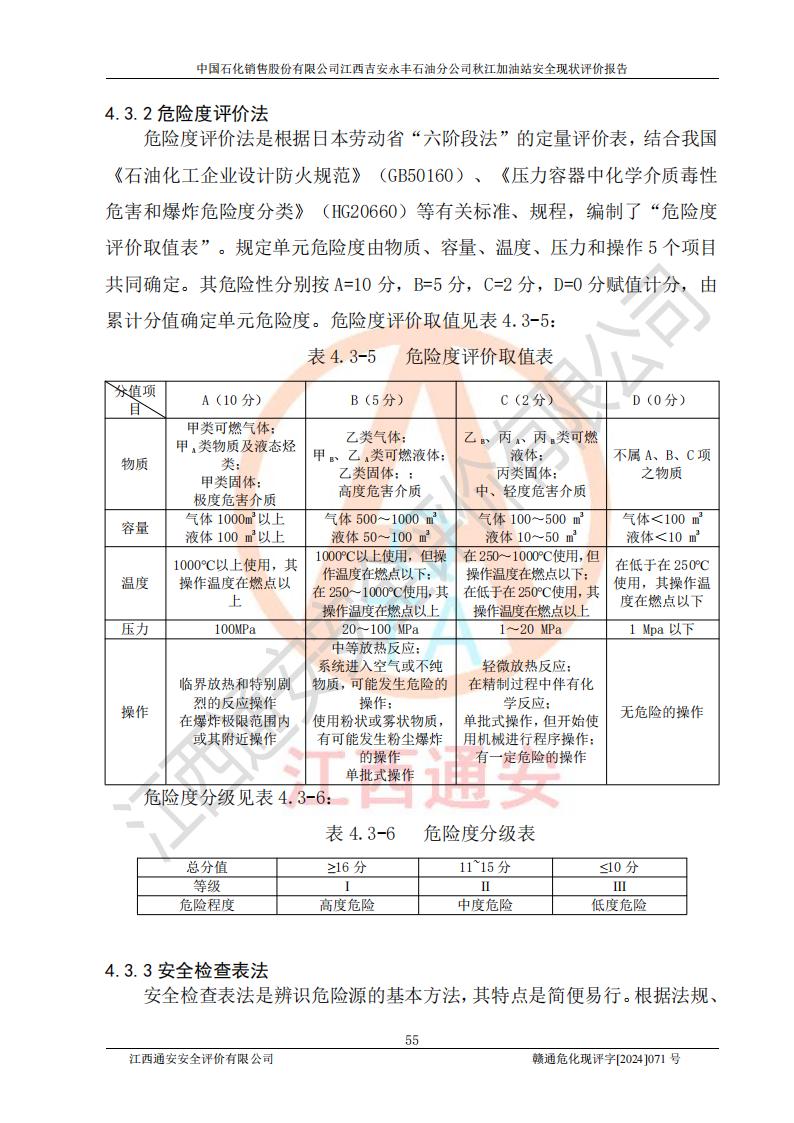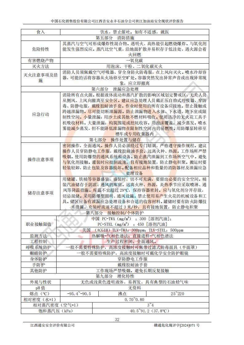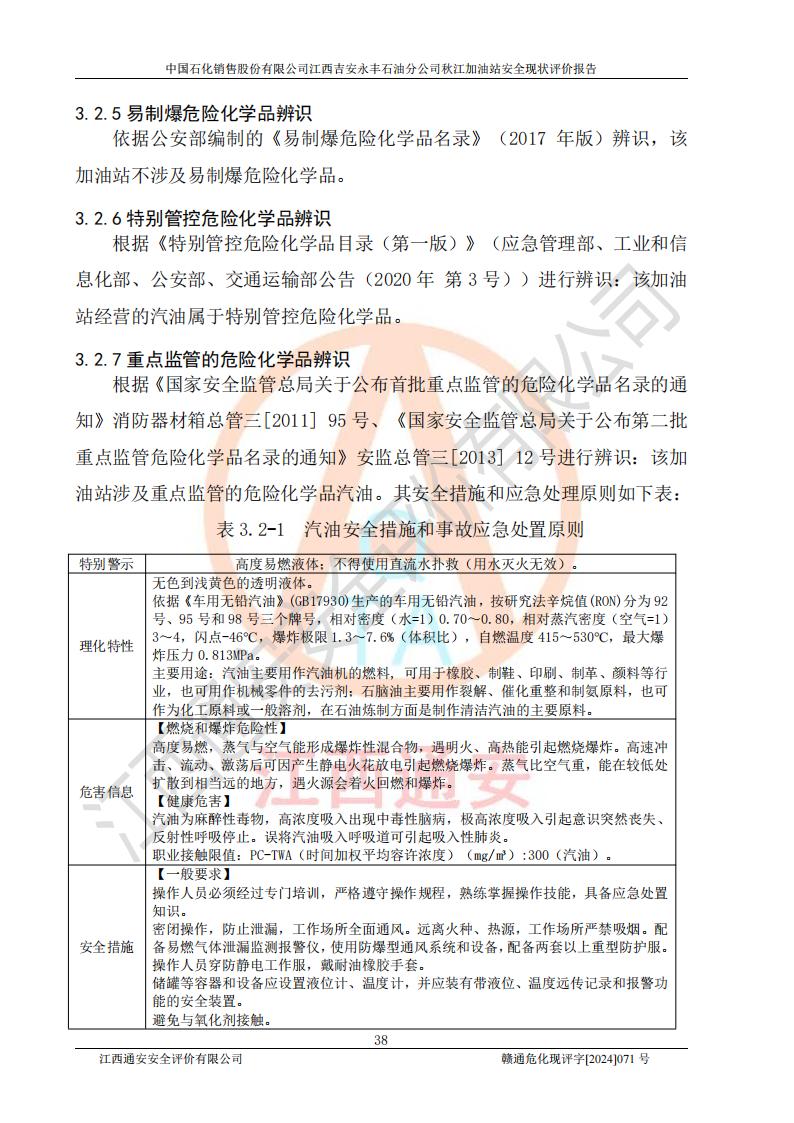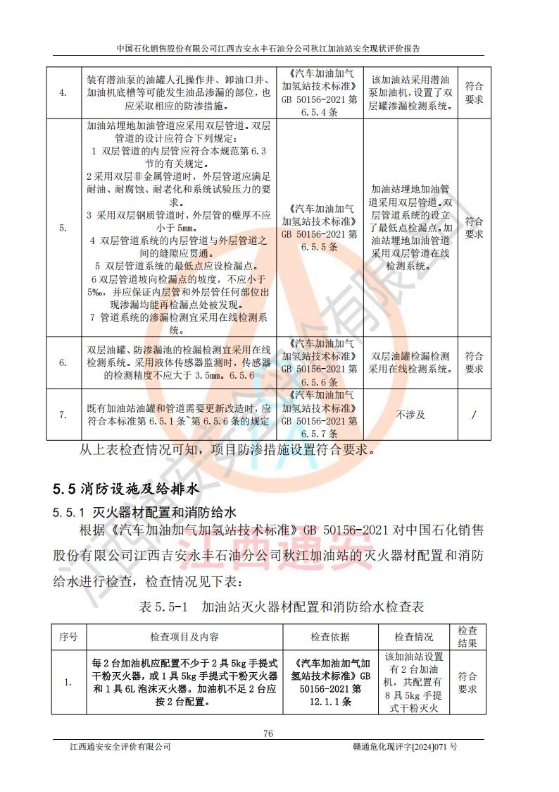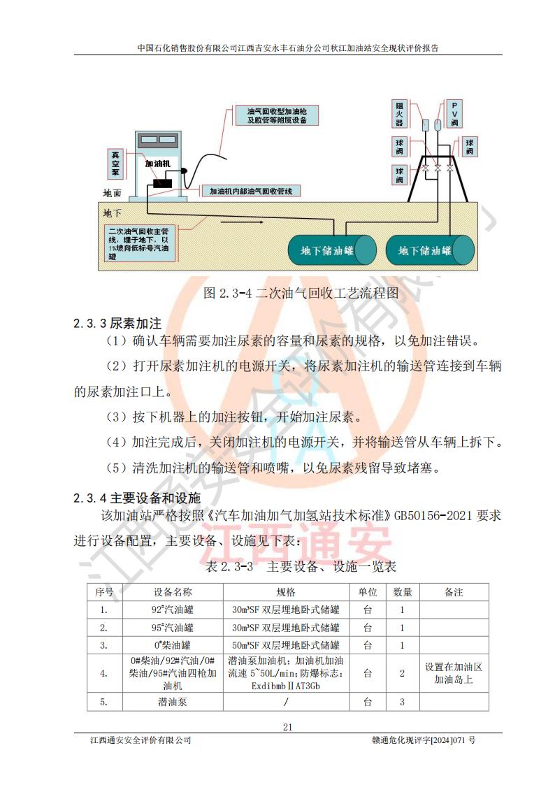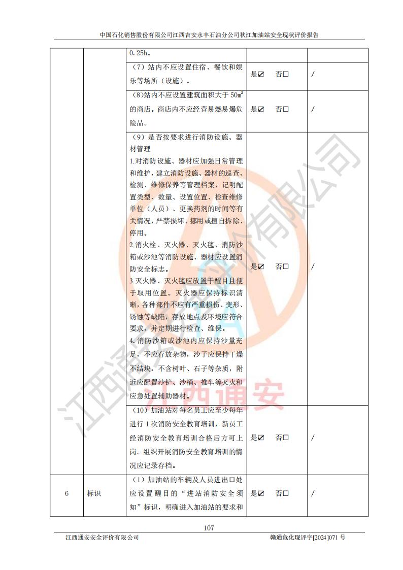 評價結(jié)論 | 江西高速實(shí)業(yè)開發(fā)有限公司吉安服務(wù)區(qū)西加油站改造項(xiàng)目現(xiàn)場布置與設(shè)計(jì)圖紙一致,有關(guān)從業(yè)人員資質(zhì)符合《江西省危險化學(xué)品安全專項(xiàng)整治三年行動實(shí)施方案》要求,具備**有關(guān)安全生產(chǎn)法律、法規(guī)、部門規(guī)章及標(biāo)準(zhǔn)規(guī)范要求的安全條件,符合經(jīng)營和儲存危險化學(xué)品的安全條件要求,具備安全驗(yàn)收的要求。 | |||