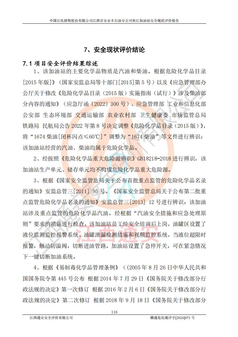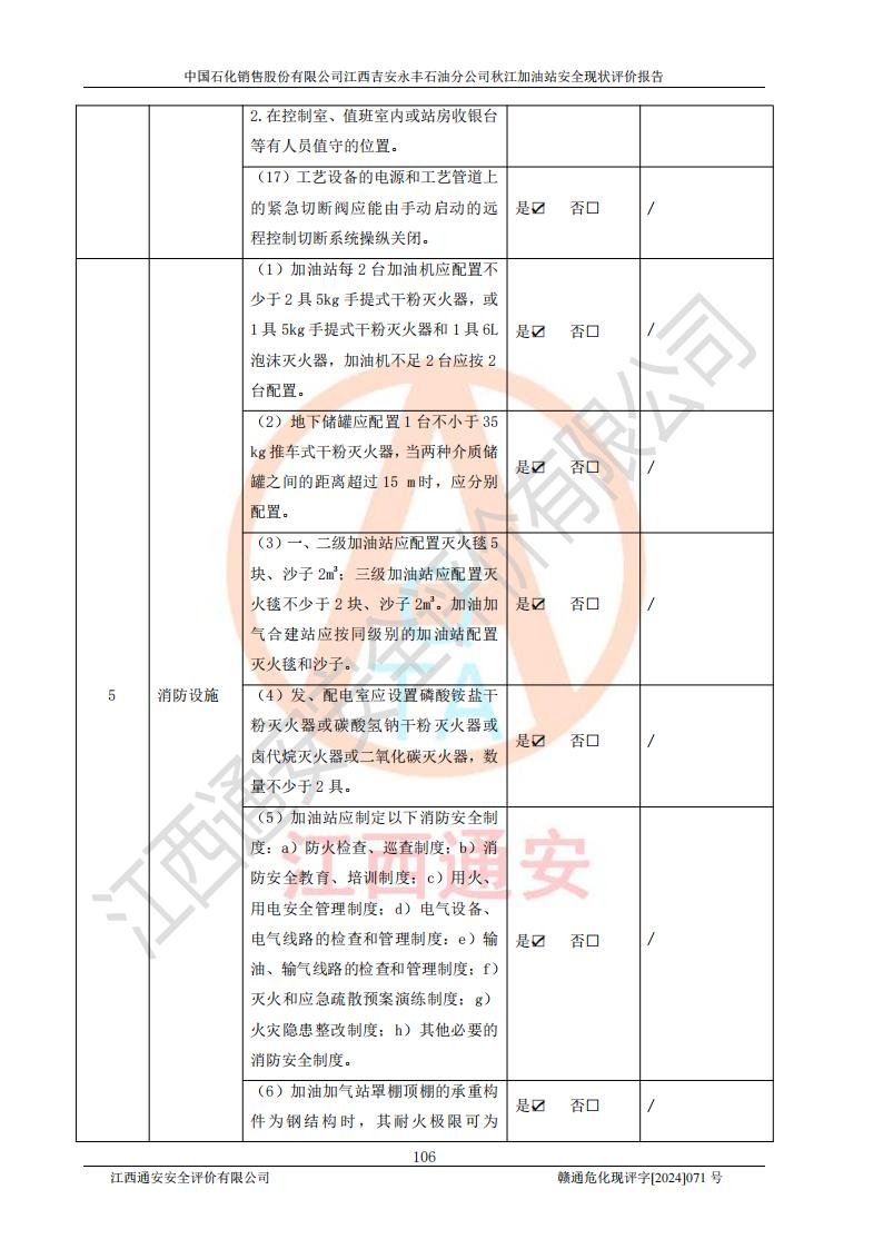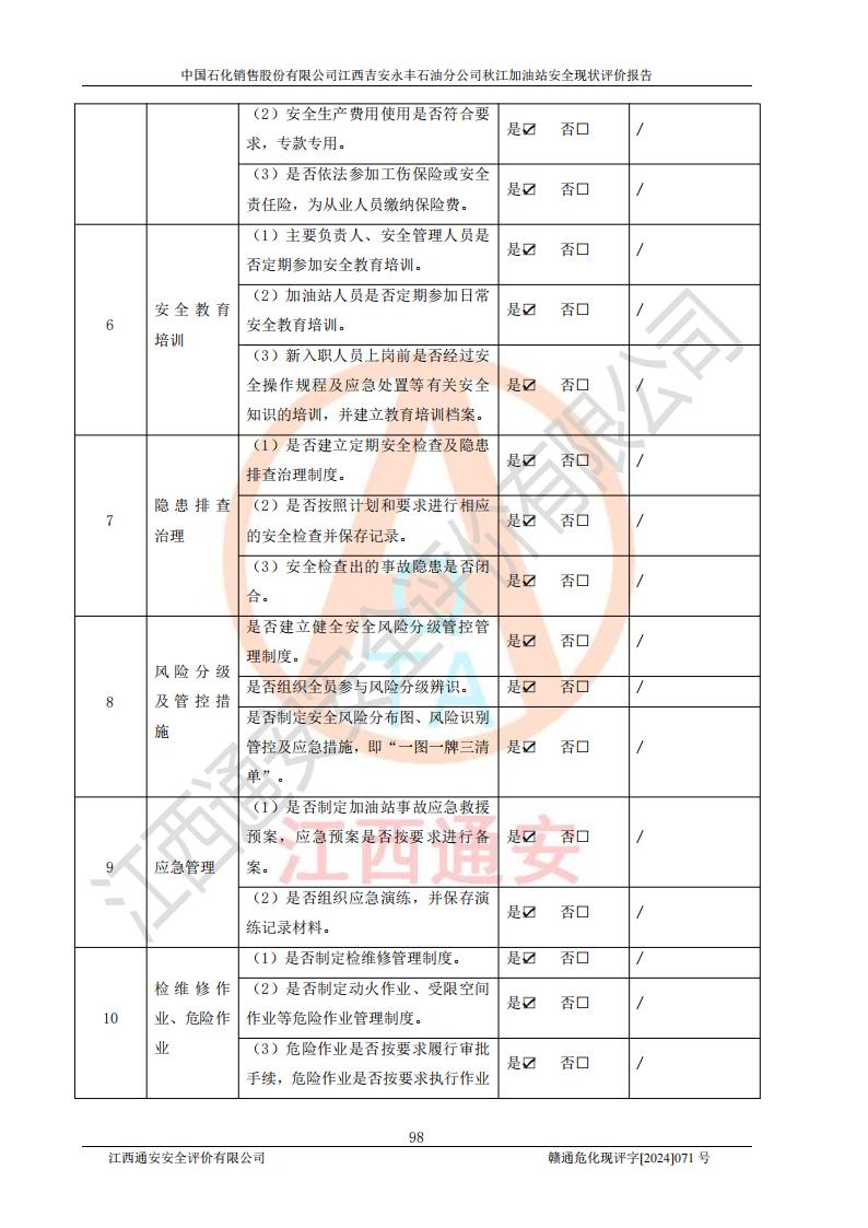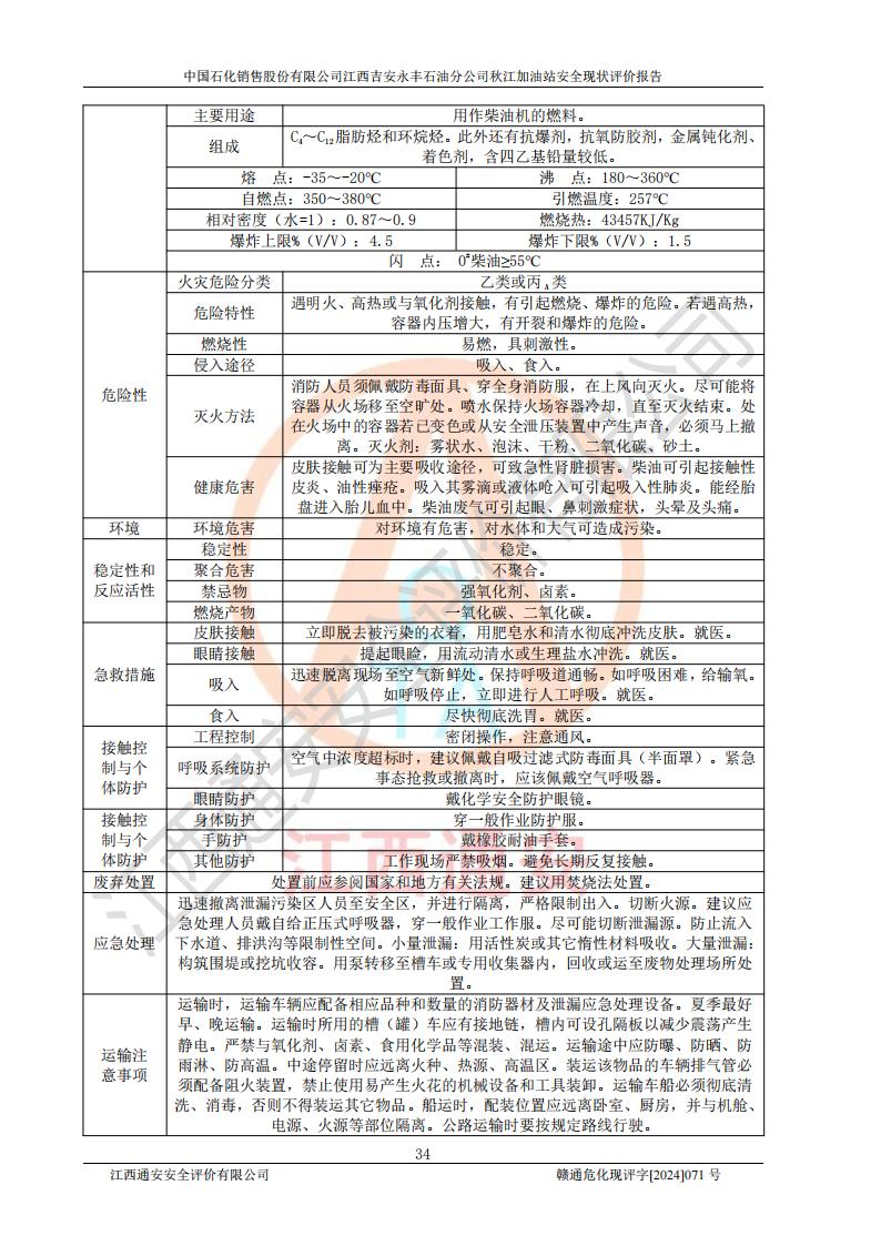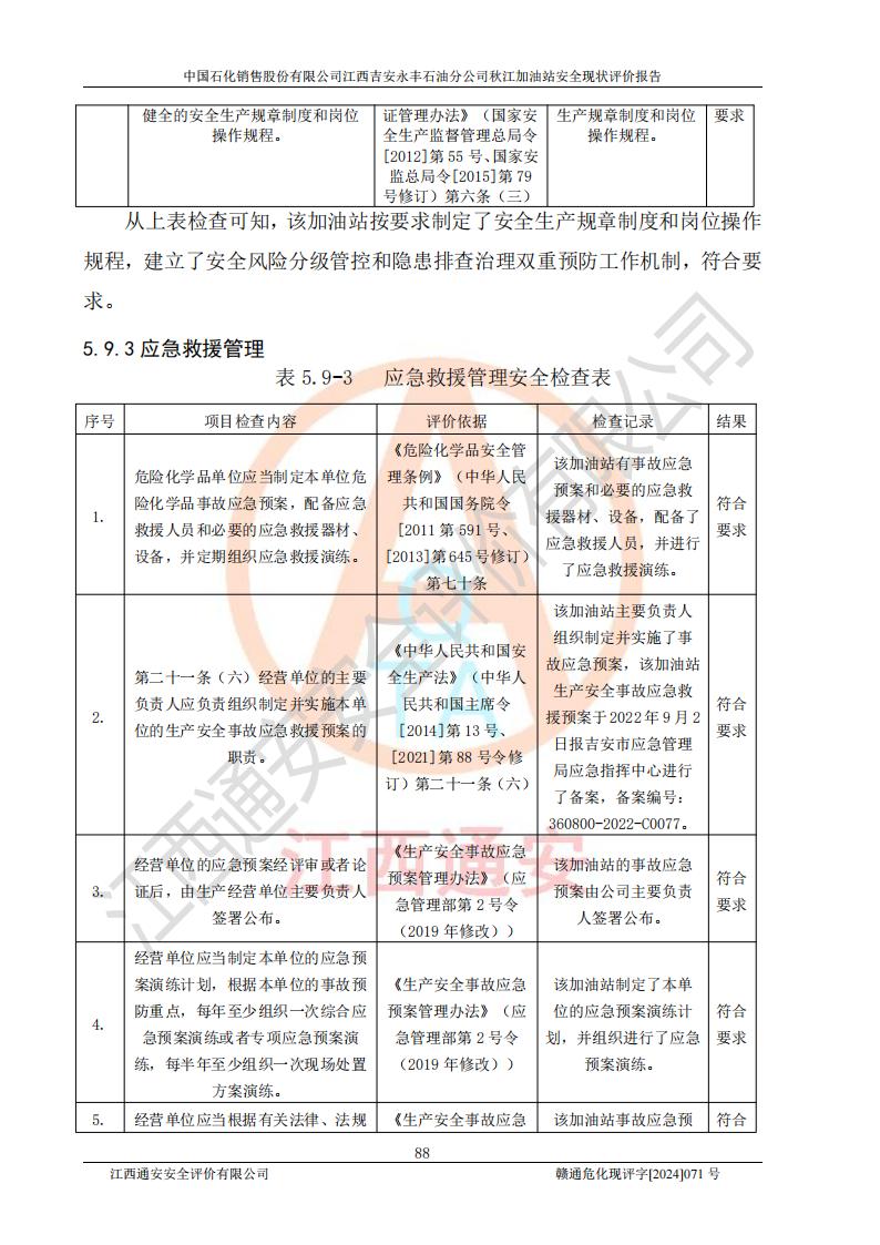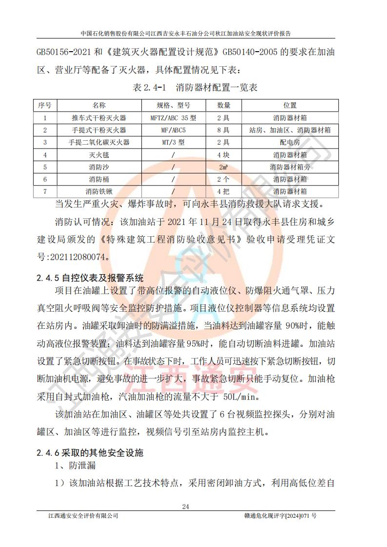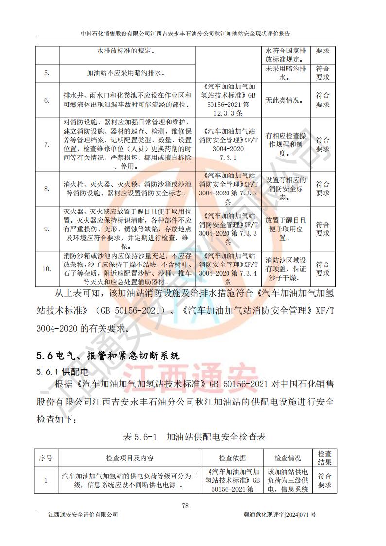 評價結(jié)論 | 江西高速實(shí)業(yè)開發(fā)有限公司吉安服務(wù)區(qū)西加油站改造項(xiàng)目現(xiàn)場布置與設(shè)計(jì)圖紙一致,有關(guān)從業(yè)人員資質(zhì)符合《江西省危險化學(xué)品安全專項(xiàng)整治三年行動實(shí)施方案》要求,具備**有關(guān)安全生產(chǎn)法律、法規(guī)、部門規(guī)章及標(biāo)準(zhǔn)規(guī)范要求的安全條件,符合經(jīng)營和儲存危險化學(xué)品的安全條件要求,具備安全驗(yàn)收的要求。 | |||