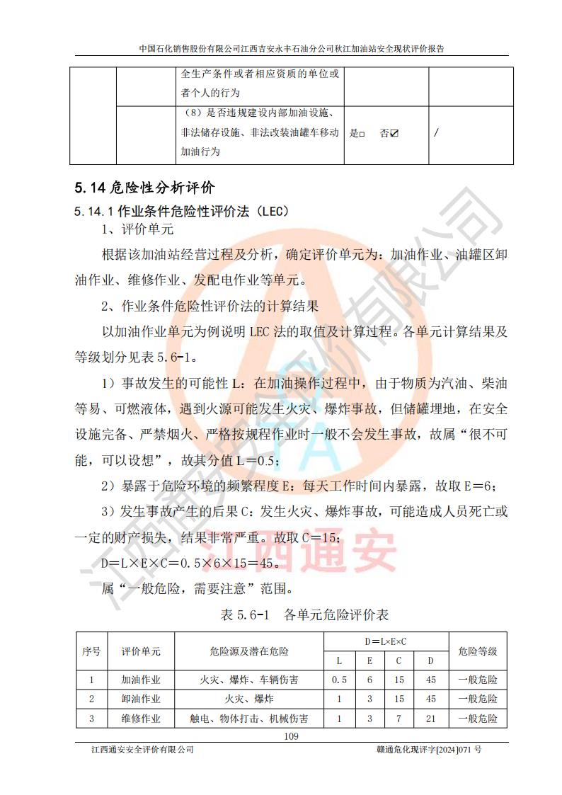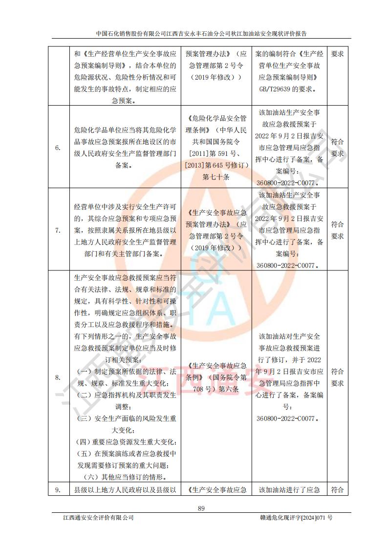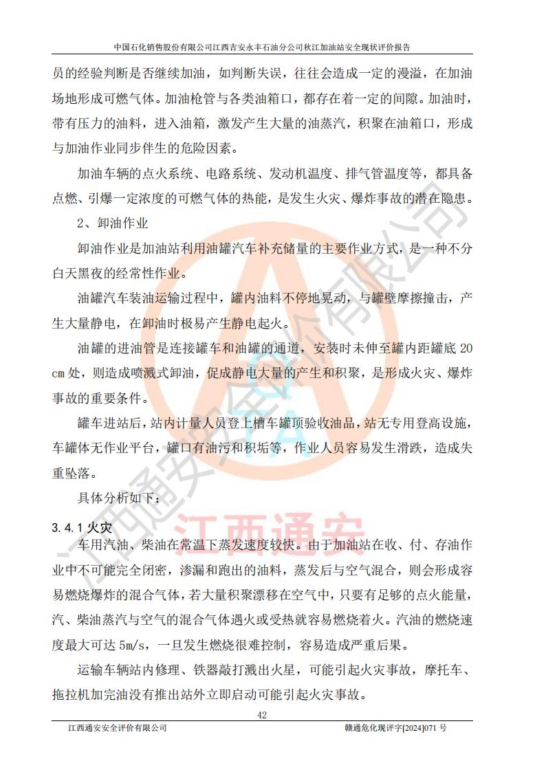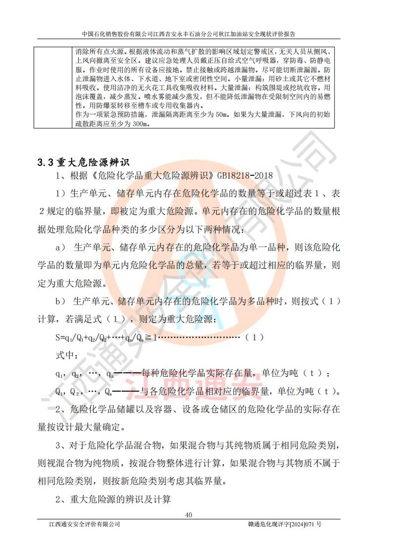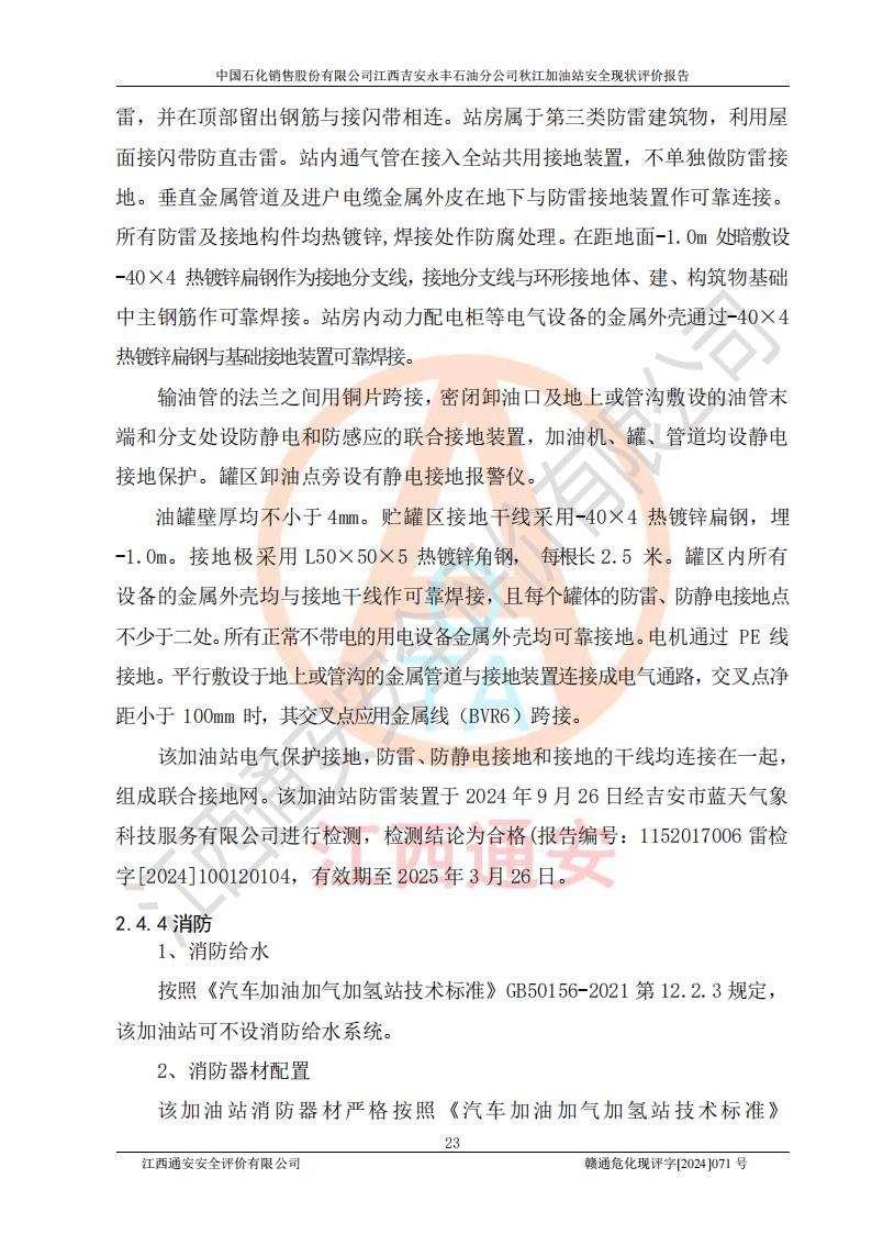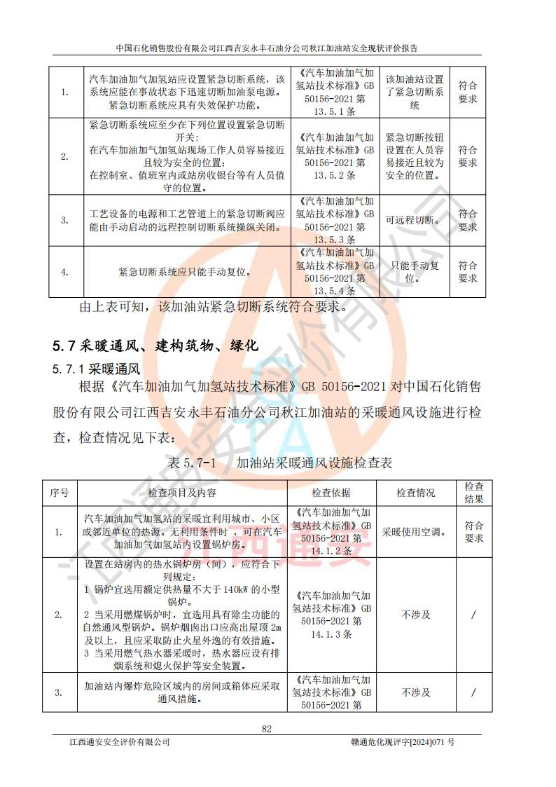評價結(jié)論 | 江西高速實(shí)業(yè)開發(fā)有限公司吉安服務(wù)區(qū)西加油站改造項(xiàng)目現(xiàn)場布置與設(shè)計(jì)圖紙一致,有關(guān)從業(yè)人員資質(zhì)符合《江西省危險化學(xué)品安全專項(xiàng)整治三年行動實(shí)施方案》要求,具備**有關(guān)安全生產(chǎn)法律、法規(guī)、部門規(guī)章及標(biāo)準(zhǔn)規(guī)范要求的安全條件,符合經(jīng)營和儲存危險化學(xué)品的安全條件要求,具備安全驗(yàn)收的要求。 | |||