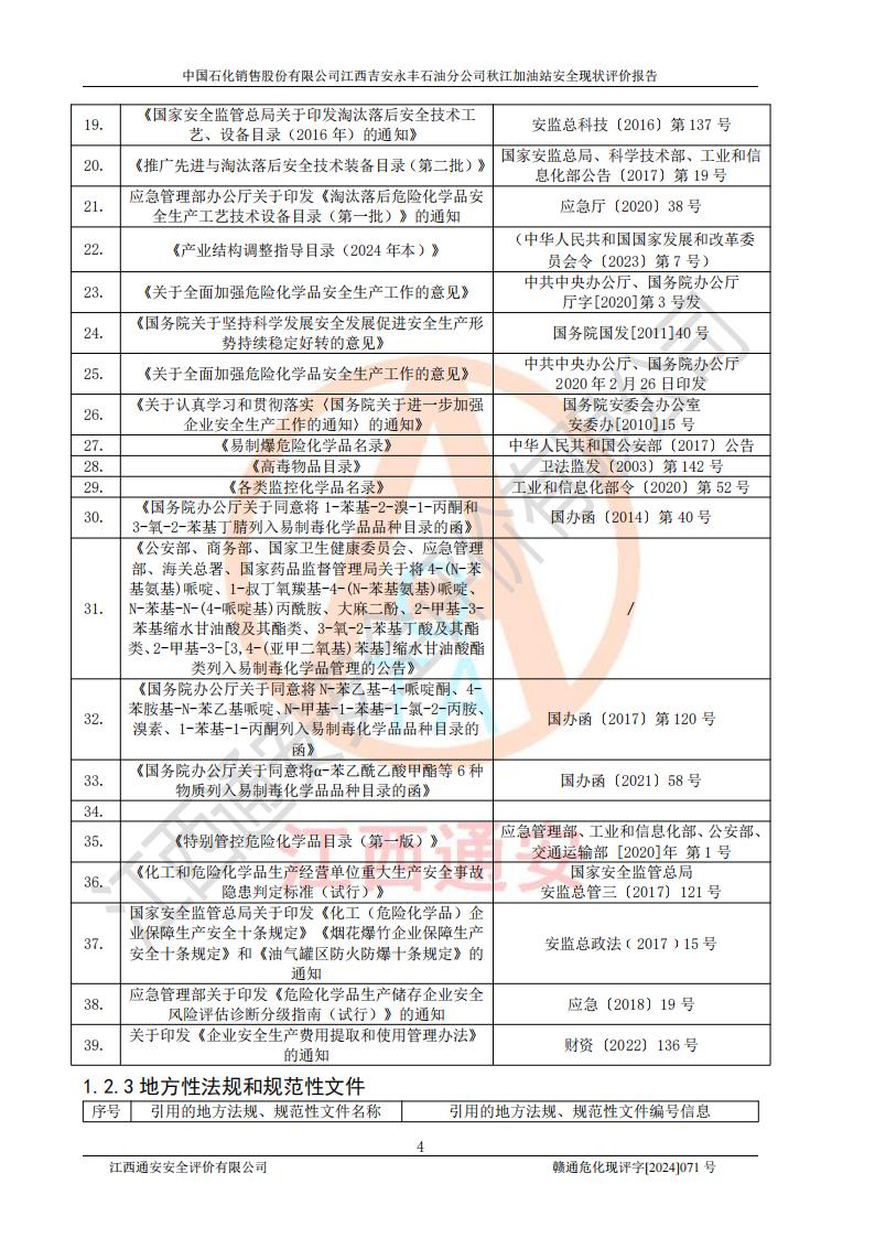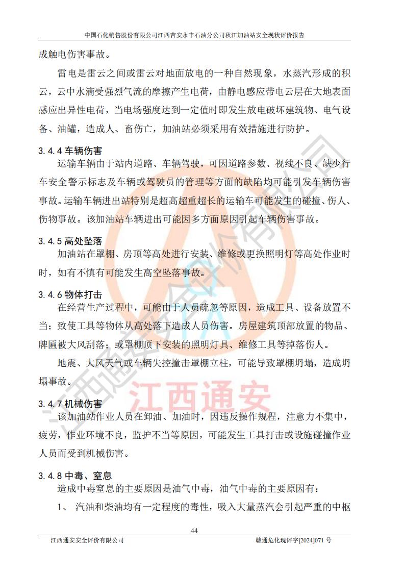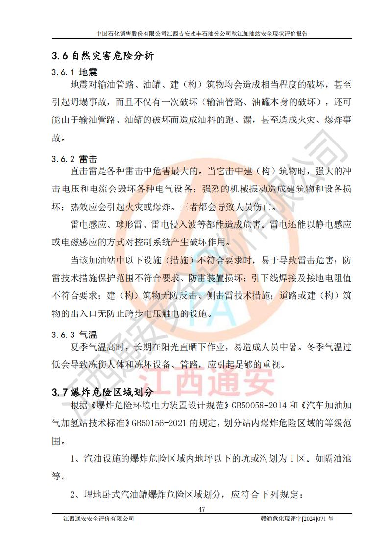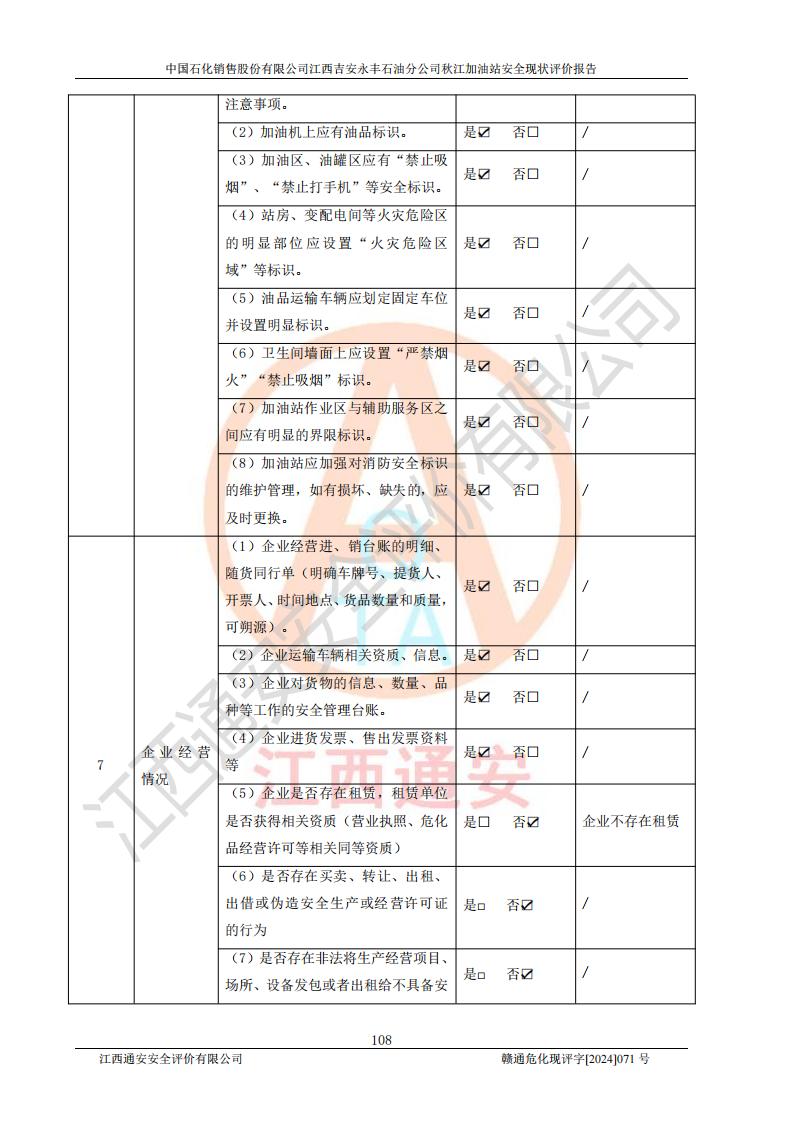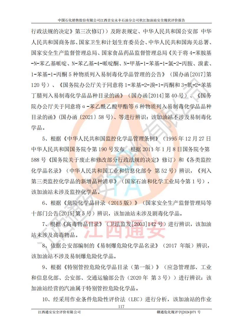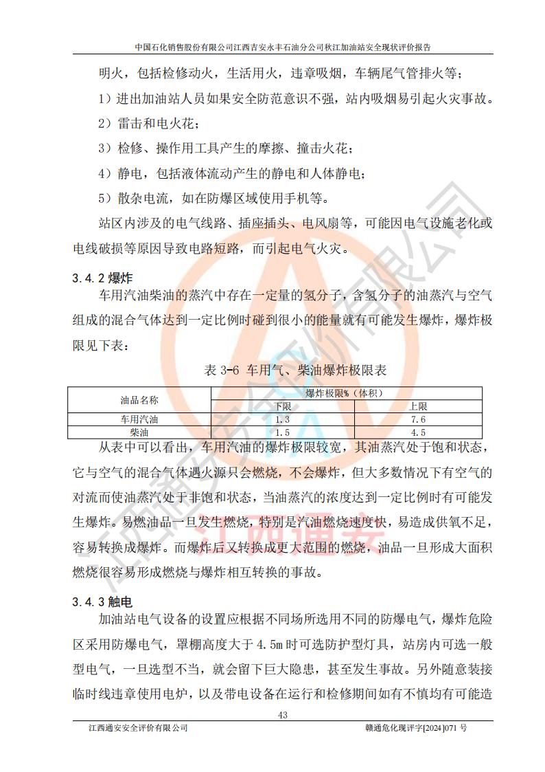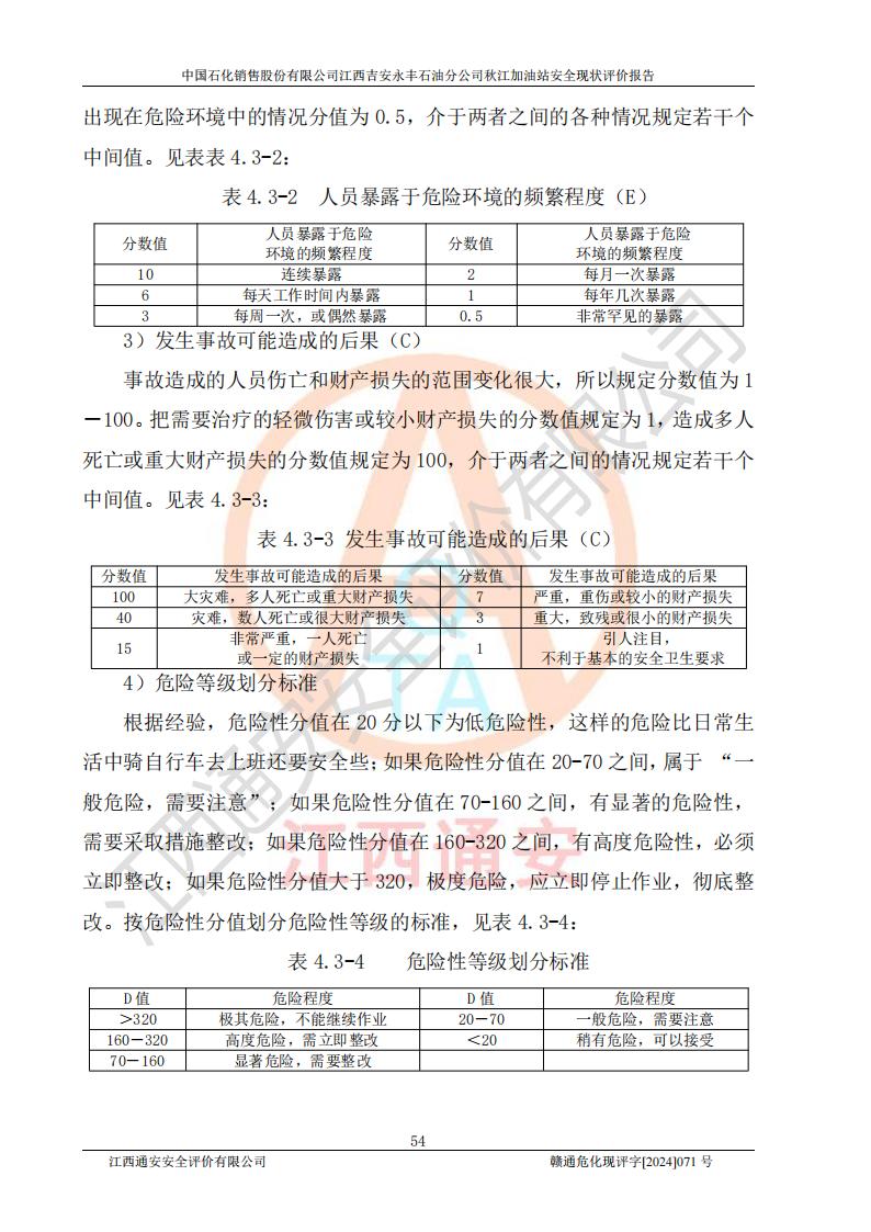 評價結(jié)論 | 江西高速實(shí)業(yè)開發(fā)有限公司吉安服務(wù)區(qū)西加油站改造項(xiàng)目現(xiàn)場布置與設(shè)計(jì)圖紙一致,有關(guān)從業(yè)人員資質(zhì)符合《江西省危險化學(xué)品安全專項(xiàng)整治三年行動實(shí)施方案》要求,具備**有關(guān)安全生產(chǎn)法律、法規(guī)、部門規(guī)章及標(biāo)準(zhǔn)規(guī)范要求的安全條件,符合經(jīng)營和儲存危險化學(xué)品的安全條件要求,具備安全驗(yàn)收的要求。 | |||