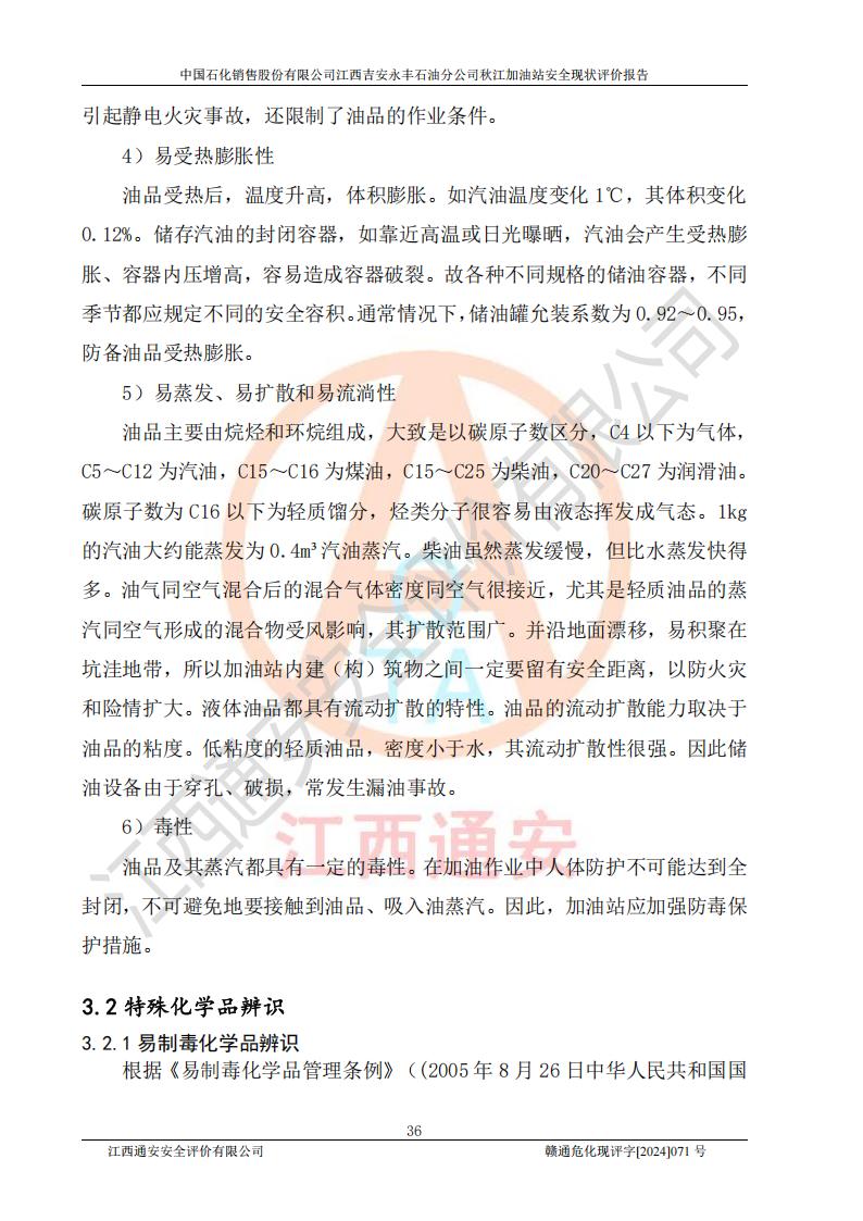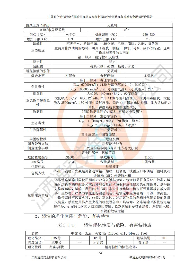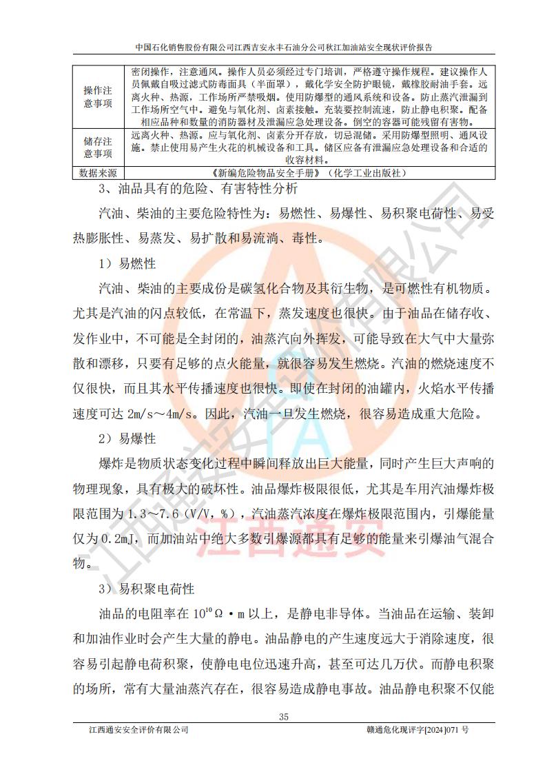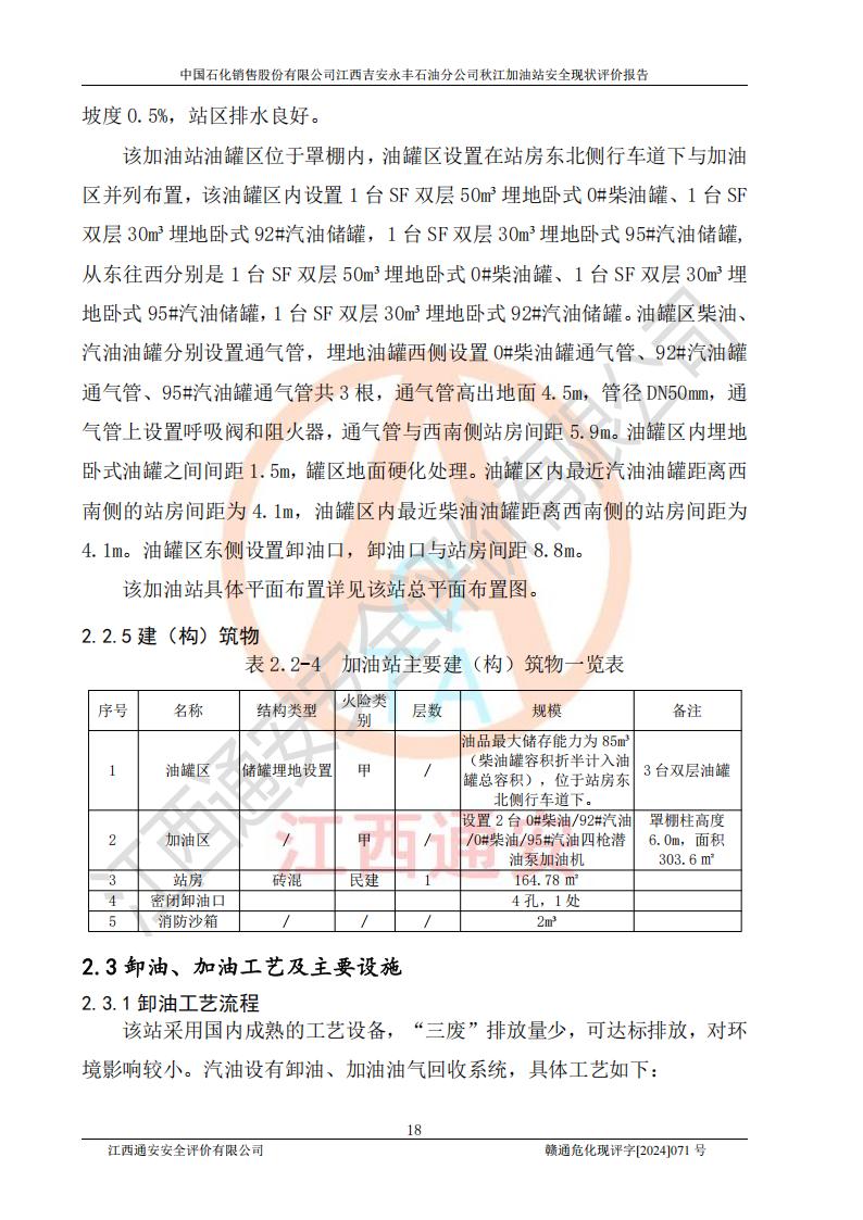 項(xiàng)目簡介 | 江西高速實(shí)業(yè)開發(fā)有限公司吉安服務(wù)區(qū)西加油站成立于2021年9月22日,企業(yè)類型:其他有限責(zé)任公司分公司,法定**人余勇。 江西高速實(shí)業(yè)開發(fā)有限公司吉安服務(wù)區(qū)西加油站2024年8月30日取得由吉安縣發(fā)展和改革委員會出具的《江西省企業(yè)投資項(xiàng)目備案通知書》,項(xiàng)目統(tǒng)一代碼為:2408-360821-04-01-467493,項(xiàng)目名稱:江西高速實(shí)業(yè)開發(fā)有限公司吉安服務(wù)區(qū)西加油站改造項(xiàng)目。 江西高速實(shí)業(yè)開發(fā)有限公司吉安服務(wù)區(qū)西加油站位于江西省吉安市吉安縣大廣高速吉安東區(qū)服務(wù)區(qū)(橫江段),加油站租賃江西贛粵實(shí)業(yè)發(fā)展有限公司用地。該加油站設(shè)有的1座503的0#柴油埋地臥式雙層貯罐、2座50m3的92#汽油埋地臥式油罐、1座50m3的95#汽油埋地臥式雙層油罐、1座30m3的95#汽油埋地臥式雙層油罐;*大存儲量為230m3,實(shí)際油品折算總?cè)萘繛?05m3(柴油折半),屬于**加油站。 江西高速實(shí)業(yè)開發(fā)有限公司吉安服務(wù)區(qū)西加油站2024年9月委托山東新安達(dá)工程咨詢有限公司編制《江西高速實(shí)業(yè)開發(fā)有限公司吉安服務(wù)區(qū)西加油站改造項(xiàng)目安全條件評價報(bào)告》,并于2024年9月13日取得《危險化學(xué)品建設(shè)項(xiàng)目安全條件備案告知意見書》(吉市危化項(xiàng)目安條審字[2024]9號)。 江西高速實(shí)業(yè)開發(fā)有限公司吉安服務(wù)區(qū)西加油站改造項(xiàng)目2024年11月委托天津中德工程設(shè)計(jì)有限公司編制《江西高速實(shí)業(yè)開發(fā)有限公司吉安服務(wù)區(qū)西加油站改造項(xiàng)目安全設(shè)施設(shè)計(jì)專篇》,并于2024年11月14日取得《危險化學(xué)品建設(shè)項(xiàng)目安全設(shè)施設(shè)計(jì)審查意見書》(吉市危化項(xiàng)目安設(shè)審字[2024]31號)。 項(xiàng)目生產(chǎn)過程中涉及的危險化學(xué)品有:汽油、柴油等。 項(xiàng)目各生產(chǎn)和儲存單元均未構(gòu)成危險化學(xué)品重大危險源。 | |||