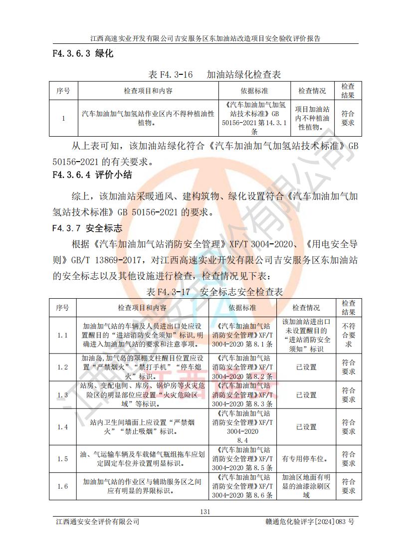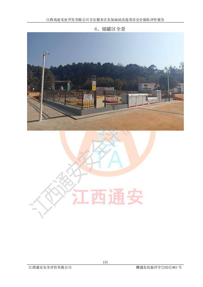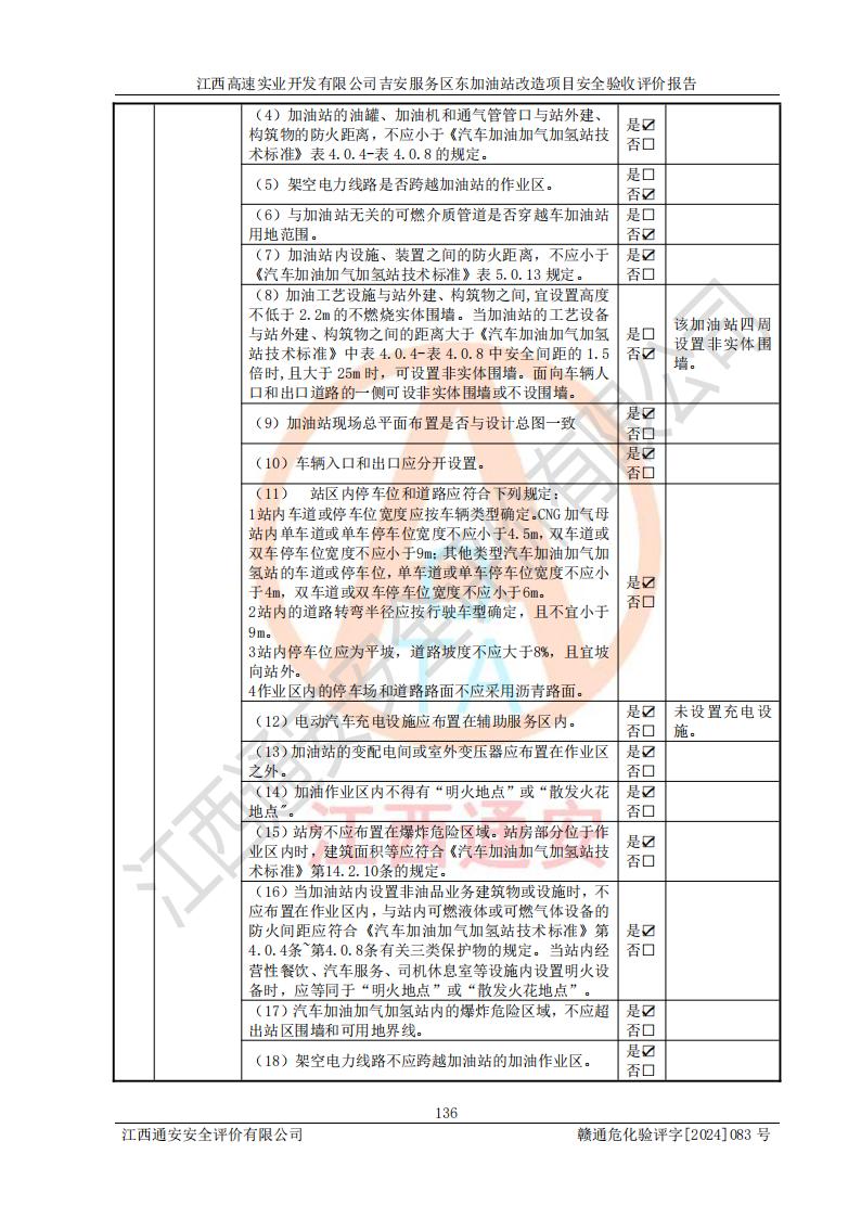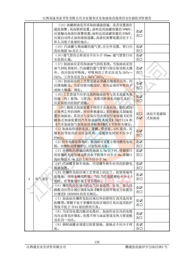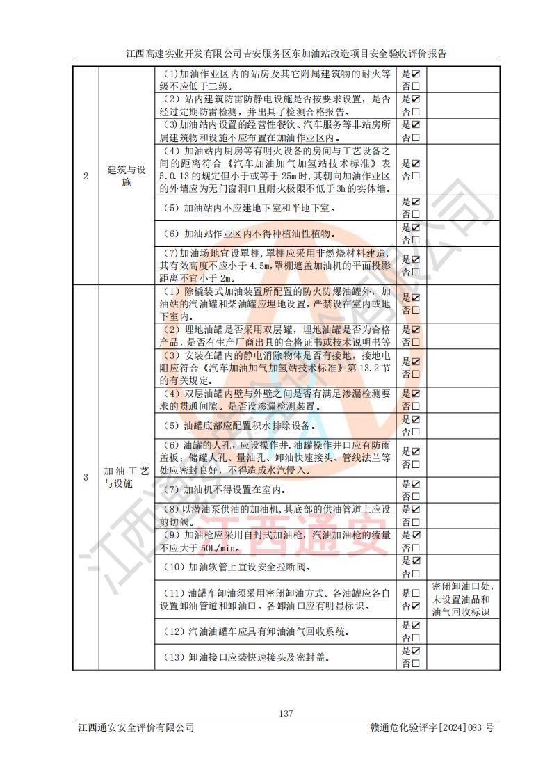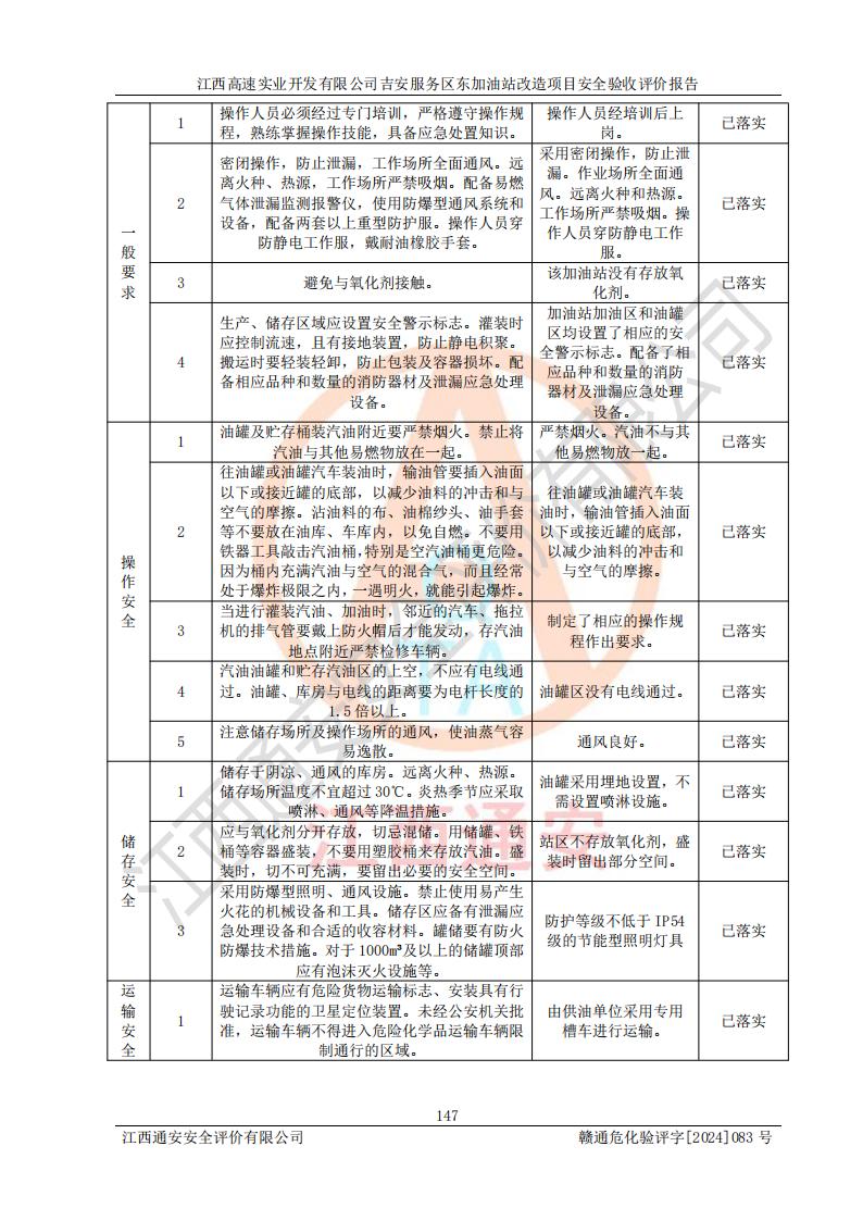 評價結論 | 江西高速實業(yè)開發(fā)有限公司吉安服務區(qū)東加油站改造項目現(xiàn)場布置與設計圖紙一致,有關從業(yè)人員資質符合《江西省危險化學品安全專項整治三年行動實施方案》要求,具備**有關安全生產(chǎn)法律、法規(guī)、部門規(guī)章及標準規(guī)范要求的安全條件,符合經(jīng)營和儲存危險化學品的安全條件要求,具備安全驗收的要求。 | |||