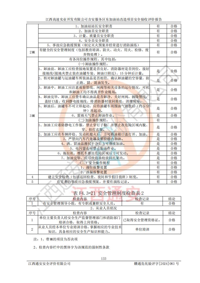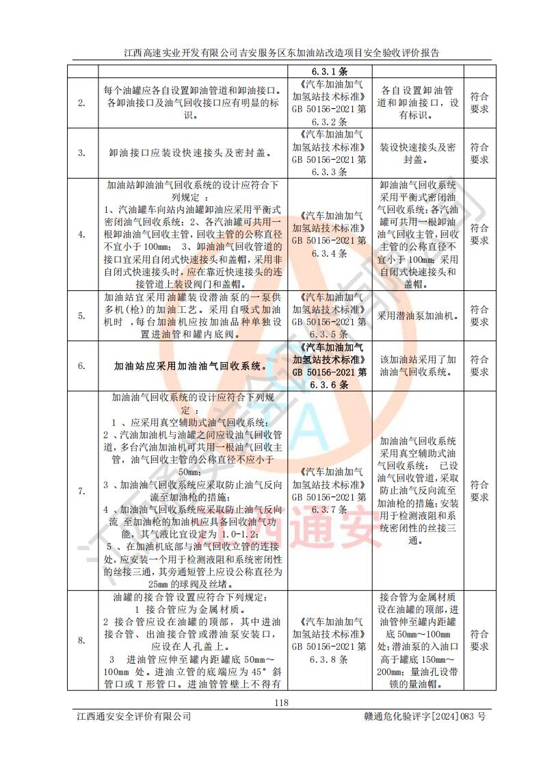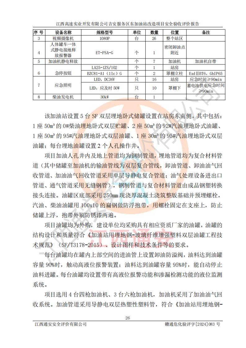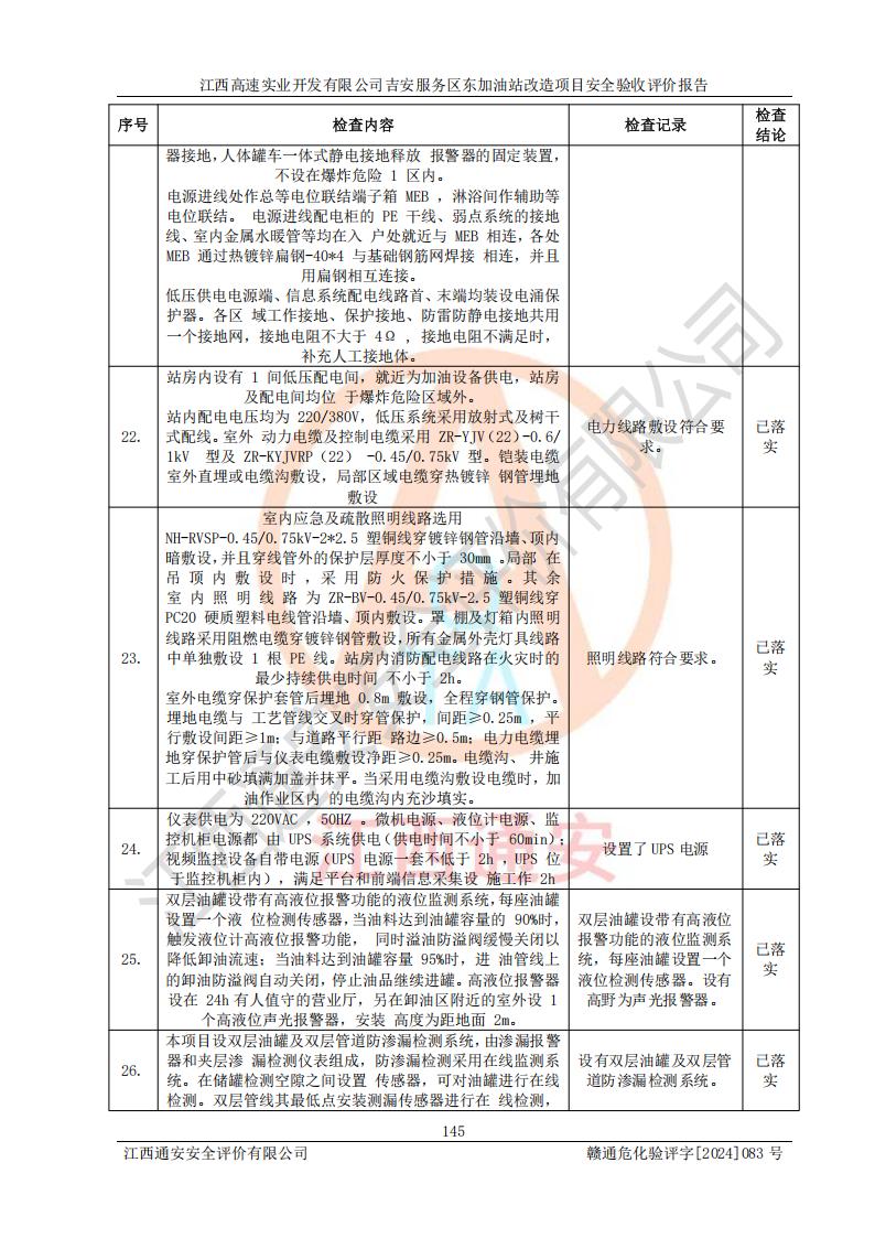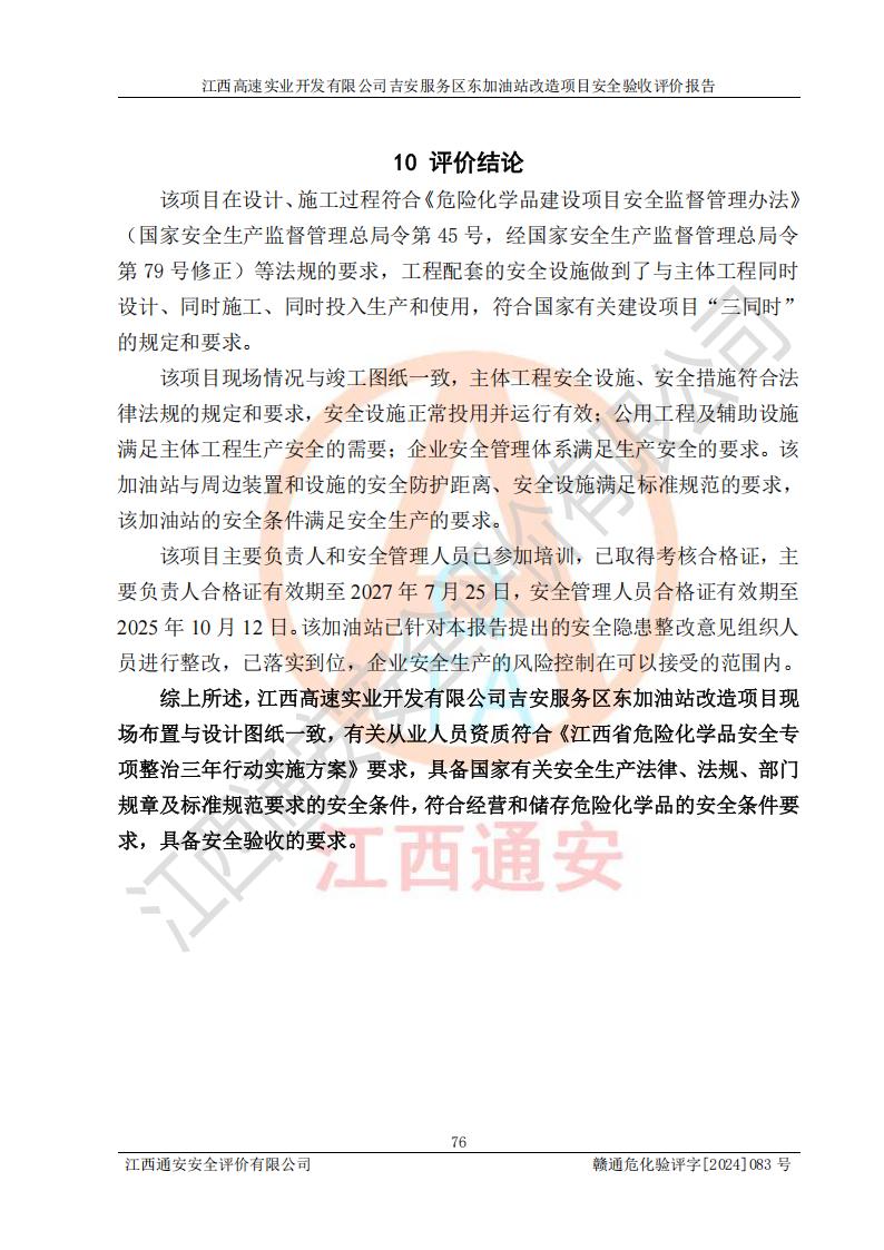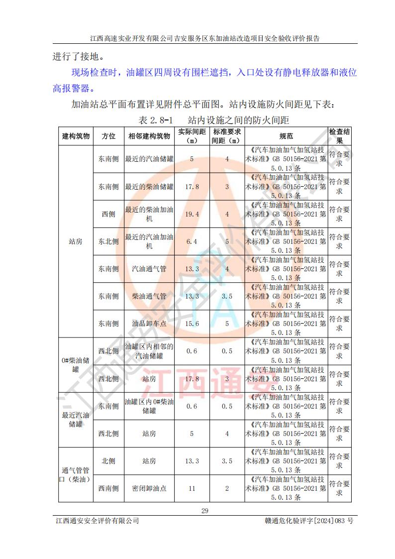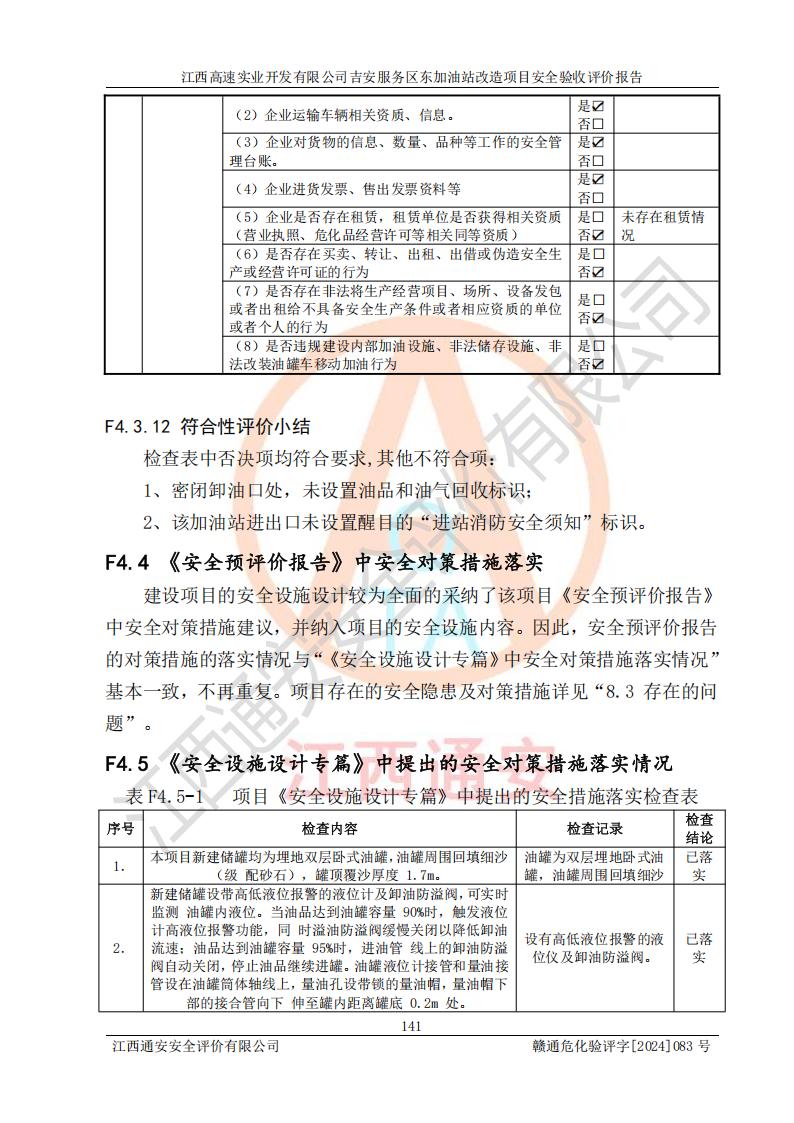 評價結論 | 江西高速實業(yè)開發(fā)有限公司吉安服務區(qū)東加油站改造項目現(xiàn)場布置與設計圖紙一致,有關從業(yè)人員資質符合《江西省危險化學品安全專項整治三年行動實施方案》要求,具備**有關安全生產(chǎn)法律、法規(guī)、部門規(guī)章及標準規(guī)范要求的安全條件,符合經(jīng)營和儲存危險化學品的安全條件要求,具備安全驗收的要求。 | |||