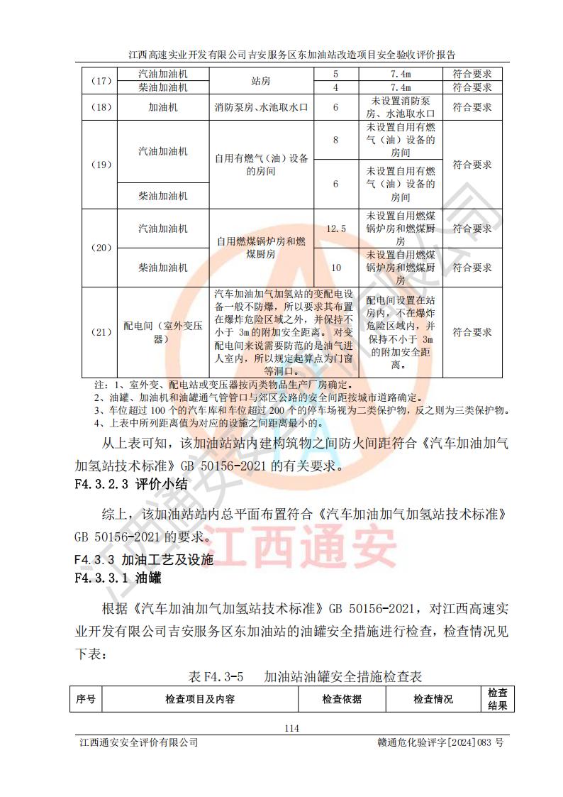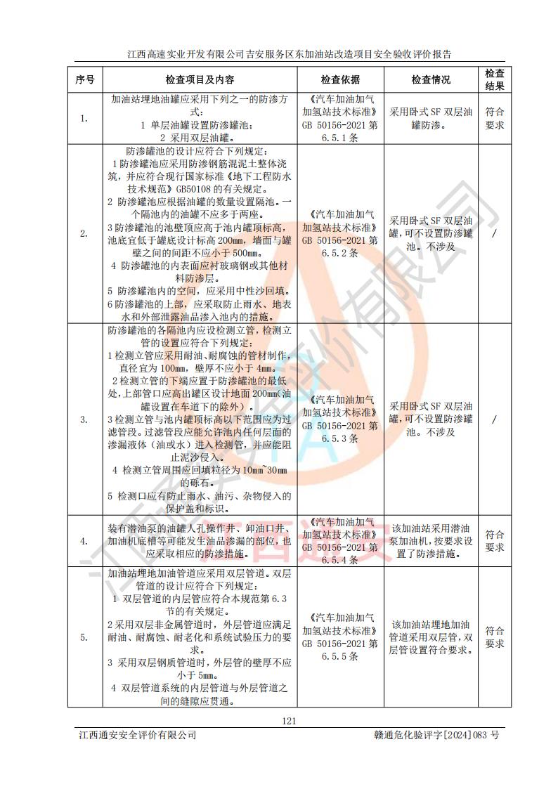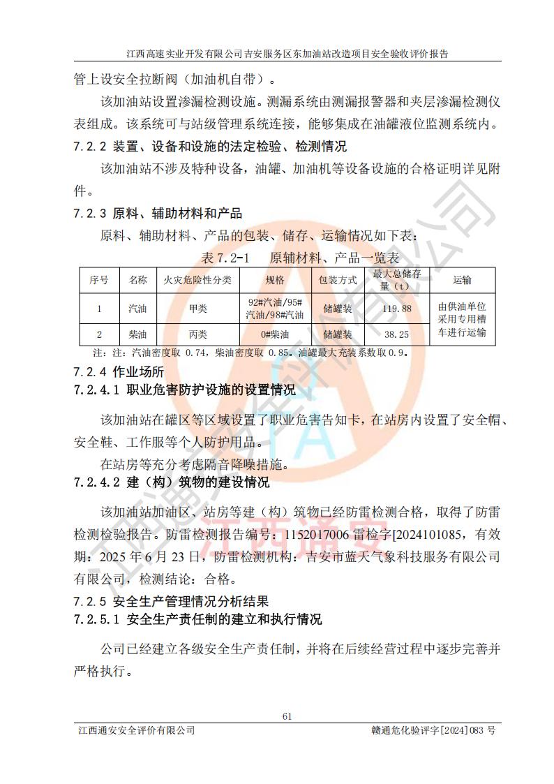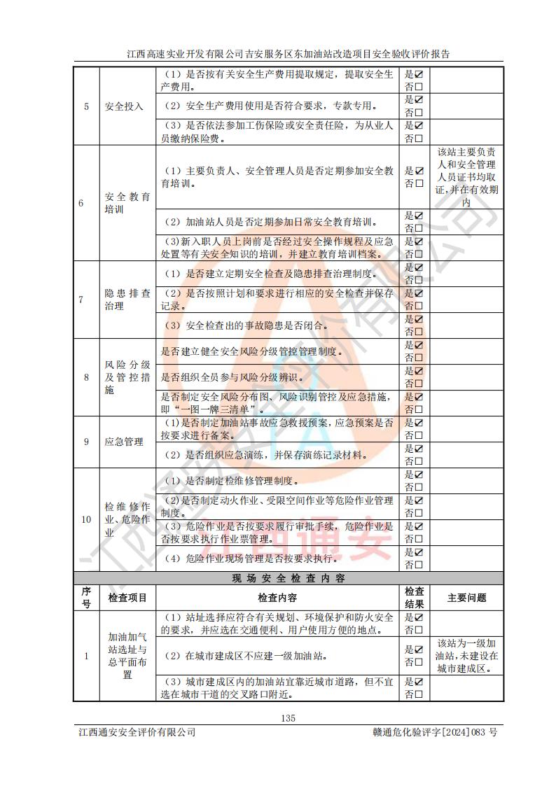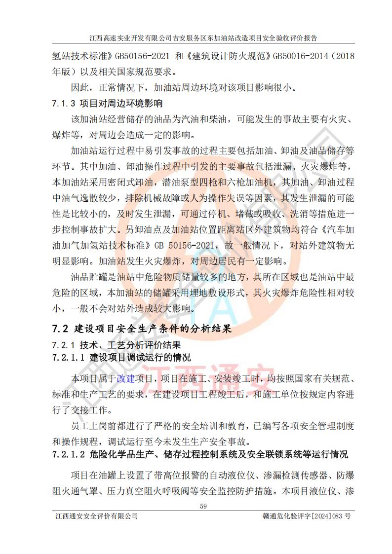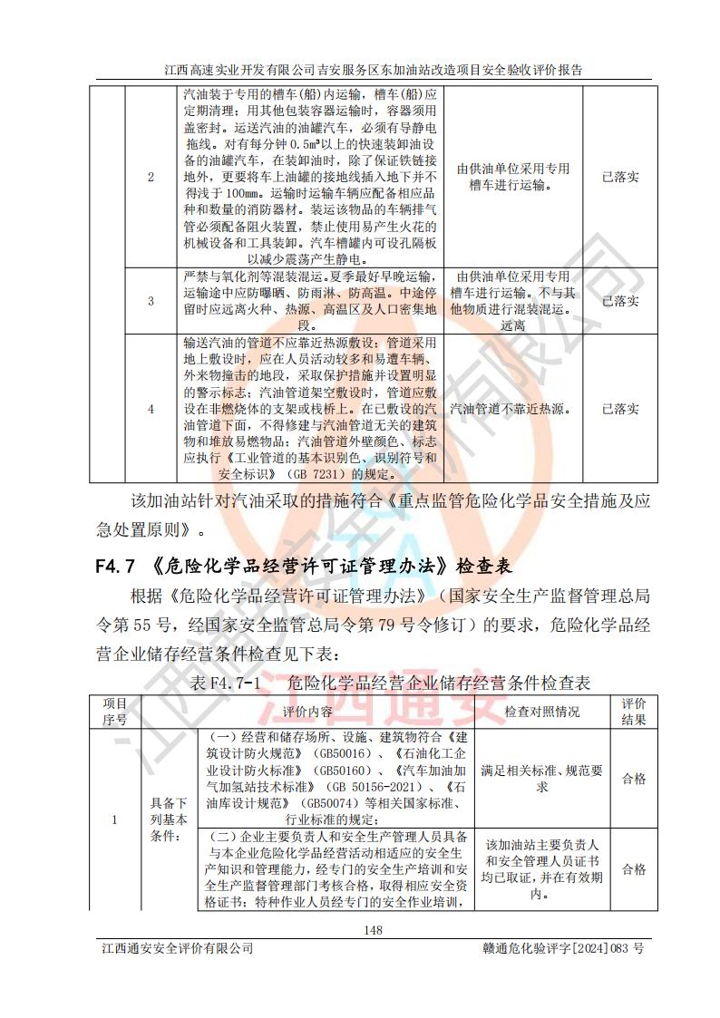 評價結論 | 江西高速實業(yè)開發(fā)有限公司吉安服務區(qū)東加油站改造項目現(xiàn)場布置與設計圖紙一致,有關從業(yè)人員資質符合《江西省危險化學品安全專項整治三年行動實施方案》要求,具備**有關安全生產(chǎn)法律、法規(guī)、部門規(guī)章及標準規(guī)范要求的安全條件,符合經(jīng)營和儲存危險化學品的安全條件要求,具備安全驗收的要求。 | |||