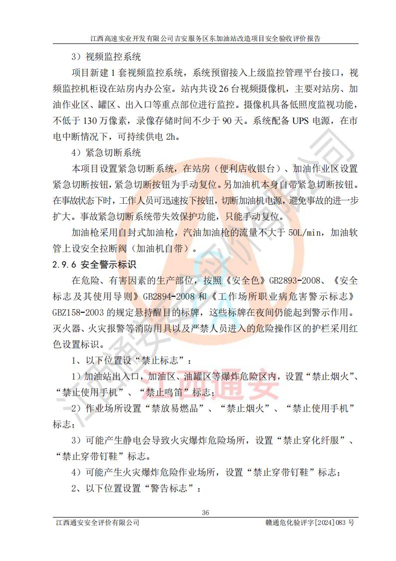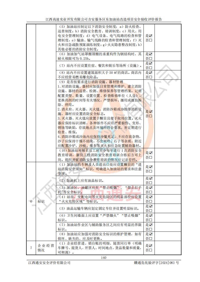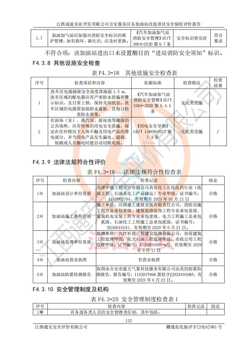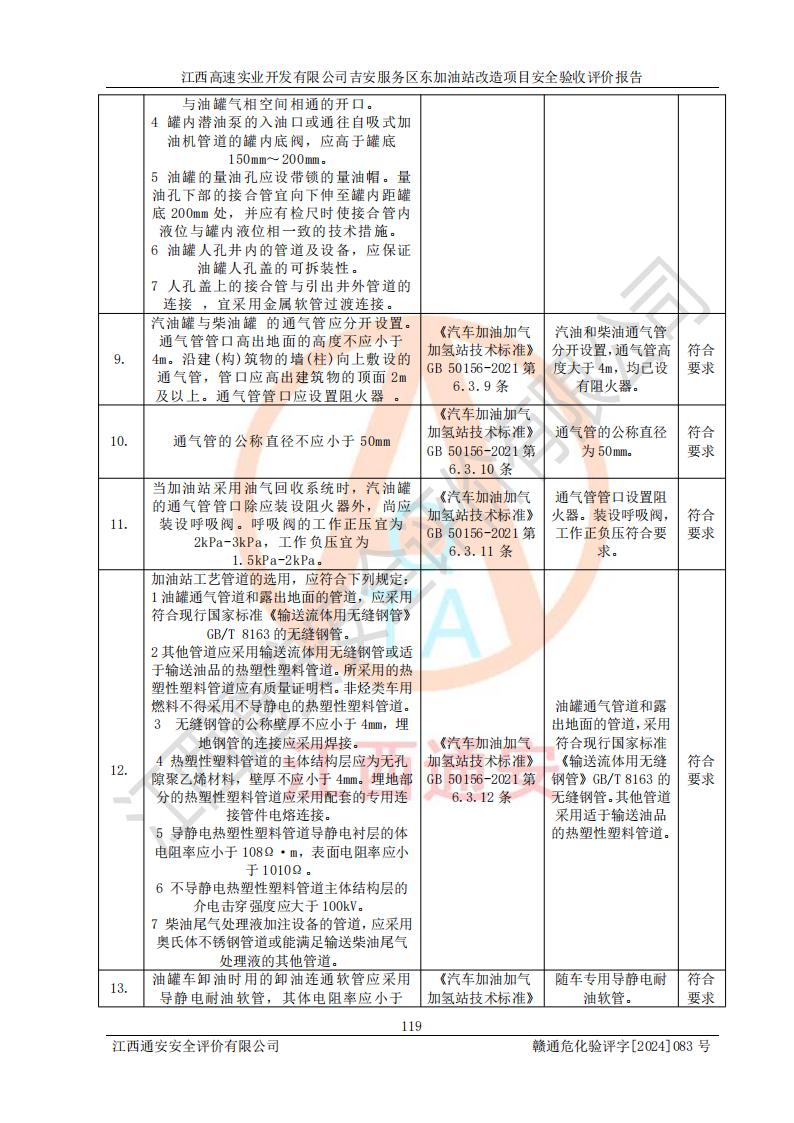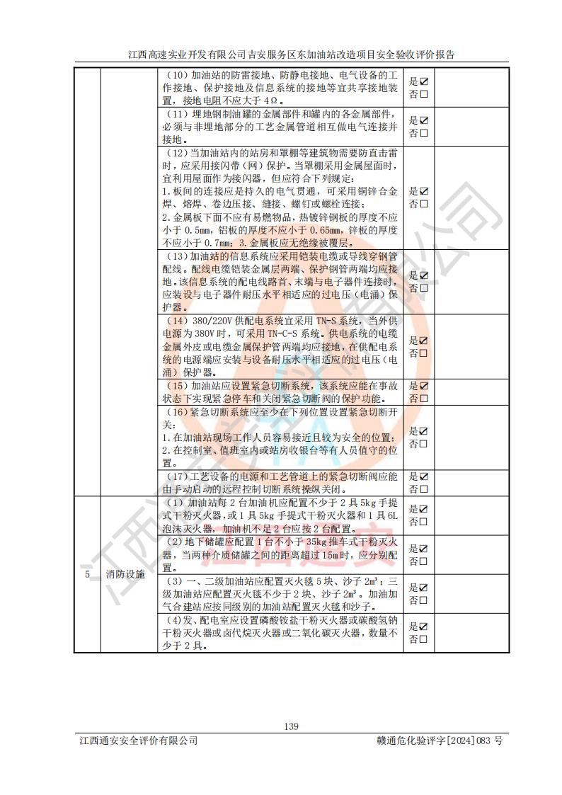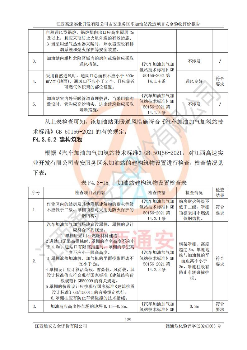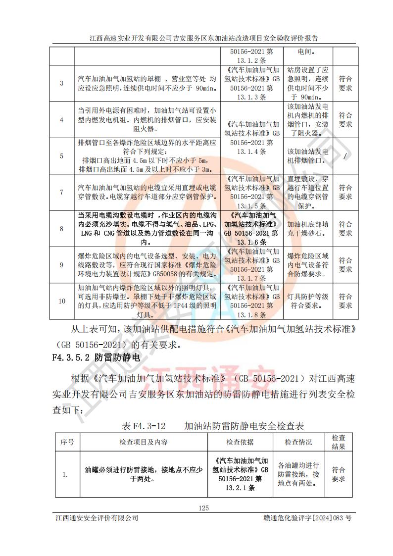 評價結論 | 江西高速實業(yè)開發(fā)有限公司吉安服務區(qū)東加油站改造項目現(xiàn)場布置與設計圖紙一致,有關從業(yè)人員資質符合《江西省危險化學品安全專項整治三年行動實施方案》要求,具備**有關安全生產(chǎn)法律、法規(guī)、部門規(guī)章及標準規(guī)范要求的安全條件,符合經(jīng)營和儲存危險化學品的安全條件要求,具備安全驗收的要求。 | |||