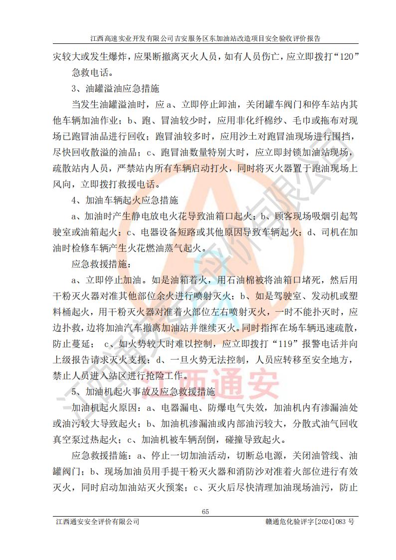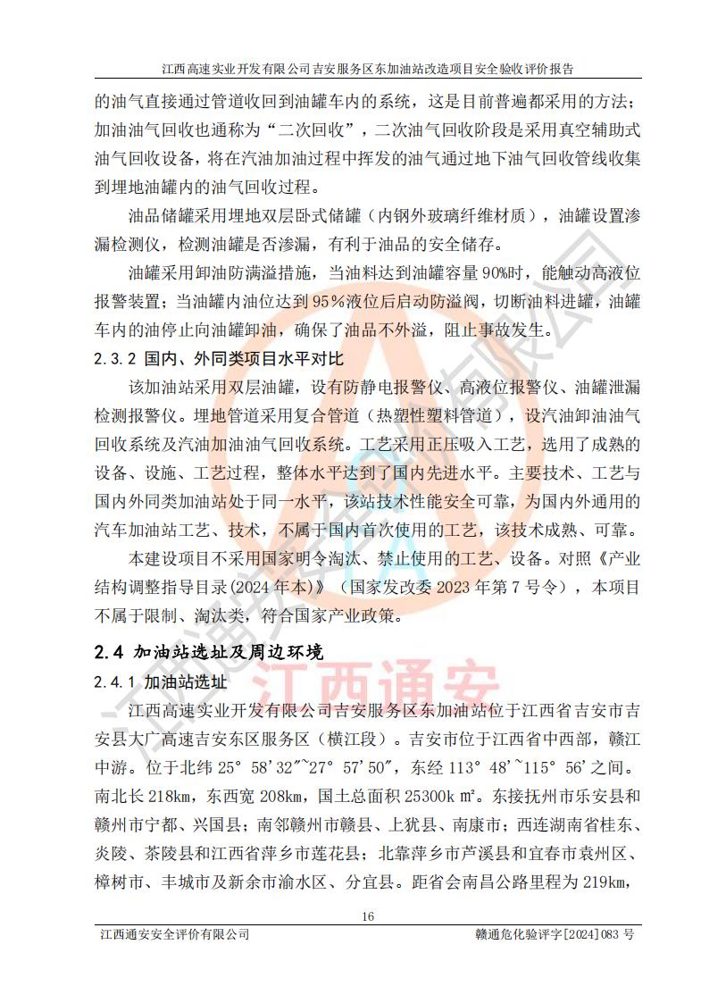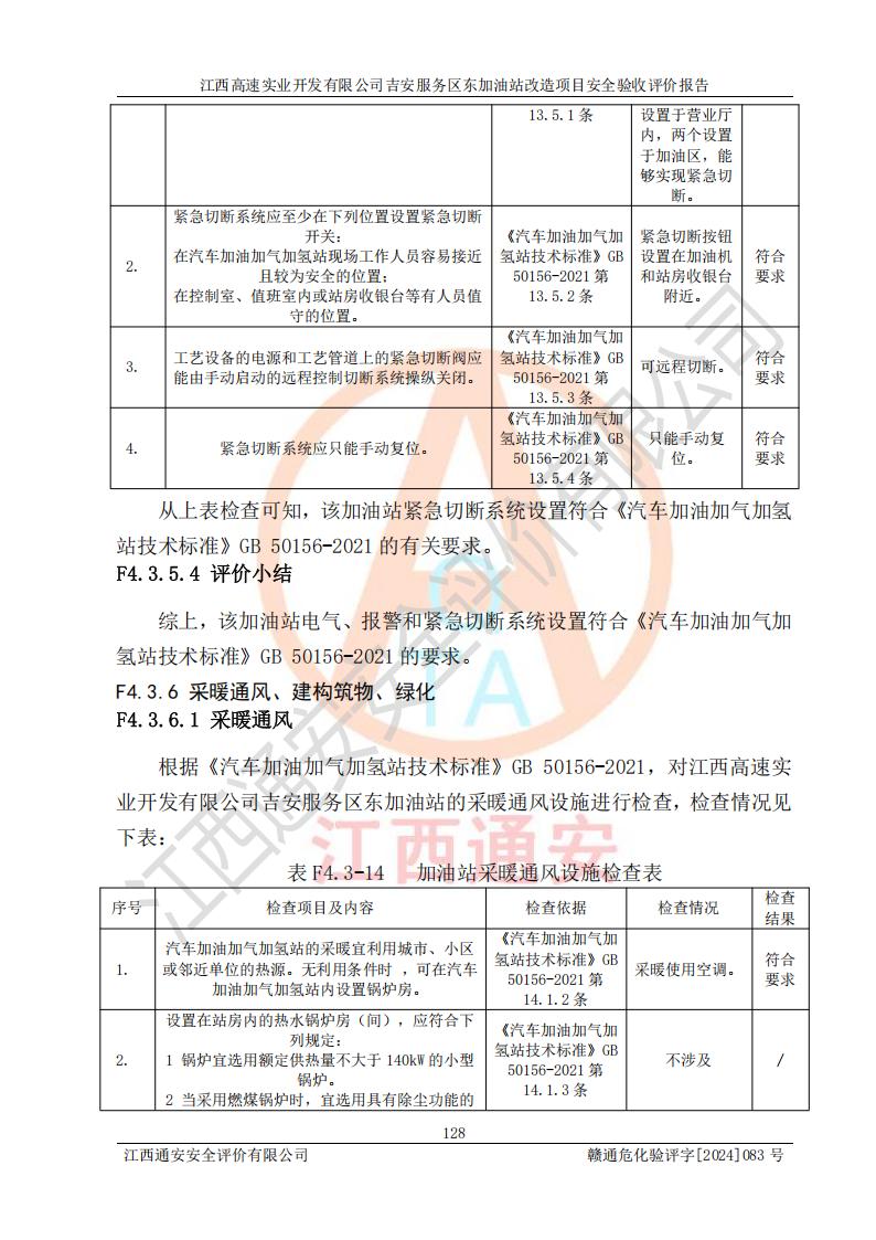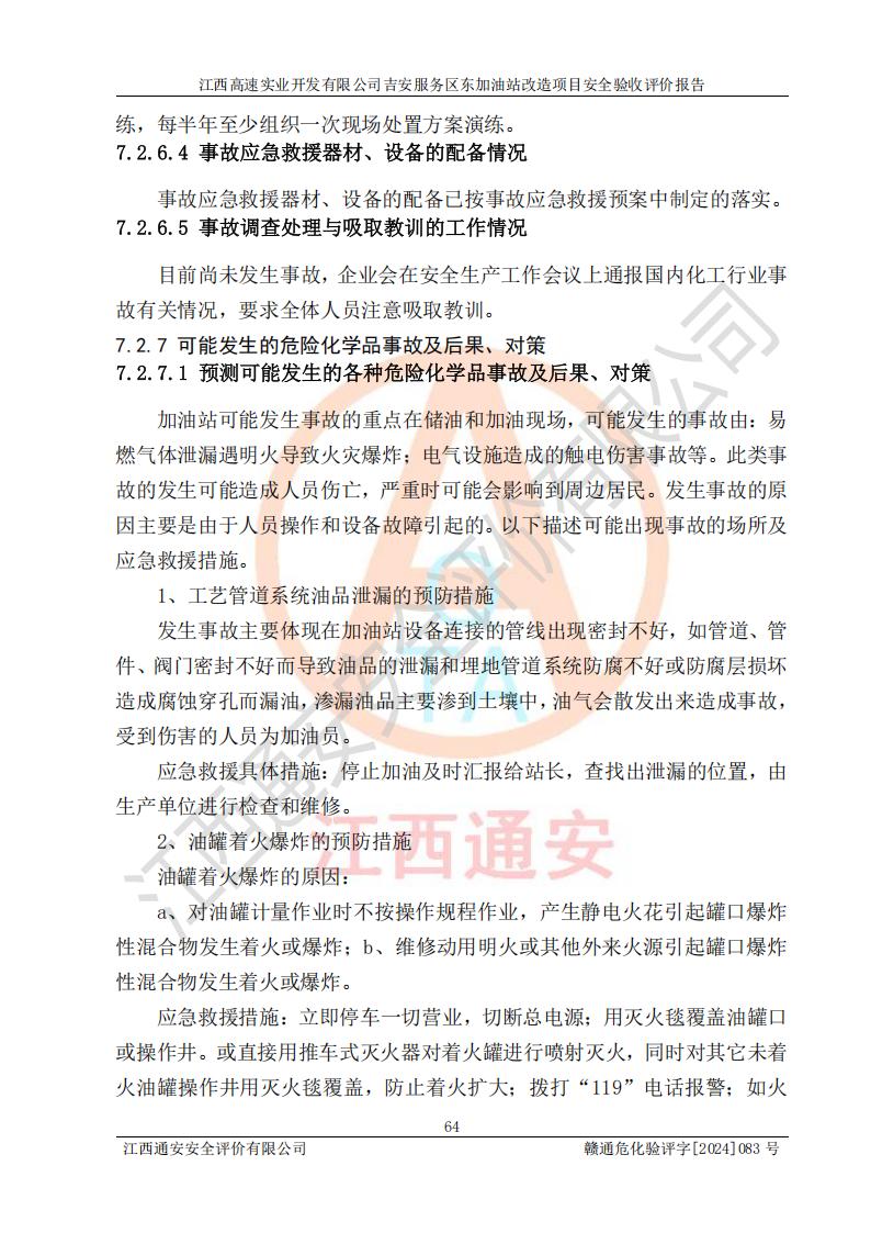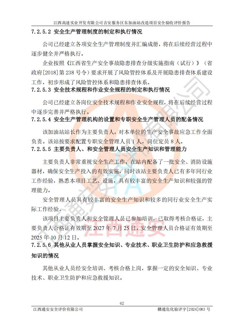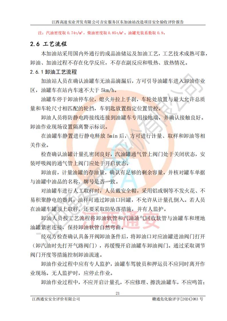 評價結論 | 江西高速實業(yè)開發(fā)有限公司吉安服務區(qū)東加油站改造項目現(xiàn)場布置與設計圖紙一致,有關從業(yè)人員資質符合《江西省危險化學品安全專項整治三年行動實施方案》要求,具備**有關安全生產(chǎn)法律、法規(guī)、部門規(guī)章及標準規(guī)范要求的安全條件,符合經(jīng)營和儲存危險化學品的安全條件要求,具備安全驗收的要求。 | |||