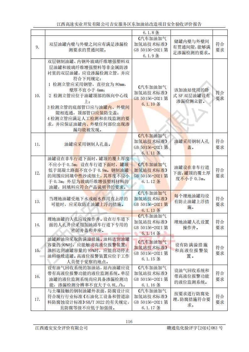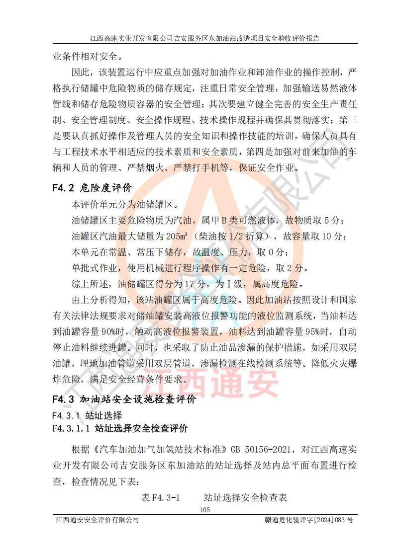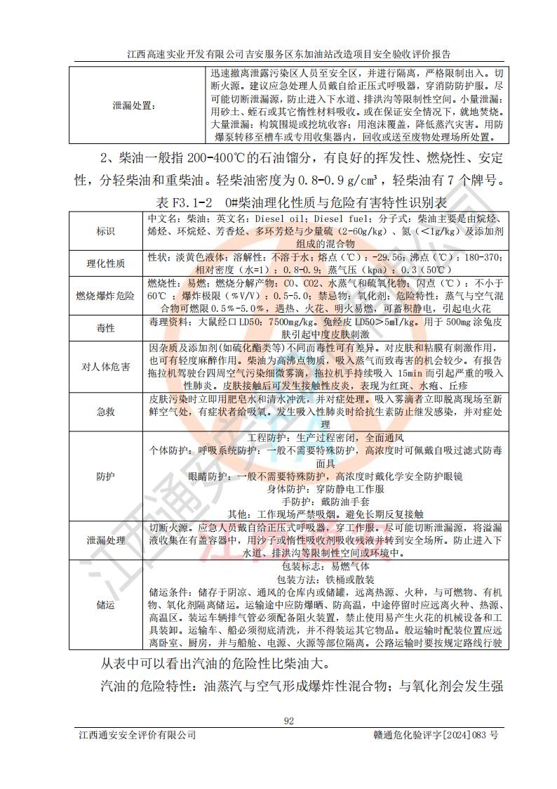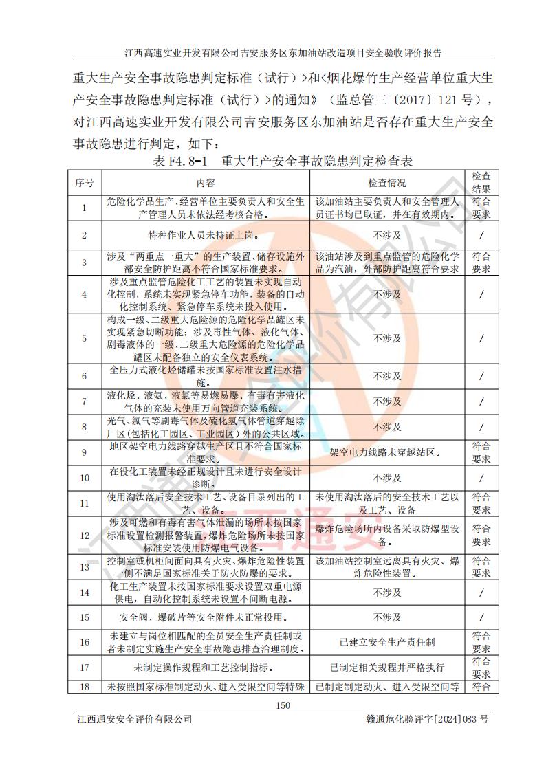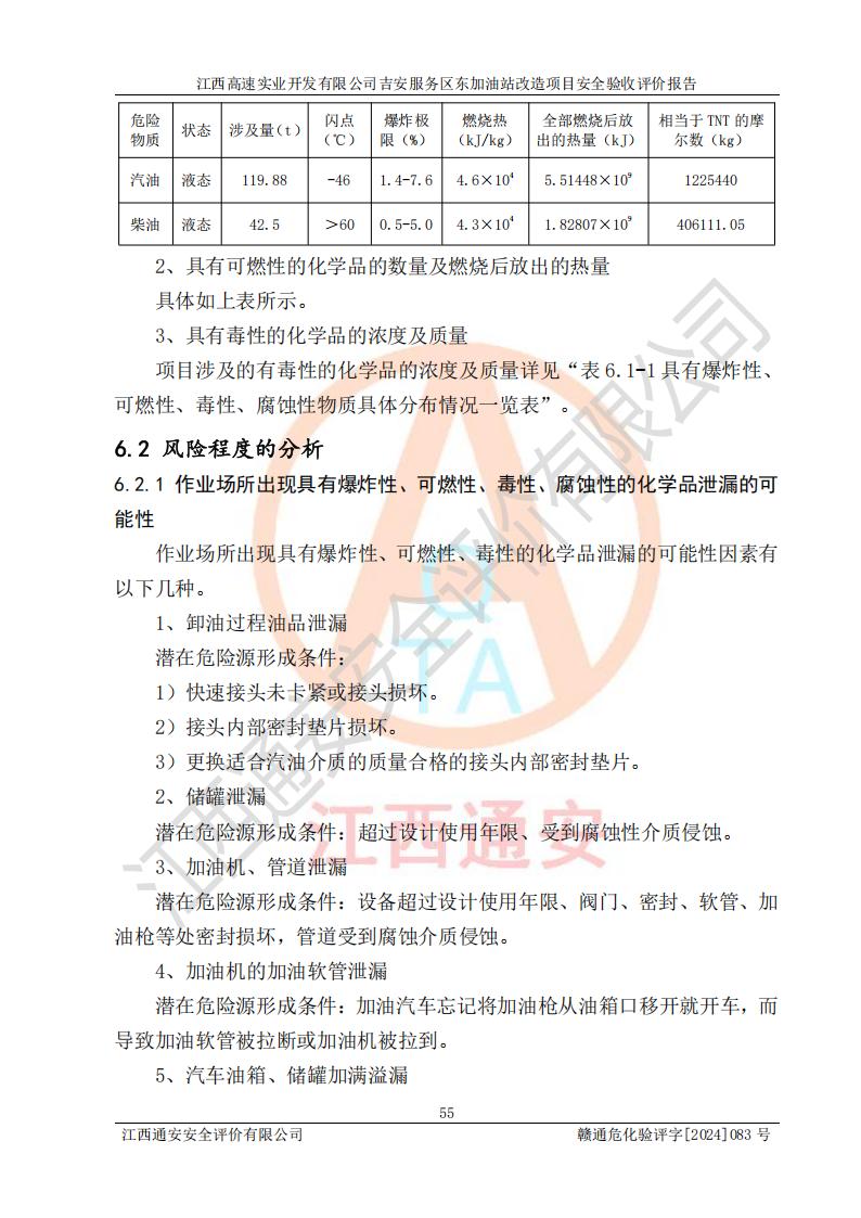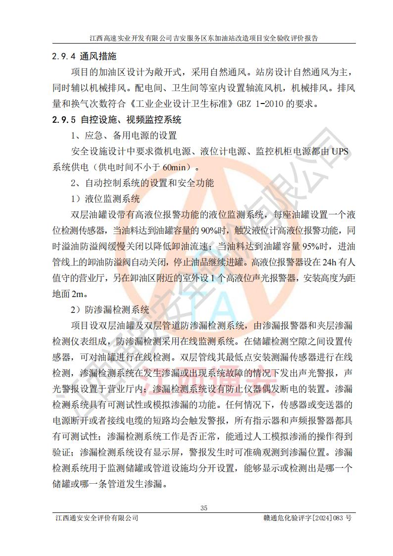評價結論 | 江西高速實業(yè)開發(fā)有限公司吉安服務區(qū)東加油站改造項目現(xiàn)場布置與設計圖紙一致,有關從業(yè)人員資質符合《江西省危險化學品安全專項整治三年行動實施方案》要求,具備**有關安全生產(chǎn)法律、法規(guī)、部門規(guī)章及標準規(guī)范要求的安全條件,符合經(jīng)營和儲存危險化學品的安全條件要求,具備安全驗收的要求。 | |||