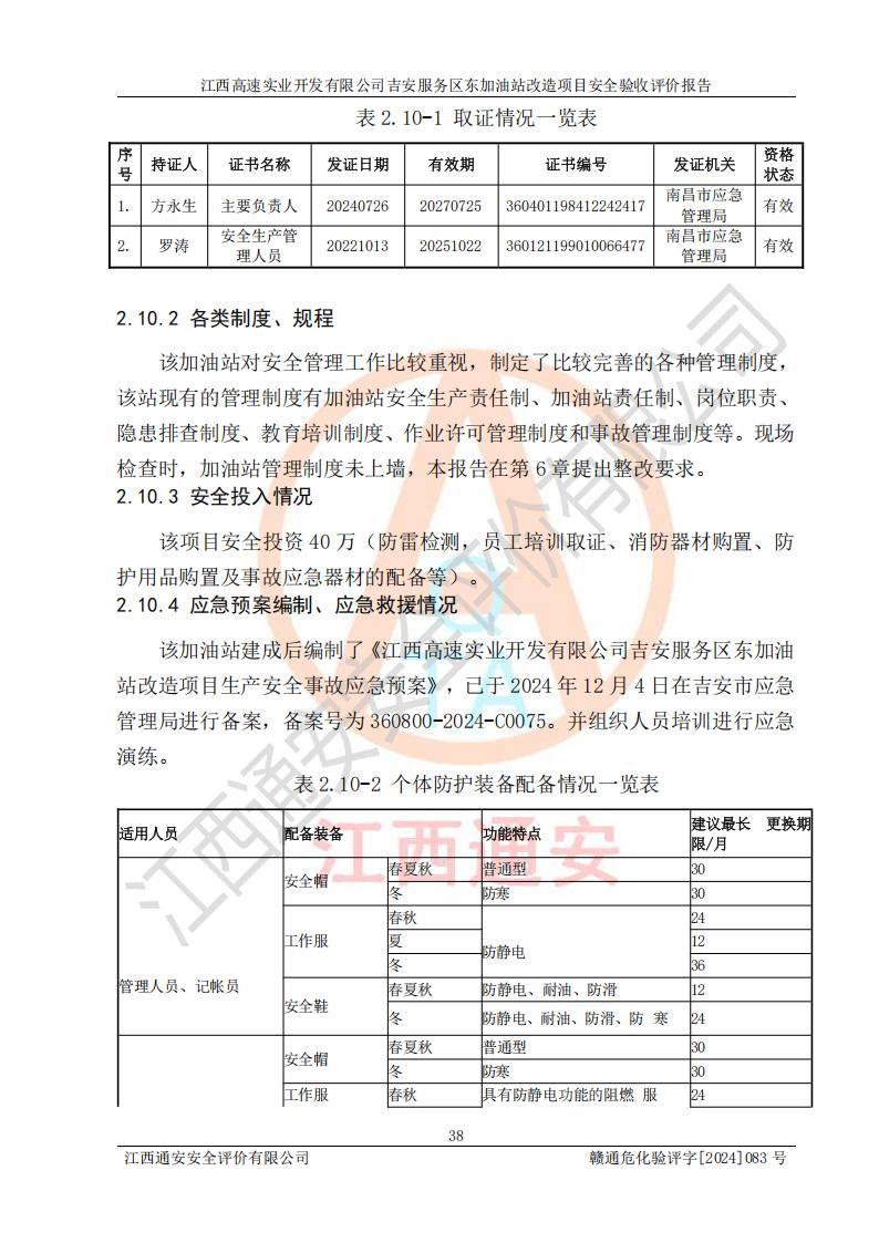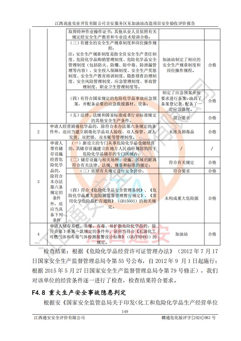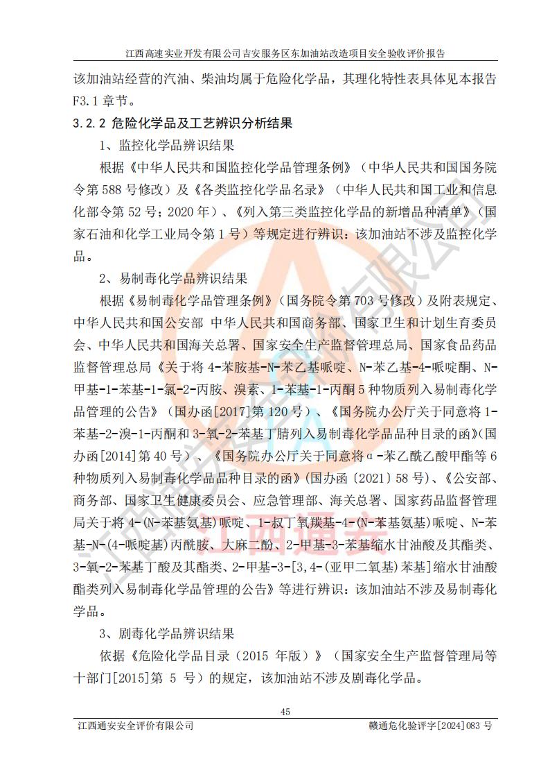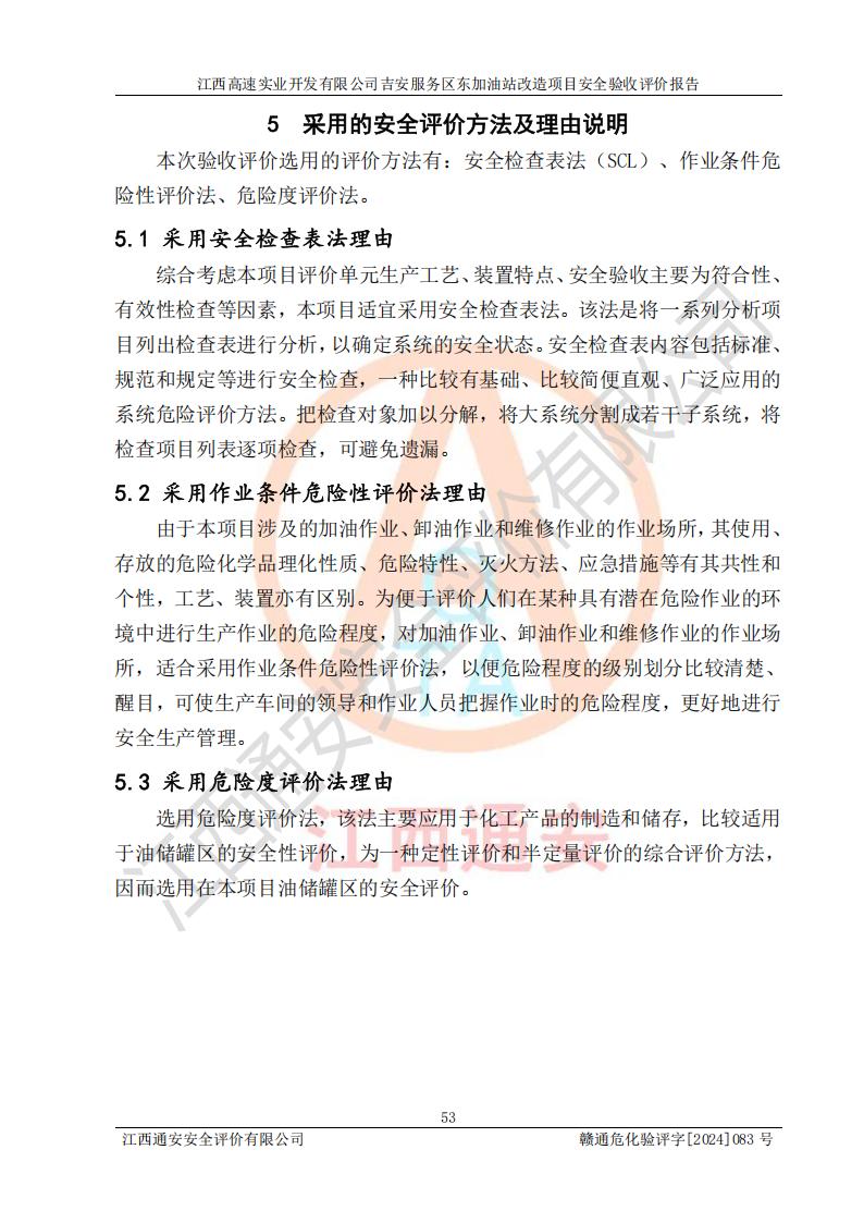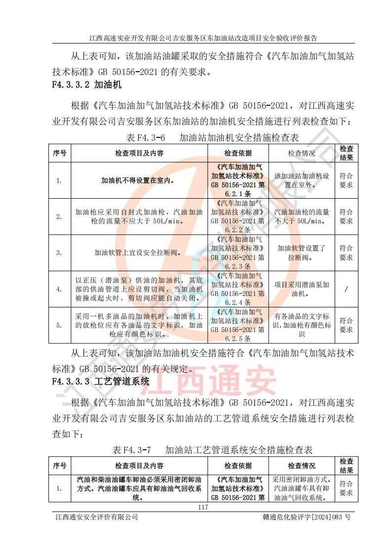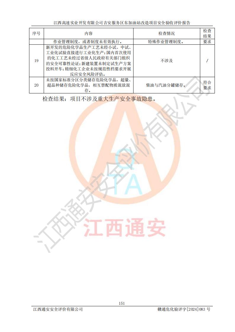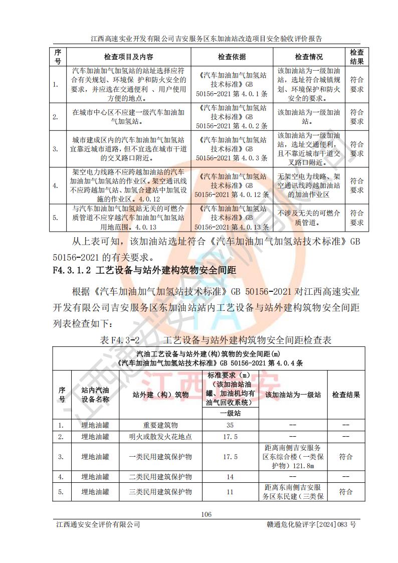 評價結論 | 江西高速實業(yè)開發(fā)有限公司吉安服務區(qū)東加油站改造項目現(xiàn)場布置與設計圖紙一致,有關從業(yè)人員資質符合《江西省危險化學品安全專項整治三年行動實施方案》要求,具備**有關安全生產(chǎn)法律、法規(guī)、部門規(guī)章及標準規(guī)范要求的安全條件,符合經(jīng)營和儲存危險化學品的安全條件要求,具備安全驗收的要求。 | |||