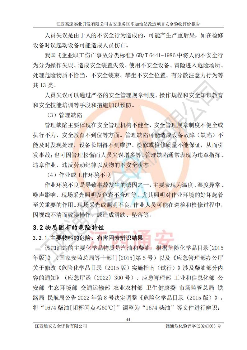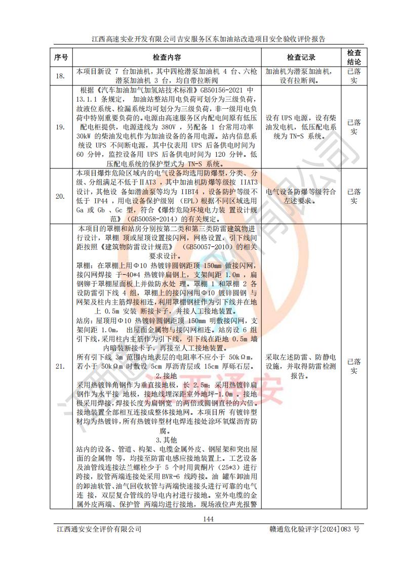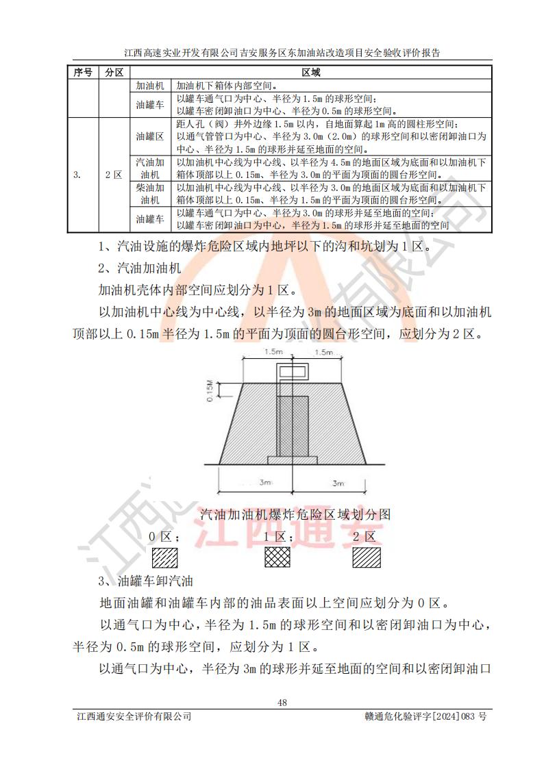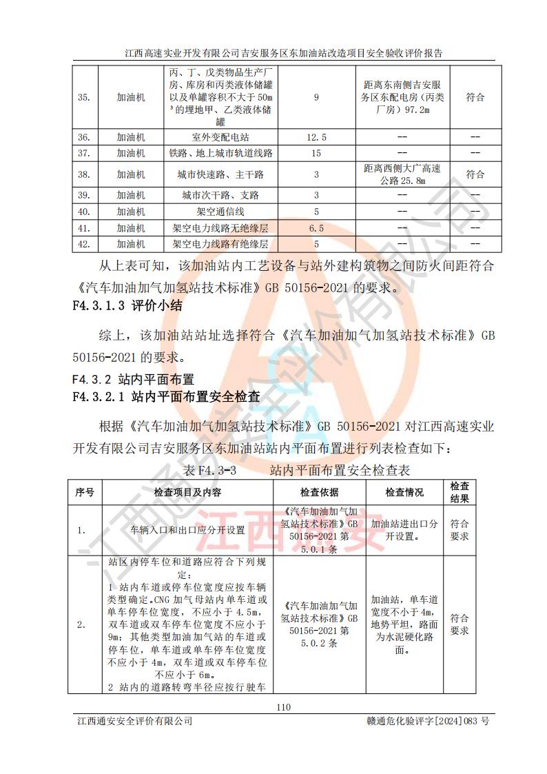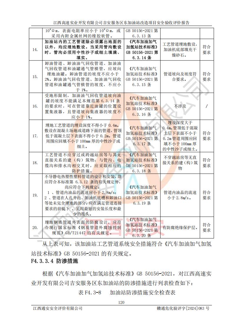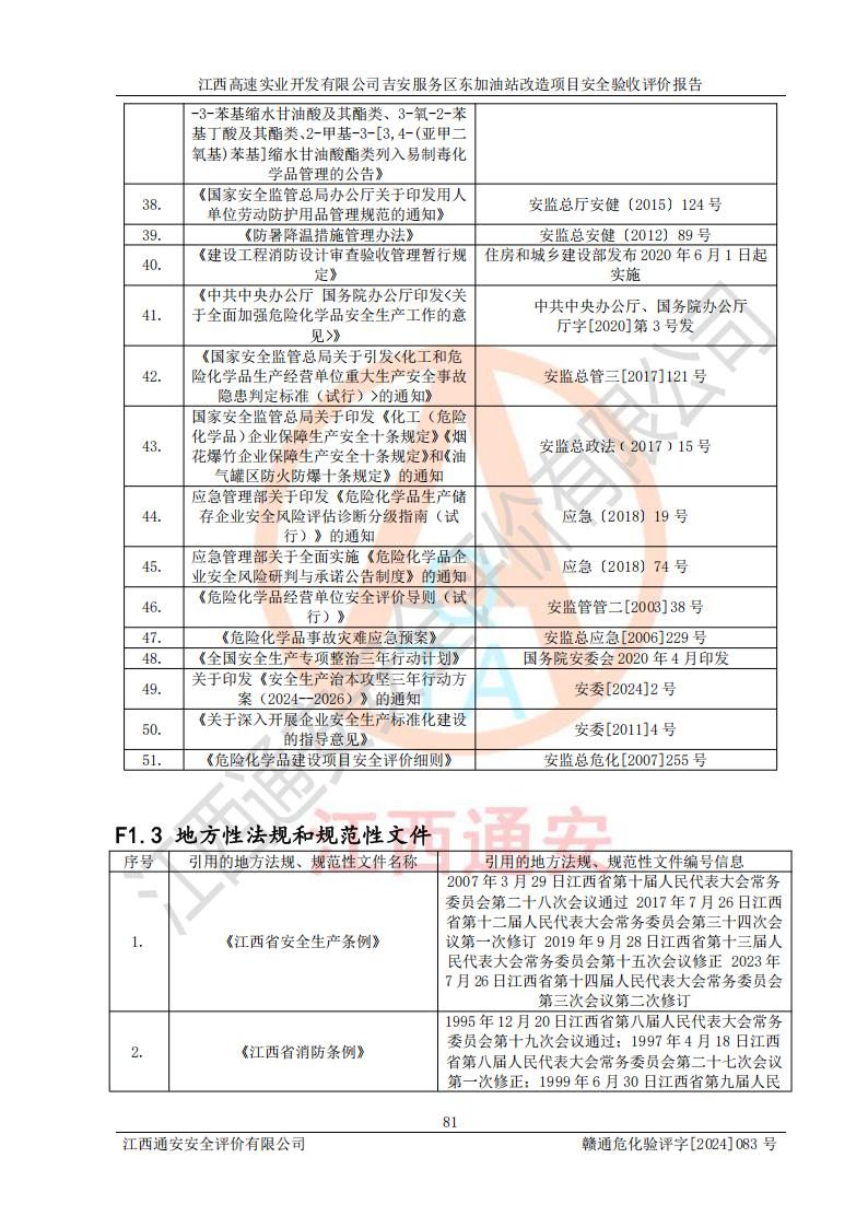 評價結論 | 江西高速實業(yè)開發(fā)有限公司吉安服務區(qū)東加油站改造項目現(xiàn)場布置與設計圖紙一致,有關從業(yè)人員資質符合《江西省危險化學品安全專項整治三年行動實施方案》要求,具備**有關安全生產(chǎn)法律、法規(guī)、部門規(guī)章及標準規(guī)范要求的安全條件,符合經(jīng)營和儲存危險化學品的安全條件要求,具備安全驗收的要求。 | |||