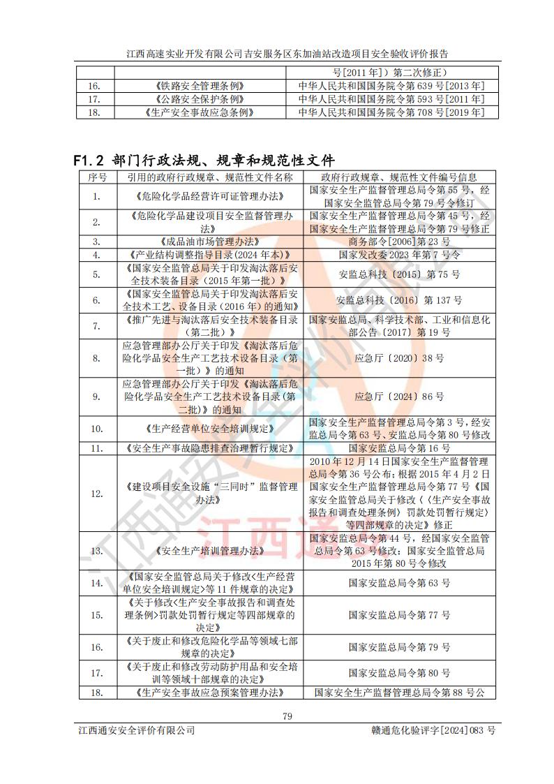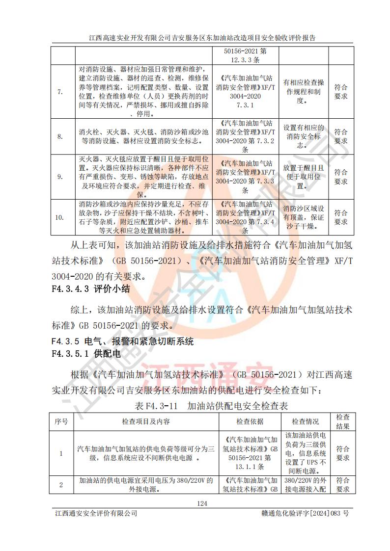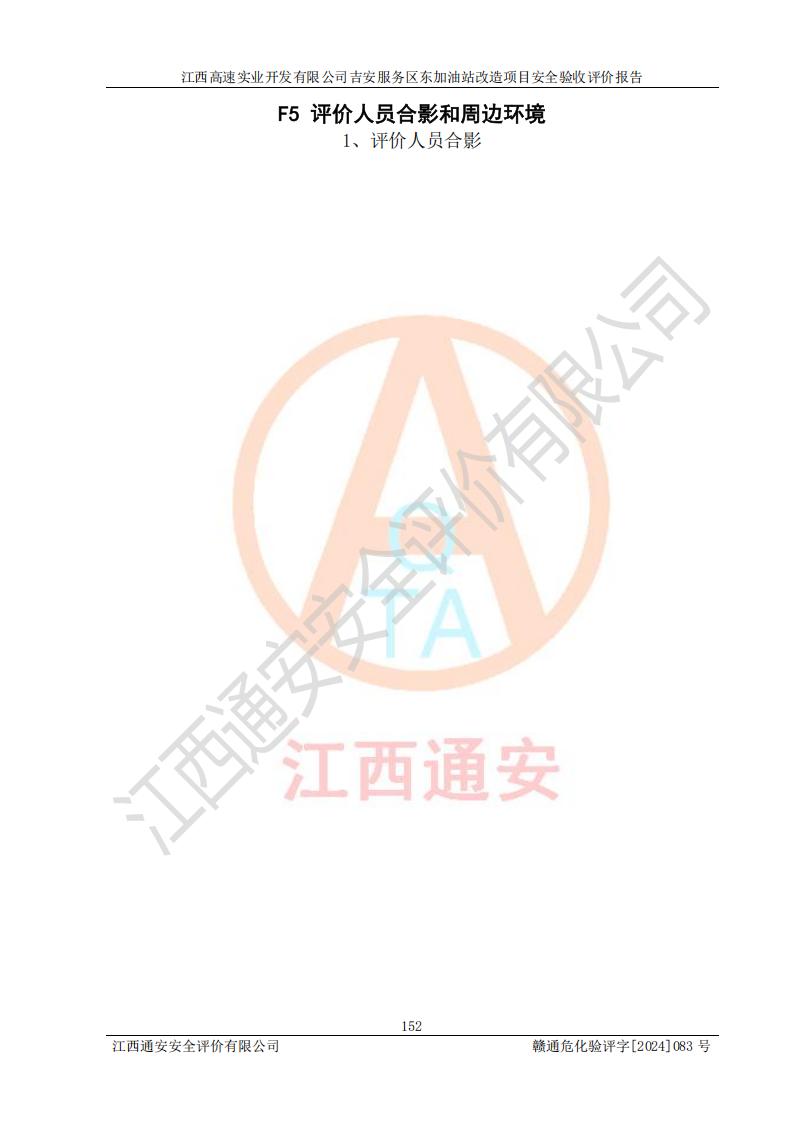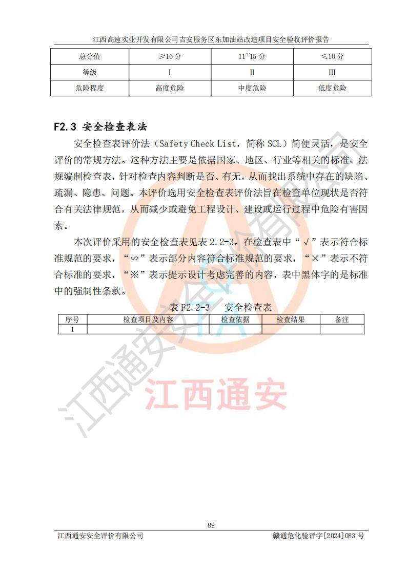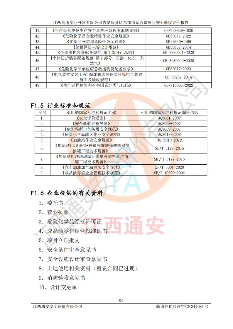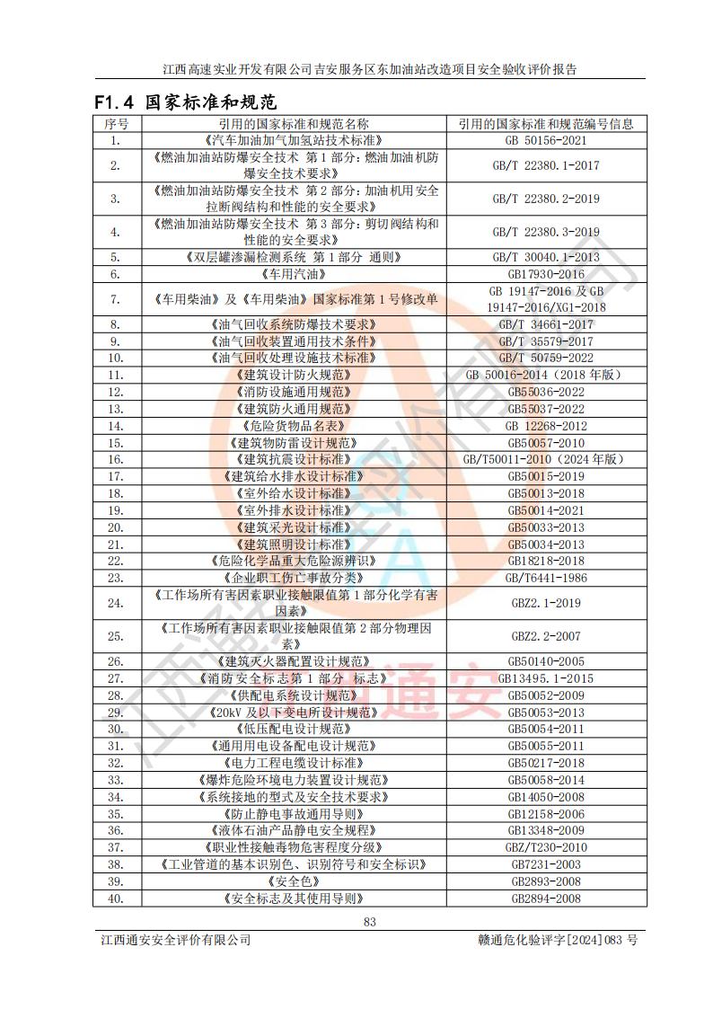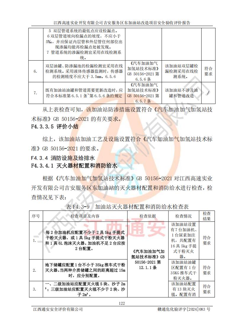 評價結論 | 江西高速實業(yè)開發(fā)有限公司吉安服務區(qū)東加油站改造項目現(xiàn)場布置與設計圖紙一致,有關從業(yè)人員資質符合《江西省危險化學品安全專項整治三年行動實施方案》要求,具備**有關安全生產(chǎn)法律、法規(guī)、部門規(guī)章及標準規(guī)范要求的安全條件,符合經(jīng)營和儲存危險化學品的安全條件要求,具備安全驗收的要求。 | |||