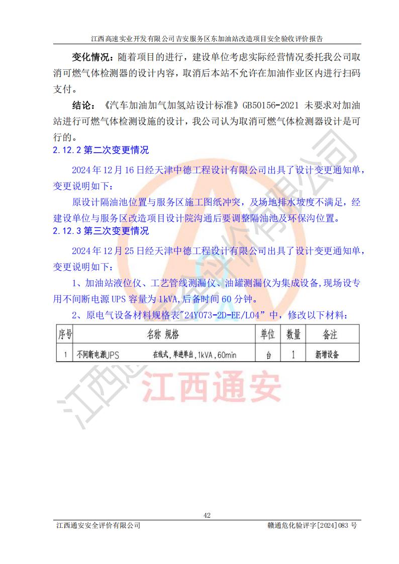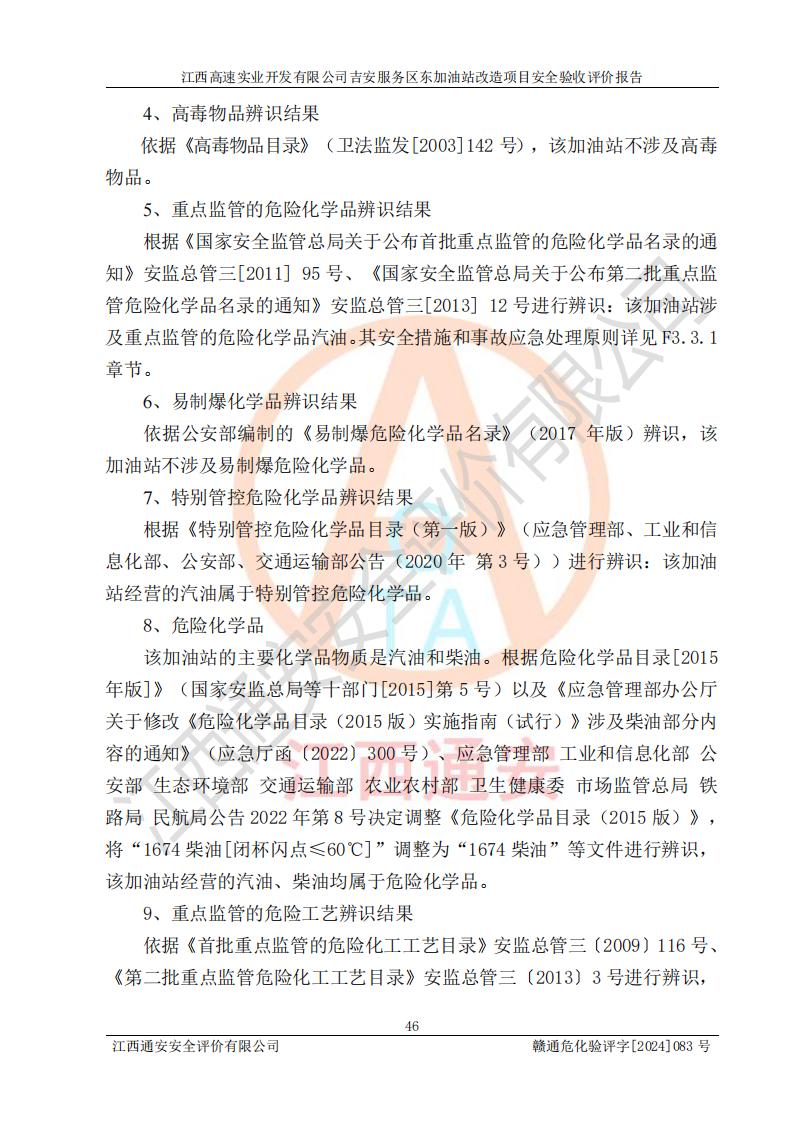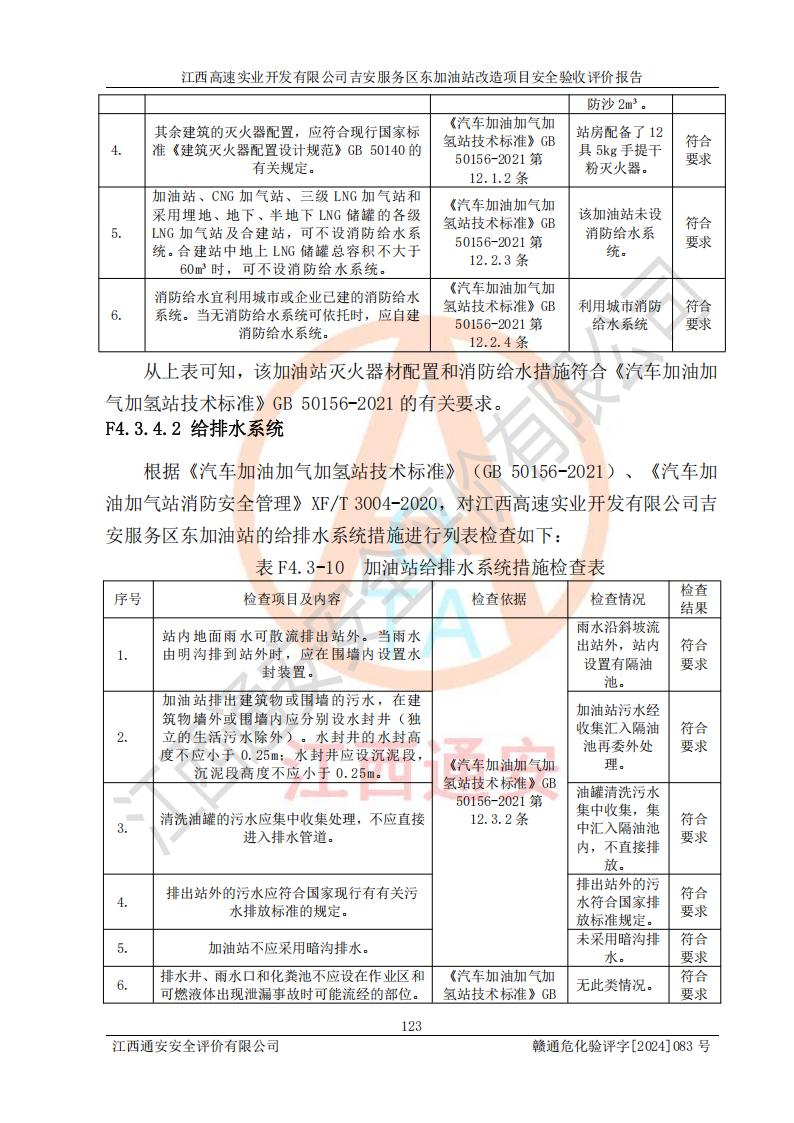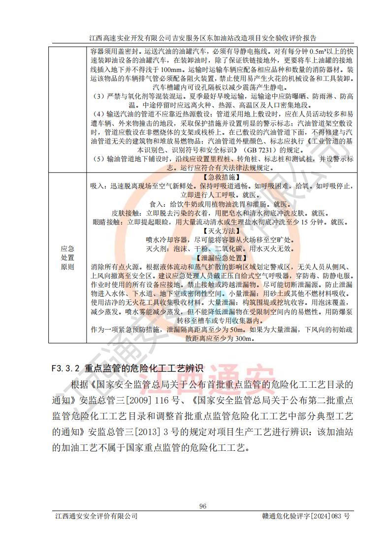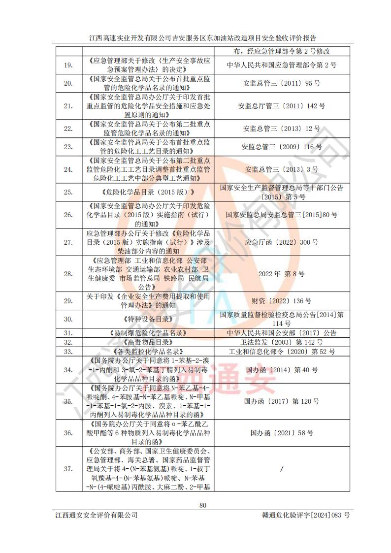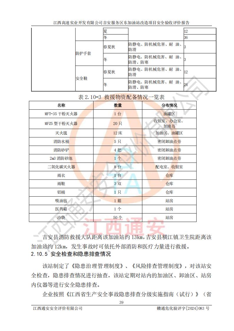 評價結論 | 江西高速實業(yè)開發(fā)有限公司吉安服務區(qū)東加油站改造項目現(xiàn)場布置與設計圖紙一致,有關從業(yè)人員資質符合《江西省危險化學品安全專項整治三年行動實施方案》要求,具備**有關安全生產(chǎn)法律、法規(guī)、部門規(guī)章及標準規(guī)范要求的安全條件,符合經(jīng)營和儲存危險化學品的安全條件要求,具備安全驗收的要求。 | |||