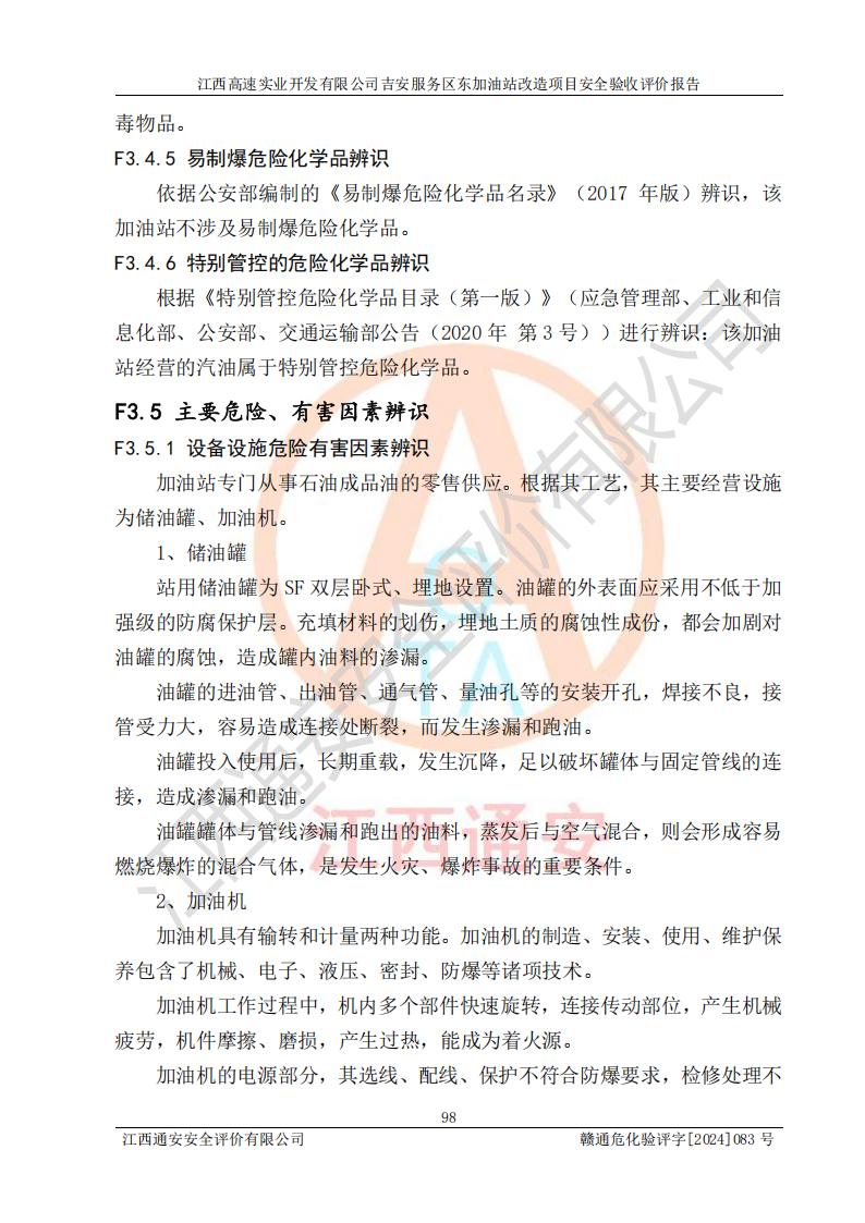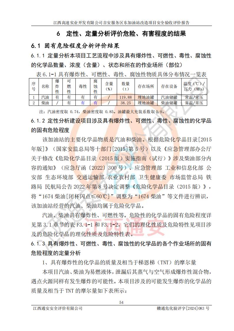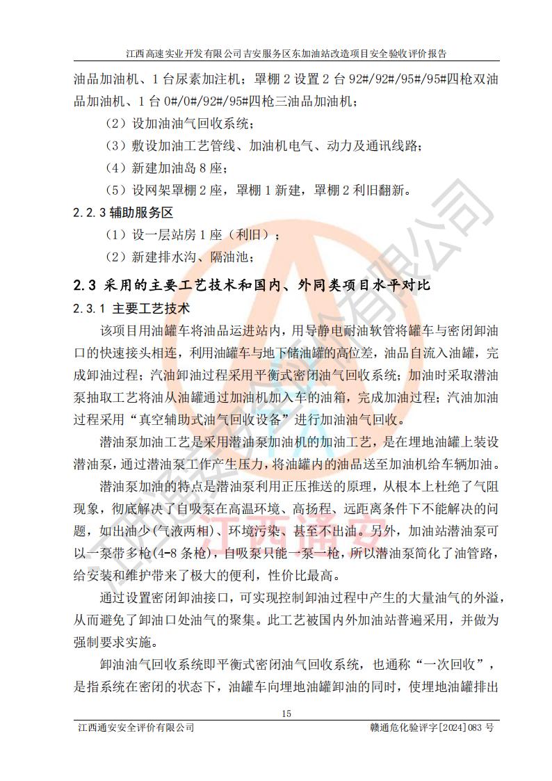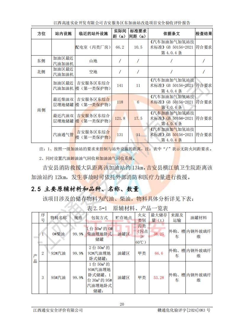 項目簡介 | 江西高速實業(yè)開發(fā)有限公司吉安服務區(qū)東加油站成立于2021年9月22日,企業(yè)類型:其他有限責任公司分公司,法定**人余勇。 江西高速實業(yè)開發(fā)有限公司吉安服務區(qū)東加油站2024年8月30日取得由吉安縣發(fā)展和改革委員會出具的《江西省企業(yè)投資項目備案通知書》,項目統(tǒng)一代碼為:2408-360821-04-01-216450,項目名稱:江西高速實業(yè)開發(fā)有限公司吉安服務區(qū)東加油站改造項目。 江西高速實業(yè)開發(fā)有限公司吉安服務區(qū)東加油站位于江西省吉安市吉安縣大廣高速吉安東區(qū)服務區(qū)(橫江段),加油站租賃江西贛粵實業(yè)發(fā)展有限公司用地。該加油站設有的1座503的0#柴油埋地臥式雙層貯罐、2座50m3的92#汽油埋地臥式油罐、1座50m3的95#汽油埋地臥式雙層油罐、1座30m3的95#汽油埋地臥式雙層油罐;*大存儲量為230m3,實際油品折算總容量為205m3(柴油折半),屬于**加油站。 江西高速實業(yè)開發(fā)有限公司吉安服務區(qū)東加油站改造項目2024年9月委托山東新安達工程咨詢有限公司編制《江西高速實業(yè)開發(fā)有限公司吉安服務區(qū)東加油站改造項目安全條件評價報告》,并于2024年9月13日取得《危險化學品建設項目安全條件備案告知意見書》(吉市?;椖堪矖l審字[2024]8號)。 江西高速實業(yè)開發(fā)有限公司吉安服務區(qū)東加油站改造項目2024年11月委托天津中德工程設計有限公司編制《江西高速實業(yè)開發(fā)有限公司吉安服務區(qū)東加油站改造項目安全設施設計專篇》,并于2022年11月14日取得《危險化學品建設項目安全設施設計審查意見書》(吉市?;椖堪苍O審字[2024]30號)。 項目生產(chǎn)過程中涉及的危險化學品有:汽油、柴油等。 項目各生產(chǎn)和儲存單元均未構成危險化學品重大危險源。 | |||