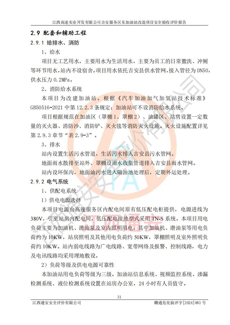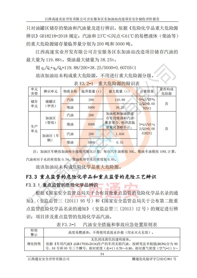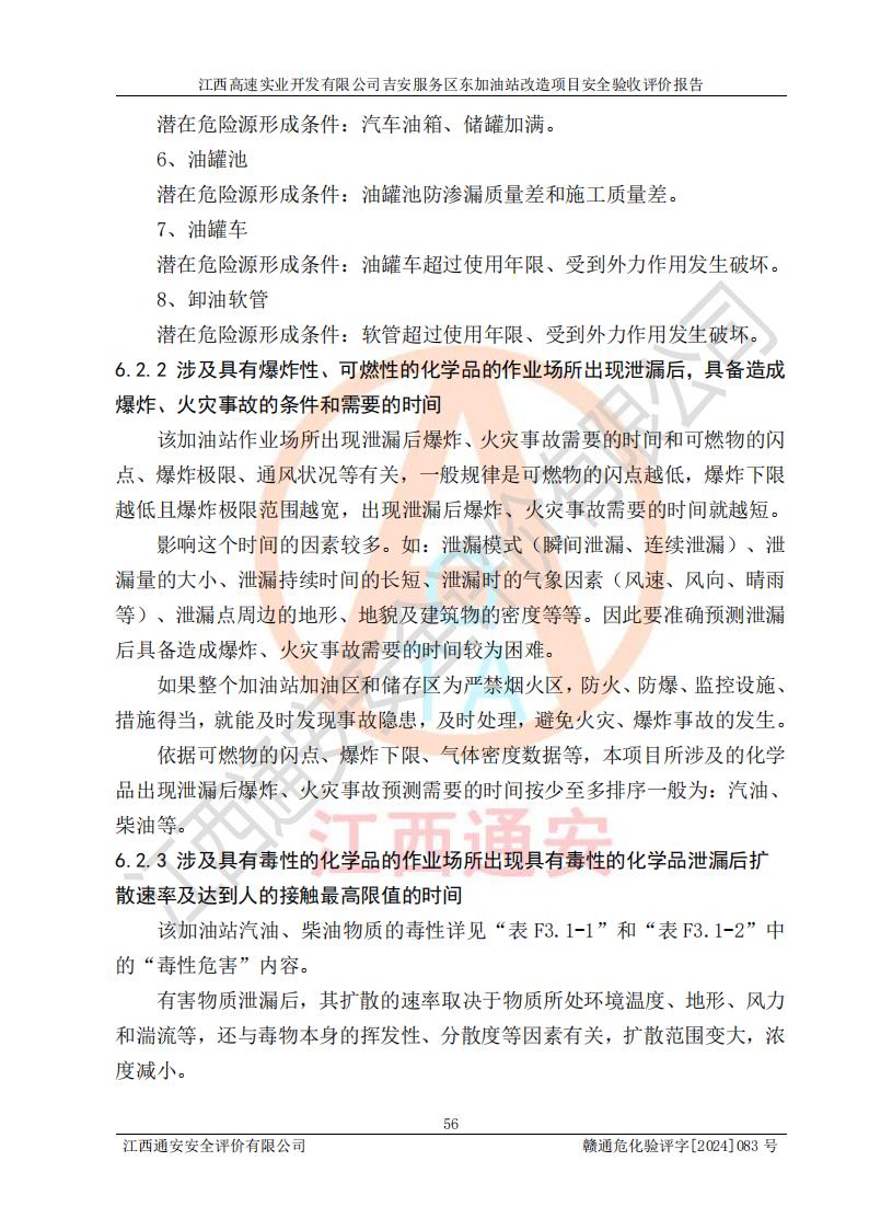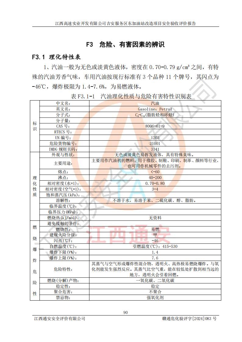 項目簡介 | 江西高速實業(yè)開發(fā)有限公司吉安服務區(qū)東加油站成立于2021年9月22日,企業(yè)類型:其他有限責任公司分公司,法定**人余勇。 江西高速實業(yè)開發(fā)有限公司吉安服務區(qū)東加油站2024年8月30日取得由吉安縣發(fā)展和改革委員會出具的《江西省企業(yè)投資項目備案通知書》,項目統(tǒng)一代碼為:2408-360821-04-01-216450,項目名稱:江西高速實業(yè)開發(fā)有限公司吉安服務區(qū)東加油站改造項目。 江西高速實業(yè)開發(fā)有限公司吉安服務區(qū)東加油站位于江西省吉安市吉安縣大廣高速吉安東區(qū)服務區(qū)(橫江段),加油站租賃江西贛粵實業(yè)發(fā)展有限公司用地。該加油站設有的1座503的0#柴油埋地臥式雙層貯罐、2座50m3的92#汽油埋地臥式油罐、1座50m3的95#汽油埋地臥式雙層油罐、1座30m3的95#汽油埋地臥式雙層油罐;*大存儲量為230m3,實際油品折算總容量為205m3(柴油折半),屬于**加油站。 江西高速實業(yè)開發(fā)有限公司吉安服務區(qū)東加油站改造項目2024年9月委托山東新安達工程咨詢有限公司編制《江西高速實業(yè)開發(fā)有限公司吉安服務區(qū)東加油站改造項目安全條件評價報告》,并于2024年9月13日取得《危險化學品建設項目安全條件備案告知意見書》(吉市?;椖堪矖l審字[2024]8號)。 江西高速實業(yè)開發(fā)有限公司吉安服務區(qū)東加油站改造項目2024年11月委托天津中德工程設計有限公司編制《江西高速實業(yè)開發(fā)有限公司吉安服務區(qū)東加油站改造項目安全設施設計專篇》,并于2022年11月14日取得《危險化學品建設項目安全設施設計審查意見書》(吉市?;椖堪苍O審字[2024]30號)。 項目生產(chǎn)過程中涉及的危險化學品有:汽油、柴油等。 項目各生產(chǎn)和儲存單元均未構成危險化學品重大危險源。 | |||