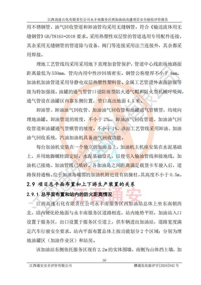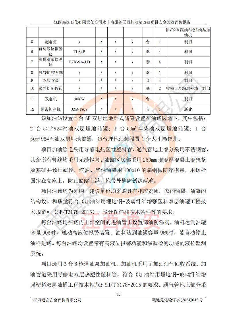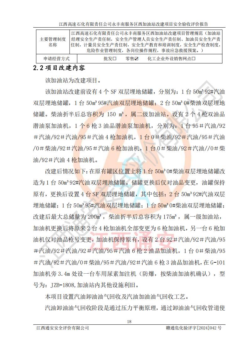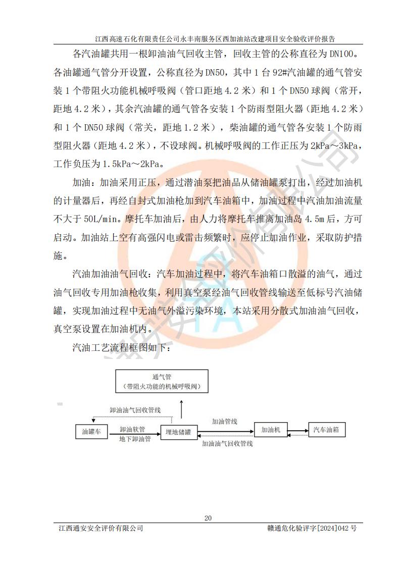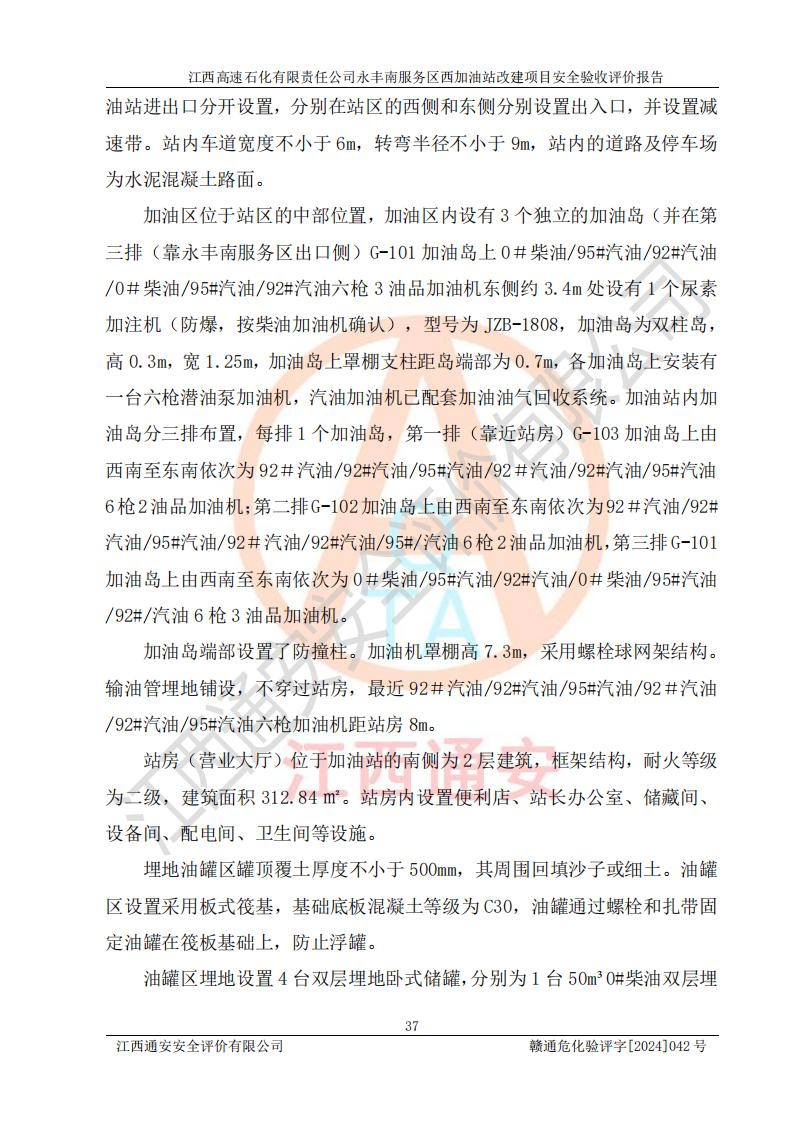 項(xiàng)目簡介 | 江西高速石化有限責(zé)任公司永豐南服務(wù)區(qū)西加油站成立于2018年1月5日,類型:其他有限責(zé)任公司分公司;負(fù)責(zé)人:陳志斌;經(jīng)營場所為江西省吉安市永豐縣昌寧高速永豐南服務(wù)區(qū)西加油站。該公司營業(yè)執(zhí)照經(jīng)營范圍:石油、石油化工(**期至2020年11月22日)、化纖及其他化工產(chǎn)品的銷售;光伏、充電樁、日用百貨便利店經(jīng)營:汽車清洗服務(wù);廣告位出租;房屋租賃;加油站租賃;食品的經(jīng)營(**加油站取得相關(guān)前置許可后方可經(jīng)營,經(jīng)營項(xiàng)目及**期以許可證為準(zhǔn))、計(jì)生用品經(jīng)營;零售卷煙、雪茄煙;委托代理收取水電費(fèi);銷售潤滑油、瀝青、文化用品、體育用品及器材;零售五金、家用電器及電子產(chǎn)品、加油充值卡;與經(jīng)營業(yè)務(wù)有關(guān)的咨詢服務(wù);汽車裝飾。(依法須經(jīng)批準(zhǔn)的項(xiàng)目,經(jīng)相關(guān)部門批準(zhǔn)后方可開展經(jīng)營活動)。 該加油站于2023年12月4日經(jīng)吉安市商務(wù)局核準(zhǔn)變更換發(fā)成品油零售經(jīng)營批準(zhǔn)證書,證書編號:油零售證書第吉0304號。**期由2023年12月4日至2028年12月3日。于2023年11月15日由吉安市應(yīng)急管理局變更發(fā)放危險(xiǎn)化學(xué)品經(jīng)營許可證,證書編號:贛吉危化經(jīng)字【2023】360800000086。**期由2023年11月22日至2026年11月21日。 為提升優(yōu)化加油站的整體布局,更好滿足運(yùn)營服務(wù)的需求,同時為了迎合昌寧高速日益增長的**數(shù)量,江西高速石化有限責(zé)任公司永豐南服務(wù)區(qū)西加油站決定在原址基礎(chǔ)上進(jìn)行改建,并于2023年12月15日獲得永豐縣發(fā)展和改革委員會蓋章的《江西省工業(yè)企業(yè)技術(shù)改造項(xiàng)目備案通知書》,同意該站在原址上改建。 江西高速石化有限責(zé)任公司永豐南服務(wù)區(qū)西加油站改建項(xiàng)目位于江西省吉安市永豐縣石馬鎮(zhèn)昌寧高速永豐南服務(wù)區(qū)西側(cè)。 該加油站改建前設(shè)有4個SF雙層埋地儲罐,分別為:1臺50m392#汽油雙層埋地儲罐,1臺50m395#汽油雙層埋地儲罐;2臺50m30#柴油雙層埋地儲罐。柴油折半后總?cè)莘e為 150 m3,屬二級加油站。設(shè)有2個4槍雙油品潛油泵加油機(jī),1個6槍3油品潛油泵加油機(jī),分別為:1臺95#汽油/92#汽油/92#汽油/95#汽油4槍加油機(jī),1臺0#柴油/92#汽油/95#汽油/0#柴油/92#汽油/95#汽油6槍加油機(jī),1臺0#柴油/92#汽油//0#柴油/92#汽油4槍加油機(jī)。 改建后情況如下:在原有罐區(qū)位置上將1臺50m30#柴油雙層埋地儲罐改造為1臺50m392#汽油雙層埋地儲罐。儲罐更換后僅對油品變更,油罐保持原有,更換后設(shè)置4臺SF雙層埋地儲罐,其中包括:2臺50m392#汽油雙層埋地儲罐;1臺50m395#汽油雙層埋地儲罐;1臺50m30#柴油雙層埋地儲罐;改建后*大總儲量為200m3,柴油折半后總?cè)莘e為175m3,屬**加油站,加油機(jī)更換后將原來2臺4槍加油機(jī)**變更為6槍加油機(jī),另一臺6槍加油機(jī)僅對油品槍號變更,加油機(jī)保持原有,設(shè)有2臺92#汽油/92#汽油/95#汽油/92#汽油/92#汽油/95#汽油6槍2油品加油機(jī),1臺0#柴油/95#汽油/92#汽油/0#柴油/95#汽油/92#汽油6槍3油品加油機(jī),在G-101加油機(jī)旁3.4m處設(shè)一臺車用尿素加注機(jī)(防爆,按柴油加油機(jī)確認(rèn)),型號為:JZB-1808,加油站內(nèi)其他設(shè)施利舊。 項(xiàng)目生產(chǎn)過程中涉及的危險(xiǎn)化學(xué)品有:汽油、柴油等。 項(xiàng)目各生產(chǎn)和儲存單元均未構(gòu)成危險(xiǎn)化學(xué)品重大危險(xiǎn)源。 | |||