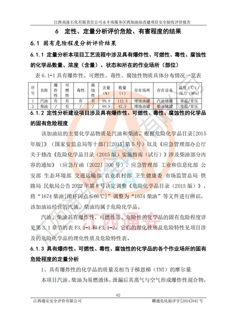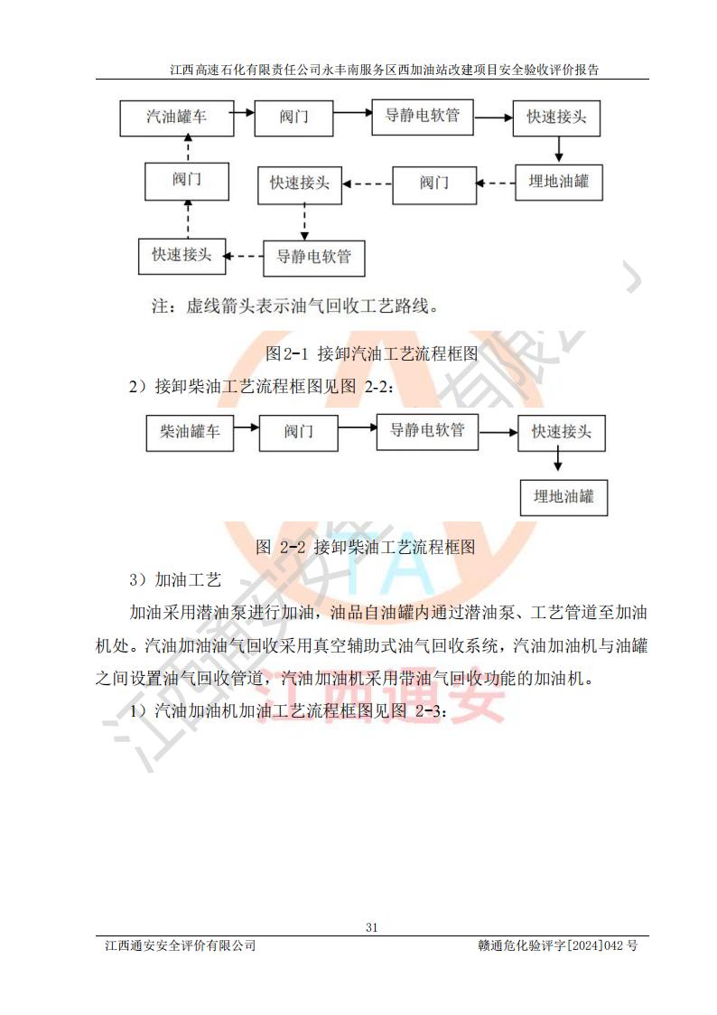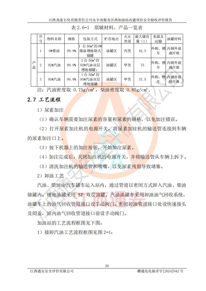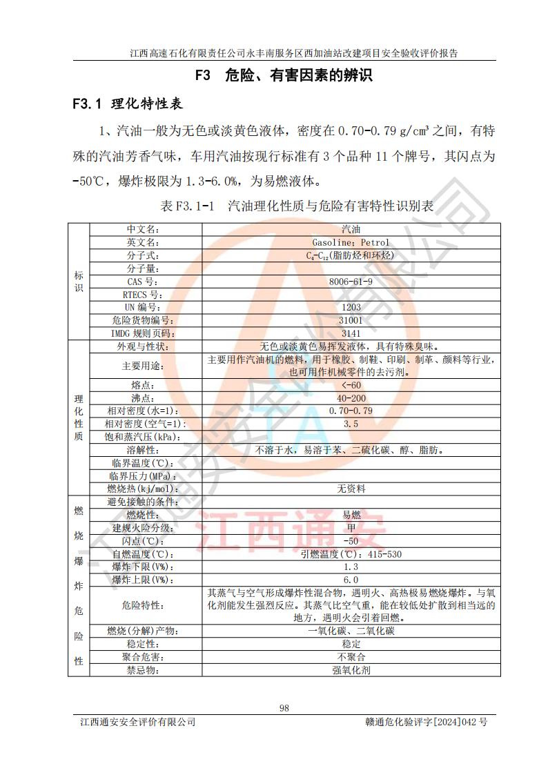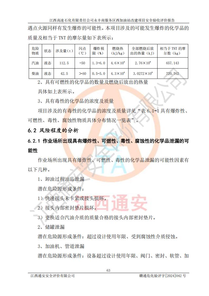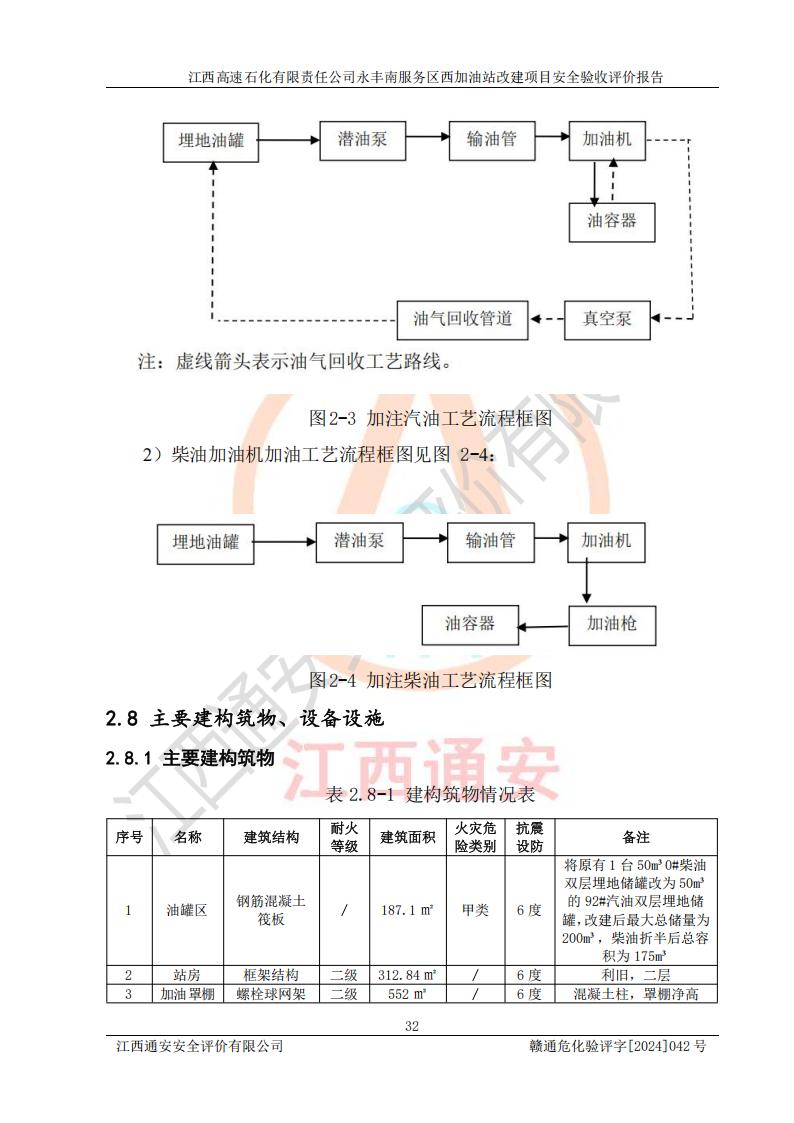 項(xiàng)目簡介 | 江西高速石化有限責(zé)任公司永豐南服務(wù)區(qū)西加油站成立于2018年1月5日,類型:其他有限責(zé)任公司分公司;負(fù)責(zé)人:陳志斌;經(jīng)營場所為江西省吉安市永豐縣昌寧高速永豐南服務(wù)區(qū)西加油站。該公司營業(yè)執(zhí)照經(jīng)營范圍:石油、石油化工(**期至2020年11月22日)、化纖及其他化工產(chǎn)品的銷售;光伏、充電樁、日用百貨便利店經(jīng)營:汽車清洗服務(wù);廣告位出租;房屋租賃;加油站租賃;食品的經(jīng)營(**加油站取得相關(guān)前置許可后方可經(jīng)營,經(jīng)營項(xiàng)目及**期以許可證為準(zhǔn))、計(jì)生用品經(jīng)營;零售卷煙、雪茄煙;委托代理收取水電費(fèi);銷售潤滑油、瀝青、文化用品、體育用品及器材;零售五金、家用電器及電子產(chǎn)品、加油充值卡;與經(jīng)營業(yè)務(wù)有關(guān)的咨詢服務(wù);汽車裝飾。(依法須經(jīng)批準(zhǔn)的項(xiàng)目,經(jīng)相關(guān)部門批準(zhǔn)后方可開展經(jīng)營活動)。 該加油站于2023年12月4日經(jīng)吉安市商務(wù)局核準(zhǔn)變更換發(fā)成品油零售經(jīng)營批準(zhǔn)證書,證書編號:油零售證書第吉0304號。**期由2023年12月4日至2028年12月3日。于2023年11月15日由吉安市應(yīng)急管理局變更發(fā)放危險(xiǎn)化學(xué)品經(jīng)營許可證,證書編號:贛吉危化經(jīng)字【2023】360800000086。**期由2023年11月22日至2026年11月21日。 為提升優(yōu)化加油站的整體布局,更好滿足運(yùn)營服務(wù)的需求,同時為了迎合昌寧高速日益增長的**數(shù)量,江西高速石化有限責(zé)任公司永豐南服務(wù)區(qū)西加油站決定在原址基礎(chǔ)上進(jìn)行改建,并于2023年12月15日獲得永豐縣發(fā)展和改革委員會蓋章的《江西省工業(yè)企業(yè)技術(shù)改造項(xiàng)目備案通知書》,同意該站在原址上改建。 江西高速石化有限責(zé)任公司永豐南服務(wù)區(qū)西加油站改建項(xiàng)目位于江西省吉安市永豐縣石馬鎮(zhèn)昌寧高速永豐南服務(wù)區(qū)西側(cè)。 該加油站改建前設(shè)有4個SF雙層埋地儲罐,分別為:1臺50m392#汽油雙層埋地儲罐,1臺50m395#汽油雙層埋地儲罐;2臺50m30#柴油雙層埋地儲罐。柴油折半后總?cè)莘e為 150 m3,屬二級加油站。設(shè)有2個4槍雙油品潛油泵加油機(jī),1個6槍3油品潛油泵加油機(jī),分別為:1臺95#汽油/92#汽油/92#汽油/95#汽油4槍加油機(jī),1臺0#柴油/92#汽油/95#汽油/0#柴油/92#汽油/95#汽油6槍加油機(jī),1臺0#柴油/92#汽油//0#柴油/92#汽油4槍加油機(jī)。 改建后情況如下:在原有罐區(qū)位置上將1臺50m30#柴油雙層埋地儲罐改造為1臺50m392#汽油雙層埋地儲罐。儲罐更換后僅對油品變更,油罐保持原有,更換后設(shè)置4臺SF雙層埋地儲罐,其中包括:2臺50m392#汽油雙層埋地儲罐;1臺50m395#汽油雙層埋地儲罐;1臺50m30#柴油雙層埋地儲罐;改建后*大總儲量為200m3,柴油折半后總?cè)莘e為175m3,屬**加油站,加油機(jī)更換后將原來2臺4槍加油機(jī)**變更為6槍加油機(jī),另一臺6槍加油機(jī)僅對油品槍號變更,加油機(jī)保持原有,設(shè)有2臺92#汽油/92#汽油/95#汽油/92#汽油/92#汽油/95#汽油6槍2油品加油機(jī),1臺0#柴油/95#汽油/92#汽油/0#柴油/95#汽油/92#汽油6槍3油品加油機(jī),在G-101加油機(jī)旁3.4m處設(shè)一臺車用尿素加注機(jī)(防爆,按柴油加油機(jī)確認(rèn)),型號為:JZB-1808,加油站內(nèi)其他設(shè)施利舊。 項(xiàng)目生產(chǎn)過程中涉及的危險(xiǎn)化學(xué)品有:汽油、柴油等。 項(xiàng)目各生產(chǎn)和儲存單元均未構(gòu)成危險(xiǎn)化學(xué)品重大危險(xiǎn)源。 | |||