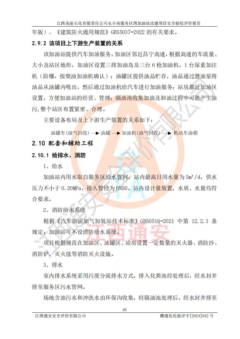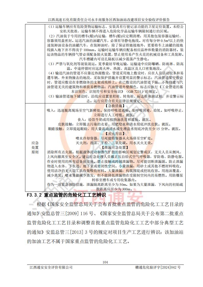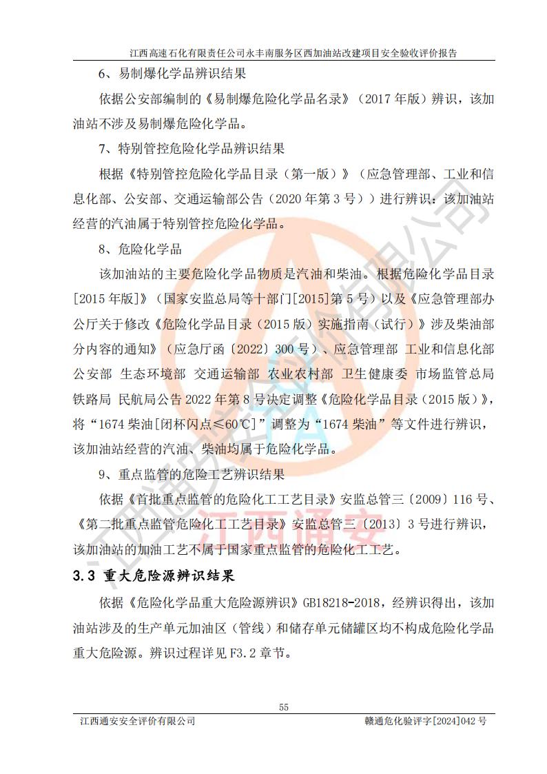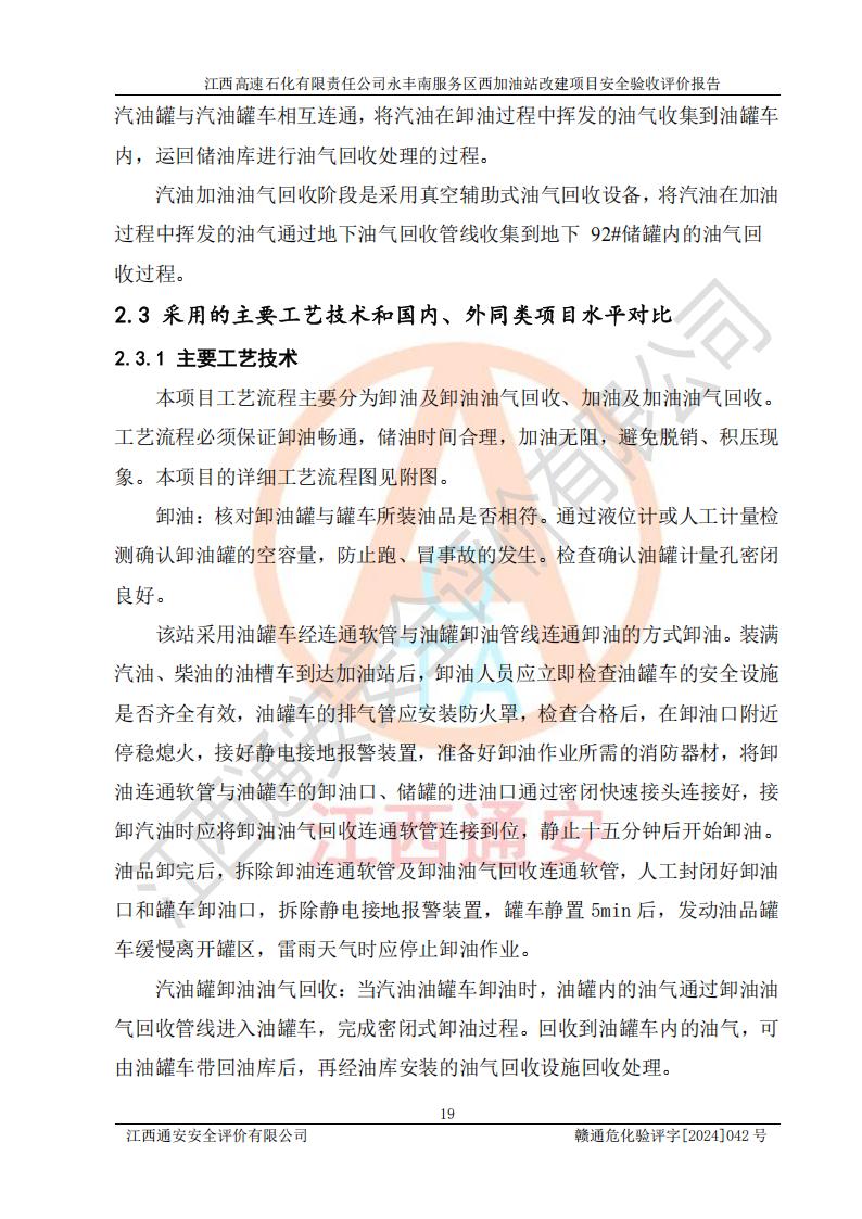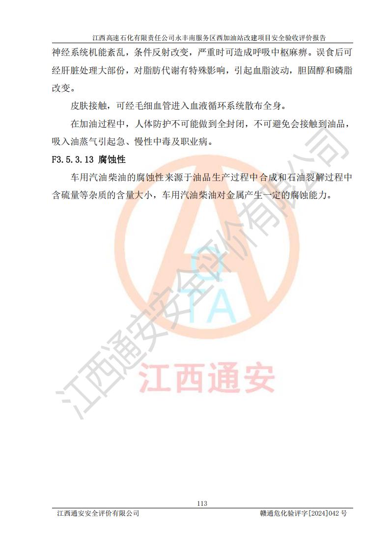 項(xiàng)目簡介 | 江西高速石化有限責(zé)任公司永豐南服務(wù)區(qū)西加油站成立于2018年1月5日,類型:其他有限責(zé)任公司分公司;負(fù)責(zé)人:陳志斌;經(jīng)營場所為江西省吉安市永豐縣昌寧高速永豐南服務(wù)區(qū)西加油站。該公司營業(yè)執(zhí)照經(jīng)營范圍:石油、石油化工(**期至2020年11月22日)、化纖及其他化工產(chǎn)品的銷售;光伏、充電樁、日用百貨便利店經(jīng)營:汽車清洗服務(wù);廣告位出租;房屋租賃;加油站租賃;食品的經(jīng)營(**加油站取得相關(guān)前置許可后方可經(jīng)營,經(jīng)營項(xiàng)目及**期以許可證為準(zhǔn))、計(jì)生用品經(jīng)營;零售卷煙、雪茄煙;委托代理收取水電費(fèi);銷售潤滑油、瀝青、文化用品、體育用品及器材;零售五金、家用電器及電子產(chǎn)品、加油充值卡;與經(jīng)營業(yè)務(wù)有關(guān)的咨詢服務(wù);汽車裝飾。(依法須經(jīng)批準(zhǔn)的項(xiàng)目,經(jīng)相關(guān)部門批準(zhǔn)后方可開展經(jīng)營活動)。 該加油站于2023年12月4日經(jīng)吉安市商務(wù)局核準(zhǔn)變更換發(fā)成品油零售經(jīng)營批準(zhǔn)證書,證書編號:油零售證書第吉0304號。**期由2023年12月4日至2028年12月3日。于2023年11月15日由吉安市應(yīng)急管理局變更發(fā)放危險(xiǎn)化學(xué)品經(jīng)營許可證,證書編號:贛吉危化經(jīng)字【2023】360800000086。**期由2023年11月22日至2026年11月21日。 為提升優(yōu)化加油站的整體布局,更好滿足運(yùn)營服務(wù)的需求,同時為了迎合昌寧高速日益增長的**數(shù)量,江西高速石化有限責(zé)任公司永豐南服務(wù)區(qū)西加油站決定在原址基礎(chǔ)上進(jìn)行改建,并于2023年12月15日獲得永豐縣發(fā)展和改革委員會蓋章的《江西省工業(yè)企業(yè)技術(shù)改造項(xiàng)目備案通知書》,同意該站在原址上改建。 江西高速石化有限責(zé)任公司永豐南服務(wù)區(qū)西加油站改建項(xiàng)目位于江西省吉安市永豐縣石馬鎮(zhèn)昌寧高速永豐南服務(wù)區(qū)西側(cè)。 該加油站改建前設(shè)有4個SF雙層埋地儲罐,分別為:1臺50m392#汽油雙層埋地儲罐,1臺50m395#汽油雙層埋地儲罐;2臺50m30#柴油雙層埋地儲罐。柴油折半后總?cè)莘e為 150 m3,屬二級加油站。設(shè)有2個4槍雙油品潛油泵加油機(jī),1個6槍3油品潛油泵加油機(jī),分別為:1臺95#汽油/92#汽油/92#汽油/95#汽油4槍加油機(jī),1臺0#柴油/92#汽油/95#汽油/0#柴油/92#汽油/95#汽油6槍加油機(jī),1臺0#柴油/92#汽油//0#柴油/92#汽油4槍加油機(jī)。 改建后情況如下:在原有罐區(qū)位置上將1臺50m30#柴油雙層埋地儲罐改造為1臺50m392#汽油雙層埋地儲罐。儲罐更換后僅對油品變更,油罐保持原有,更換后設(shè)置4臺SF雙層埋地儲罐,其中包括:2臺50m392#汽油雙層埋地儲罐;1臺50m395#汽油雙層埋地儲罐;1臺50m30#柴油雙層埋地儲罐;改建后*大總儲量為200m3,柴油折半后總?cè)莘e為175m3,屬**加油站,加油機(jī)更換后將原來2臺4槍加油機(jī)**變更為6槍加油機(jī),另一臺6槍加油機(jī)僅對油品槍號變更,加油機(jī)保持原有,設(shè)有2臺92#汽油/92#汽油/95#汽油/92#汽油/92#汽油/95#汽油6槍2油品加油機(jī),1臺0#柴油/95#汽油/92#汽油/0#柴油/95#汽油/92#汽油6槍3油品加油機(jī),在G-101加油機(jī)旁3.4m處設(shè)一臺車用尿素加注機(jī)(防爆,按柴油加油機(jī)確認(rèn)),型號為:JZB-1808,加油站內(nèi)其他設(shè)施利舊。 項(xiàng)目生產(chǎn)過程中涉及的危險(xiǎn)化學(xué)品有:汽油、柴油等。 項(xiàng)目各生產(chǎn)和儲存單元均未構(gòu)成危險(xiǎn)化學(xué)品重大危險(xiǎn)源。 | |||