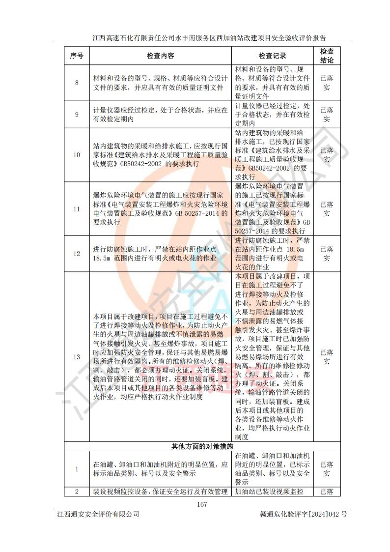 評價結(jié)論 | 江西高速石化有限責(zé)任公司永豐南服務(wù)區(qū)西加油站改建項(xiàng)目具備**有關(guān)安全生產(chǎn)法律、法規(guī)、部門規(guī)章及標(biāo)準(zhǔn)規(guī)范要求的安全條件,符合經(jīng)營和儲存危險(xiǎn)化學(xué)品的安全條件要求,具備安全驗(yàn)收的要求。 | |||