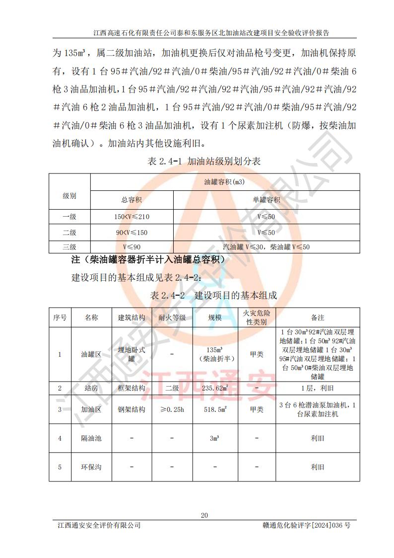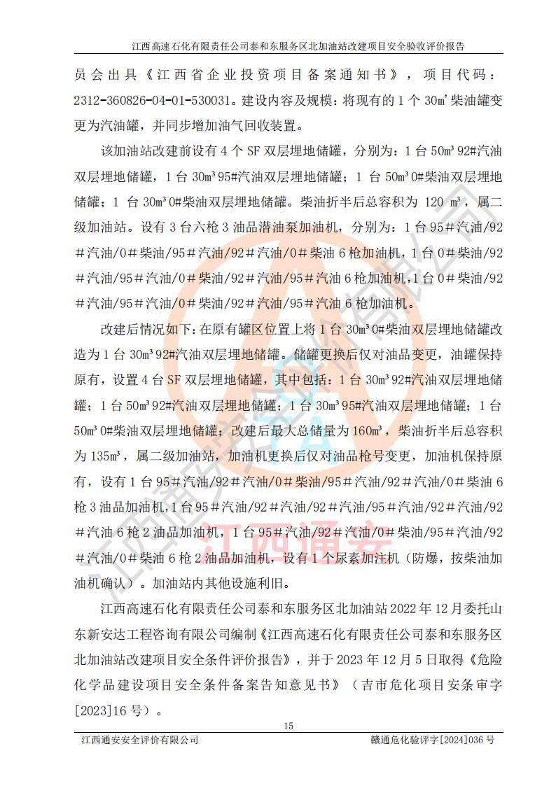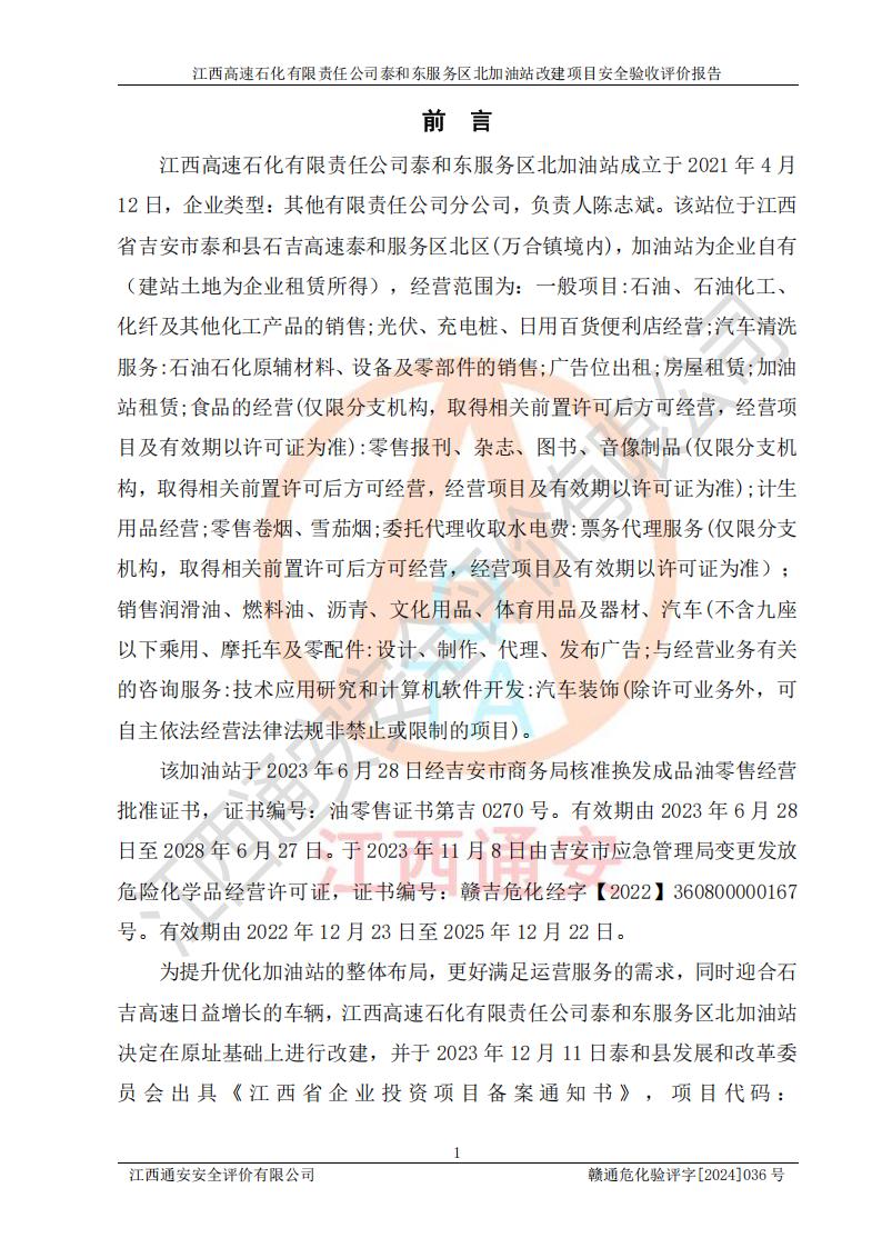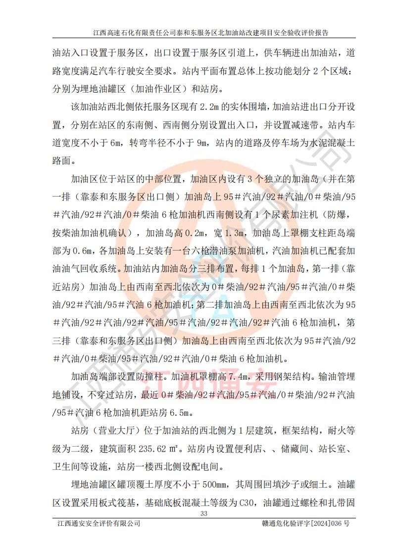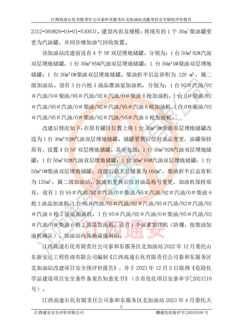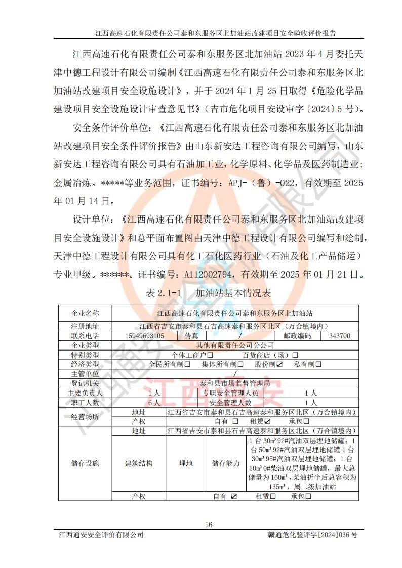 項目名稱 | 江西高速石化有限責任公司泰和東服務區(qū)北加油站改建項目安全驗收評價報告 | ||||