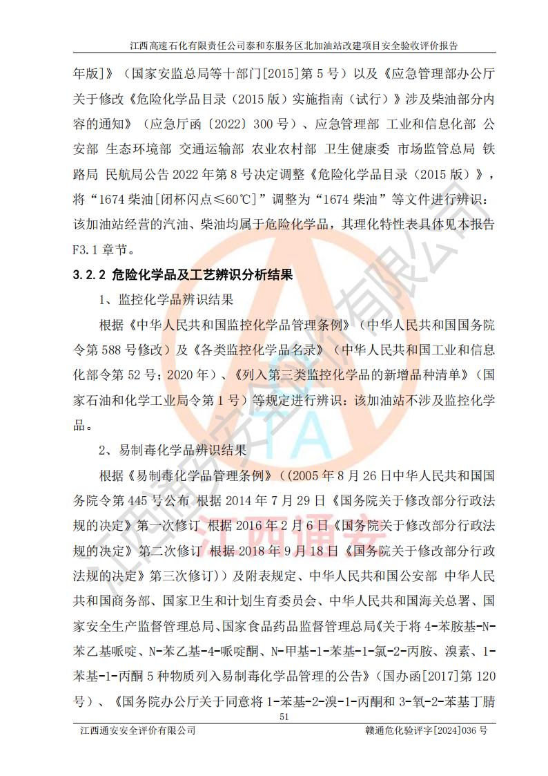 項目簡介 | 江西高速石化有限責任公司泰和東服務區(qū)北加油站成立于2021年4月12日,企業(yè)類型:其他有限責任公司分公司,負責人陳志斌。該站位于江西省吉安市泰和縣石吉高速泰和服務區(qū)北區(qū)(萬合鎮(zhèn)境內(nèi)),加油站為企業(yè)自有(建站土地為企業(yè)租賃所得),經(jīng)營范圍為:一般項目:石油、石油化工、化纖及其他化工產(chǎn)品的銷售;光伏、充電樁、日用百貨便利店經(jīng)營;汽車清洗服務:石油石化原輔材料、設備及零部件的銷售;廣告位出租;房屋租賃;加油站租賃;食品的經(jīng)營(**分支機構,取得相關前置許可后方可經(jīng)營,經(jīng)營項目及**期以許可證為準):零售報刊、雜志、圖書、音像制品(**分支機構,取得相關前置許可后方可經(jīng)營,經(jīng)營項目及**期以許可證為準);計生用品經(jīng)營;零售卷煙、雪茄煙;委托代理收取水電費:票務代理服務(**分支機構,取得相關前置許可后方可經(jīng)營,經(jīng)營項目及**期以許可證為準);銷售潤滑油、燃料油、瀝青、文化用品、體育用品及器材、汽車(不含九座以下乘用、摩托車及零配件:設計、制作、代理、發(fā)布廣告;與經(jīng)營業(yè)務有關的咨詢服務:技術應用研究和計算機軟件開發(fā):汽車裝飾(除許可業(yè)務外,可自主依法經(jīng)營法律法規(guī)非禁止或限制的項目)。 該加油站于2023年6月28日經(jīng)吉安市商務局核準換發(fā)成品油零售經(jīng)營批準證書,證書編號:油零售證書第吉0270號。**期由2023年6月28日至2028年6月27日。于2023年11月8日由吉安市應急管理局變更發(fā)放危險化學品經(jīng)營許可證,證書編號:贛吉?;?jīng)字【2022】360800000167號。**期由2022年12月23日至2025年12月22日。 為提升優(yōu)化加油站的整體布局,更好滿足運營服務的需求,同時迎合石吉高速日益增長的**,江西高速石化有限責任公司泰和東服務區(qū)北加油站決定在原址基礎上進行改建,并于2023年12月11日泰和縣發(fā)展和改革委員會出具《江西省企業(yè)投資項目備案通知書》,項目代碼:2312-360826-04-01-530031。建設內(nèi)容及規(guī)模:將現(xiàn)有的1個30m'柴油罐變更為汽油罐,并同步增加油氣回收裝置。 該加油站改建前設有4個SF雙層埋地儲罐,分別為:1臺50m392#汽油雙層埋地儲罐,1臺30m395#汽油雙層埋地儲罐;1 臺50m30#柴油雙層埋地儲罐;1 臺30m30#柴油雙層埋地儲罐。柴油折半后總容積為 120 m3,屬二級加油站。設有3臺六槍3油品潛油泵加油機,分別為:1臺95#汽油/92#汽油/0#柴油/95#汽油/92#汽油/0#柴油6槍加油機,1臺0#柴油/92#汽油/95#汽油/0#柴油/92#汽油/95#汽油6槍加油機,1臺0#柴油/92#汽油/95#汽油/0#柴油/92#汽油/95#汽油6槍加油機。 改建后情況如下:在原有罐區(qū)位置上將1臺30m30#柴油雙層埋地儲罐改造為1臺30m392#汽油雙層埋地儲罐。儲罐更換后僅對油品變更,油罐保持原有,設置4臺SF雙層埋地儲罐,其中包括:1臺30m392#汽油雙層埋地儲罐;1臺50m392#汽油雙層埋地儲罐;1臺30m395#汽油雙層埋地儲罐;1臺50m30#柴油雙層埋地儲罐;改建后*大總儲量為160m3,柴油折半后總容積為135m3,屬二級加油站,加油機更換后僅對油品槍號變更,加油機保持原有,設有1臺95#汽油/92#汽油/0#柴油/95#汽油/92#汽油/0#柴油6槍3油品加油機,1臺95#汽油/92#汽油/92#汽油/95#汽油/92#汽油/92#汽油6槍2油品加油機,1臺95#汽油/92#汽油/0#柴油/95#汽油/92#汽油/0#柴油6槍2油品加油機,設有1個尿素加注機(防爆,按柴油加油機確認)。加油站內(nèi)其他設施利舊。 江西高速石化有限責任公司泰和東服務區(qū)北加油站2022年12月委托山東新安達工程咨詢有限公司編制《江西高速石化有限責任公司泰和東服務區(qū)北加油站改建項目安全預評價報告》,并于2023年12月5日取得《危險化學品建設項目安全條件備案告知意見書》(吉市危化項目安條審字[2023]16號)。 江西高速石化有限責任公司泰和東服務區(qū)北加油站2023年4月委托天津中德工程設計有限公司編制《江西高速石化有限責任公司泰和東服務區(qū)北加油站改建項目安全設施設計》,并于2024年1月25日取得《危險化學品建設項目安全設施設計審查意見書》(吉市危化項目安設審字〔2024〕5號)。 | ||||