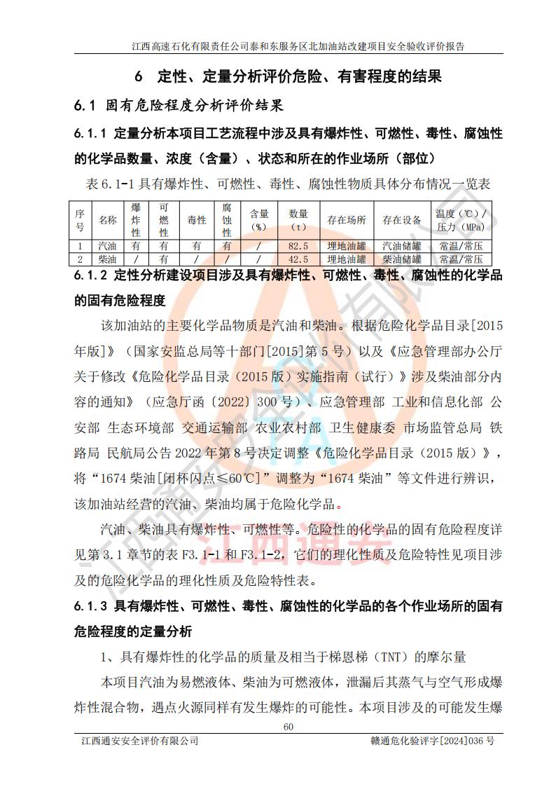 其它 | 在對該項目危險、有害因素辨識分析的基礎上,運用安全檢查表、預作業(yè)條件危險性分析法、危險度評價、重大事故后果分析結果等評價方法對該項目進行了分析評價,評價結果如下: 1、該項目位于江西省吉安市泰和縣石吉高速泰和服務區(qū)北區(qū)(萬合鎮(zhèn)境內(nèi)),符合當?shù)匾?guī)劃,與周邊環(huán)境的距離符合有關標準、規(guī)范的要求。 2、總圖布置分區(qū)明確,布局合理,各建構筑物的防火間距滿足規(guī)范要求。 3、該項目無**明令淘汰的工藝,設備、設施與工藝條件、內(nèi)部介質(zhì)相適應,特種設備及設施較齊全,按規(guī)定設置防雷、防靜電接地,爆炸危險環(huán)境加油機按要求采用防爆型,符合相關標準規(guī)范要求。 5、企業(yè)設置了安全生產(chǎn)管理機構,配備了專職安全生產(chǎn)管理人員,建立了安全生產(chǎn)責任制和安全生產(chǎn)管理制度,編制了崗位操作規(guī)程,編制了生產(chǎn)安全事故應急預案,人員經(jīng)過相應的培訓,企業(yè)的安全生產(chǎn)管理正常。 6、作業(yè)條件危險性評價結果:在選定的評價單元中,作業(yè)危險程度均為“一般危險、需要注意”、“稍有危險,可以接受”作業(yè)環(huán)境,作業(yè)條件相對安全。 7、危險度評價結果:汽油儲罐的危險程度為**危險。其設置了高液位遠傳報警系統(tǒng),滲漏檢測報警系統(tǒng),埋地加油管道采用雙層管道等可以滿足安全生產(chǎn)條件要求。 評價結論: 江西高速石化有限責任公司泰和東服務區(qū)北加油站工藝設備和安全設施運行正常,安全管理機制運行正常,安全設施、措施達到設計要求和預期結果,可以滿足建設項目安全生產(chǎn)的要求,安全生產(chǎn)管理**,項目具備**有關安全生產(chǎn)法律、法規(guī)、部門規(guī)章及標準規(guī)范要求的安全條件,符合經(jīng)營和儲存危險化學品的安全條件要求,具備安全驗收的要求。 | ||||